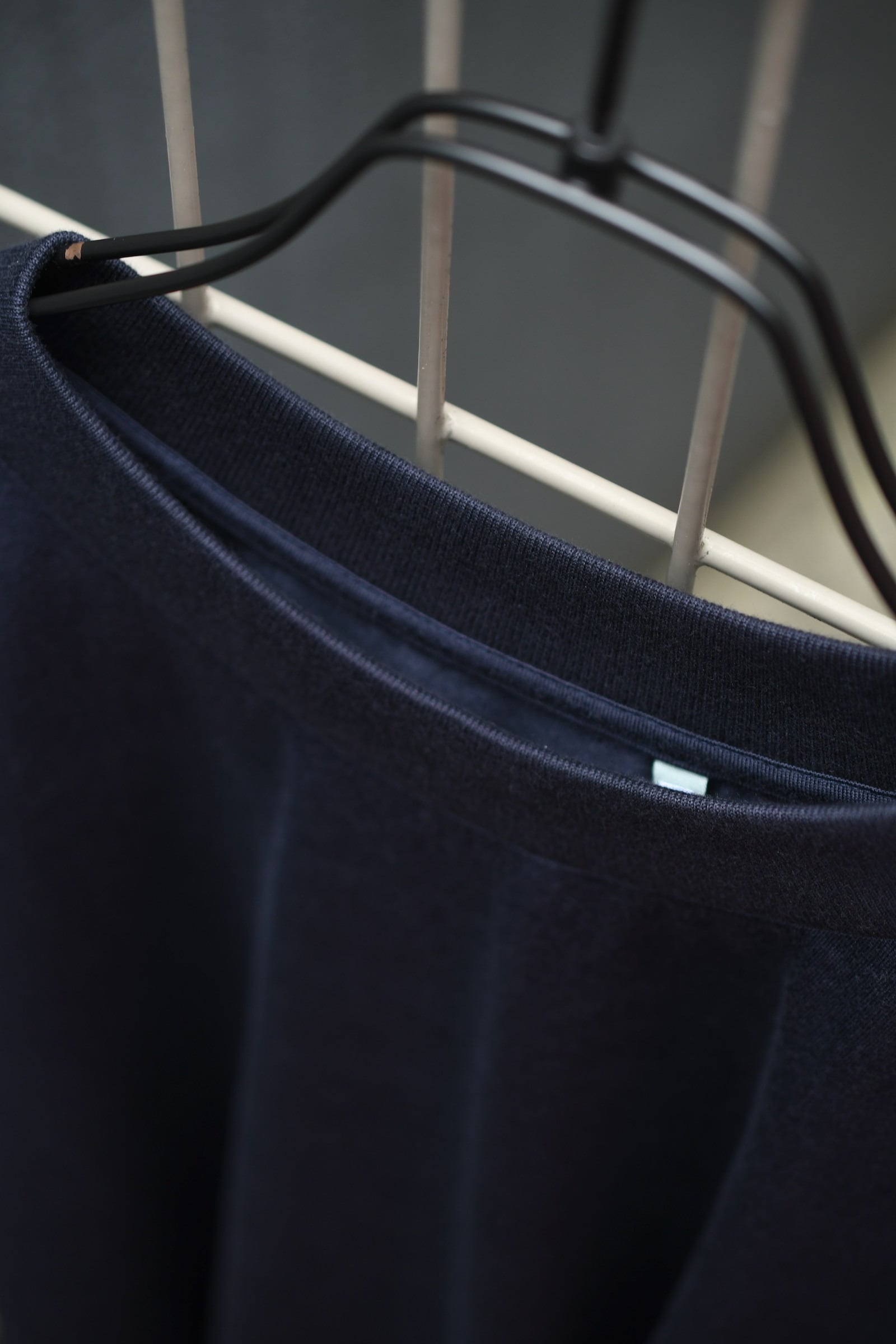生地通りの重なりによる盛り上がりをフラットにさせ、単体も然り、シャツや織りの首元から覗く際には程よくネックを立ち上がらせて美しい収まりを見せる。