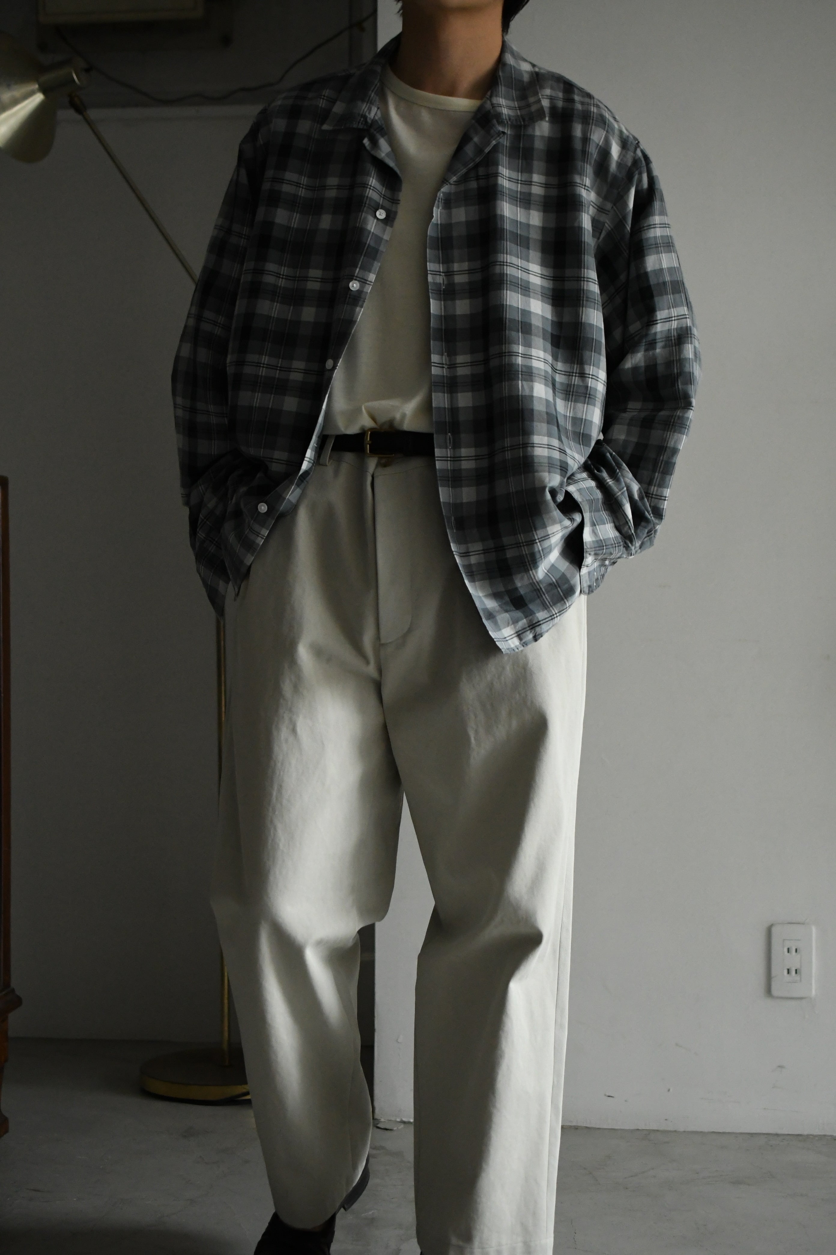 生地のハリを活かして線も直線気味に設計され、裾に向かって少しテーパードの効いた美しいストレートシルエットは絶妙な太さを現しており、上物と足元のボリュームを選ばない懐の深さがそこにはある。