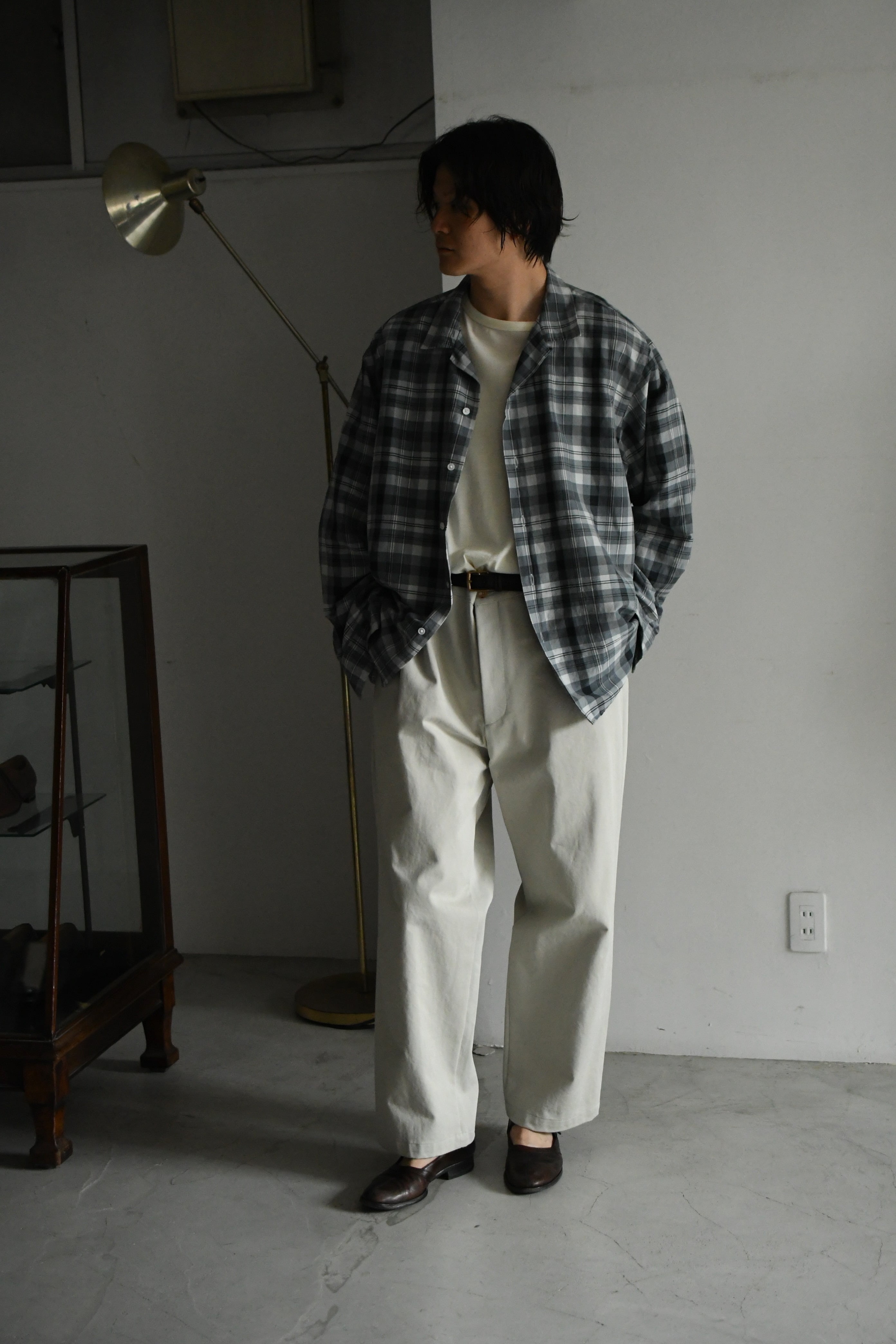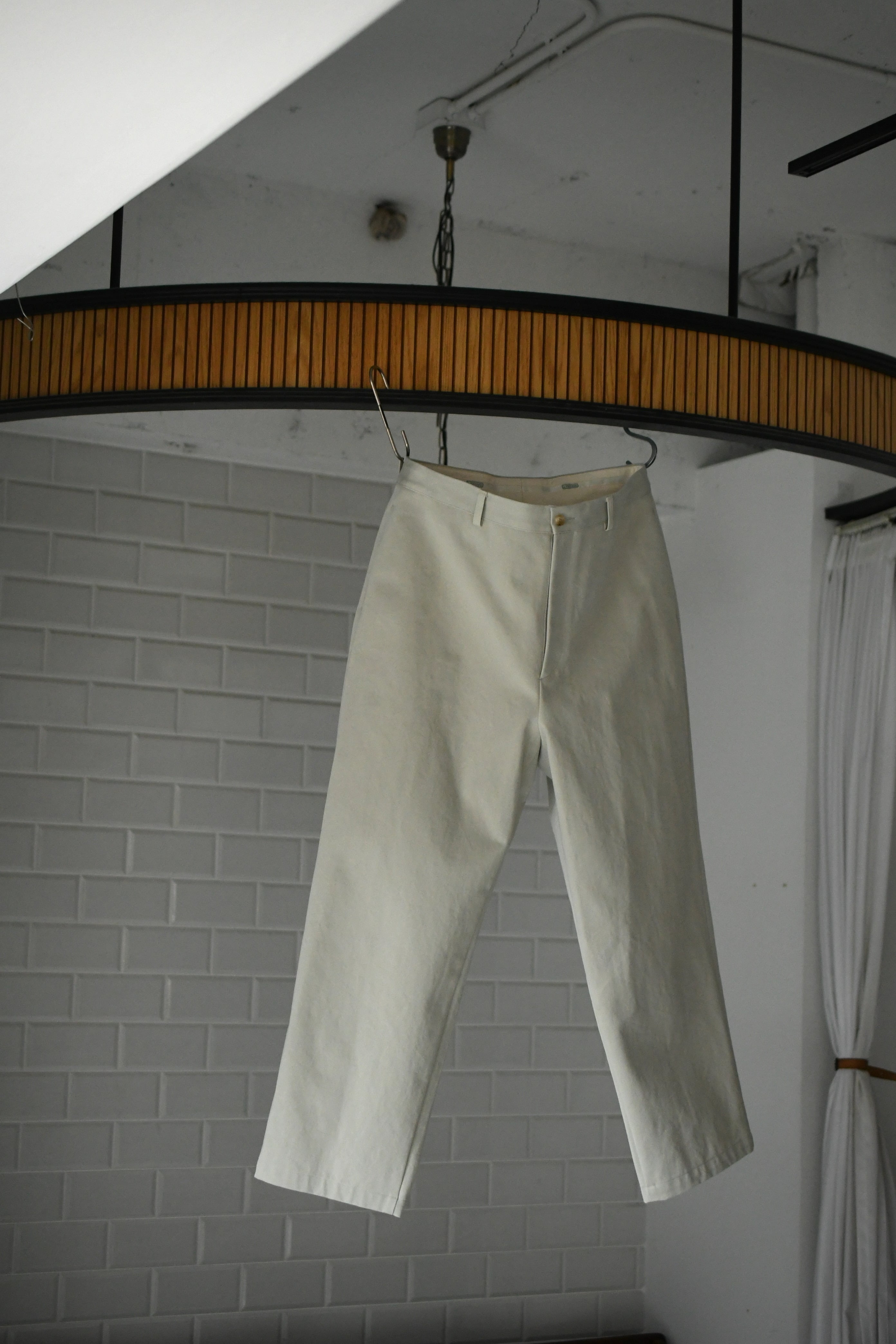 1990年代頃より見られる某アメリカブランドのノープリーツチノトラウザーをベースに、クラシカルな印象を残しつつもオリジナルのホーン釦やマーベルト仕立てといった上質なディティールを組み込んで丁寧に仕上げられたチノトラウザー”Type 3”。