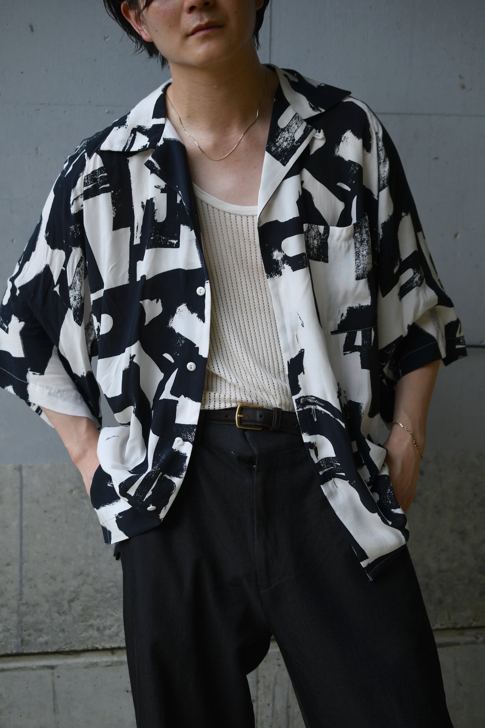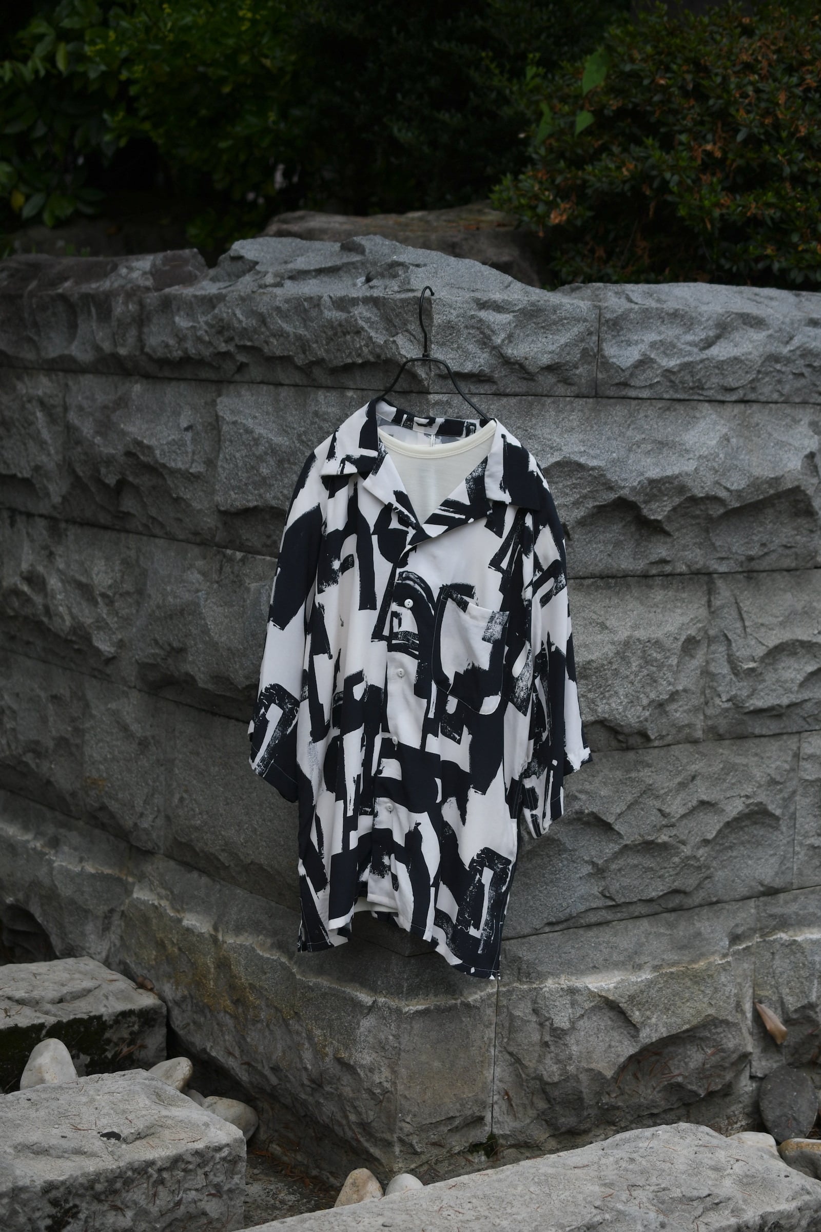 総柄で開襟仕様のゆったりとしたショートスリーブシャツ。