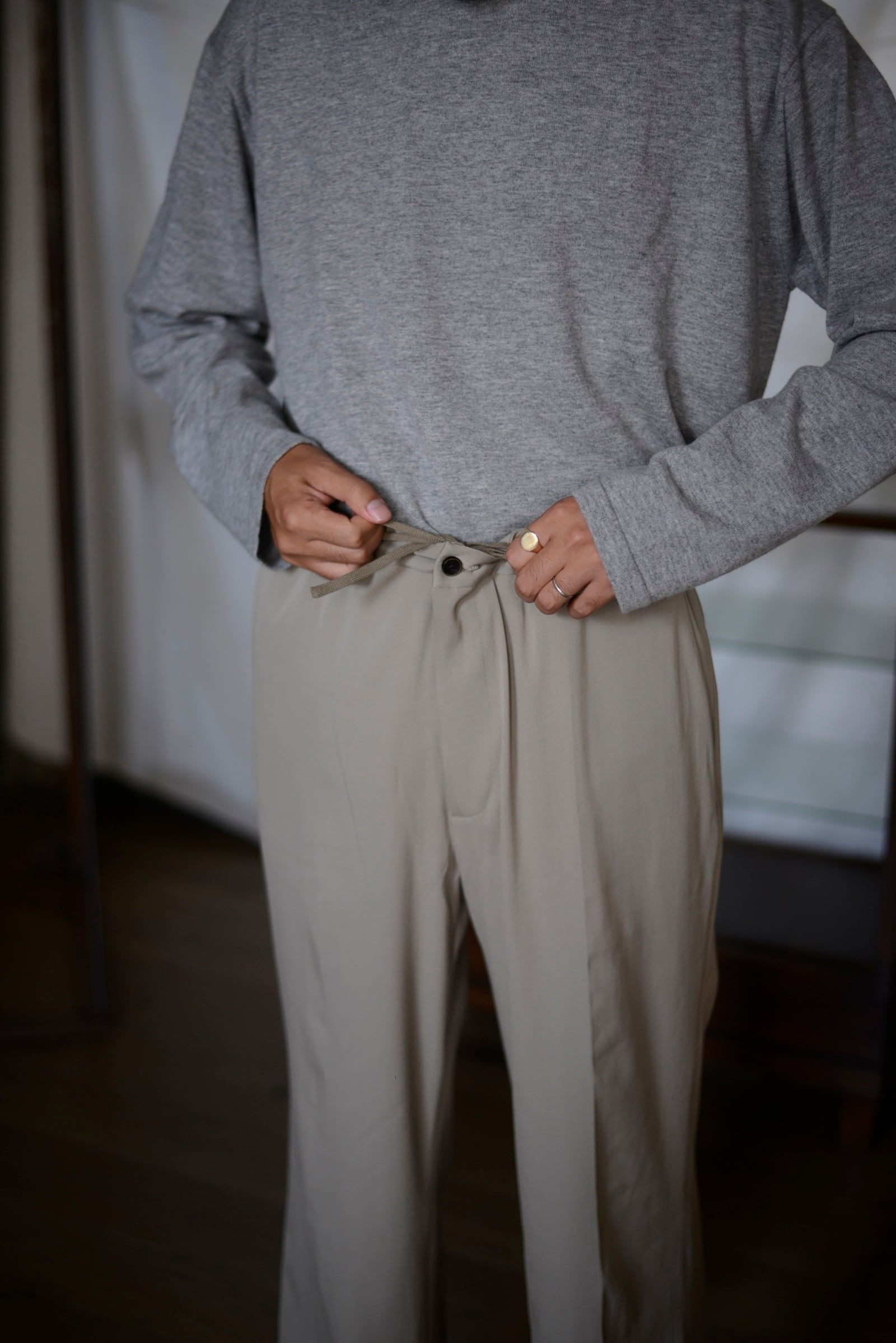 少しサイズアップのスラックスを適当に履いて決まる感じがやりたくて、そのままの要望をデザイナーの中出さんにお伝えして当店のみの形を特別に制作をして頂きました。