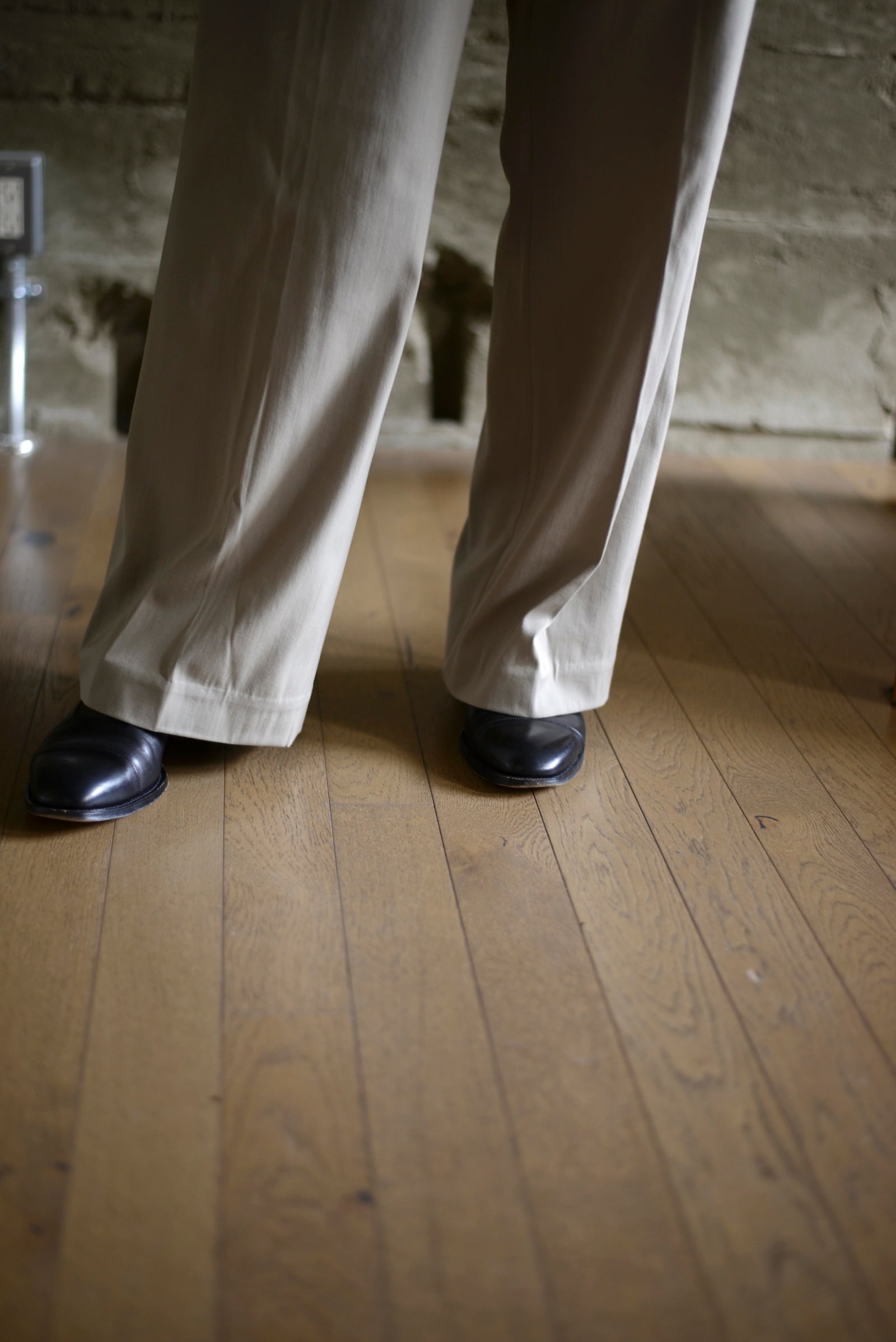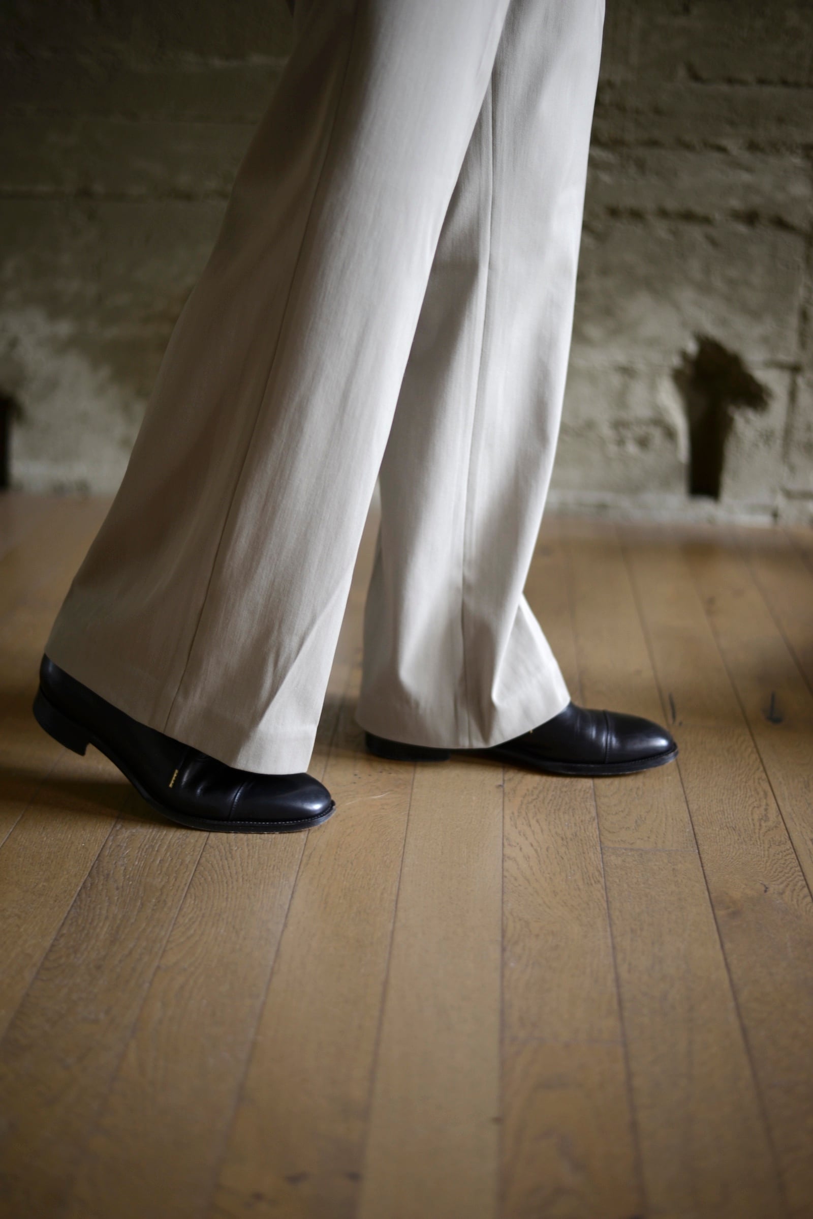 国産のデッドストックによる希少な生地を用いて製作頂いたテーマは『ラフに履けるちょいフレアのスラックス』