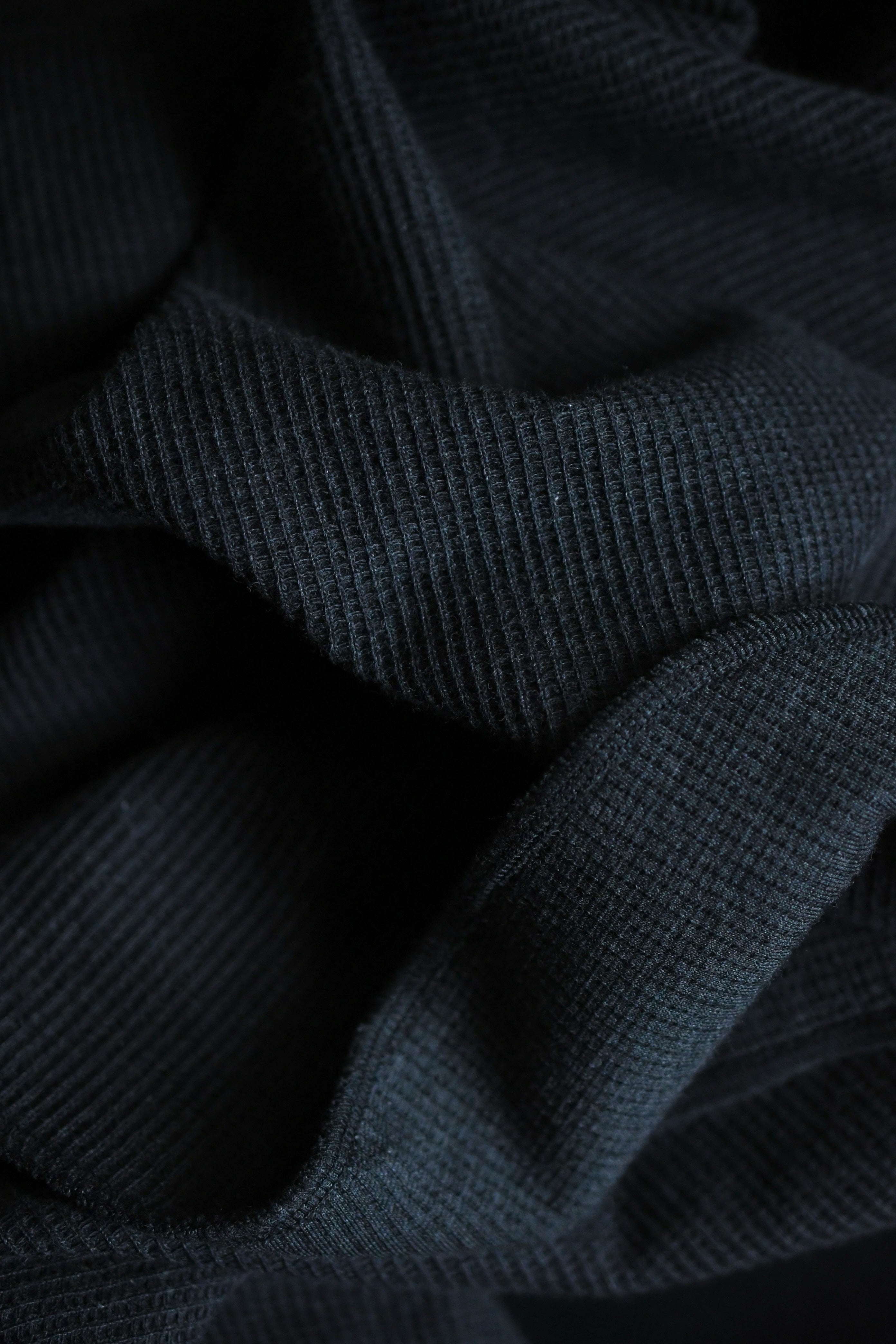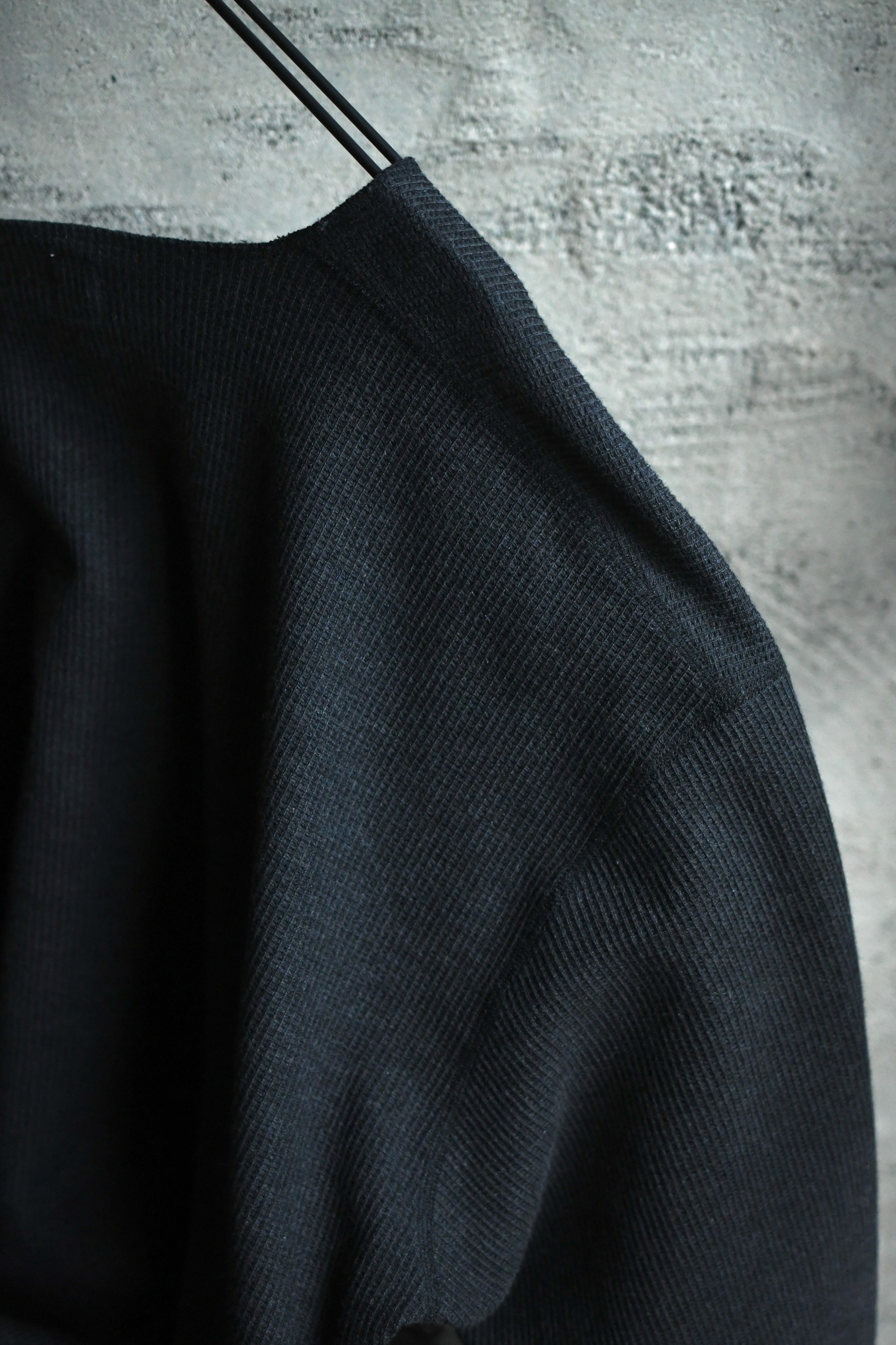 オリジナルで製作している特殊なサーマル地は、カットソー以上スウェット未満の肉感が丁度良く、表面の凹凸と反して裏面はフラットな仕様で着心地は非常に軽やか。繊維レベルにまで及ぶ特殊な構造により型崩れは起きづらく、優れた吸水速乾性も有している為に蒸し暑さが残る今から頼りになる。