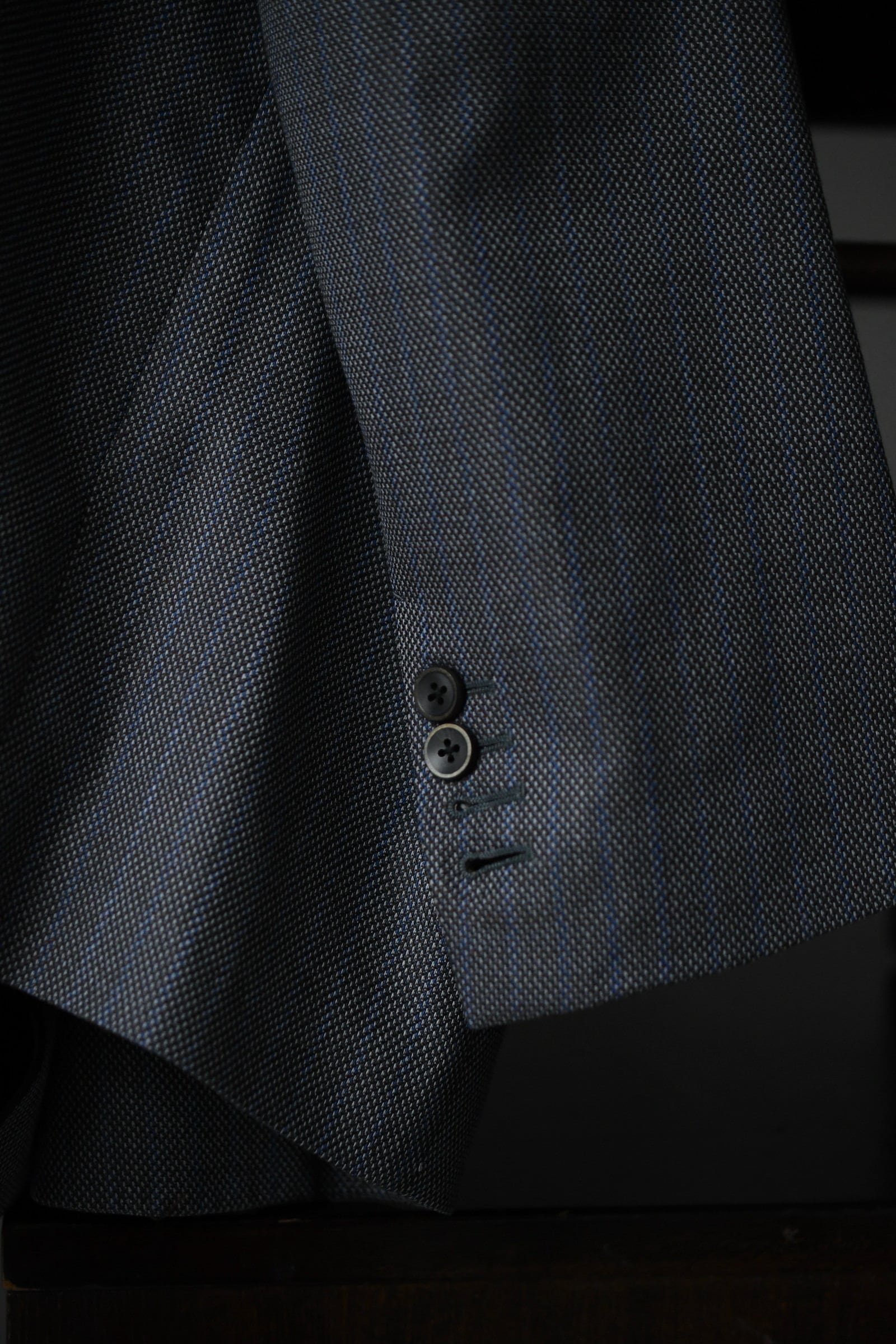そして、別注でも使用した老舗英国社のデットストックウールは、グレーによる特徴的な織り目をベースに薄らと青い線が走り、控え目で合わせやすい色合いだが、不思議とスタイリングを引っ張ってくれる強さがそこにはある。