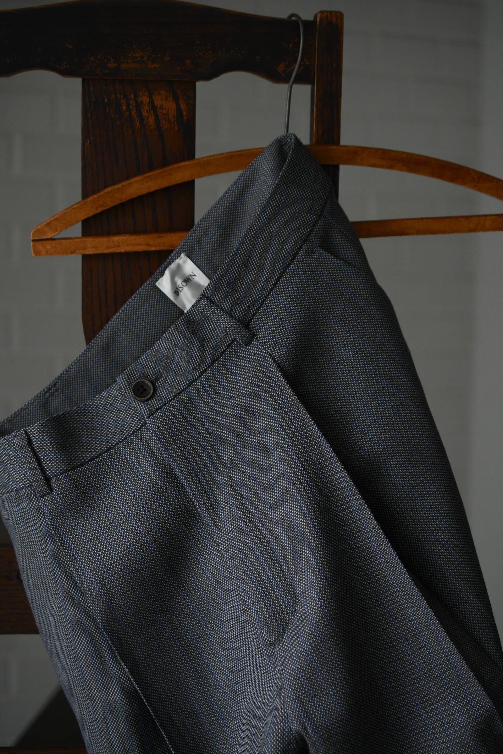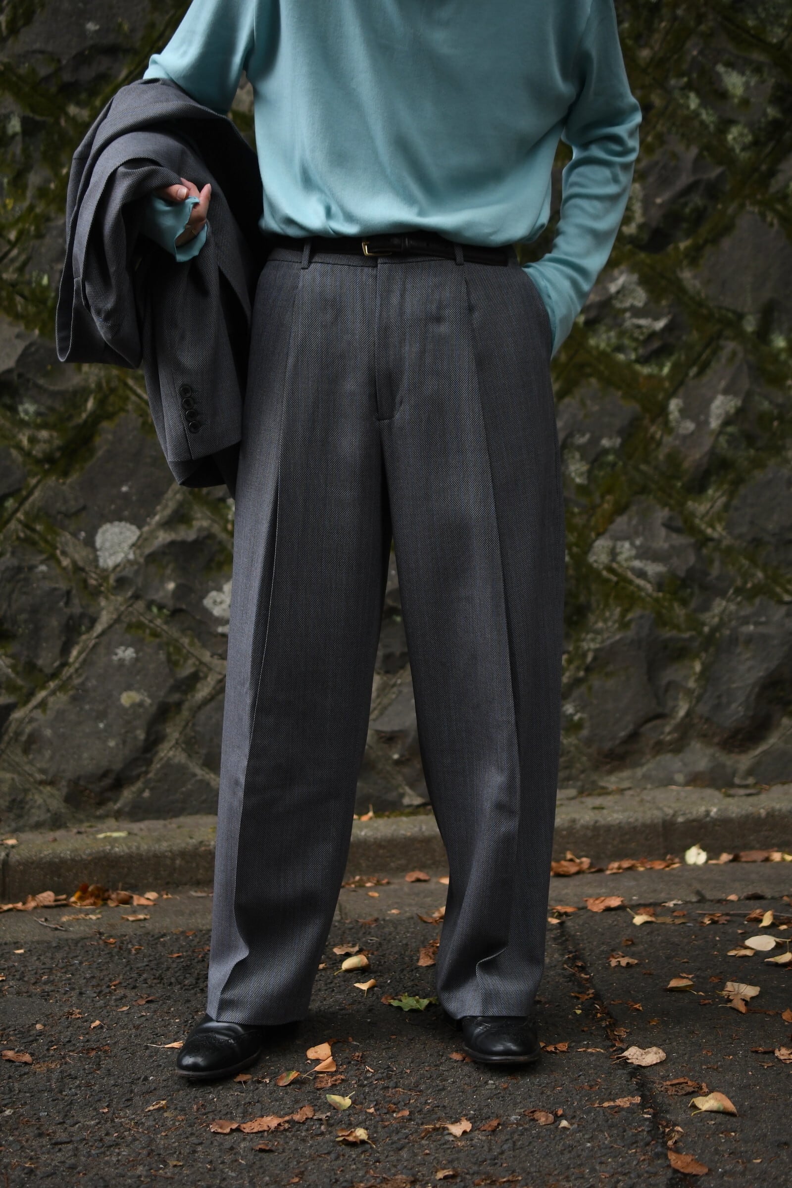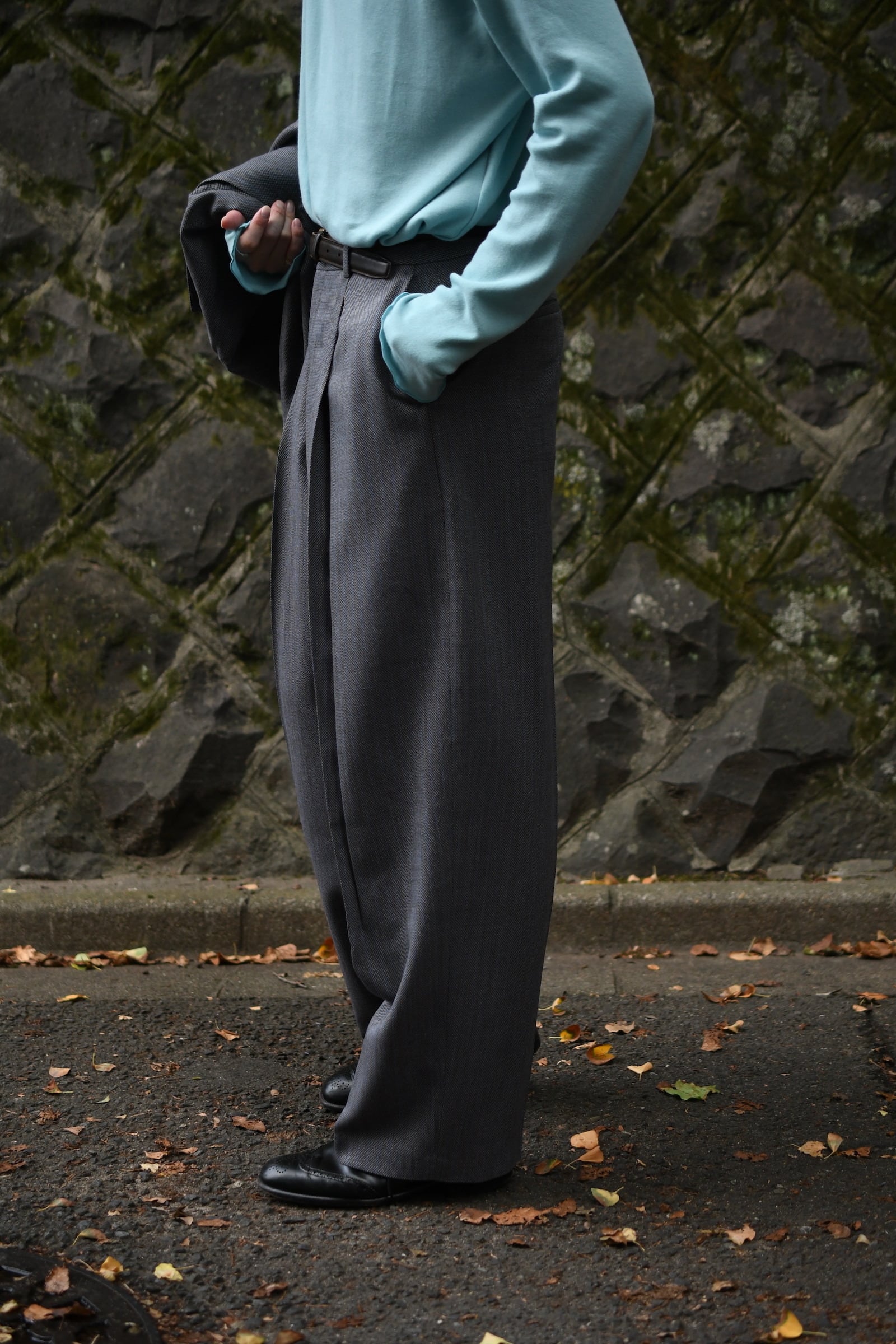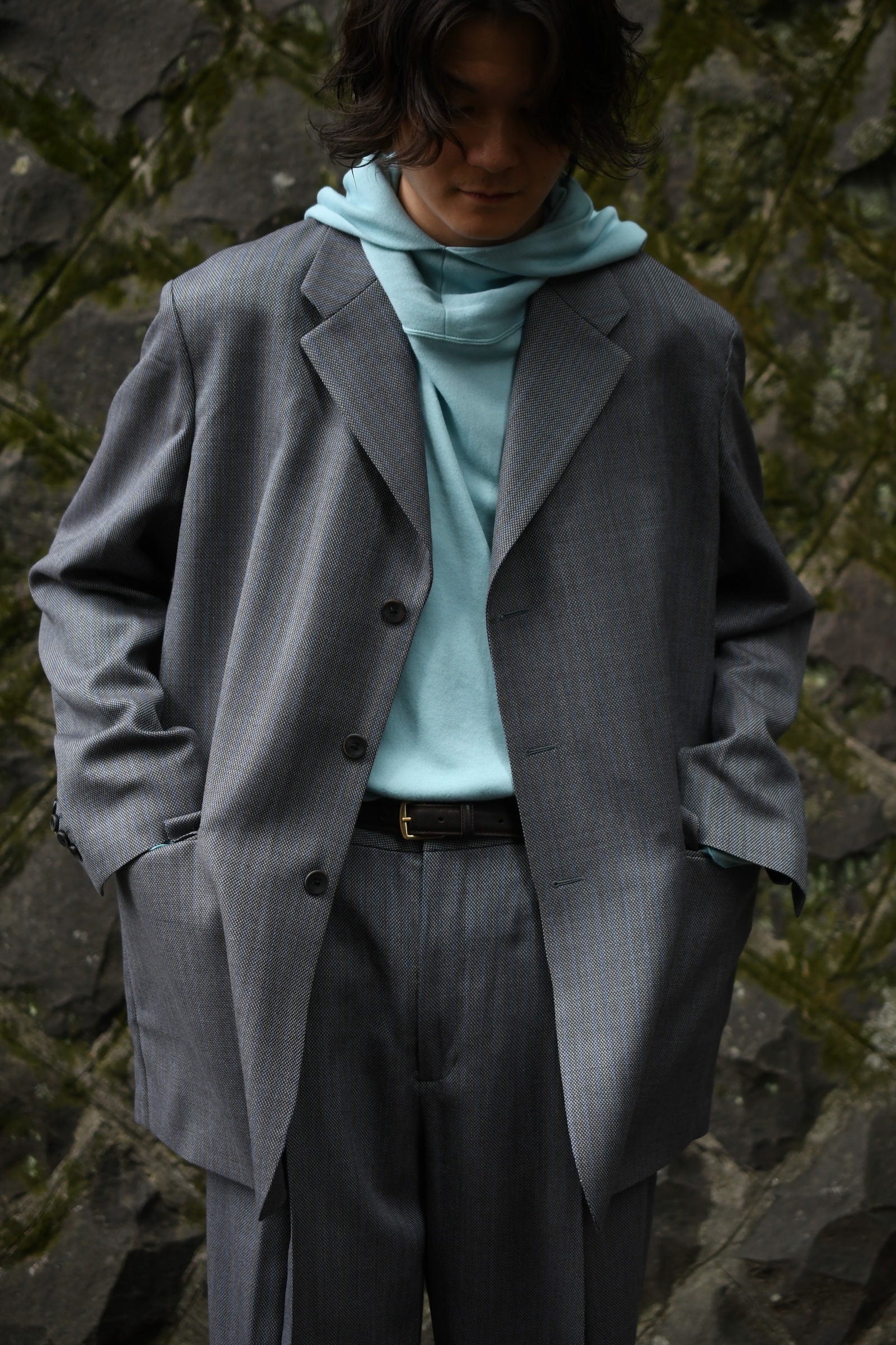 別注に至ったキッカケでもあるこの生地は、英国社の老舗生地メーカーにて某コレクションブランドがオーダーしたデッドストックの英国ウール。グレーによる特徴的な織り目をベースに薄らと青い線が走り、控え目で合わせやすい色合いだが、不思議とスタイリングを引っ張ってくれる強さがそこにはある。