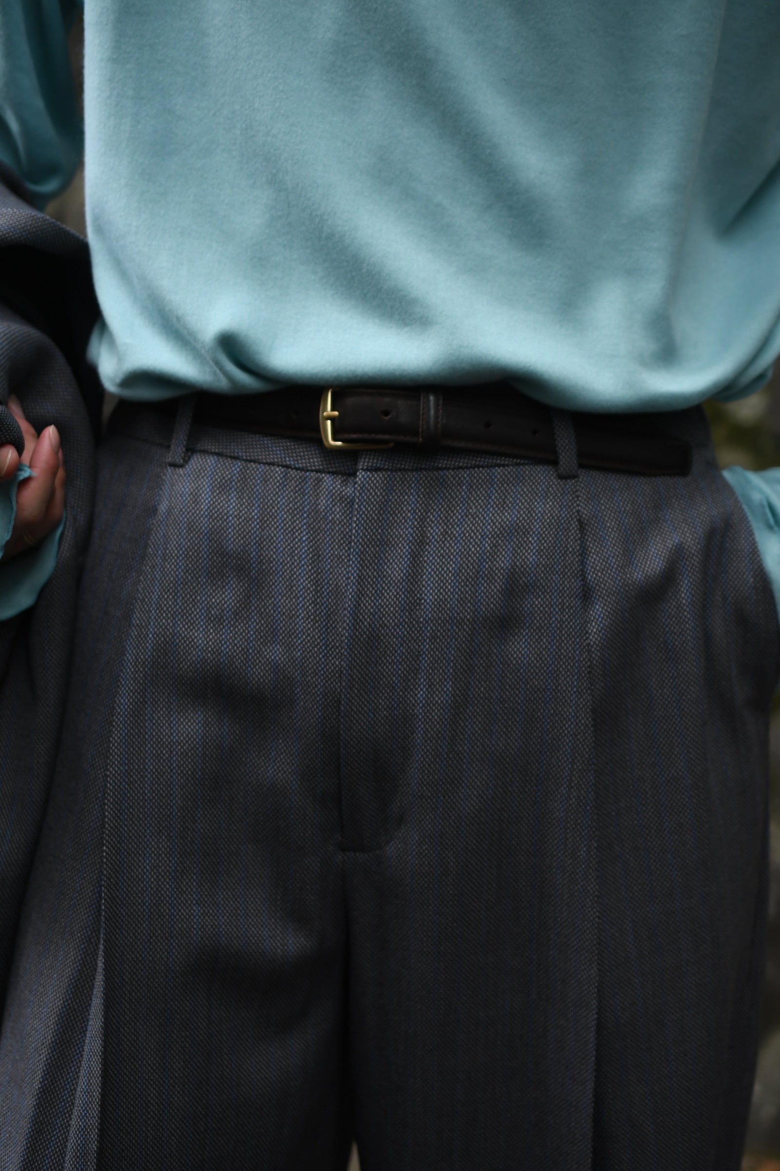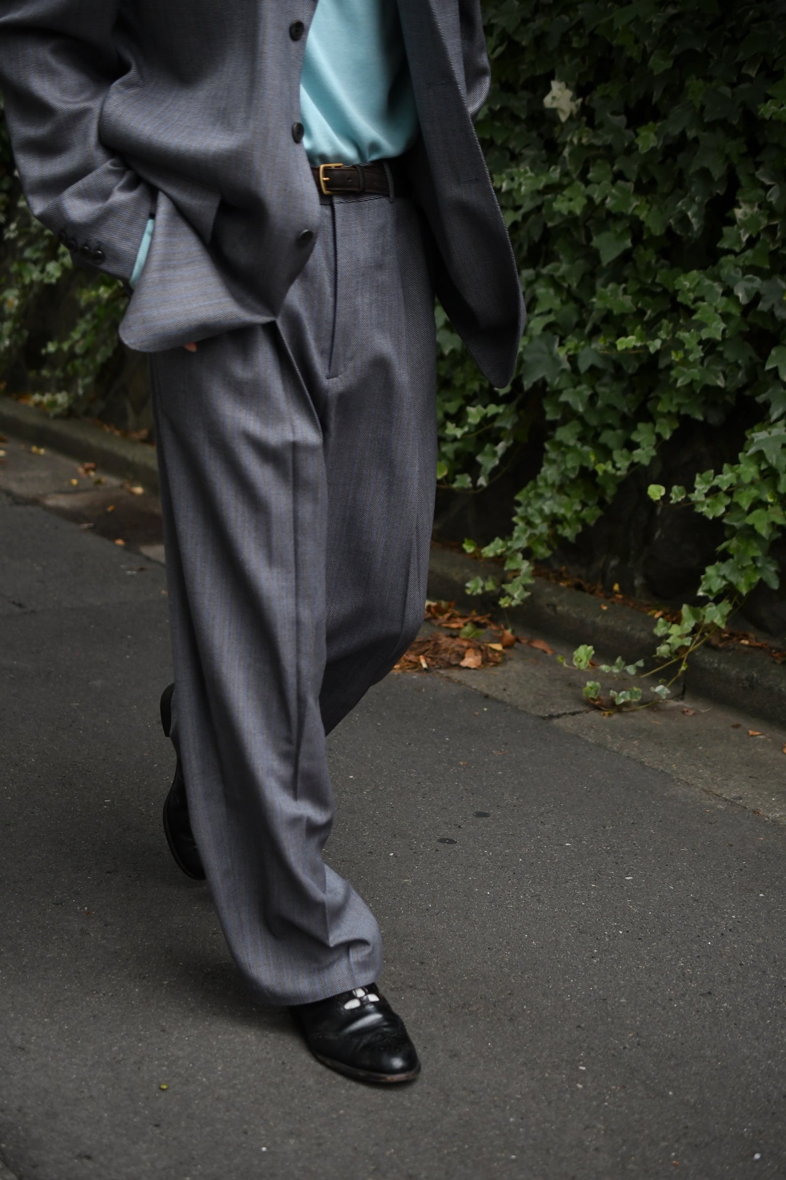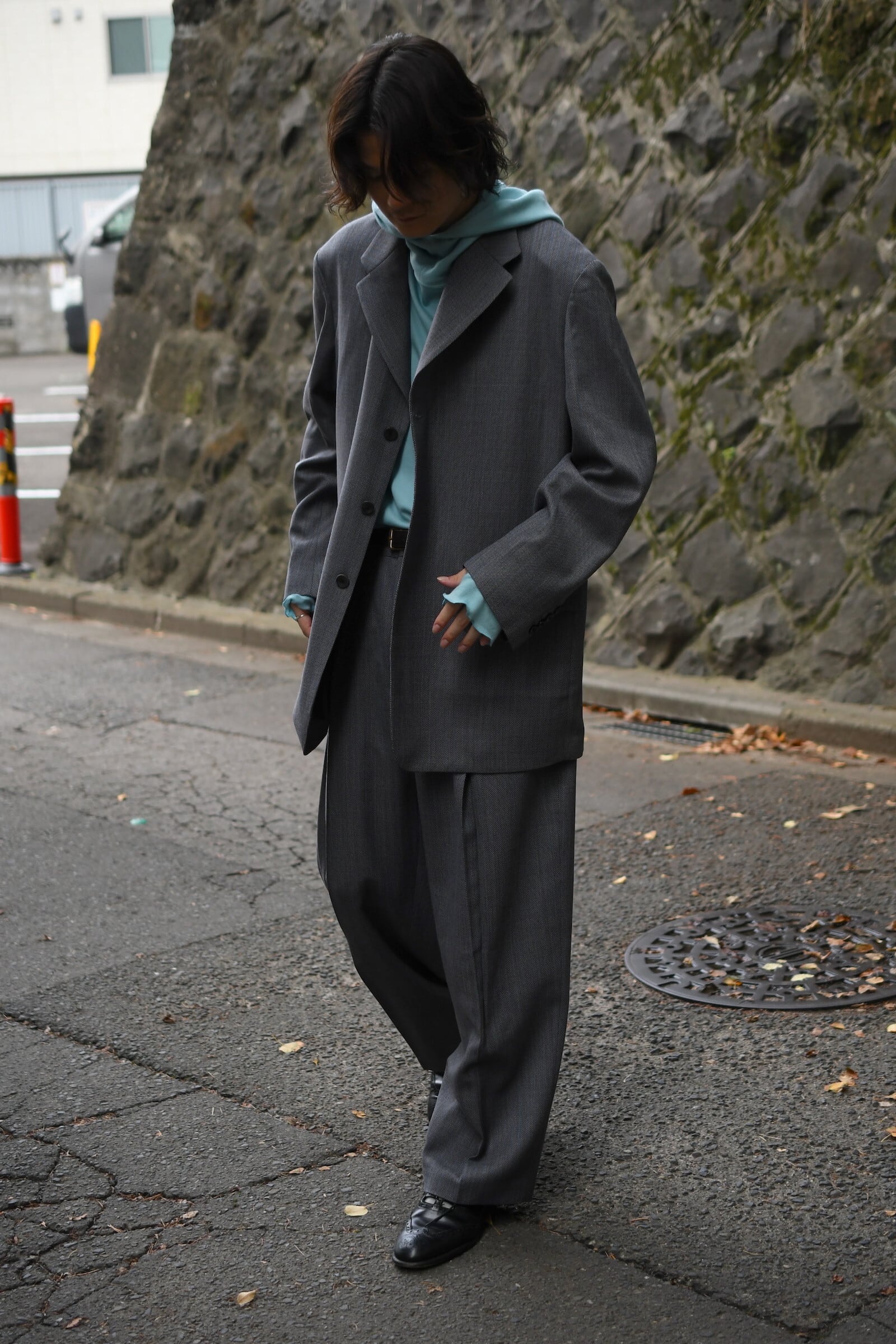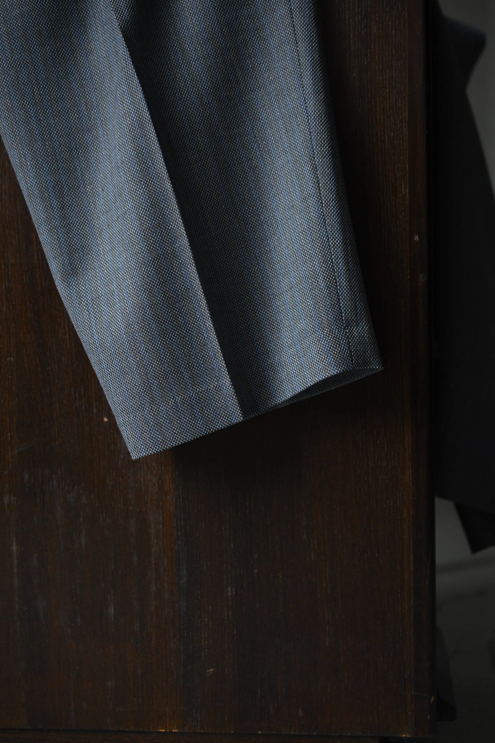 別注に至ったキッカケでもあるこの生地は、英国社の老舗生地メーカーにて某コレクションブランドがオーダーしたデッドストックの英国ウール。グレーによる特徴的な織り目をベースに薄らと青い線が走り、控え目で合わせやすい色合いだが、不思議とスタイリングを引っ張ってくれる強さがそこにはある。
