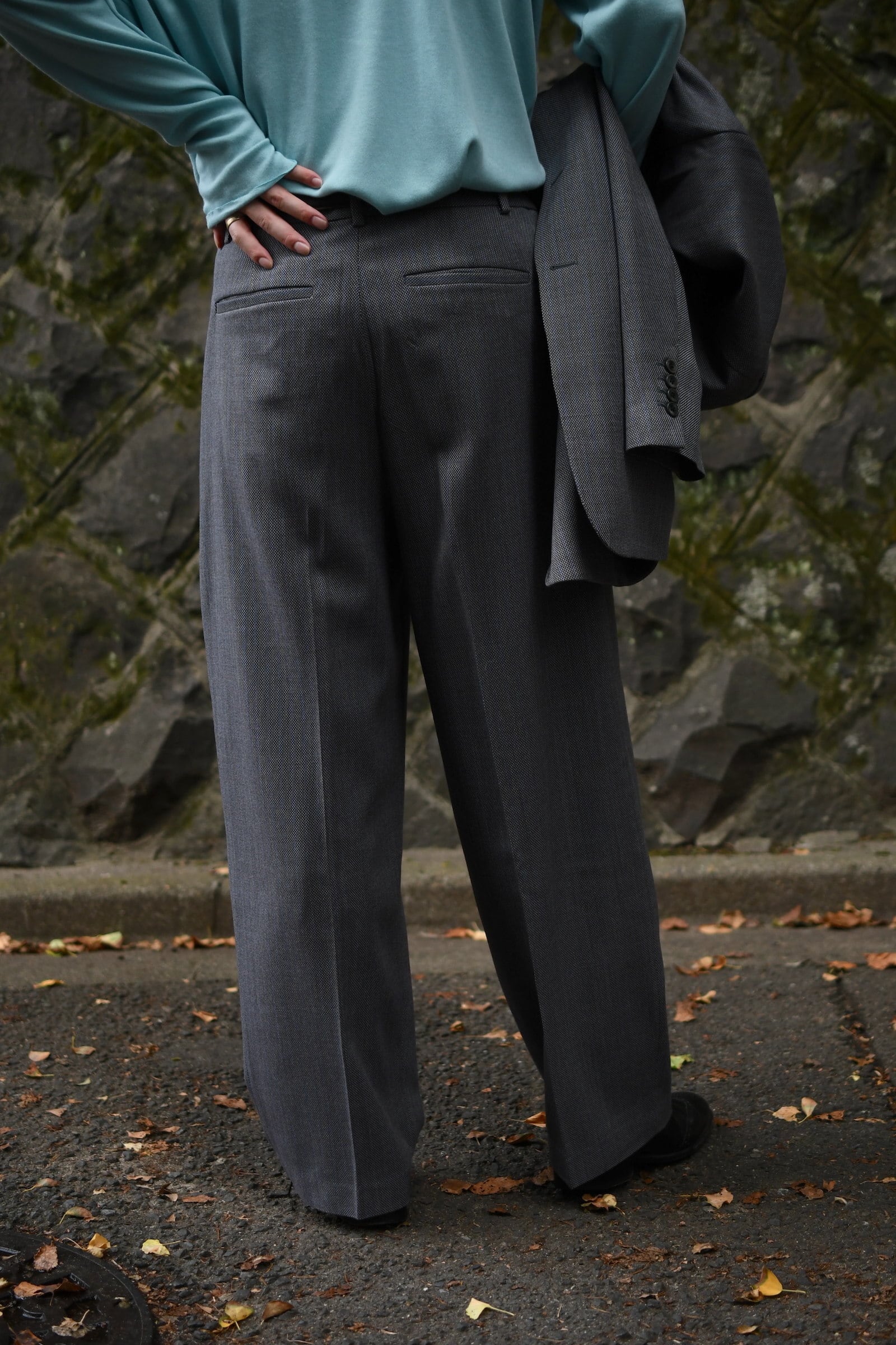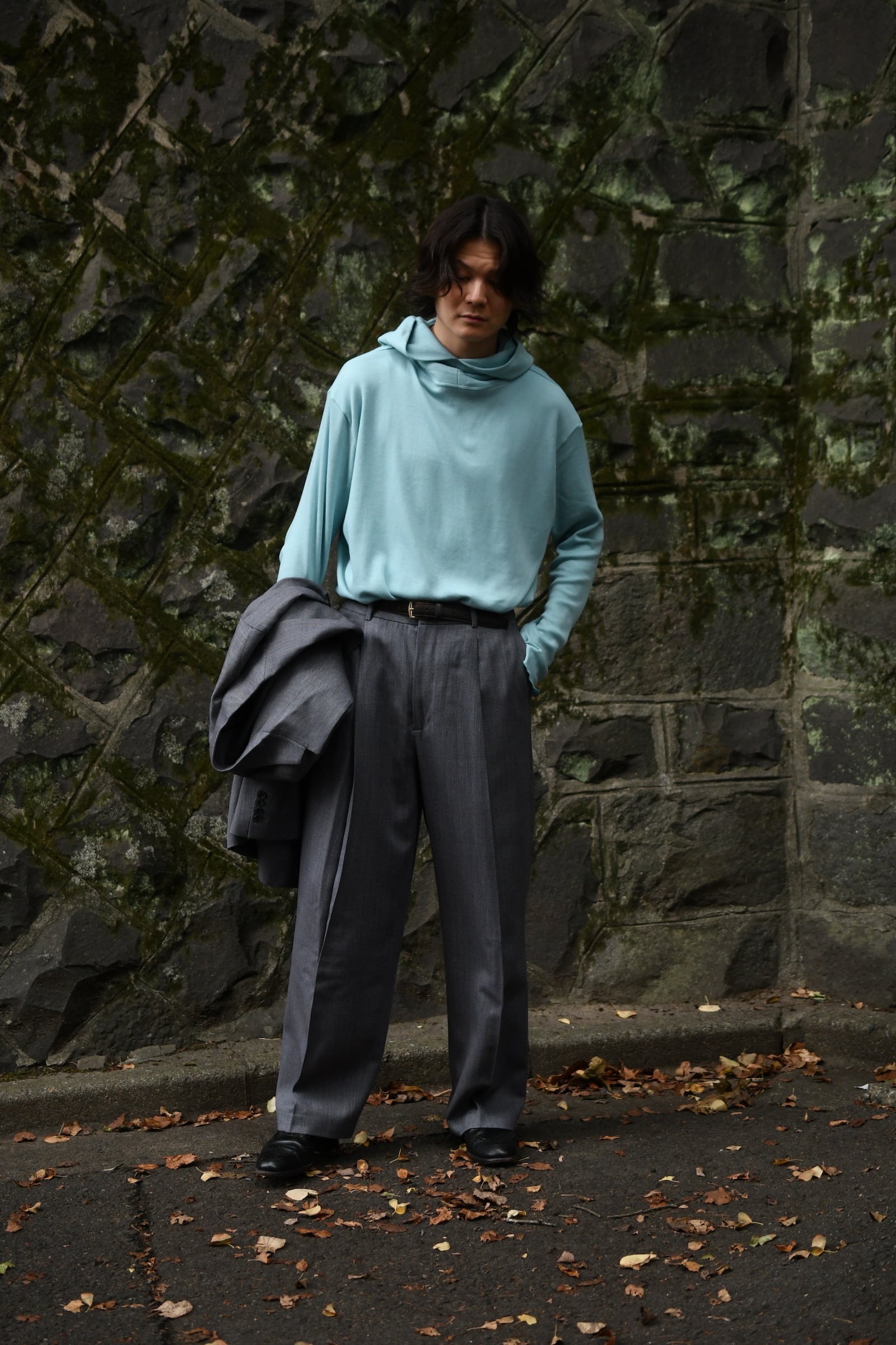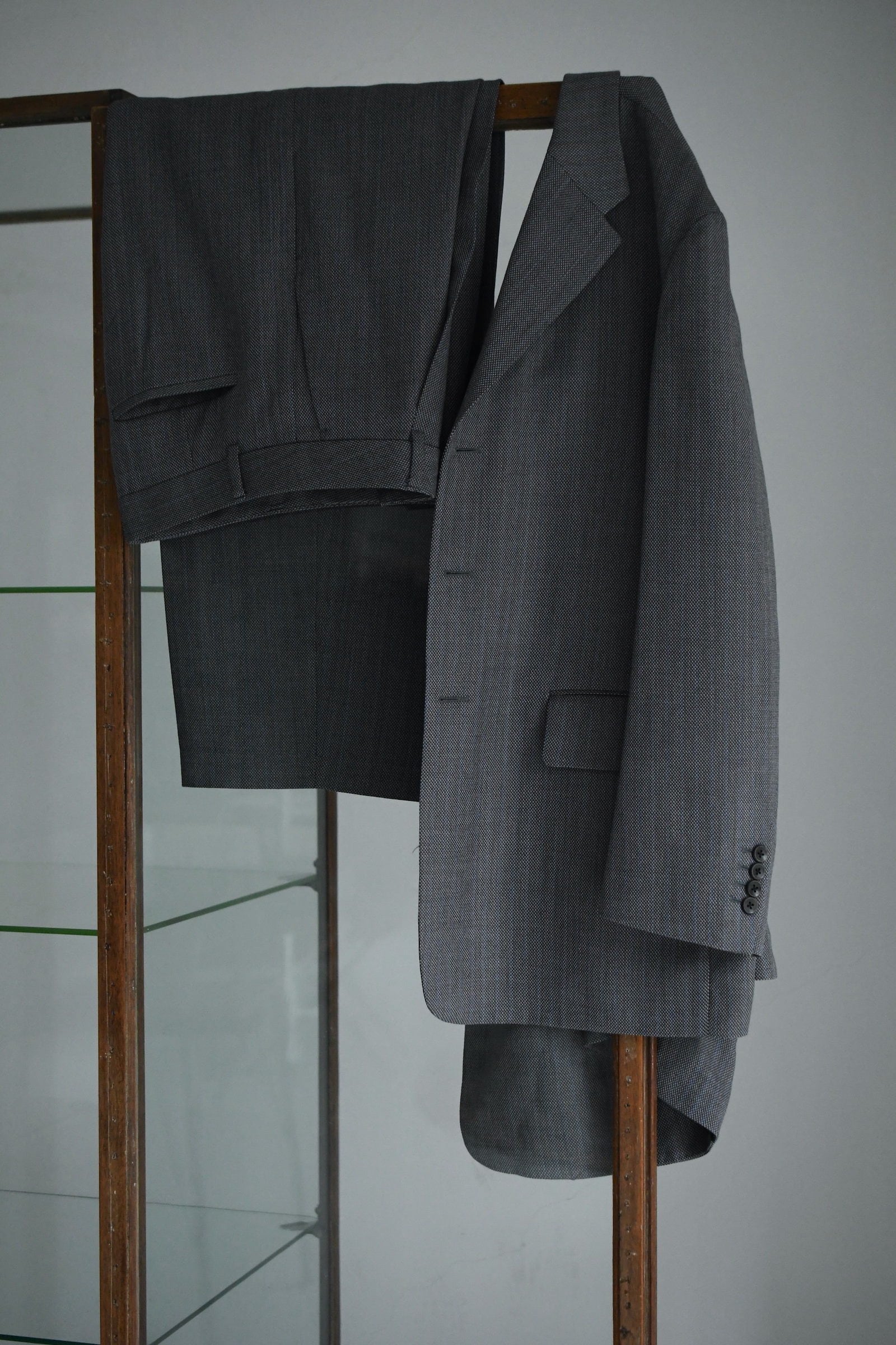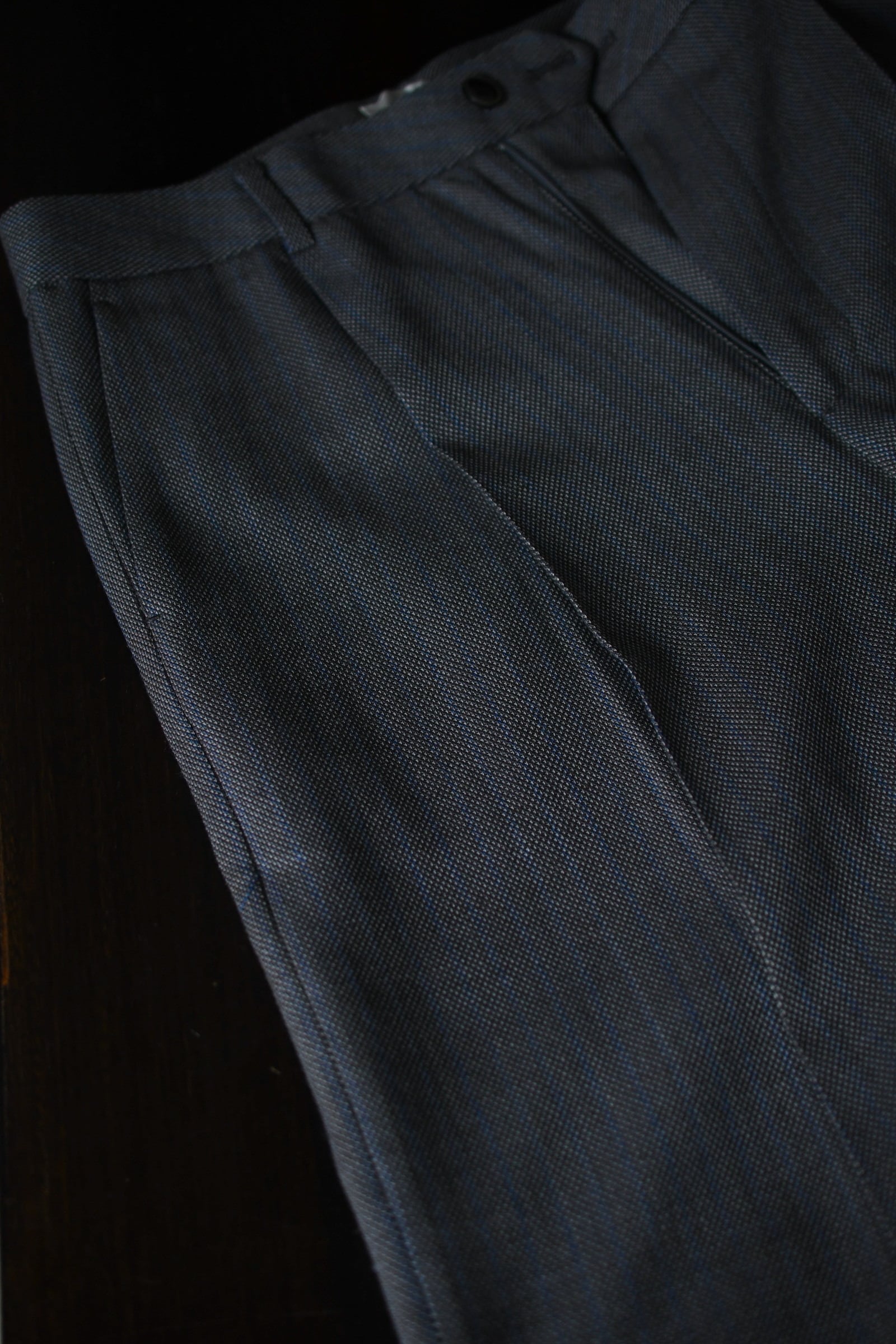別注に至ったキッカケでもあるこの生地は、英国社の老舗生地メーカーにて某コレクションブランドがオーダーしたデッドストックの英国ウール。グレーによる特徴的な織り目をベースに薄らと青い線が走り、控え目で合わせやすい色合いだが、不思議とスタイリングを引っ張ってくれる強さがそこにはある。
