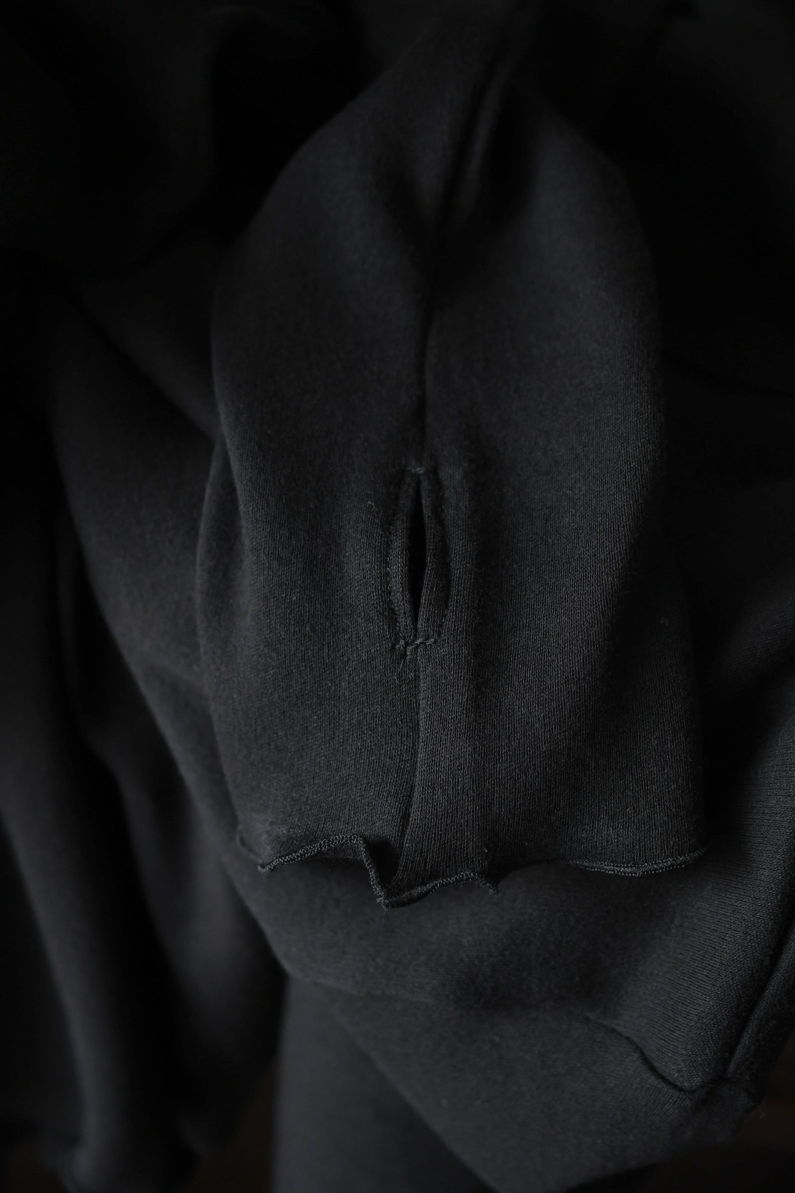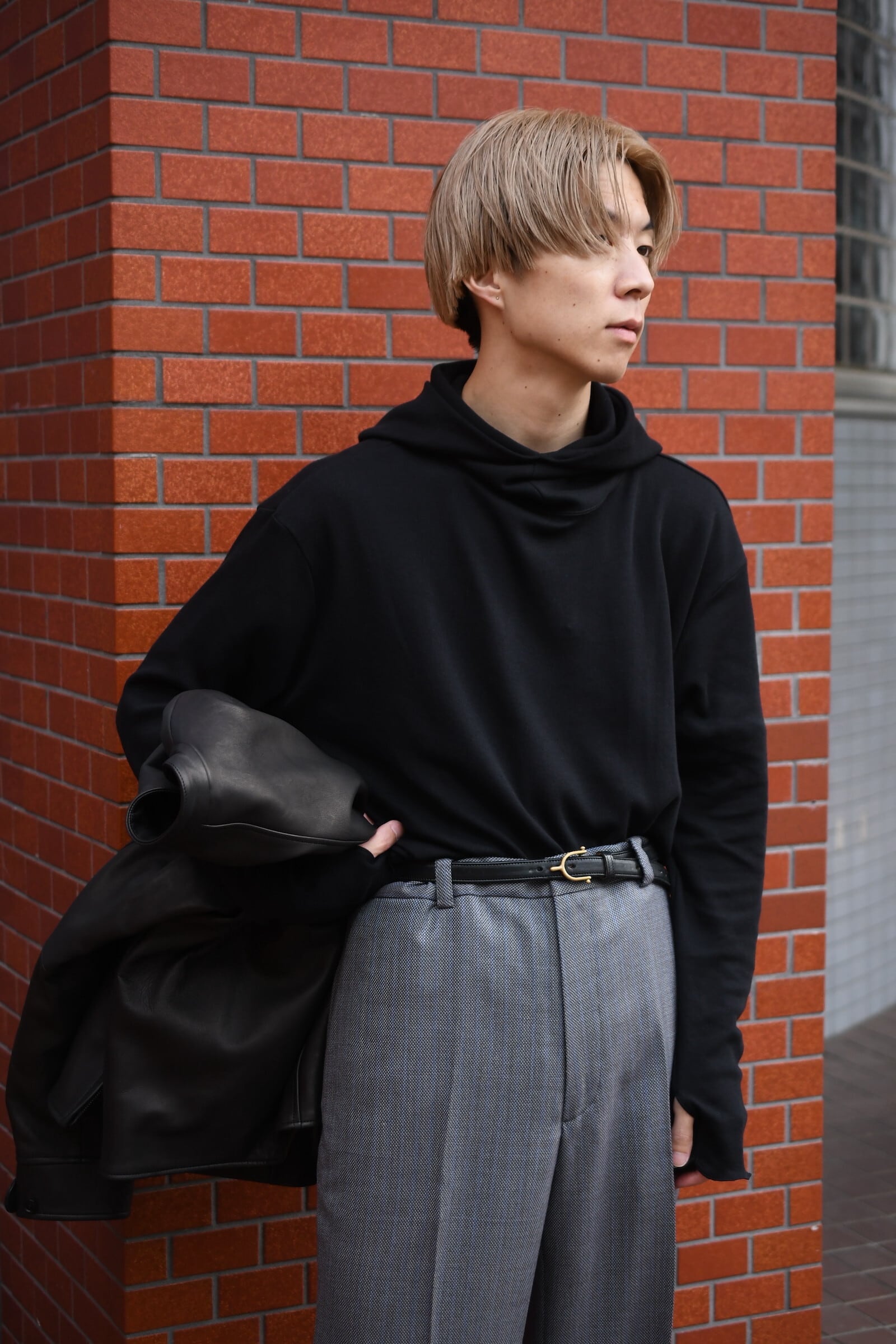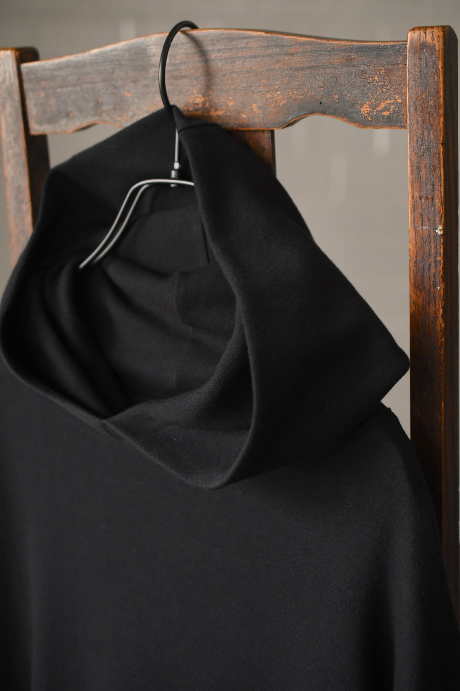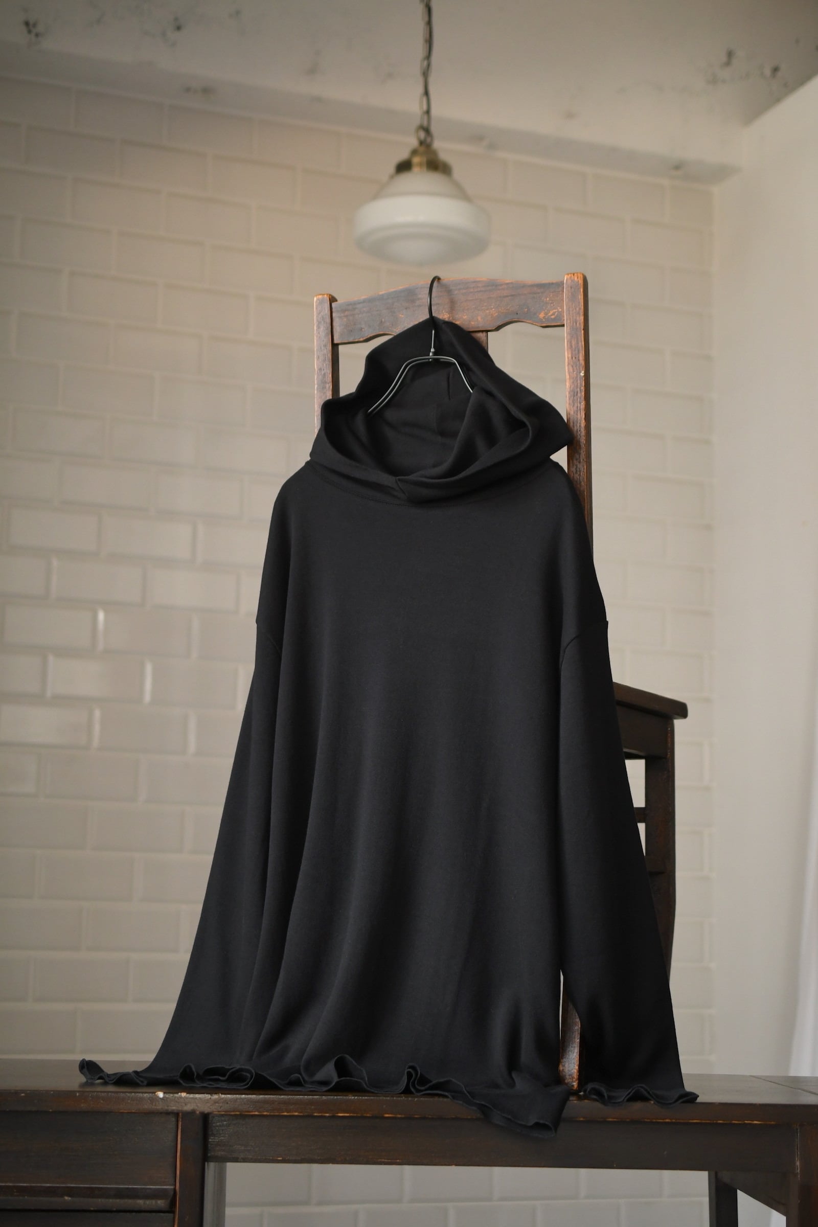 タートルネックとフーディーが掛け合わされた独特のデザインとフィンガーホールが施された袖は、シャツやジャケットの装いにアクセントを与えながら、ドレープの効いた上品な生地故にその見え方はカジュアル過ぎず嵩張らずで、男女ともに幅広く合わせられる。