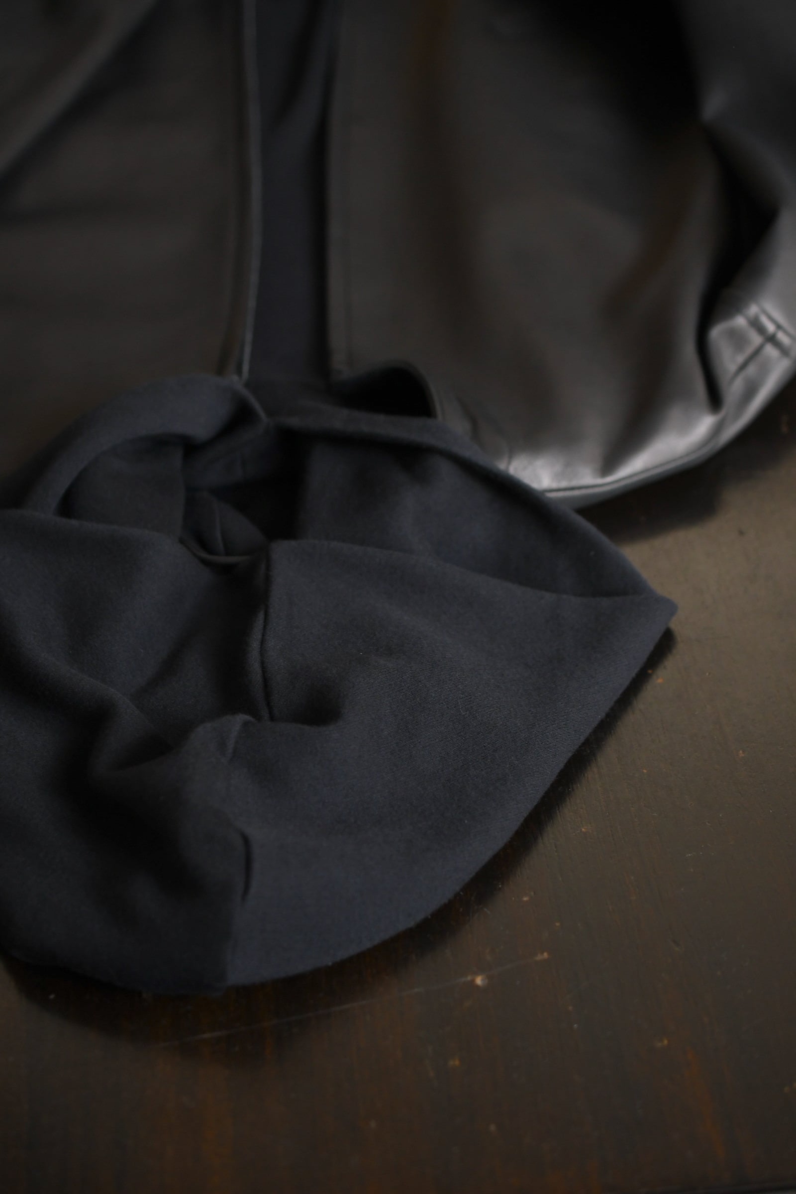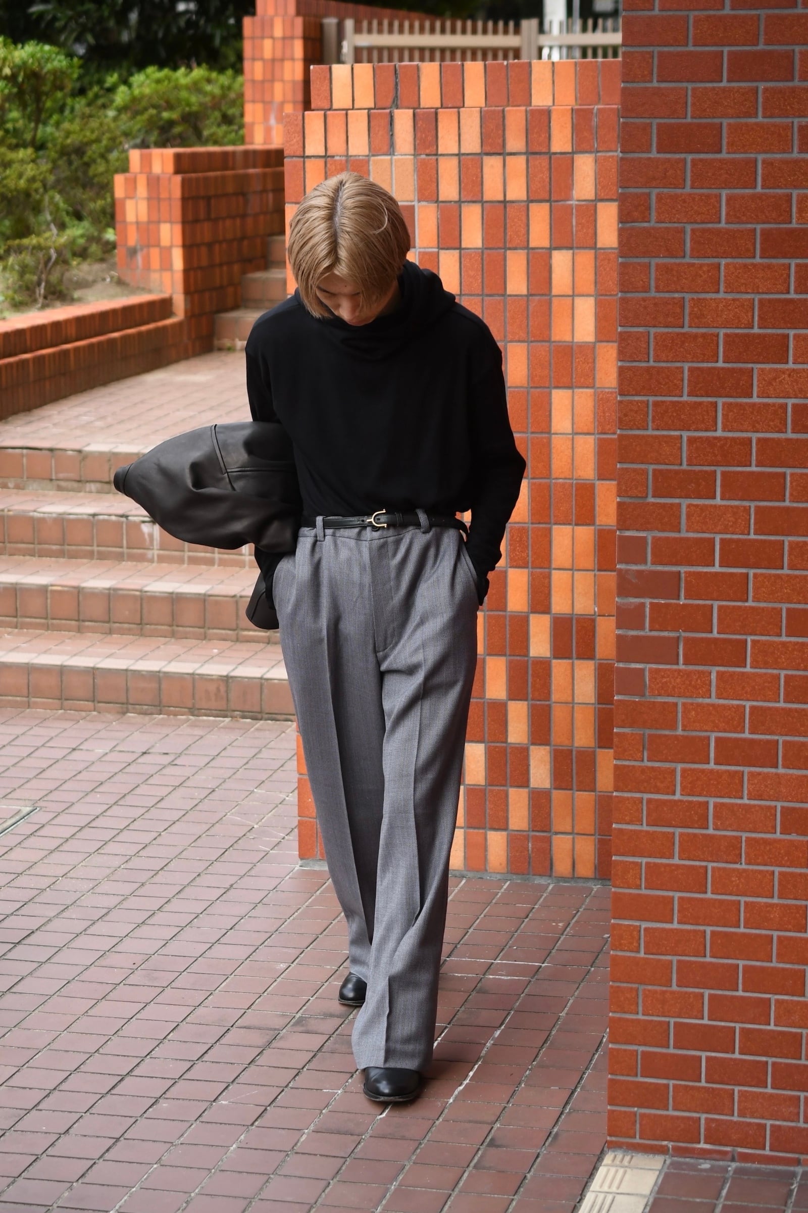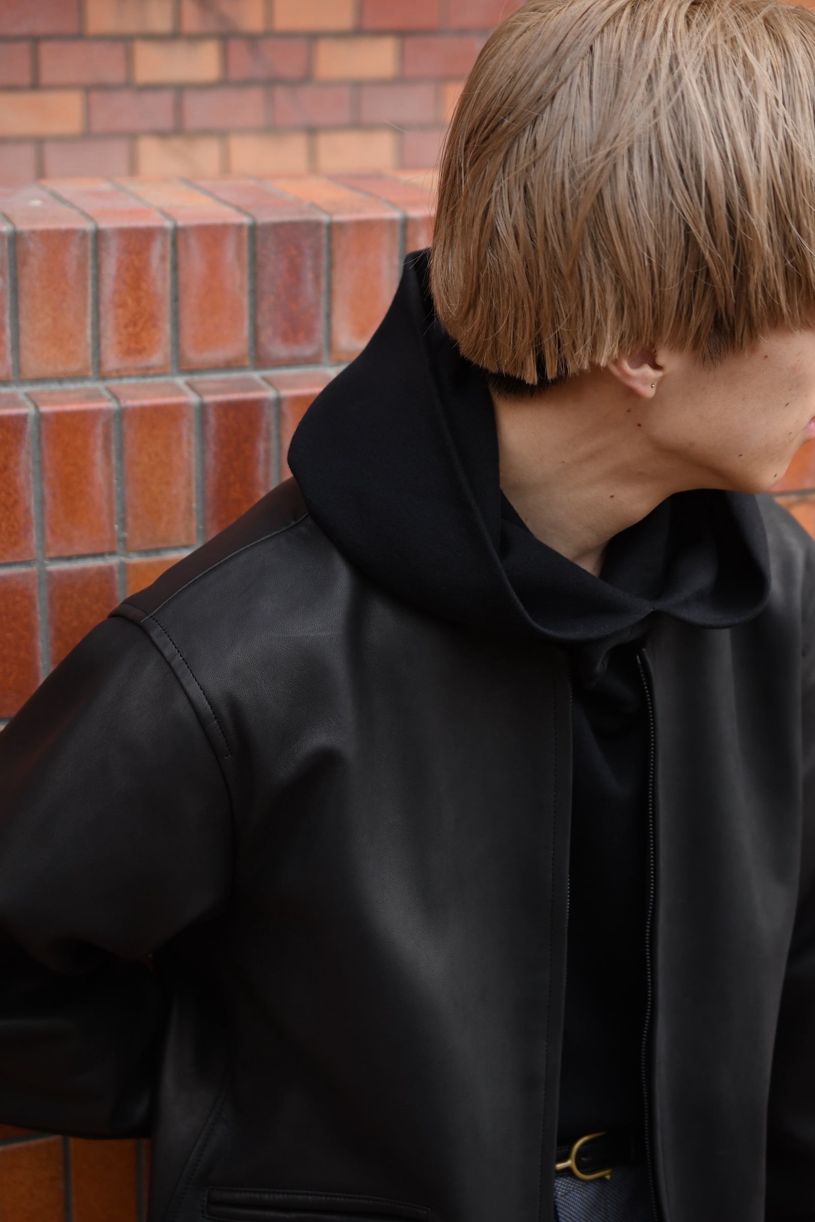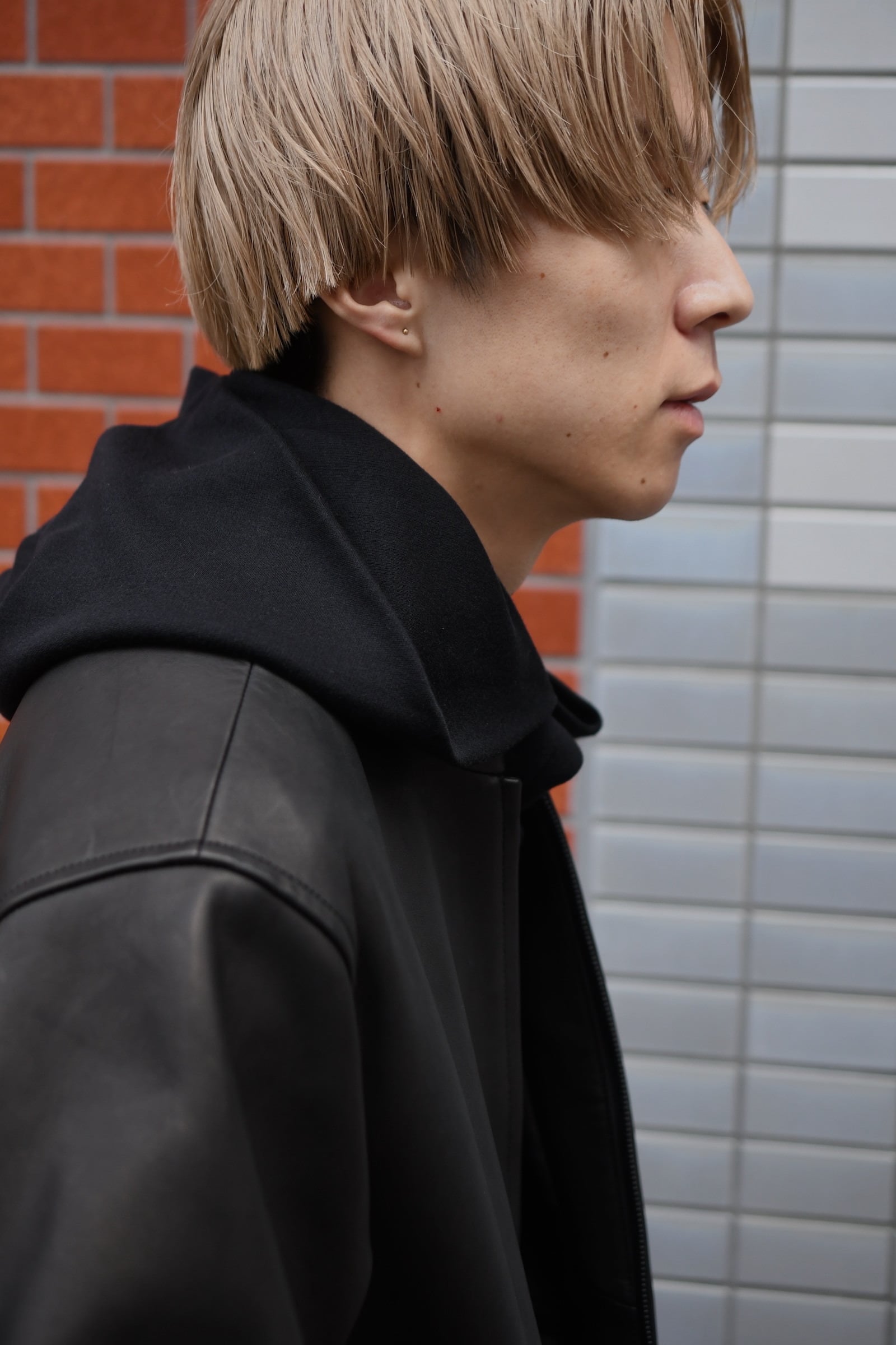 タートルネックとフーディーが掛け合わされた独特のデザインとフィンガーホールが施された袖は、シャツやジャケットの装いにアクセントを与えながら、ドレープの効いた上品な生地故にその見え方はカジュアル過ぎず嵩張らずで、男女ともに幅広く合わせられる。