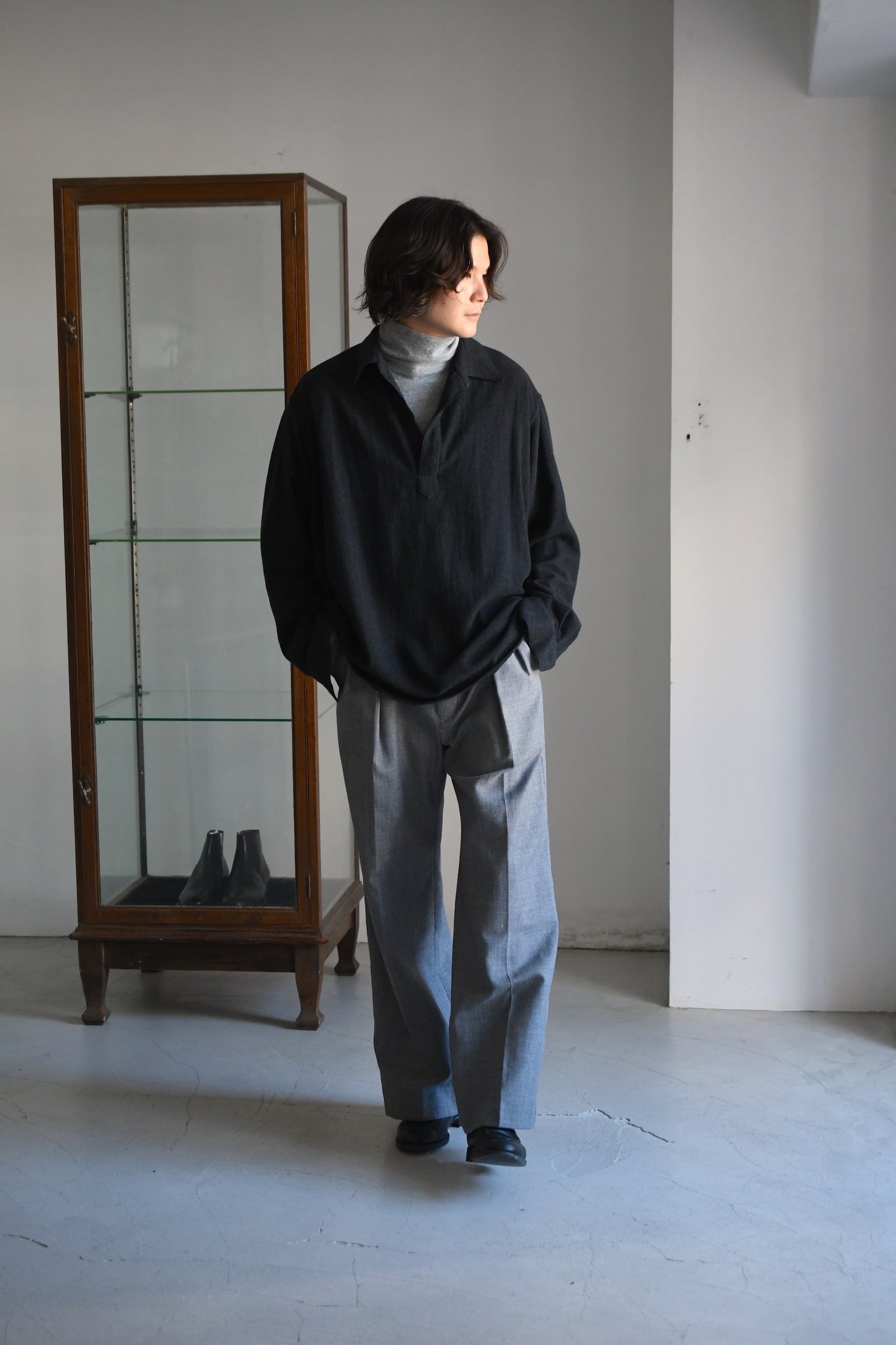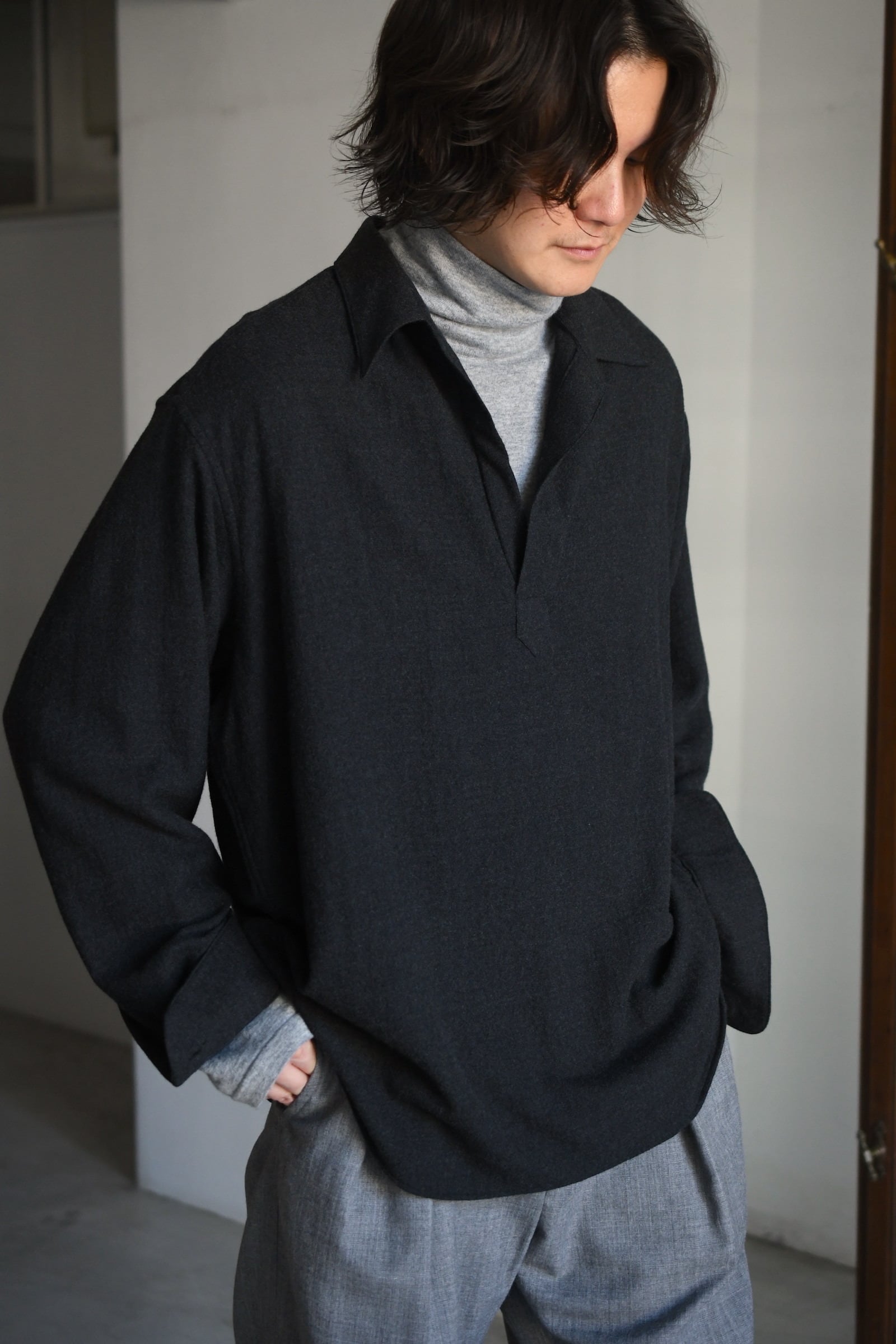 デザインはアメリカ由来のプルオーバーシャツをボタンレスのスキッパーにアレンジしたもの。少し体から離れた余白あるサイジングで緩さはあるが、上質な生地のドレープにより収まもよく、その佇まいはかなり端正である。