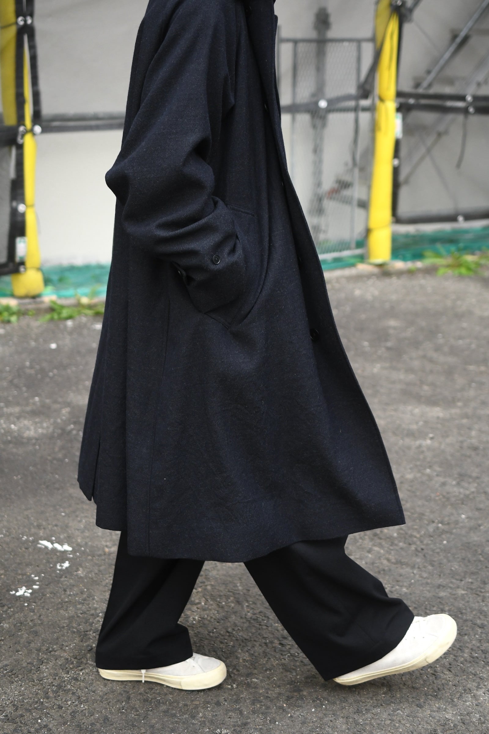 そして、たっぷり取った生地分量からも豊かな生地の表情をしっかりと感じる事ができ、ラグランスリーブから裾に向かう綺麗なアウトラインと緩やかな蹴回しは、歩行時を中心とした動きの中で美しいAラインのシルエットを演出。