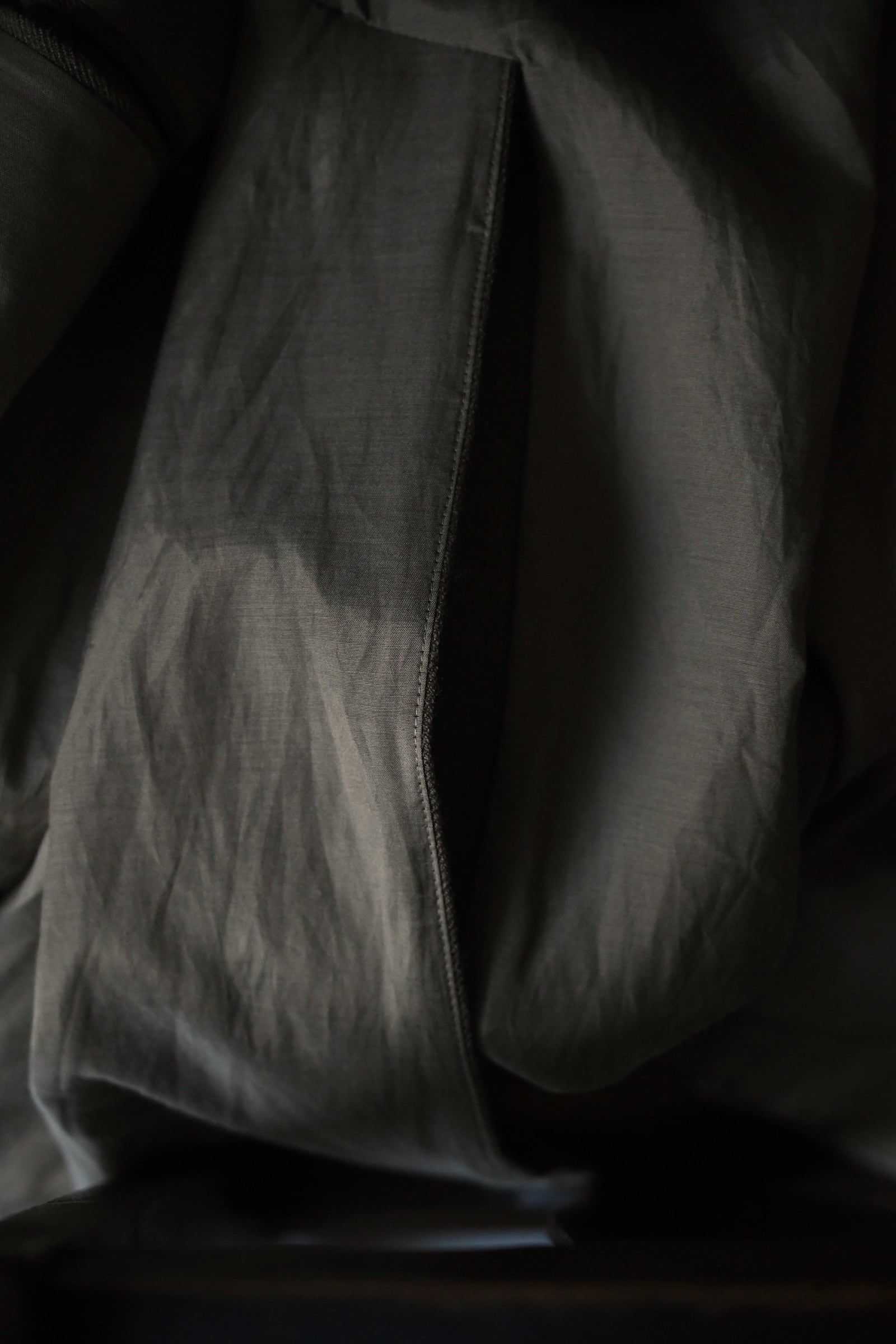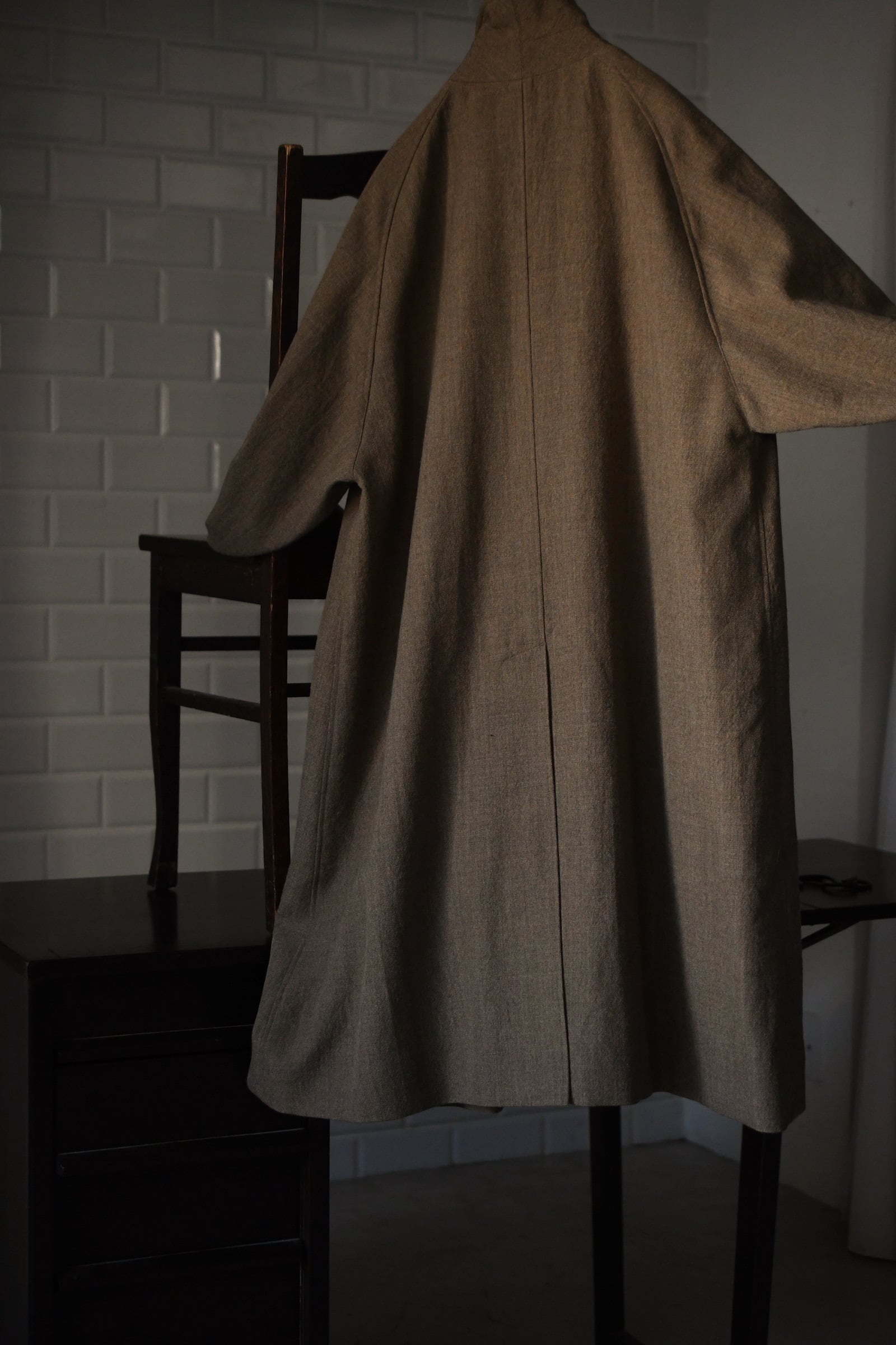 そして、たっぷり取った生地分量からも豊かな生地の表情をしっかりと感じる事ができ、ラグランスリーブから裾に向かう綺麗なアウトラインと緩やかな蹴回しは、歩行時を中心とした動きの中で美しいAラインのシルエットを演出。
