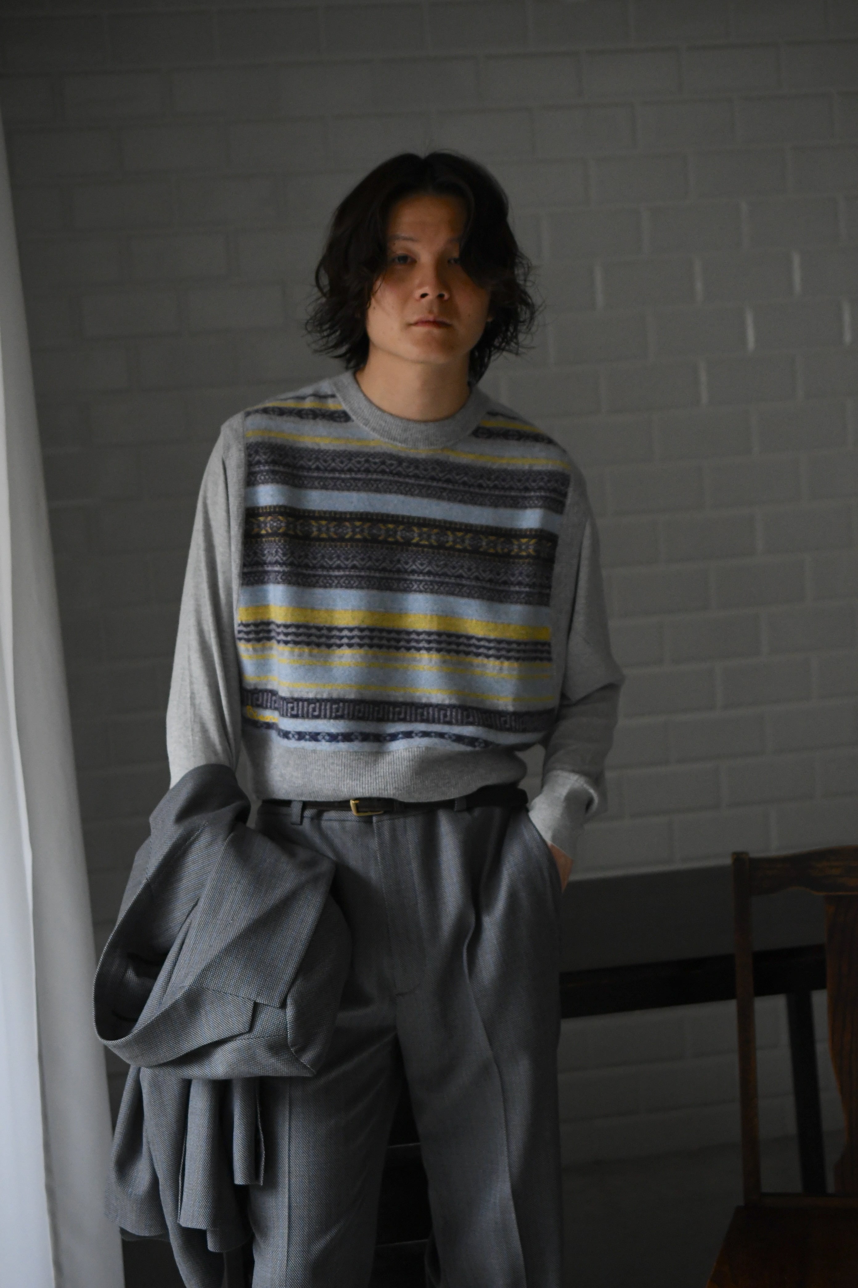 内モンゴル産の希少なホワイトカシミアを注ぎ込んだBISOWNオリジナルの”裏”フェアアイル柄は、その配色センスと素材の風合いも相まって男性でも難なく着れる丁度良いフェミニンさを醸し出していた。