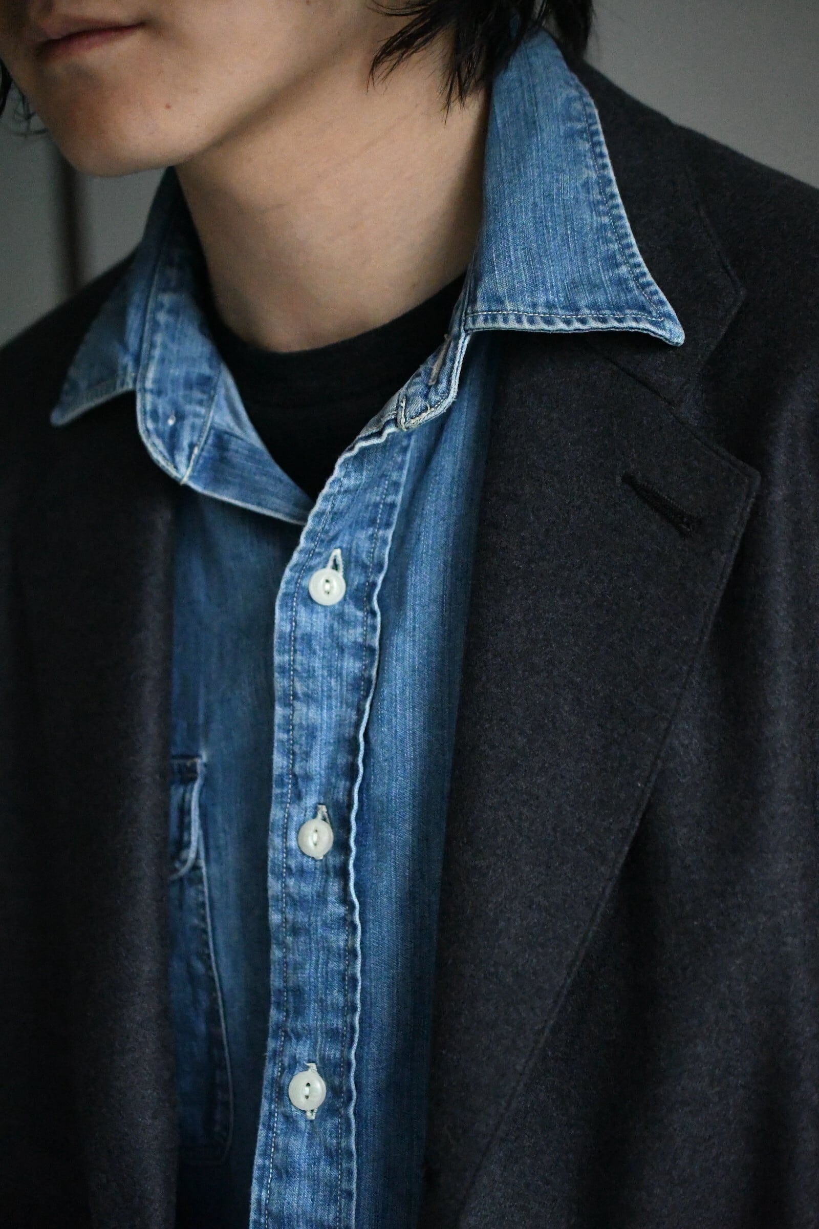 秋冬仕様として届いた今作では、イタリアで織り上げられたSuper140’sファインウールから成る上質なフランネル生地を採用しており、写真からでも十分に伝わるほど滑らかな優しい肌当たりと上品な空気感が漂っている。そしてシャツ以上ジャケット未満の厚みを活かすように一重(袖裏のみキュプラ)で仕立てられたバランスは、シャツのように軽く羽織れながらジャケットらしい存在感があり、その上で暖かく、様々なレイヤードも可能とする優秀な1着へと繋がっている。
