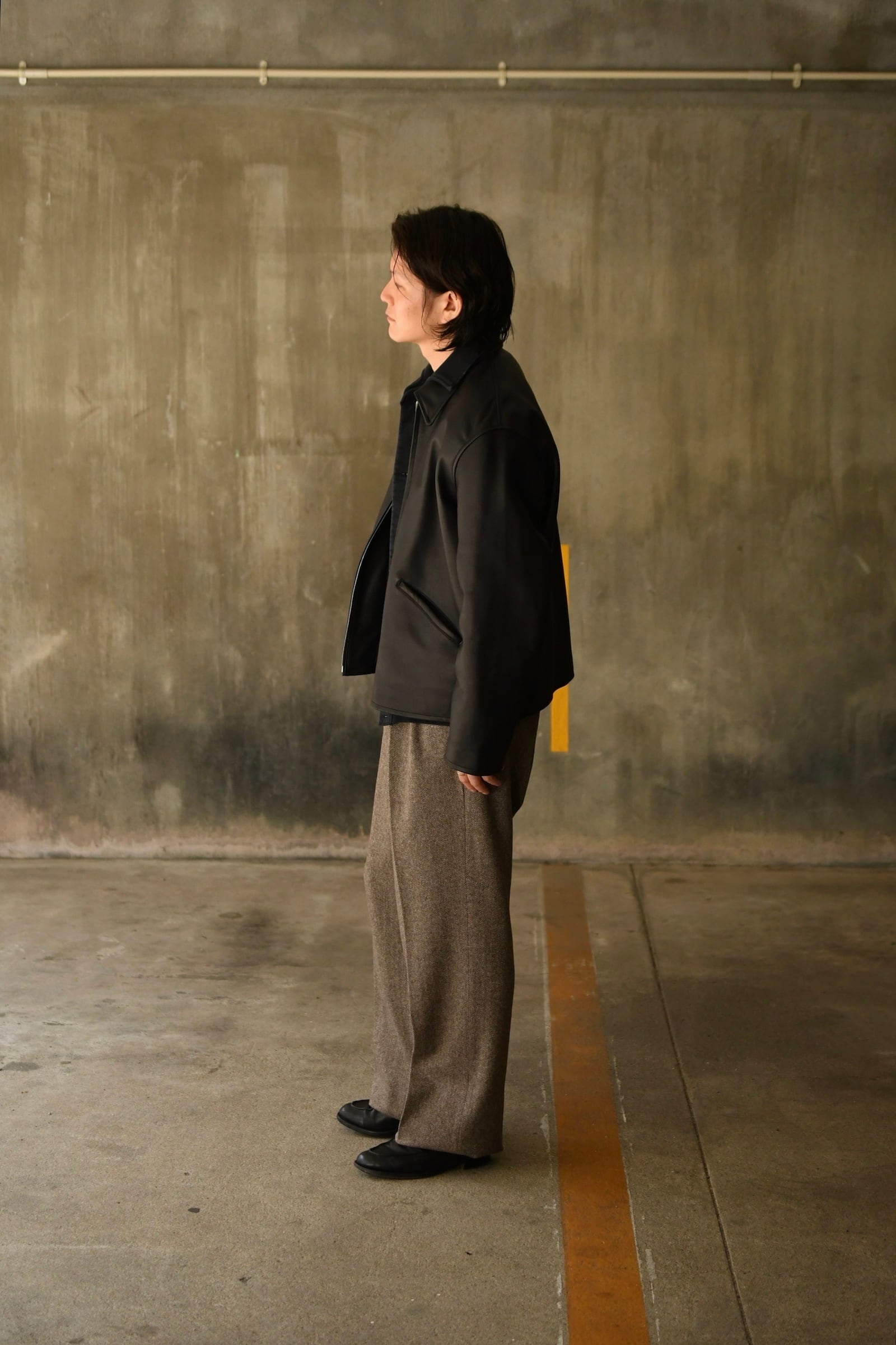 経緯共に双糸のラムウールブレンド紡毛を用いて織り上げた新たなヘリンボーンは、杢糸の色濃度に差異を作る事で生まれた奥行きのある豊かな色目と、強度がありながらも非常に柔らかく滑らかな肌当たりが大きな魅力と言える。
