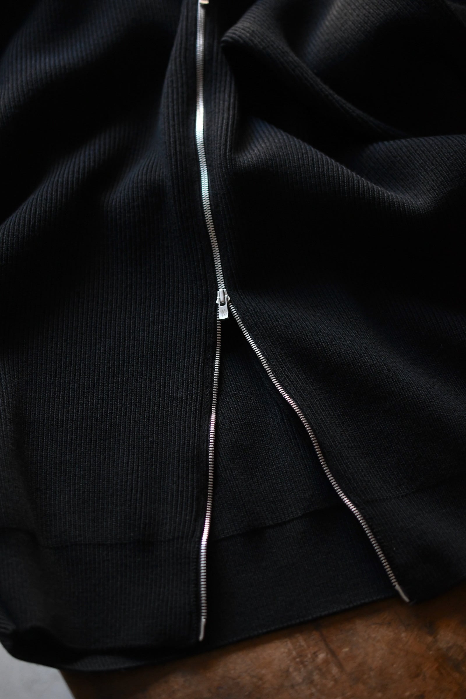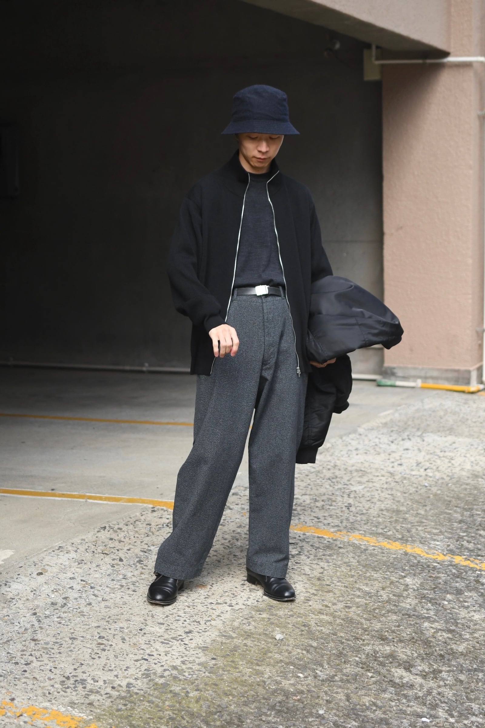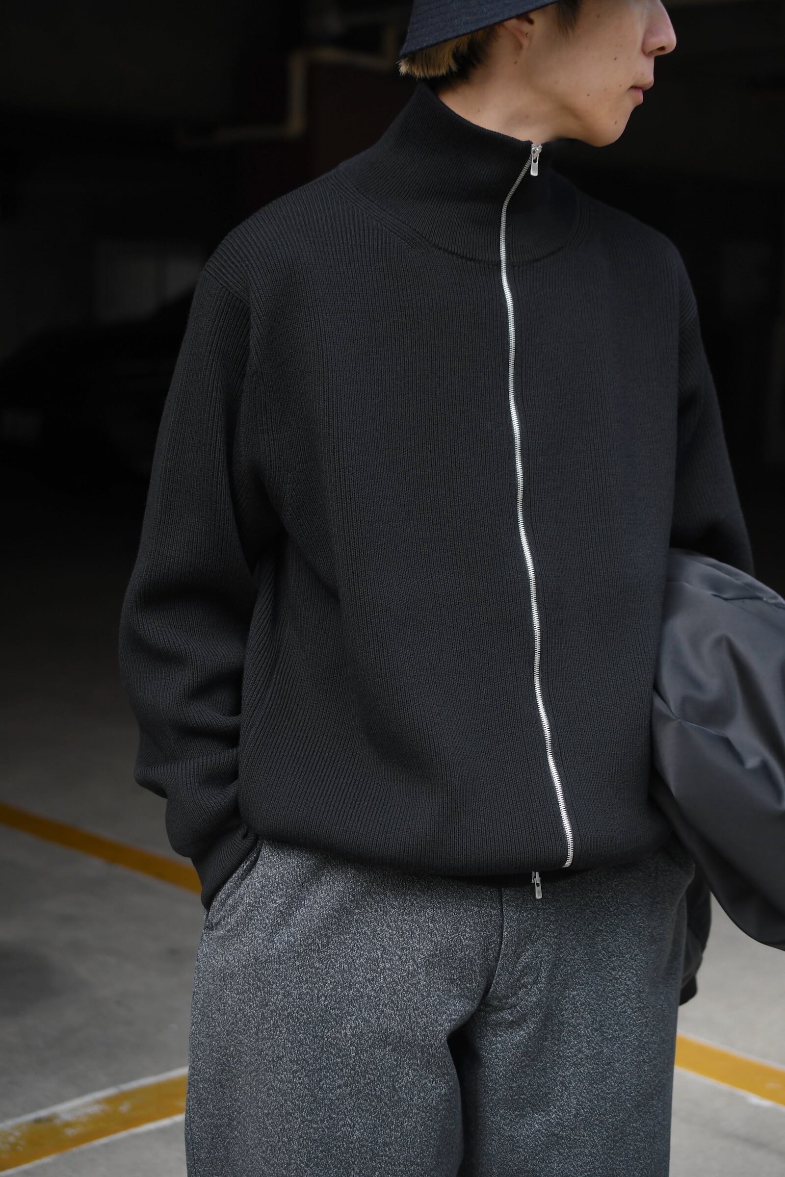 ウール100%だが、少しドライで立体的な風合いが全体感に程よく柔らかさを纏わせており、その分、縦中央を走るフルZIPの鈍い光沢感が程よく全体の印象を引き締めているため、その佇まいは見事なまでにモダンである。