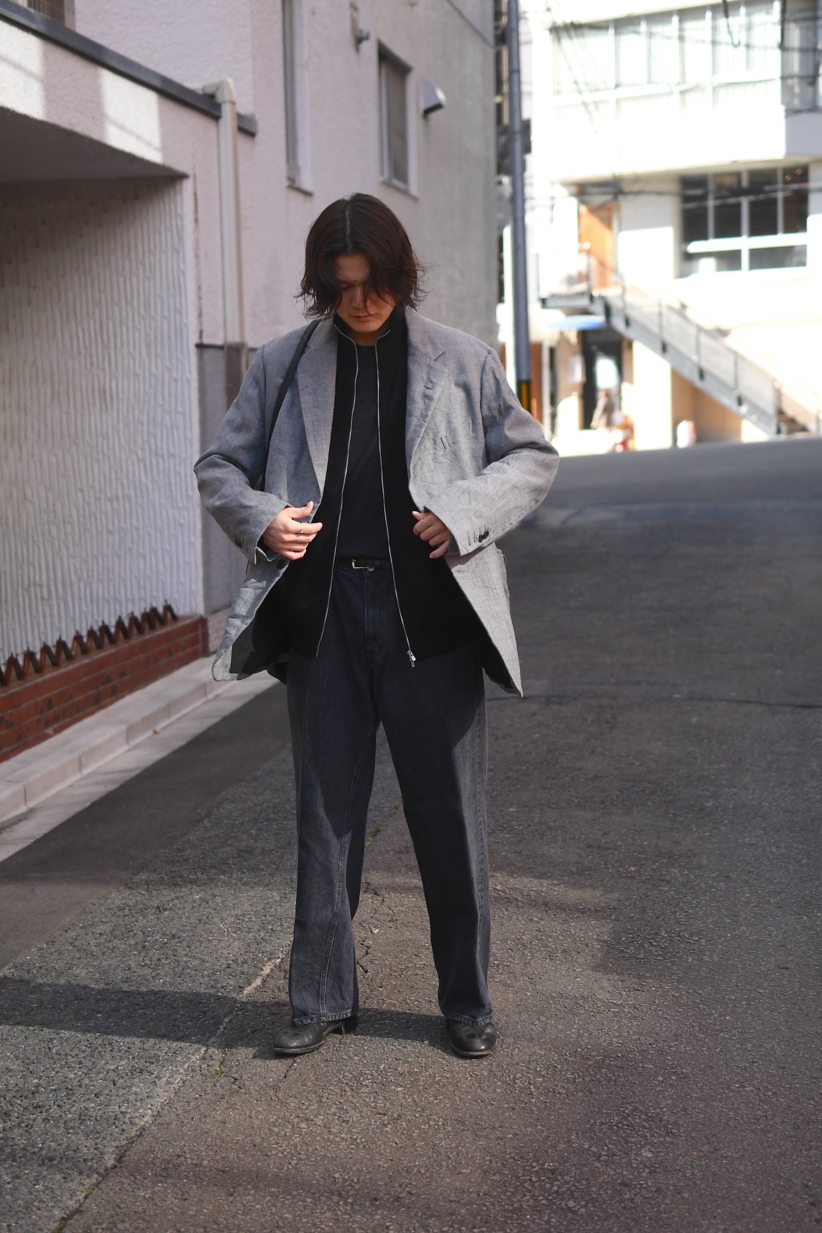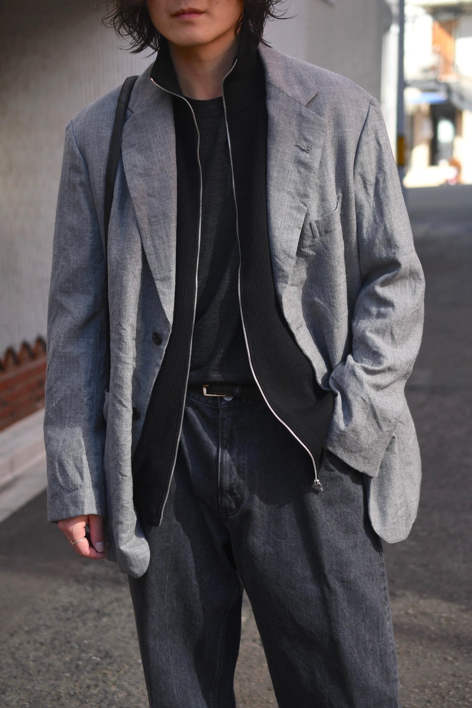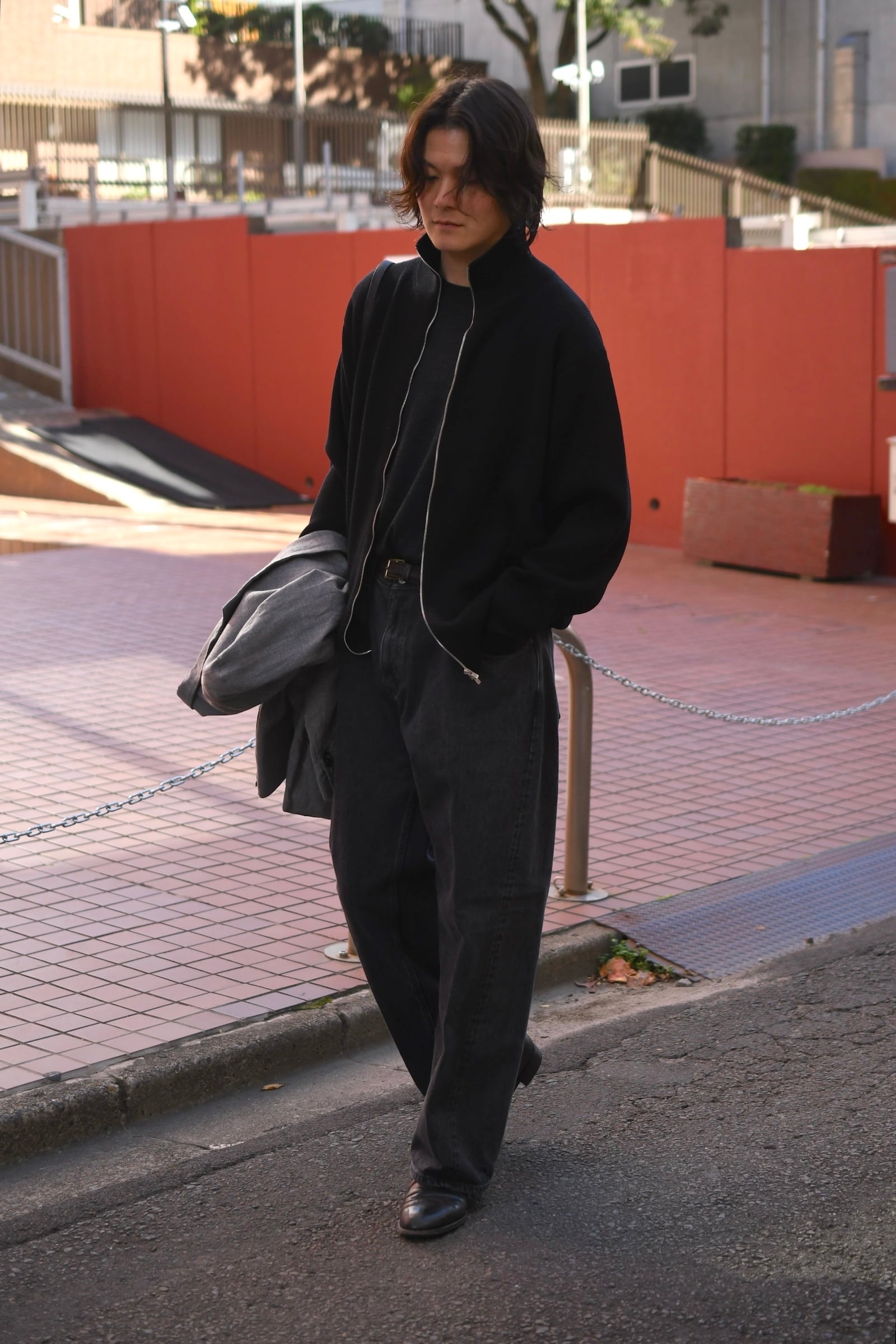 ウール100%だが、少しドライで立体的な風合いが全体感に程よく柔らかさを纏わせており、その分、縦中央を走るフルZIPの鈍い光沢感が程よく全体の印象を引き締めているため、その佇まいは見事なまでにモダンである。