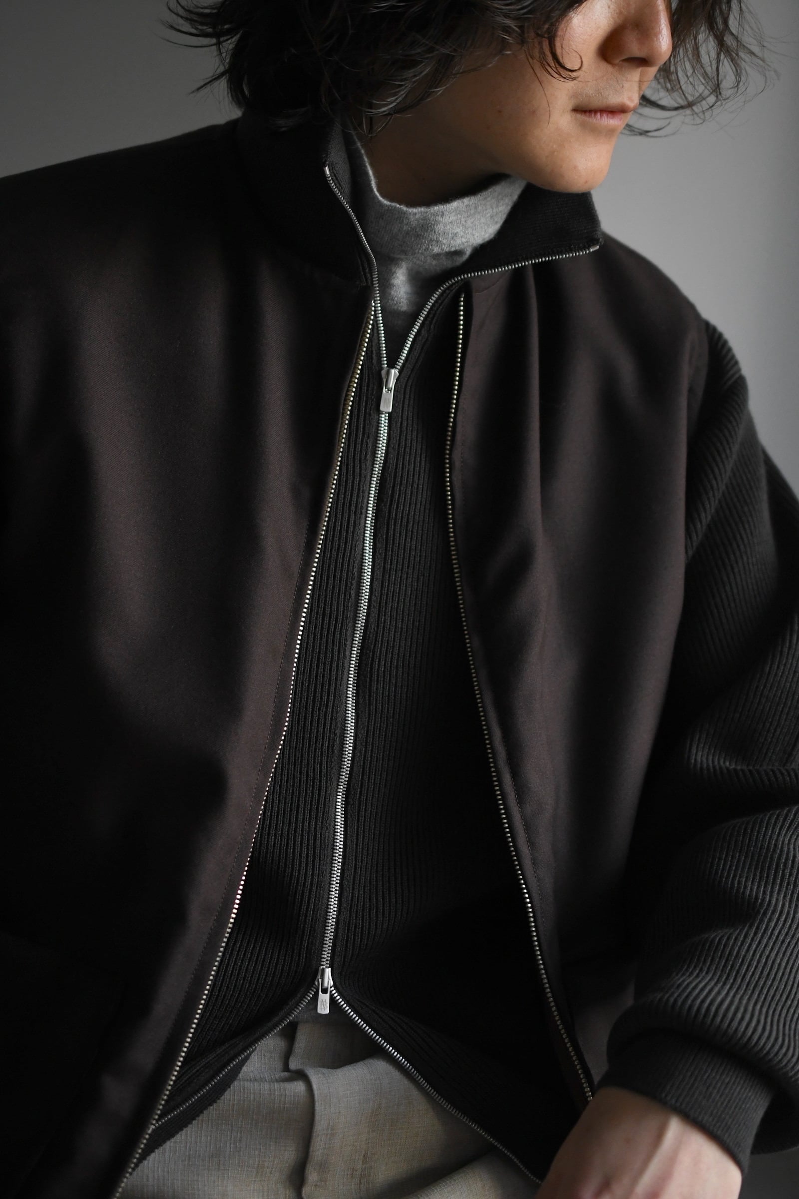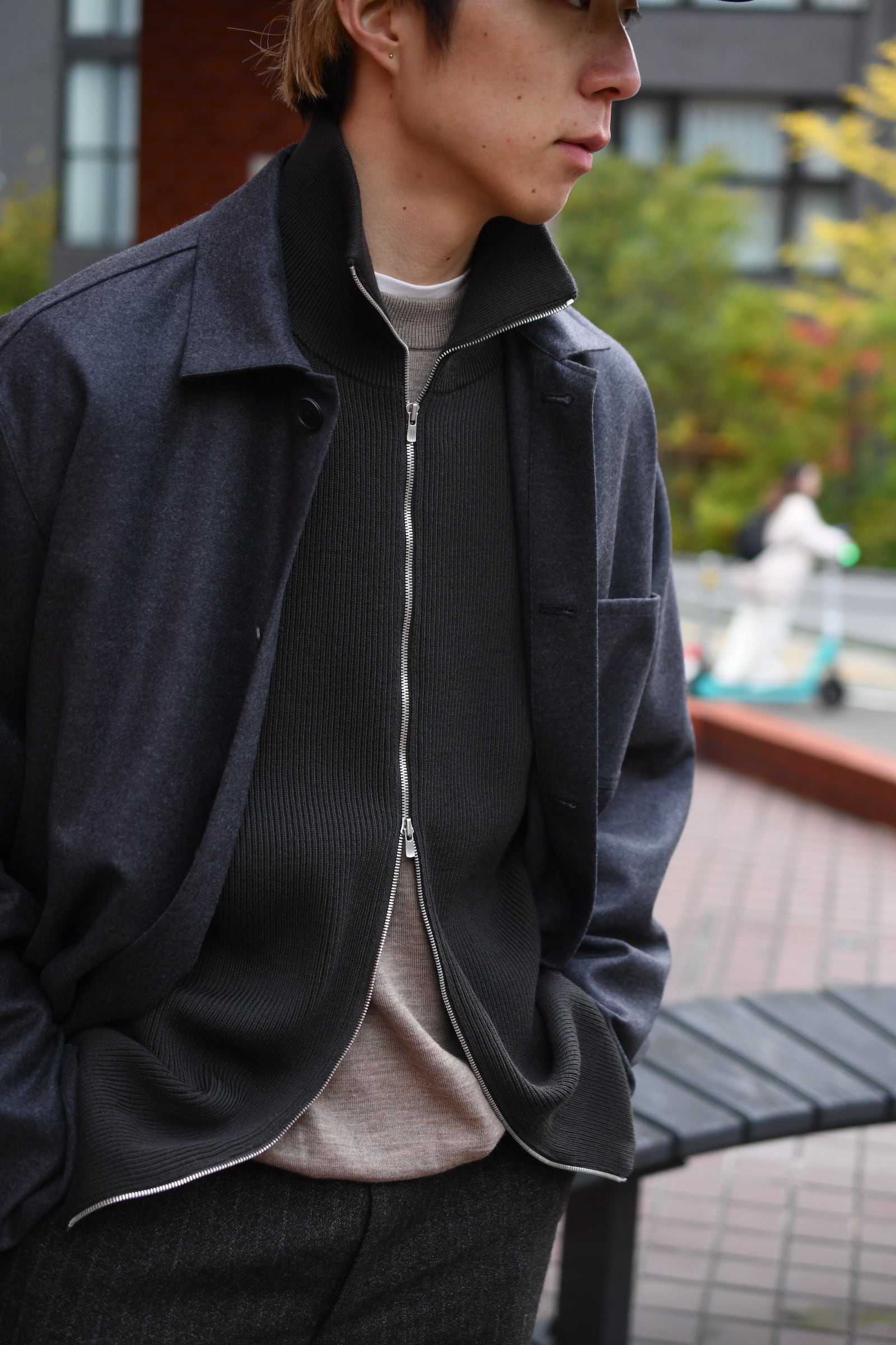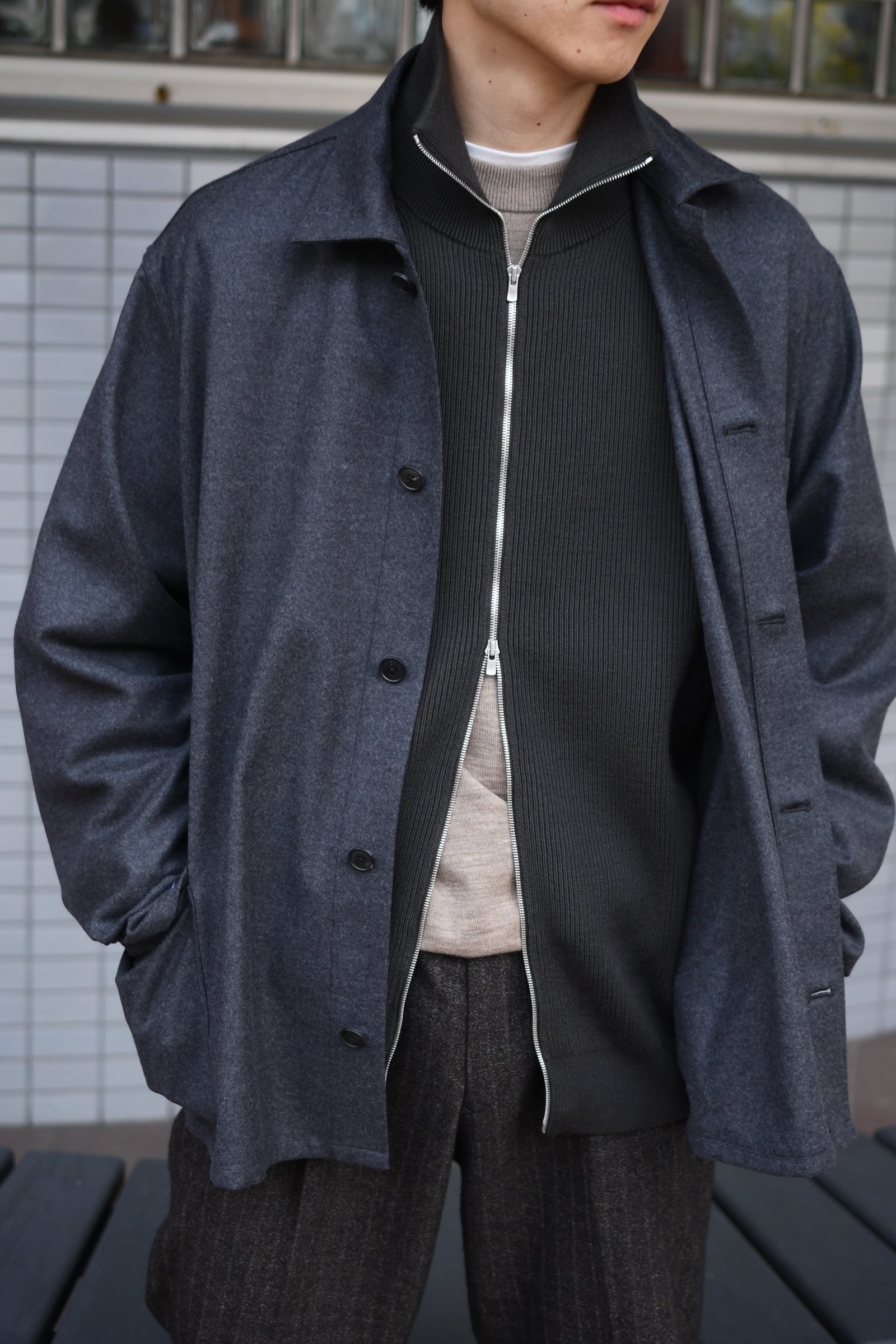ウール100%だが、少しドライで立体的な風合いが全体感に程よく柔らかさを纏わせており、その分、縦中央を走るフルZIPの鈍い光沢感が程よく全体の印象を引き締めているため、その佇まいは見事なまでにモダンである。