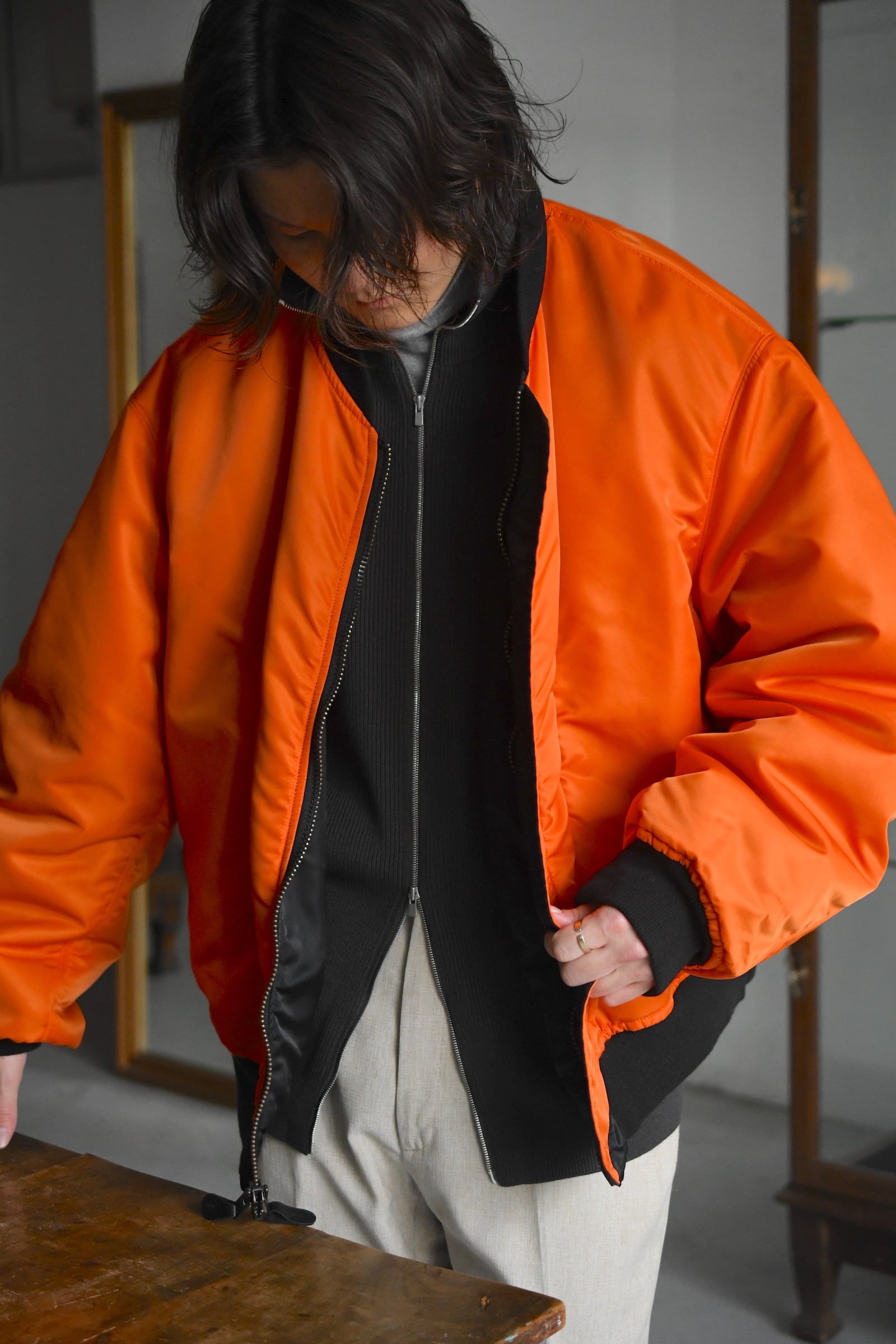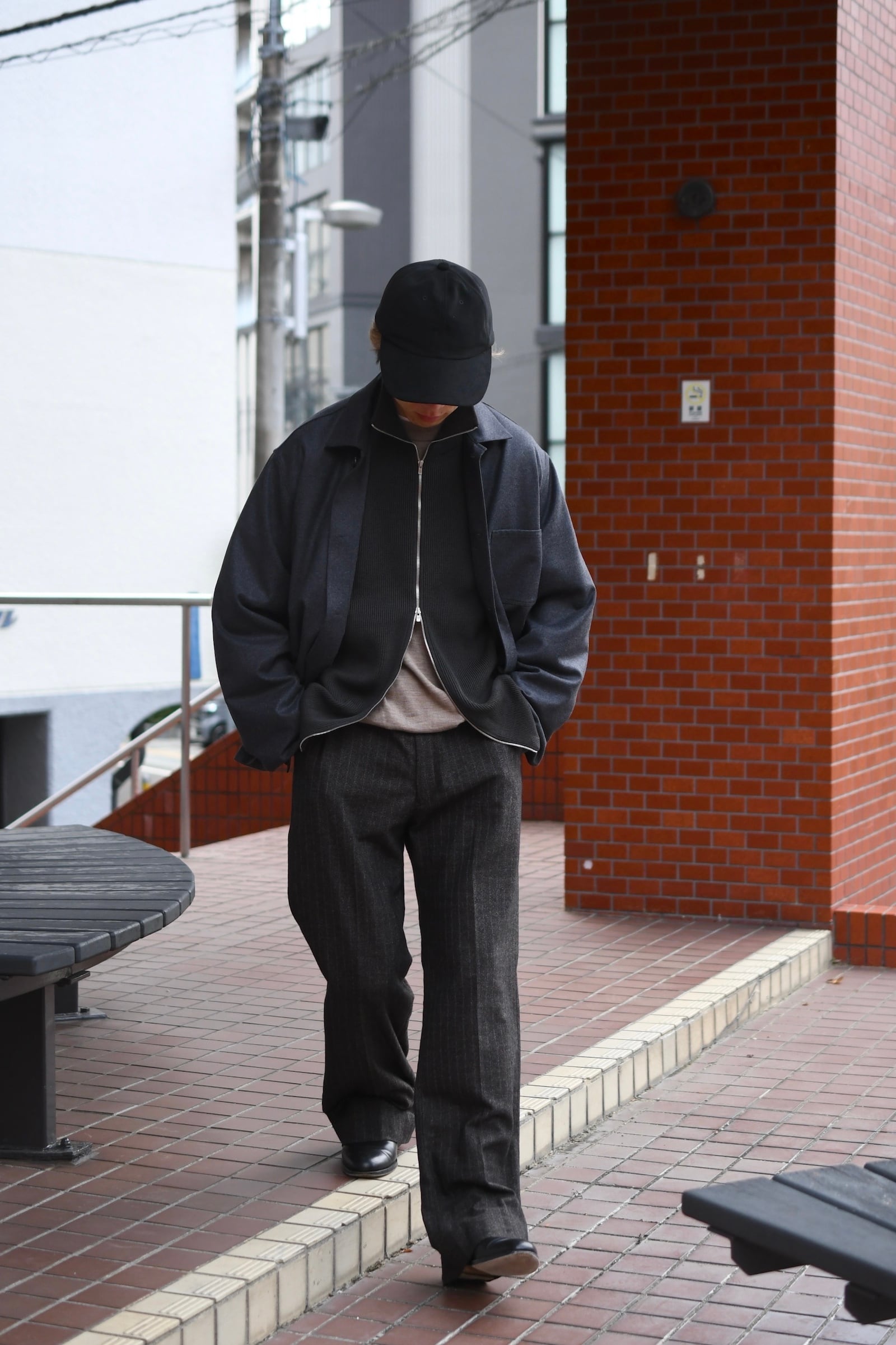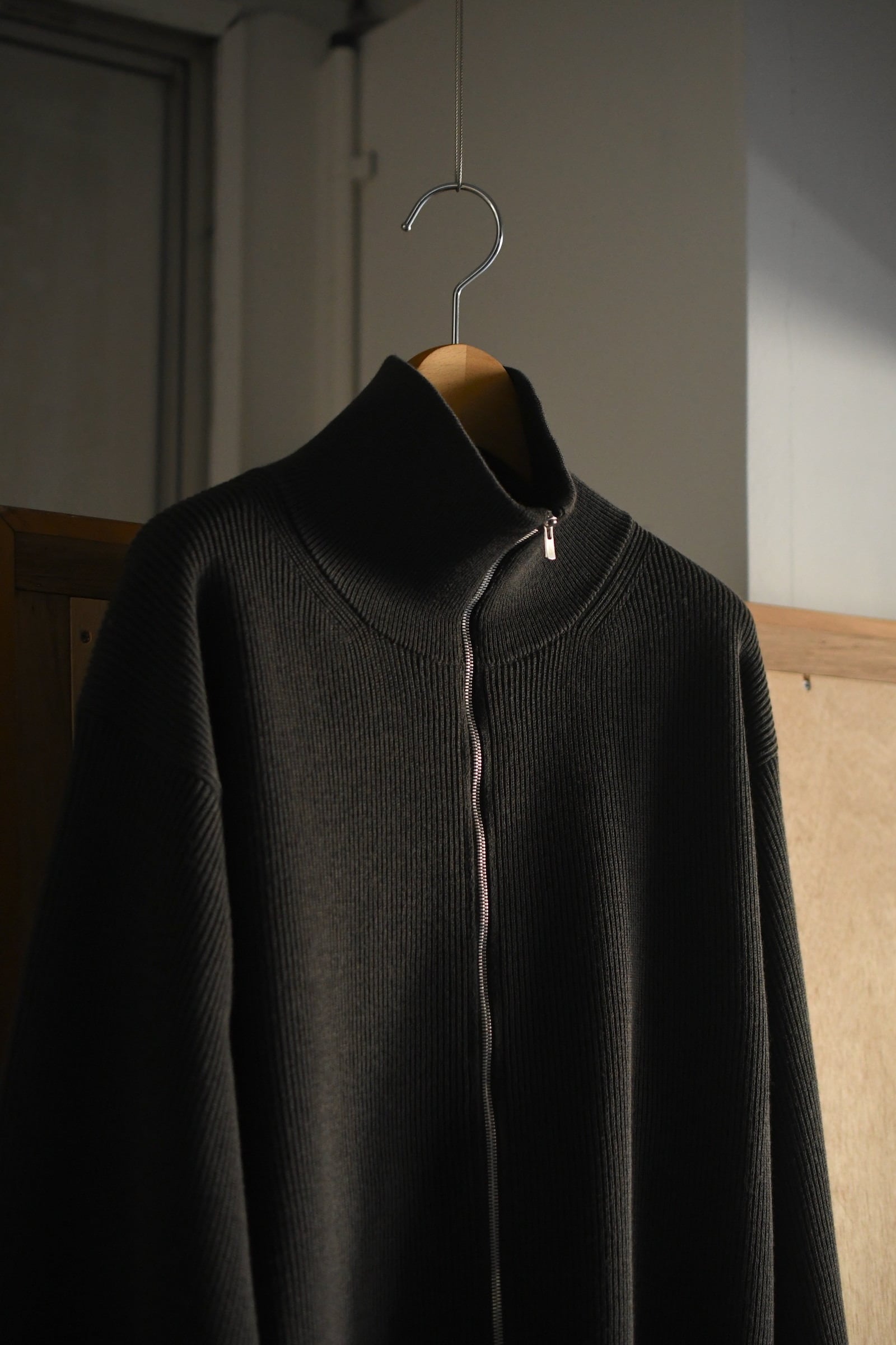 ウール100%だが、少しドライで立体的な風合いが全体感に程よく柔らかさを纏わせており、その分、縦中央を走るフルZIPの鈍い光沢感が程よく全体の印象を引き締めているため、その佇まいは見事なまでにモダンである。