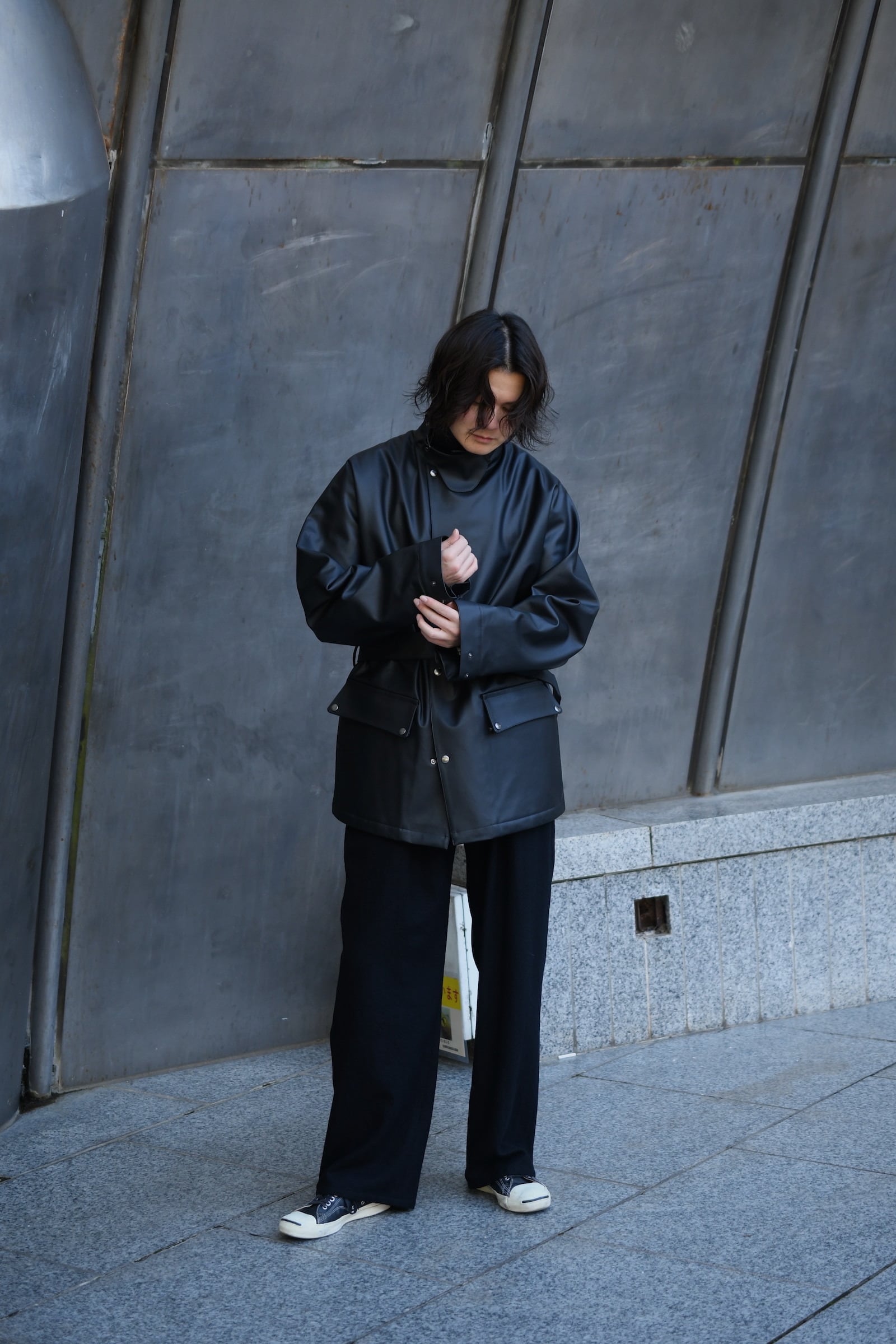 表地には北陸産地の合繊維メーカーが特別に手掛けた透湿性のあるラミネートファブリックを使用し、裏地には国内の尾州産地でブランドが別注を行い製作したウール生地を与えたモーターサイクルブルゾン。