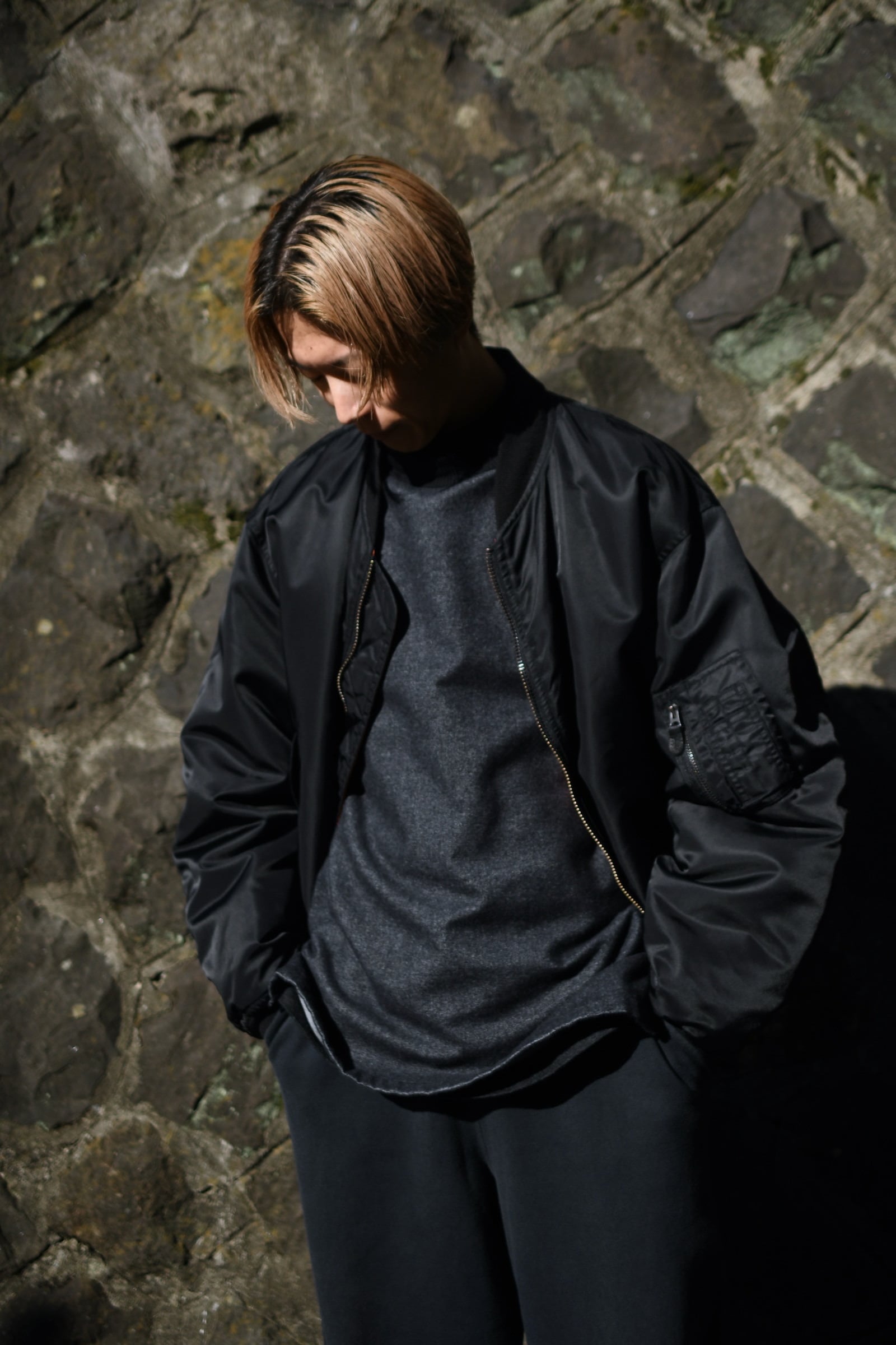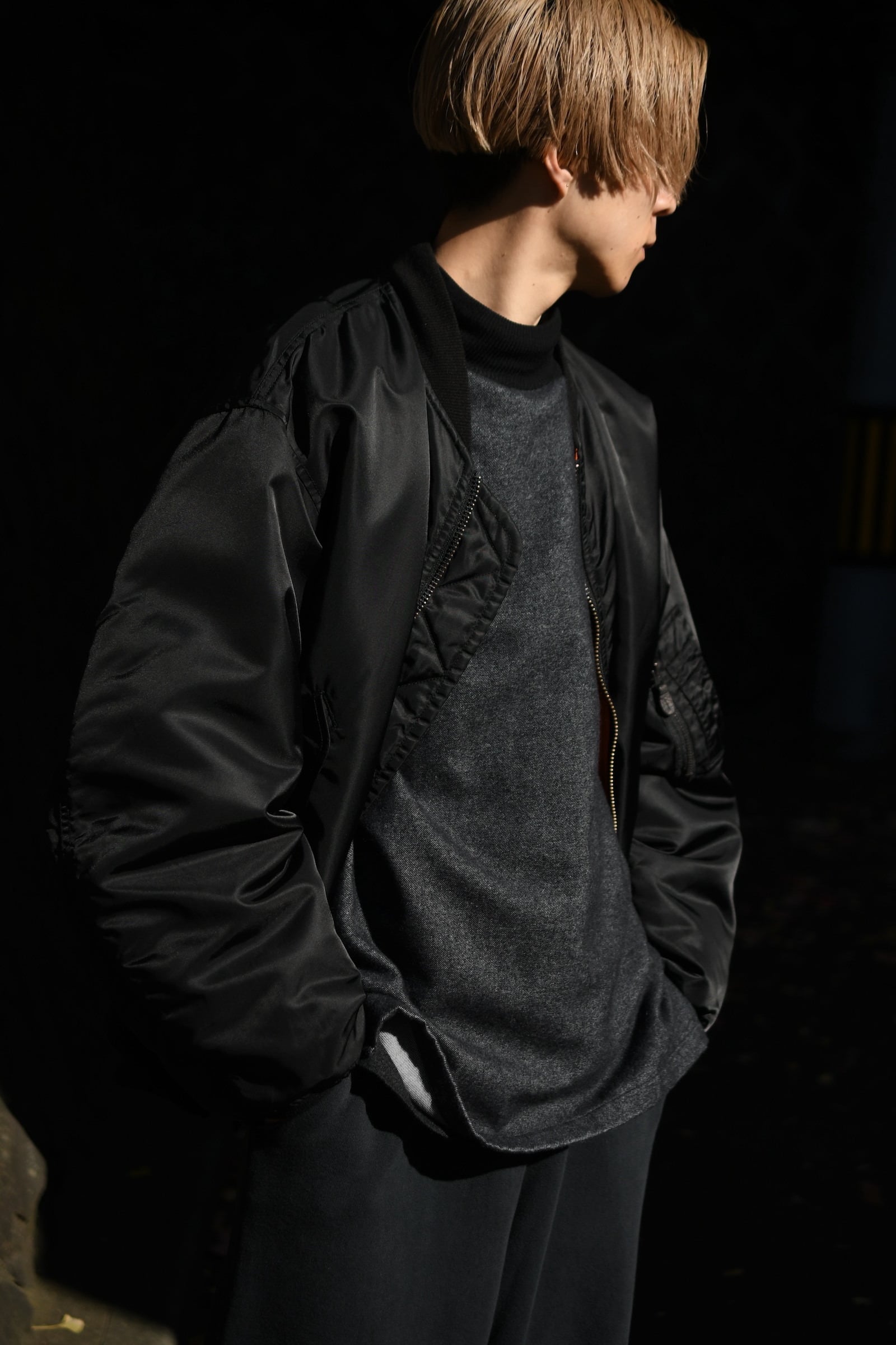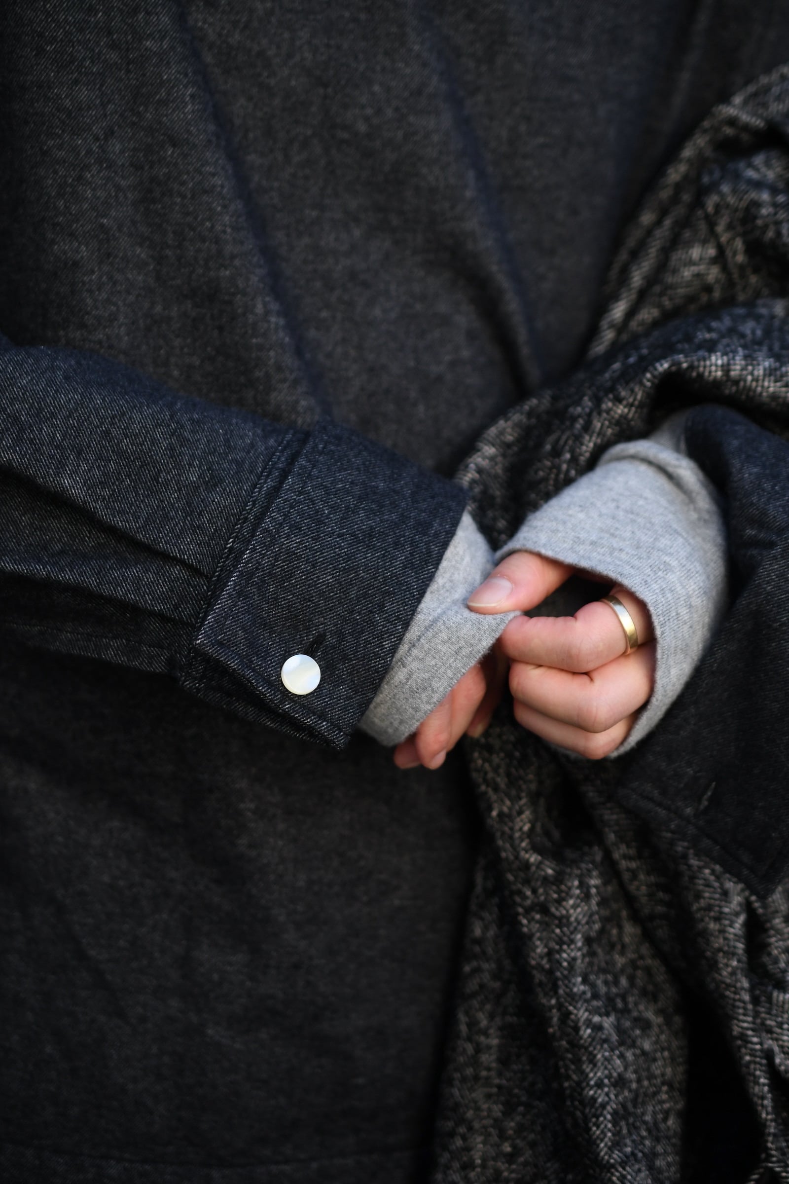 素材切り替えのタートルネック、柔らかな紺色の起毛ネル、そしてシェル釦がチラつくフレンチカフス。様々な要素を集約したm’sの新たな1着は、シャツのようでもありニット的でもあるという代用の効かない個性を光らせながら、それと同時にスタイリングを飽きさせないレイヤードの面白みを秘めていた。単体でも新鮮さを普遍的に楽しむ事が出来ながら、インナーに落とし込んだ際には首元(ニット的)と袖先(シャツ的)それぞれで異なったアクセントが生まれ、この1着で重ね着に不思議と深みが増す。与えられた余白を生かし、この中にハイゲージのニットを忍ばすような着方も良く、BATONERと別注で製作したカシミアタートルは正に最高の相性を魅せてくれた。程よく暖かく、冬と春の境目まで着続けられ、そして飽きさせない。漠然とインナーに”何か”を求めている人がいれば、この魅力的な3拍子が一つの答えを出してくれる筈である。