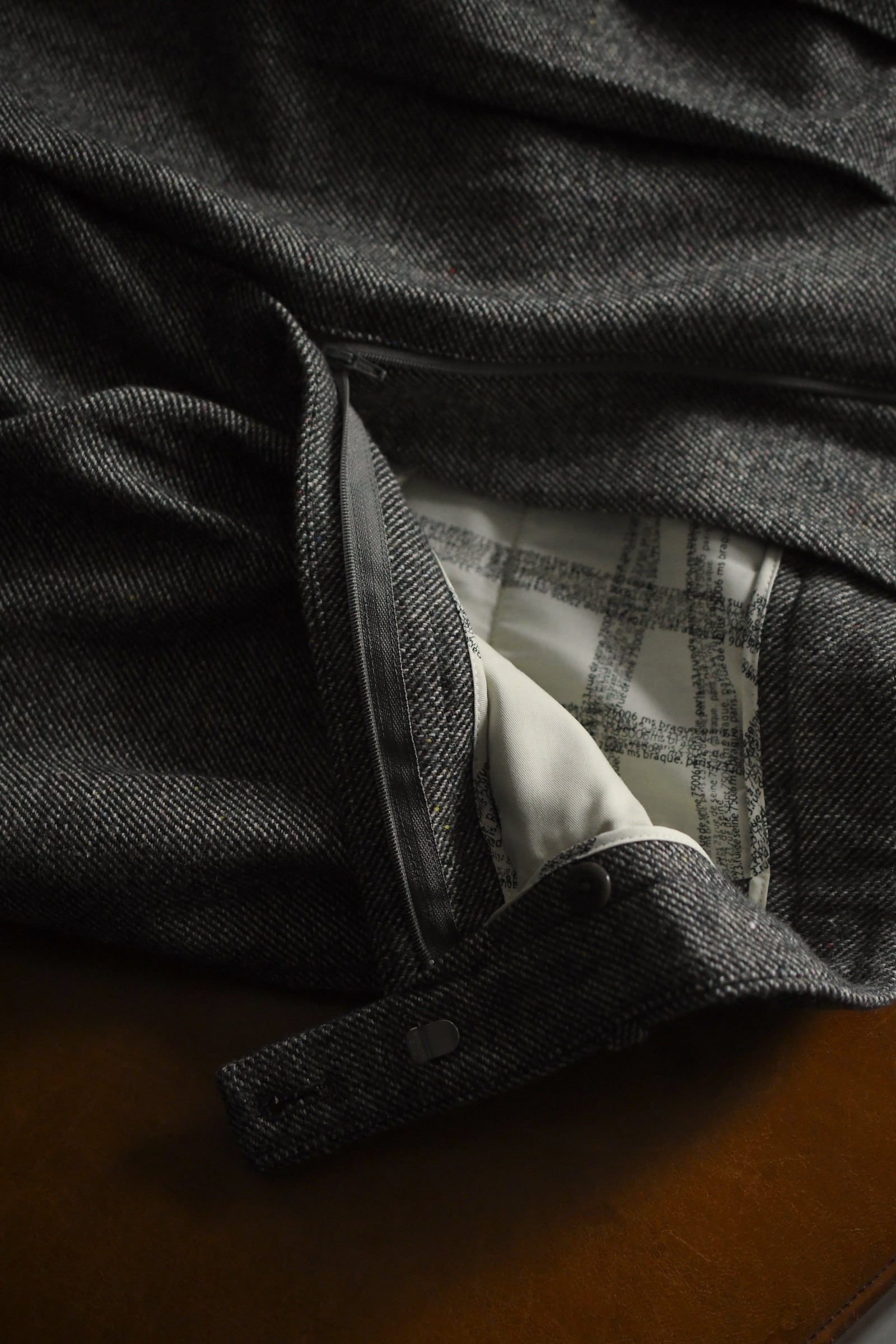 茶色と灰色の中間にあるような色合いをベースに、赤、黄、青と多色がネップとして散りばめられた表情豊かな混合ツイード生地を採用して仕立てられた1本は、冬には有難い十分な保温性と不快感の無いタッチ感を備えた”遊びのあるバギートラウザー”。潔いくらいに大胆なワイドシルエットは、クラシックな印象を少しカジュアルに寄せたバランスが心地よく、無地のニットから色、柄のある上物まで幅広く調和してくれる。そこまで膨らみの出ないワタリから裾までズドンと落ちるアウトラインは柔らかい素材感と相乗して非常に美しい。春夏のモデル同様、ここまで潔のいい太さとなるとモノによっては少しヤンチャな空気感が生まれたりもするが、吸い付くような腰回りのフィッティングと深い2インタックの構造によってその出立ちはドレスが勝る。普遍的でありながらスタイルをリードする存在感も秘めたm’sのバギー。そこから生まれる様々な活かし方を秋冬春と是非楽しんで頂きたい。