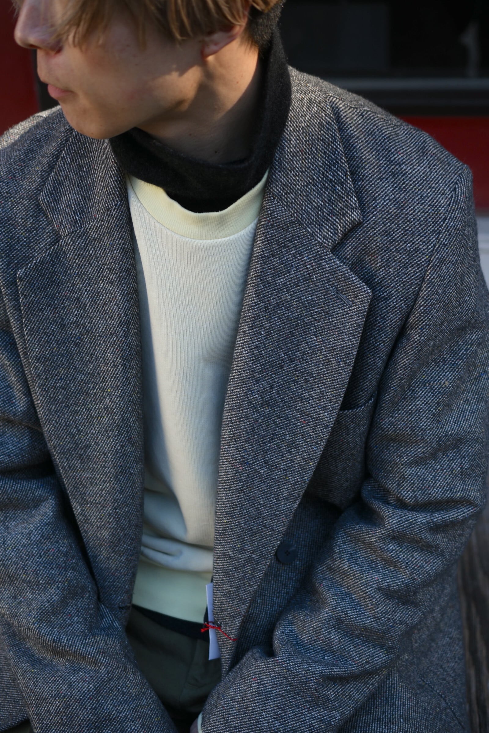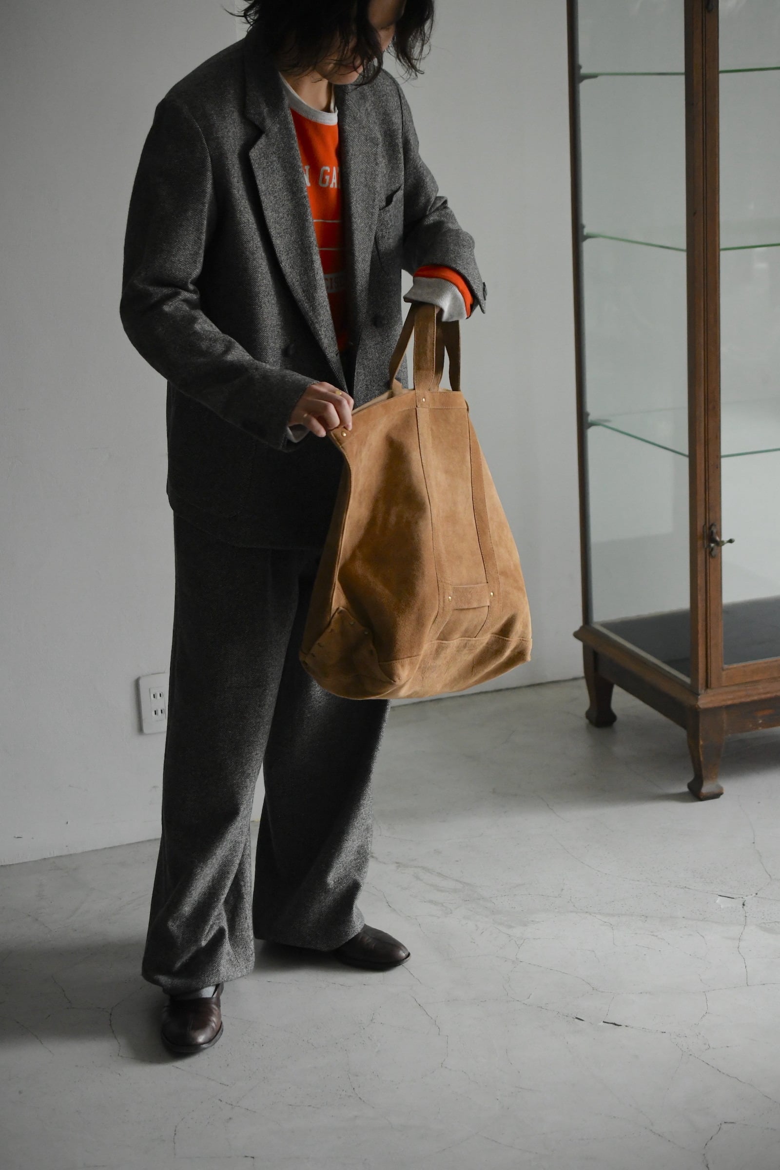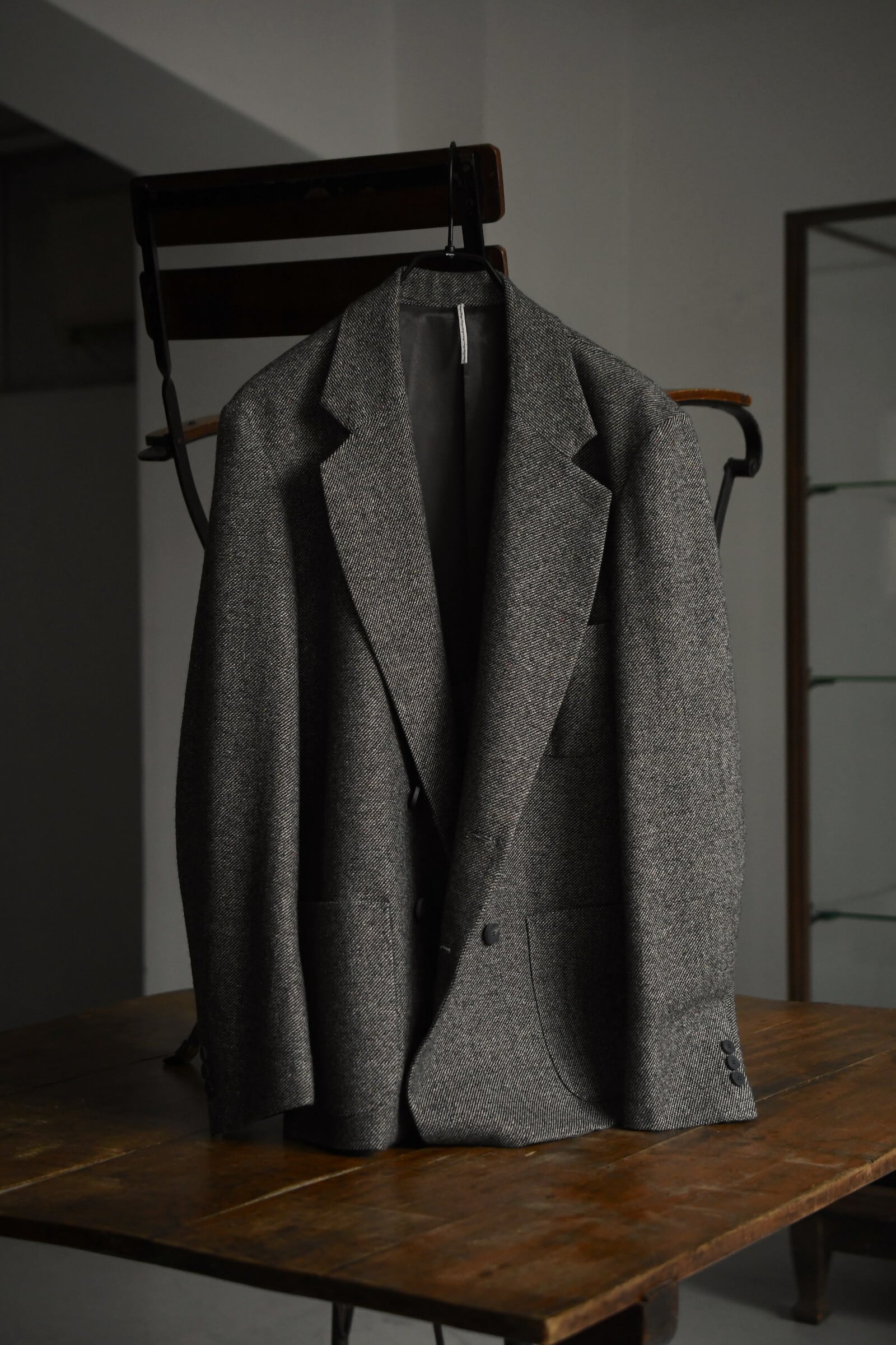 茶色と灰色の中間にあるような色合いをベースに、赤、黄、青と多色がネップとして散りばめられた表情豊かな混合ツイード生地を採用して仕立てられた1着は、クラシックで品の良さを醸し出しながら、随所で効かせた抜け感が日常使いを容易に想起させてくれる”気の抜けたダブルのテーラード”。やや縦にゆとりを与えながらも肩は落とし過ぎずで身幅は十分な余白があり、中肉のニット程度であれば容易に着込む事が可能。重厚的な印象に思えるが実際は軽やかな質感であり、春先も羽織りの一役を担ってくれる嬉しいバランスである。少し幅のあるラペルの裏には焦茶色のウルトラスエードが隠されており、襟を立てた着方も選択肢として生まれ楽しみ方が広がってくる。