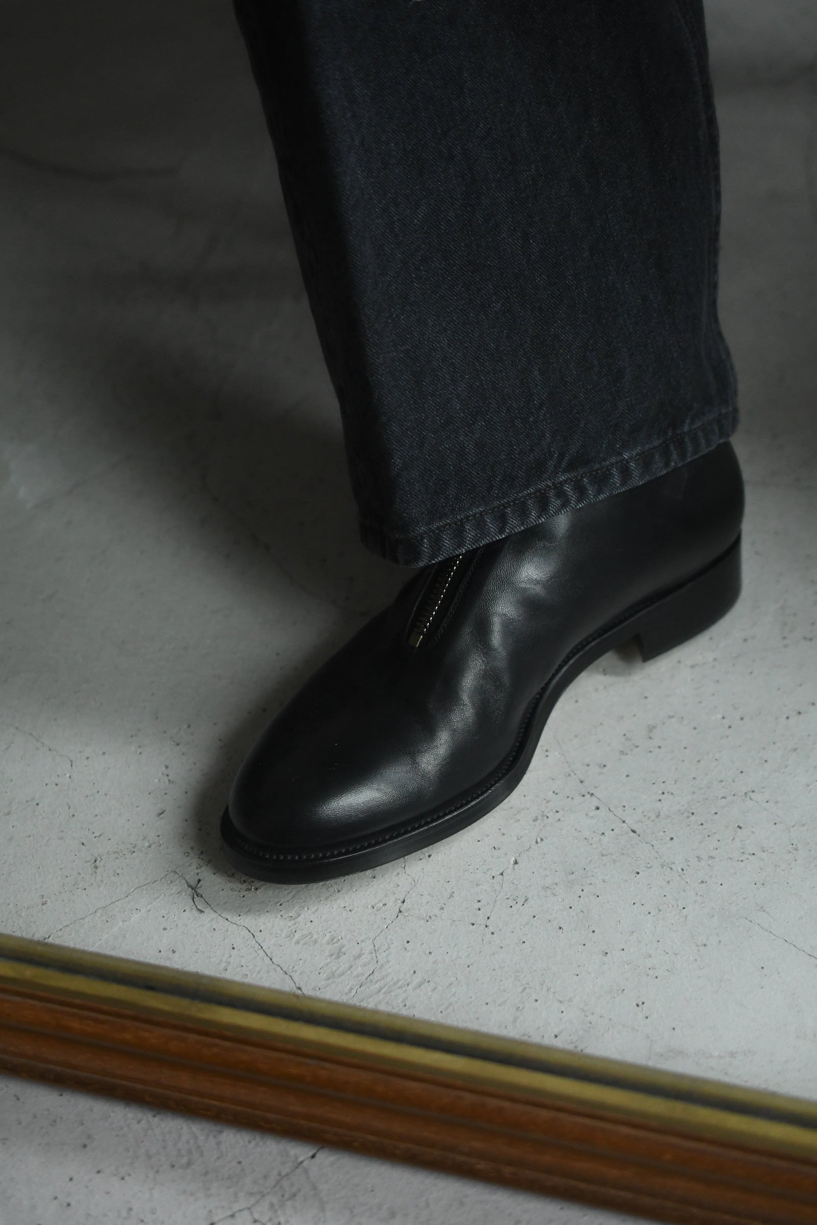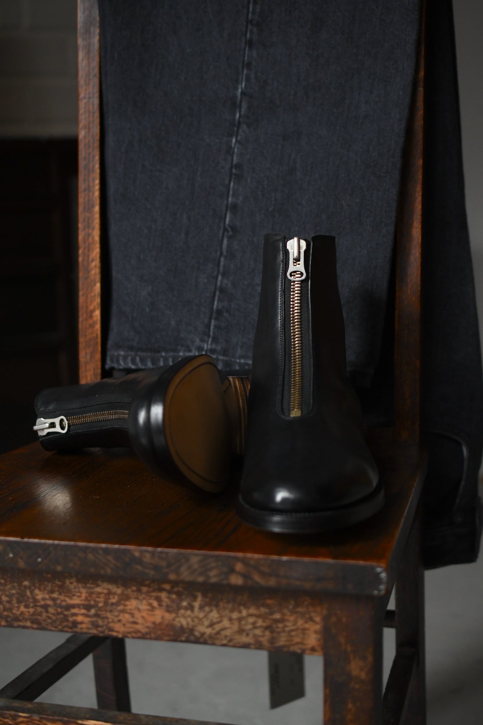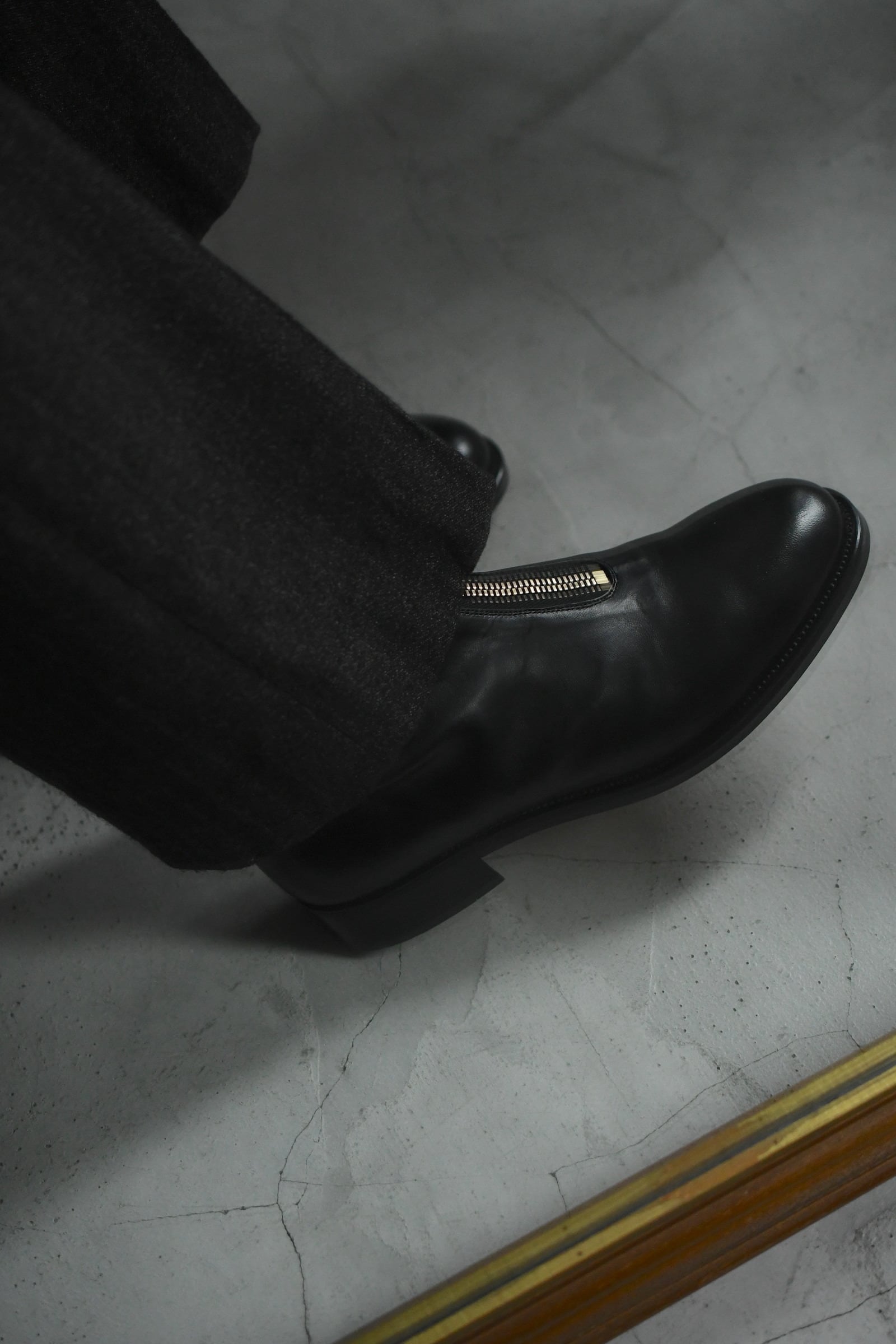 接ぎの無いミニマルで美しい印象感が魅力のMolder"を拠点に生まれた新たなモデル『Front』。洗練された佇まいとZIPによる簡易的な着脱という要素を引き継ぎながら、デザインをサイドからフロントへ移行させる事で”タイトなシャフト”と”ハイカット”の両者が新たに伴った。通常のブーツに比べて高さがあまりなく、それでいてしっかりと足入れを考慮した設計の素晴らしさは元々の足馴染みの良さと並んで大きな特徴である。そして、独特の艶感が魅力を放つCLASSレザー(馬革臀部)の質感やシワによるエイジングをより感じられるよう贅沢にも大きくパーツを採用。Molder同様にいい意味で無骨さよりも上品さを纏う1足であり、裾から微かに顔を覗かせるExcellaZIP×YKKのさり気無いアクセントを様々なスタイリングで楽しんで頂きたい。