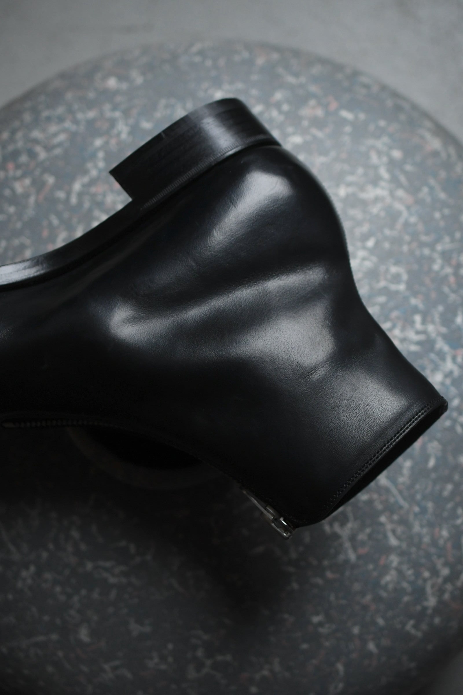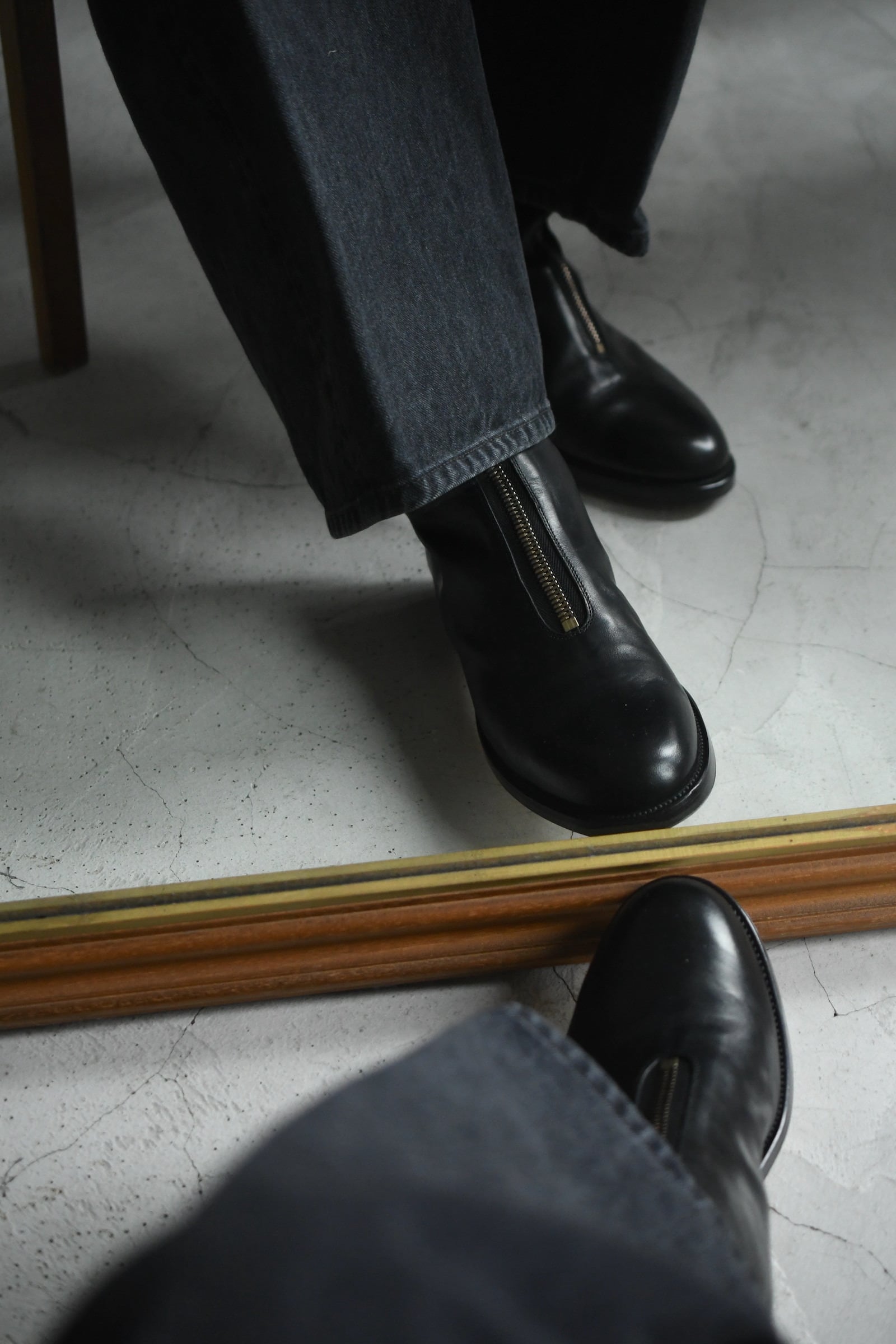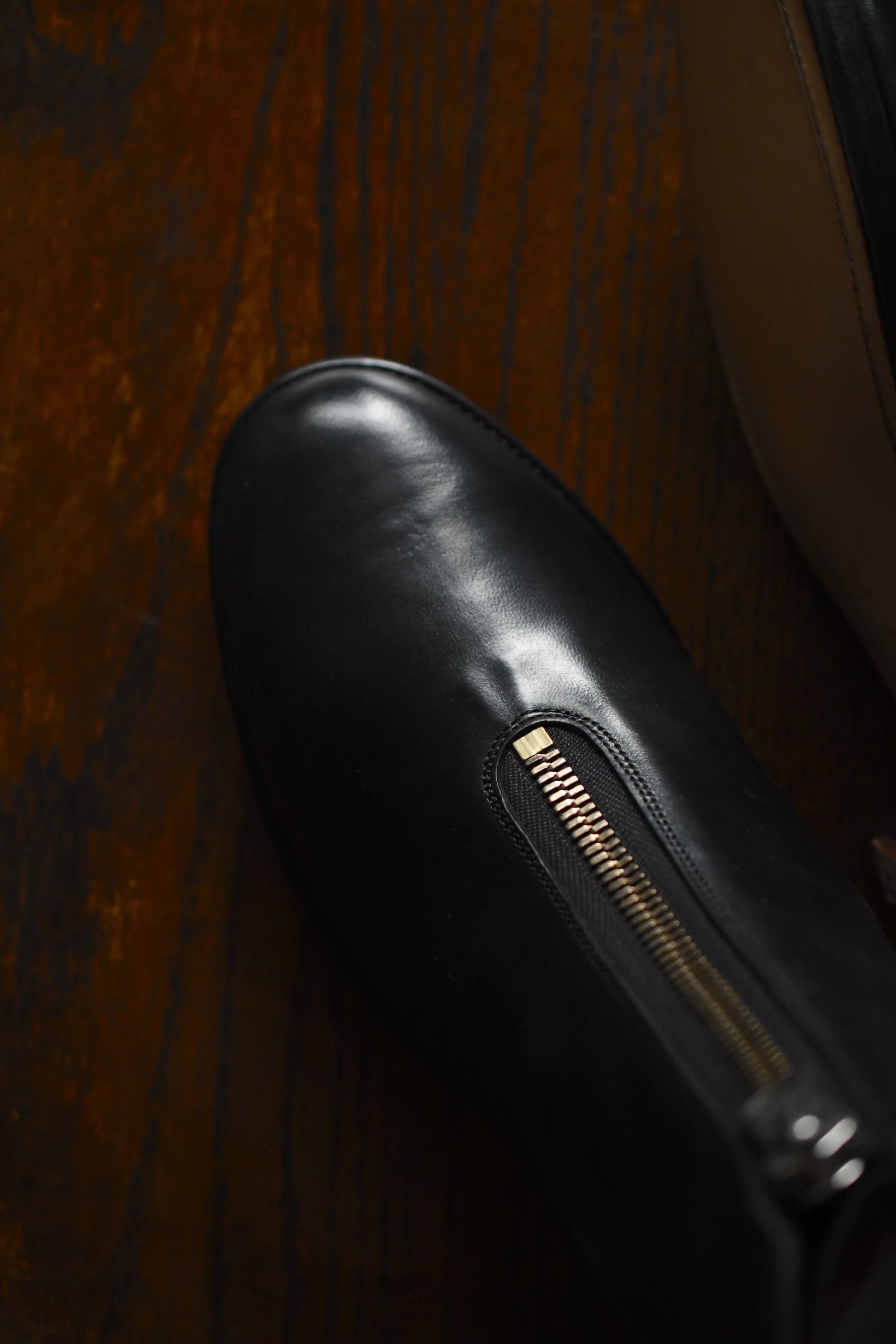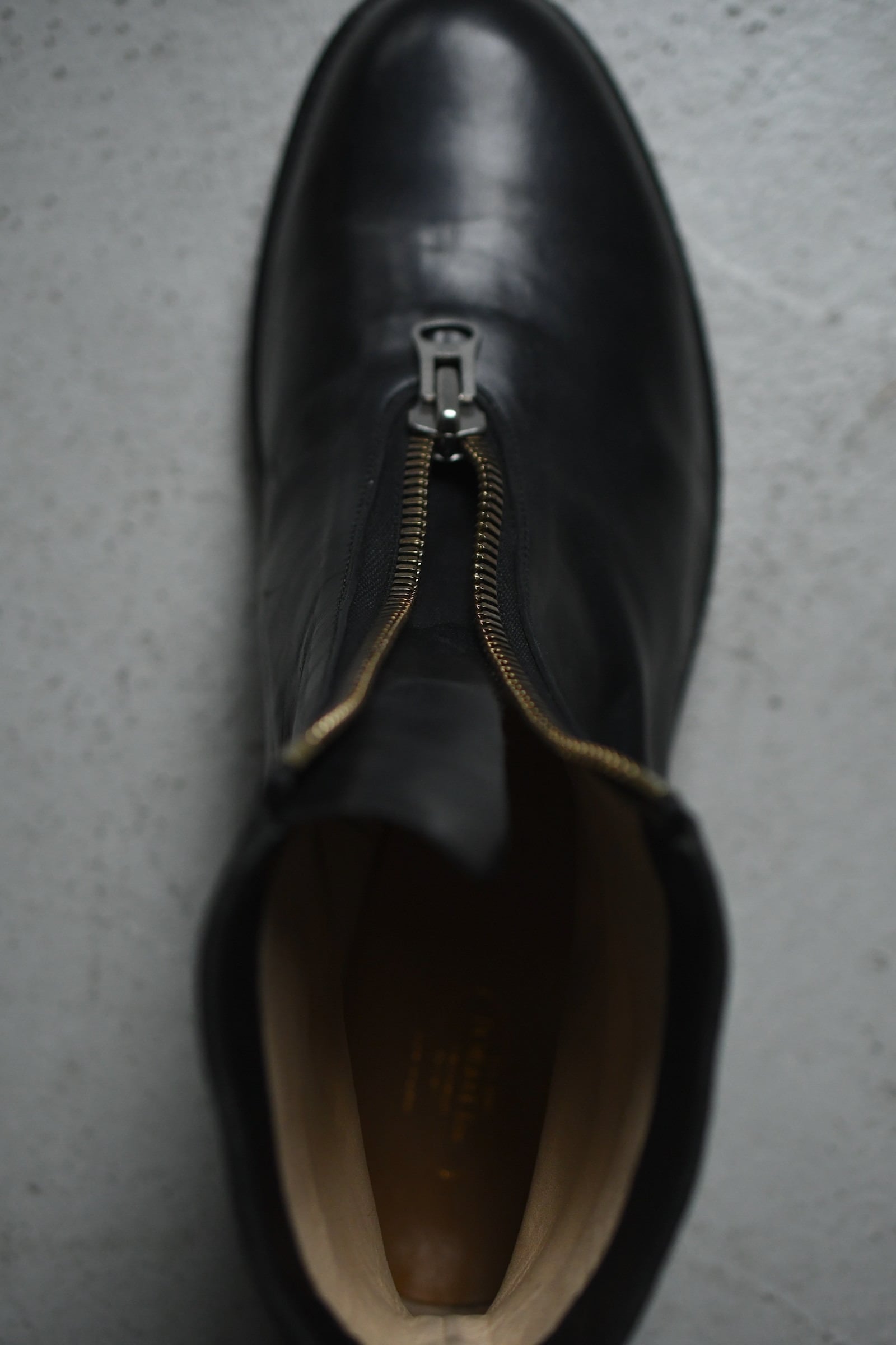 接ぎの無いミニマルで美しい印象感が魅力のMolder"を拠点に生まれた新たなモデル『Front』。洗練された佇まいとZIPによる簡易的な着脱という要素を引き継ぎながら、デザインをサイドからフロントへ移行させる事で”タイトなシャフト”と”ハイカット”の両者が新たに伴った。通常のブーツに比べて高さがあまりなく、それでいてしっかりと足入れを考慮した設計の素晴らしさは元々の足馴染みの良さと並んで大きな特徴である。そして、独特の艶感が魅力を放つCLASSレザー(馬革臀部)の質感やシワによるエイジングをより感じられるよう贅沢にも大きくパーツを採用。Molder同様にいい意味で無骨さよりも上品さを纏う1足であり、裾から微かに顔を覗かせるExcellaZIP×YKKのさり気無いアクセントを様々なスタイリングで楽しんで頂きたい。
