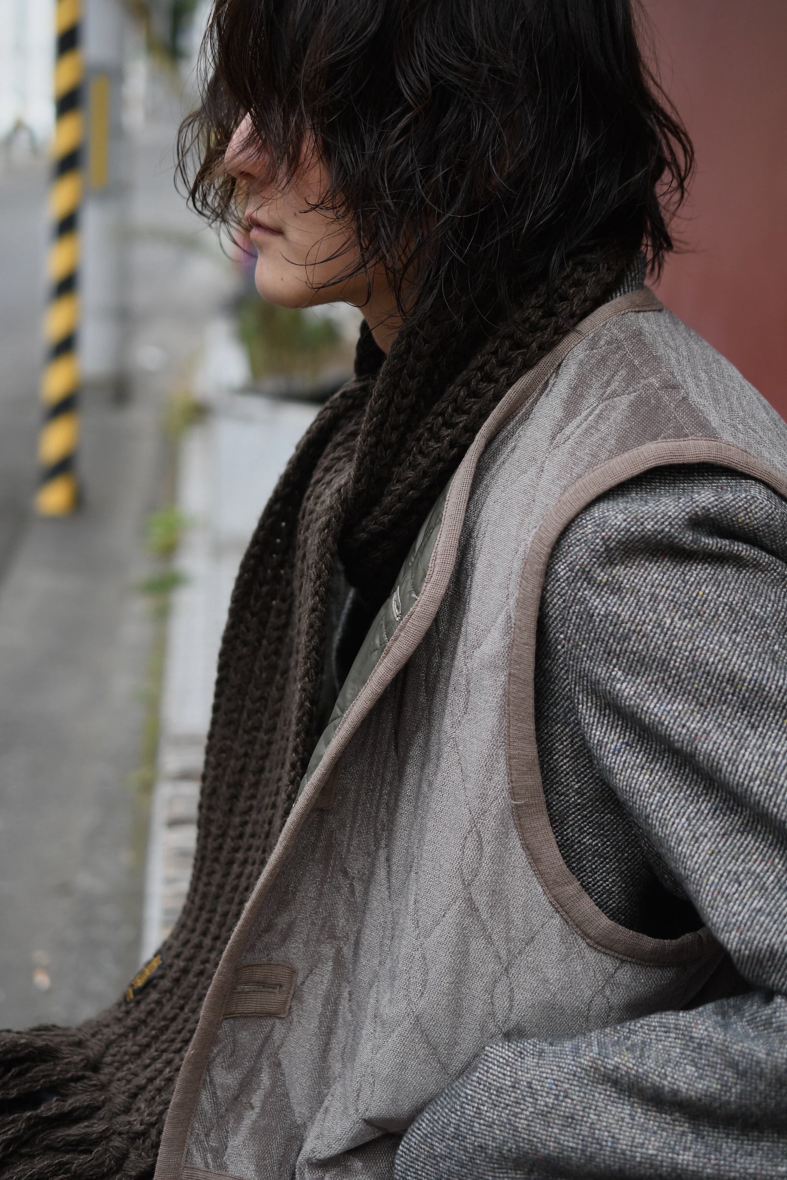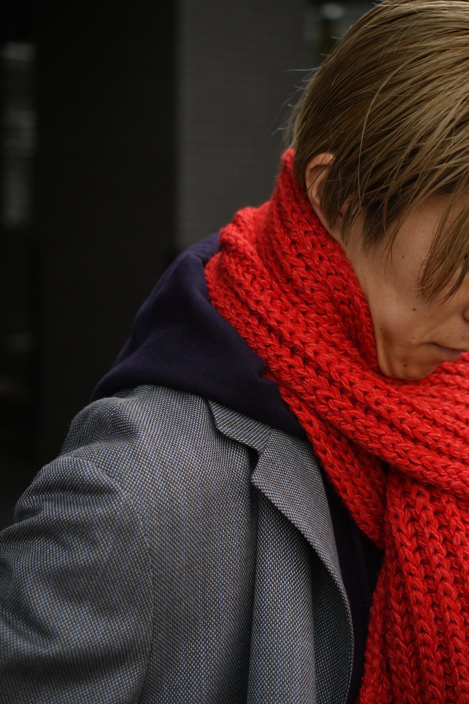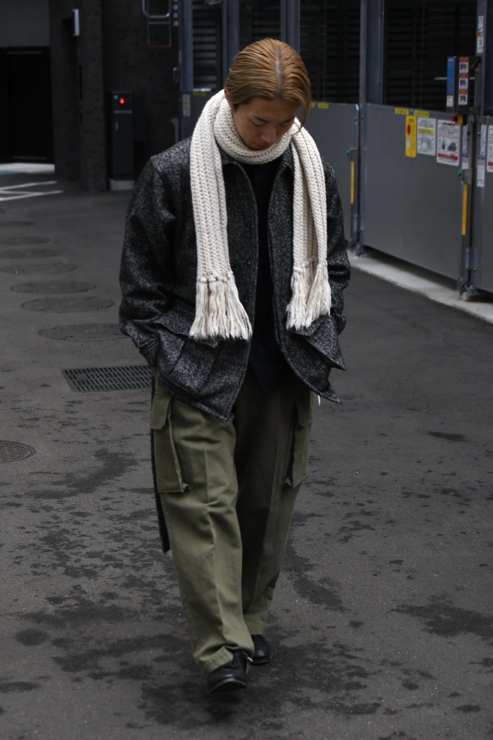 膨らみの強い太番手に紡績したメリノウール、柔らかく優しい肌触りのベビーアルパカ、光沢感のあるシルクという3つの天然素材をブレントした糸を使用し、ローゲージでふっくらと編立てたフリンジマフラー。