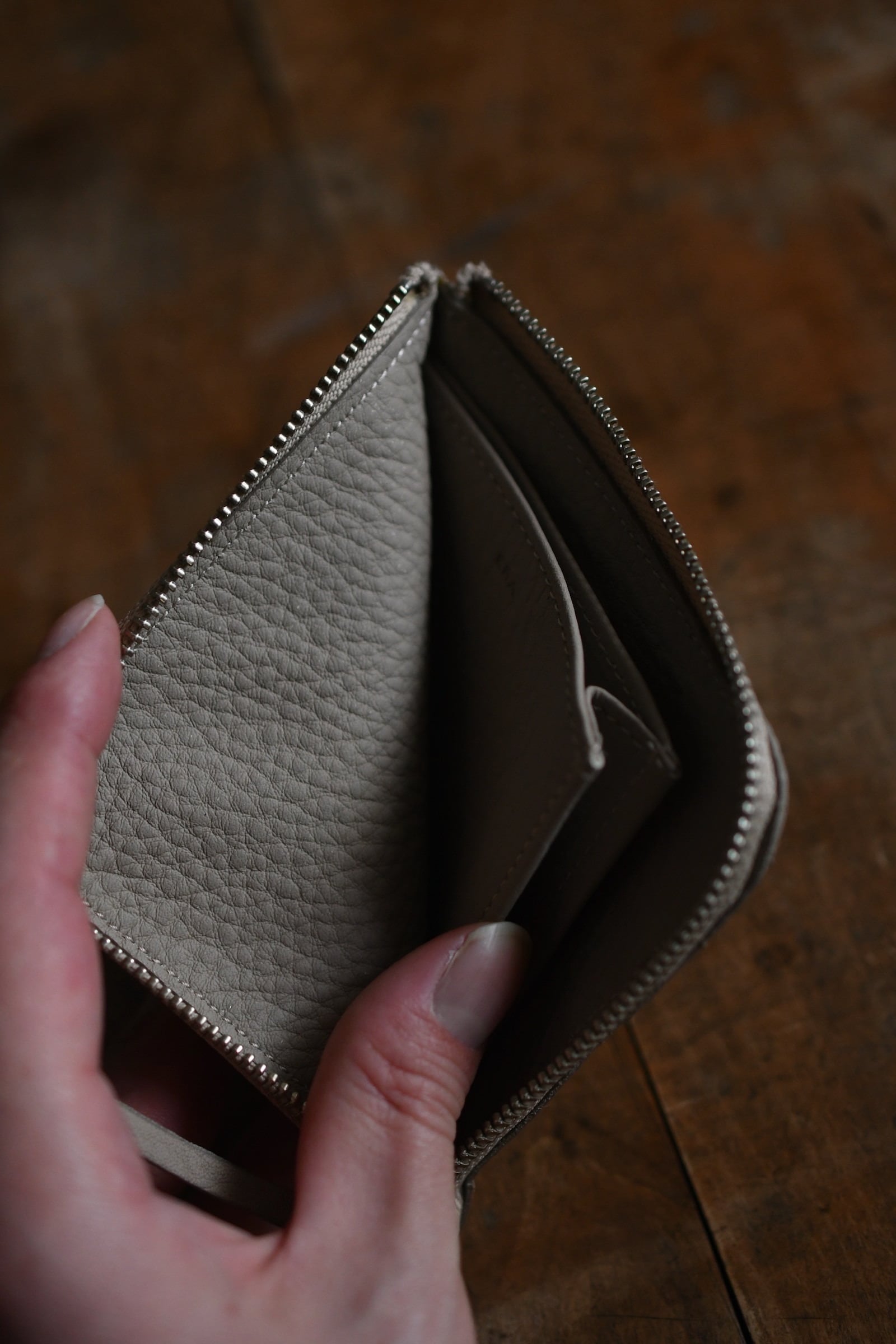 ブランドの新たな顔となったシュリンクレザーを用いて誕生した新型のL字ファスナーウォレット。内側はマチ付きの小銭入れのみというシンプルな仕様で、両サイドにカードと折ったお札を重ねて収納が可能。ミニマルな設計に伴う使い心地の良さと革の滑らかな質感が大きな魅力を誇る。