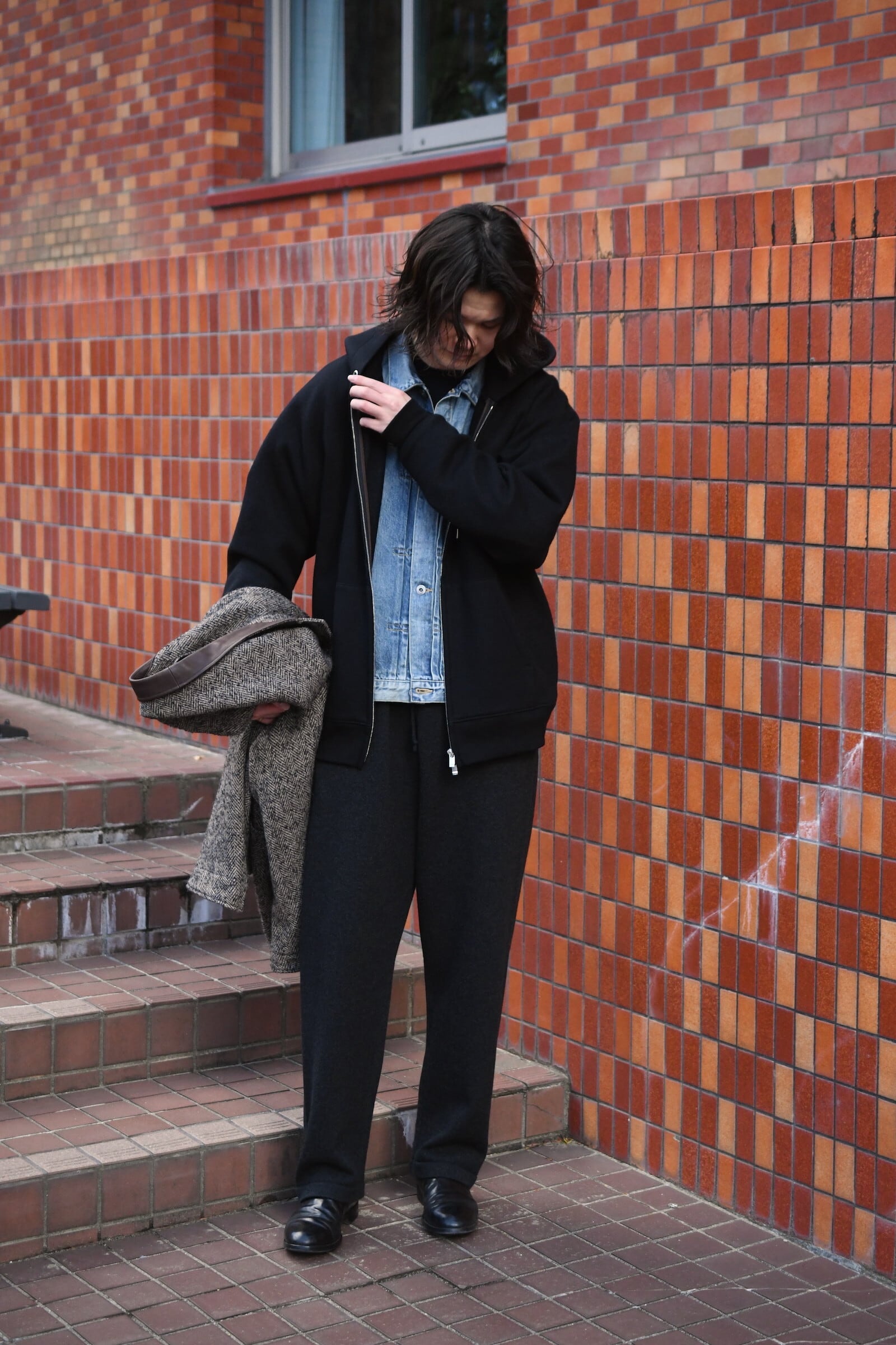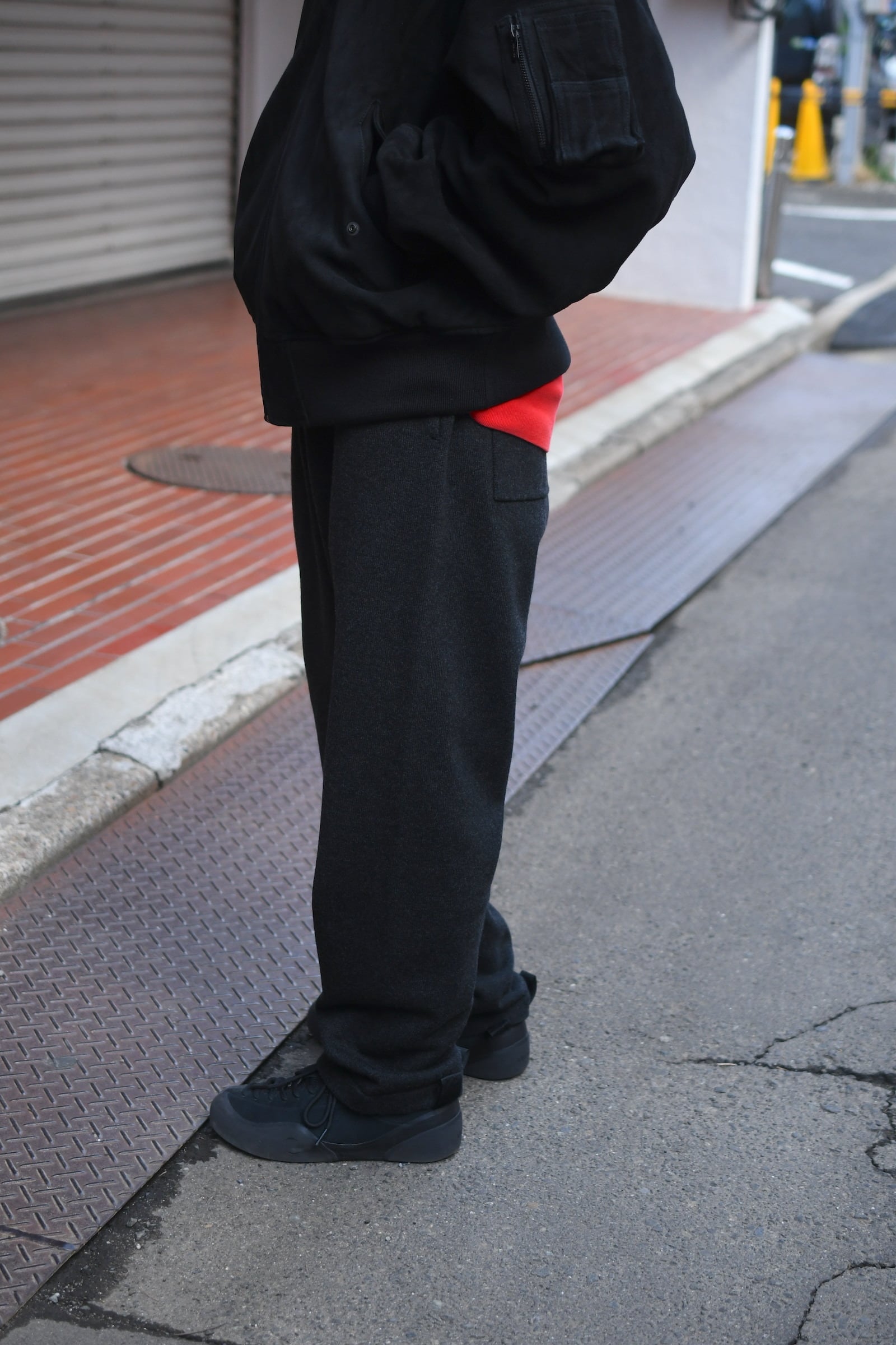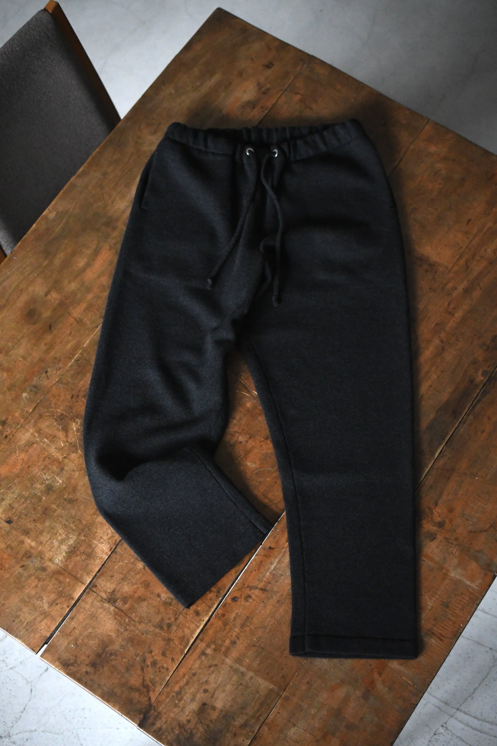 BATONERのデザイナー奥山氏が内モンゴルで出会った”サンシャインカシミア”は、日照時間の長い雄大な大地の中で生息するカシミア山羊から生まれる繊維長の長い良質な素材。その希少な糸を丁寧に紡績することで、紡毛でありながら極細の番手を実現。そして特殊な編み方にも耐えられる強度を持つ糸へ。その独特な弾力感と柔らかい性質に惚れ込み、今季は別注でZIPパーカーを製作して頂き大満足の結果となった。そんな僕らも虜になったサンシャンカシミアだが、実はインラインで凄まじい1本が生まれていた。それは、極細糸を多本取りした後に超強撚したツイスト天竺による『ニットパンツ』。重厚的な質感としっかりとした立体感あるシルエットは本当にニット?と疑う程に凄まじく、思い描くニットパンツの概念を大きく覆してきた。強度が高く膝抜けも起きない、そして自宅で洗いを繰り返す度に少しずつ滑らかさを増していきながらも適度なハリは残り、今以上に柔らかい極上な着心地を”美しいシルエットのまま”日常で穿き続けられる。ニットパンツの大きな欠点である風通しも問題なく、その十分な暖かさは様々なトップスと並んで冬の醍醐味に躍り出るだろう。そして何よりも楽だがラフ過ぎないという上品さは、この素材とBATONERの素晴らしい技術が欠け合わさったが故の素晴らしい事象であり、パーカーに続いて間違いなく大満足して頂けるプロダクトだと確信している。
