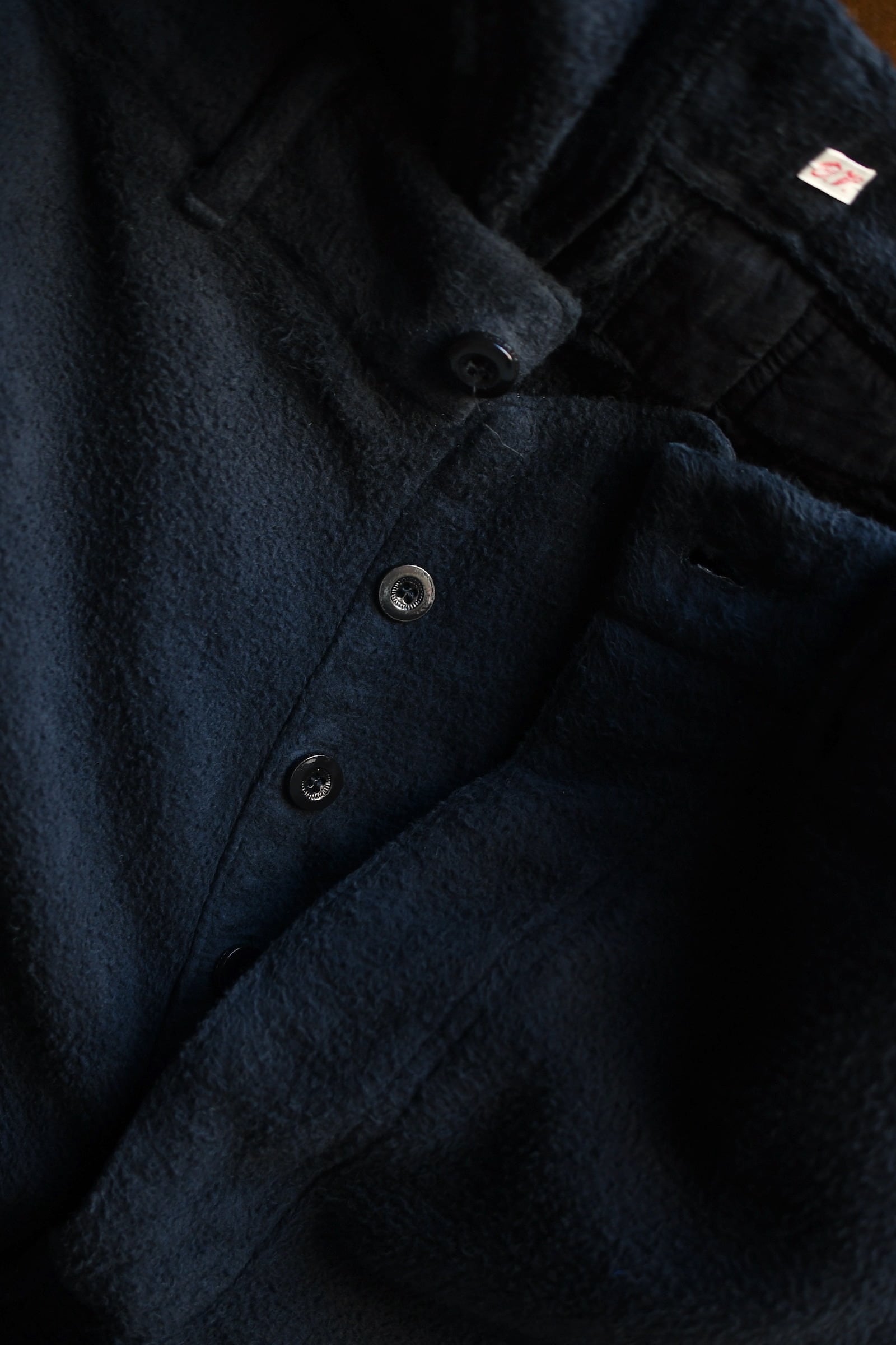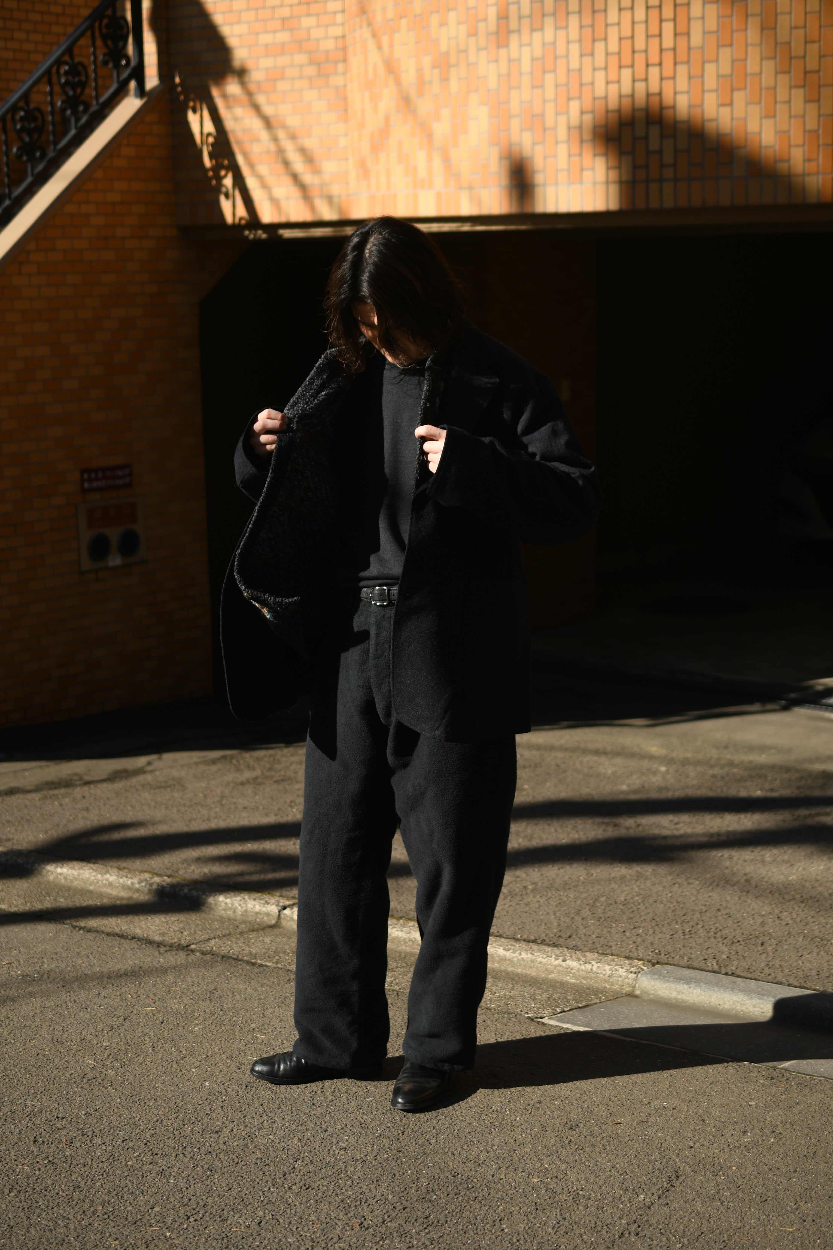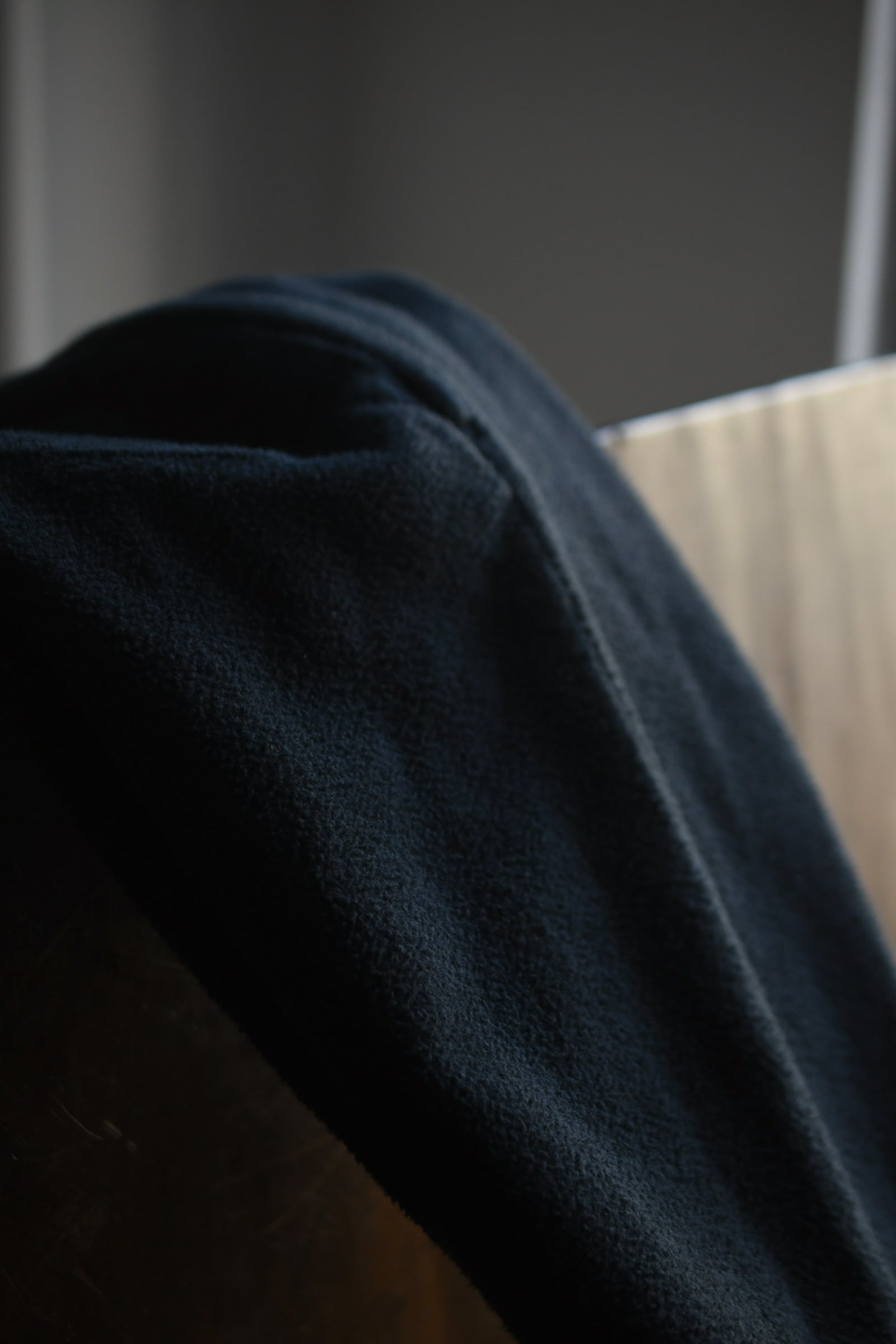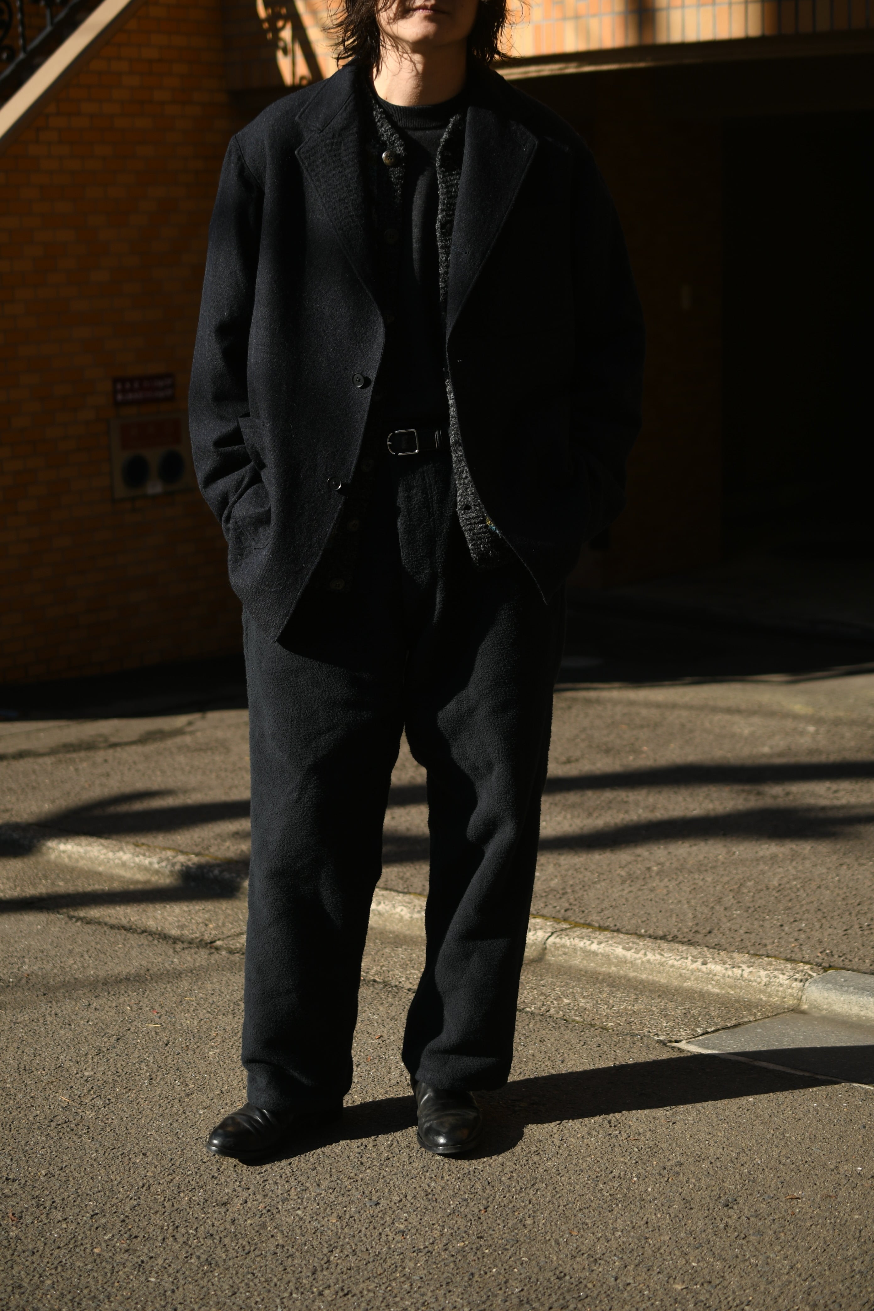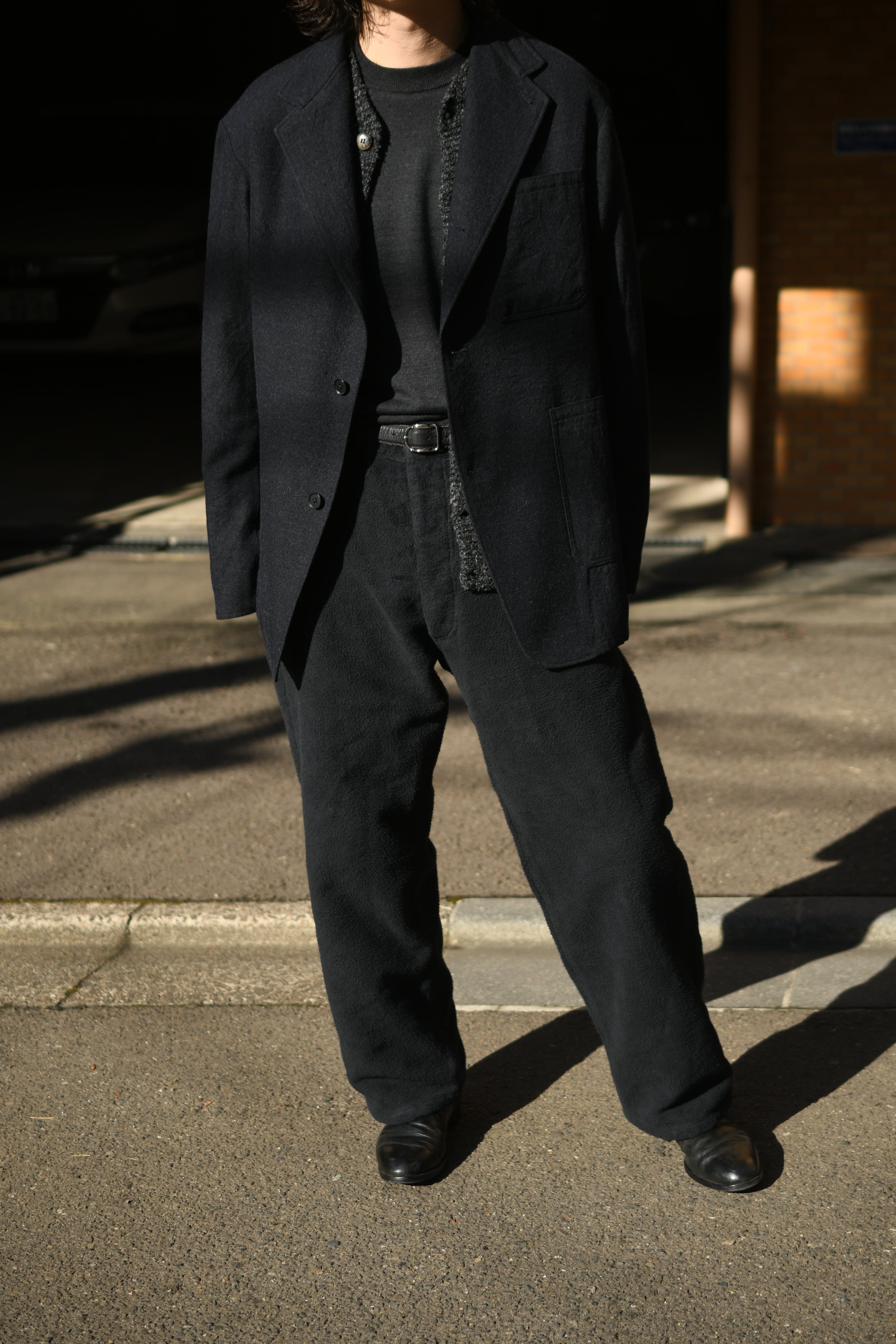 少しずつ先の季節へ目を向けたいのだが、伴わない冷たい気温がそこから目を背けさせる。そうした中でOUTILが新たに製作した生地は、季節感を繋げる素材感といい意味で「重さ」のある印象感が上記の悩みを解決させてくれるように思えた。40年代フランス海軍の作業用トラウザーをベースにデザインした PANTALON BOGYはストンと落ちるワイドストレート型。そこに落とし込んだ素材は、膨らみと暖かさを追求したコットン100による二重織りの両面起毛。風を通さない厚みと包み込む柔らかさ、そして言わずもがな、穿き込む事で徐々に褪せていく風合いの良さが際立つ魅力的な1本である。