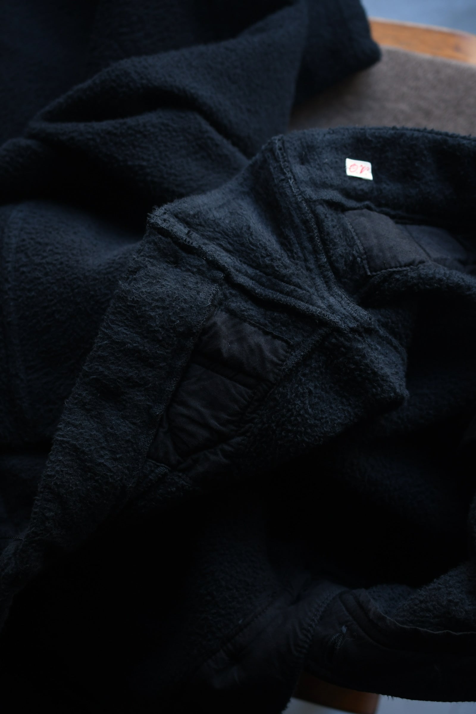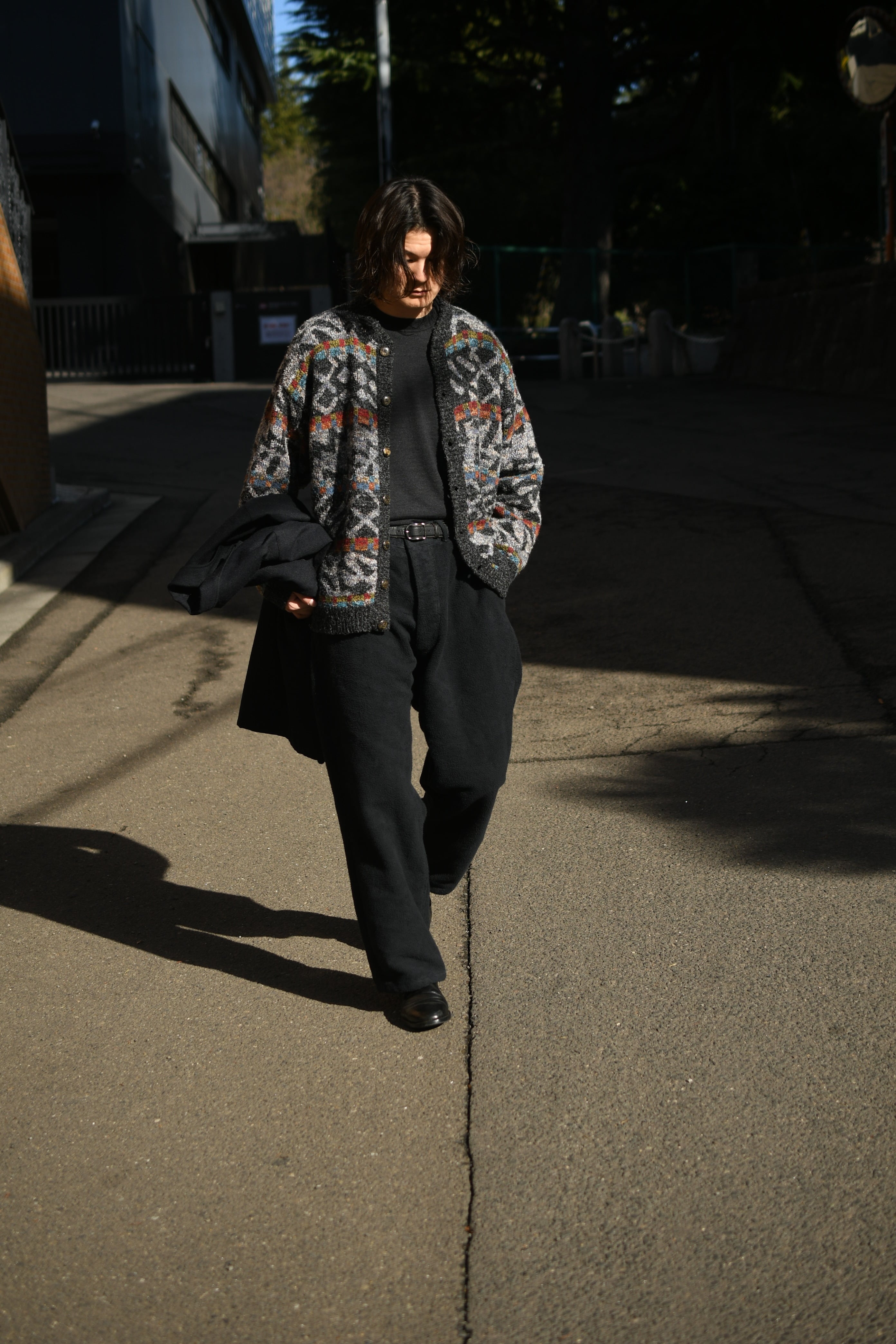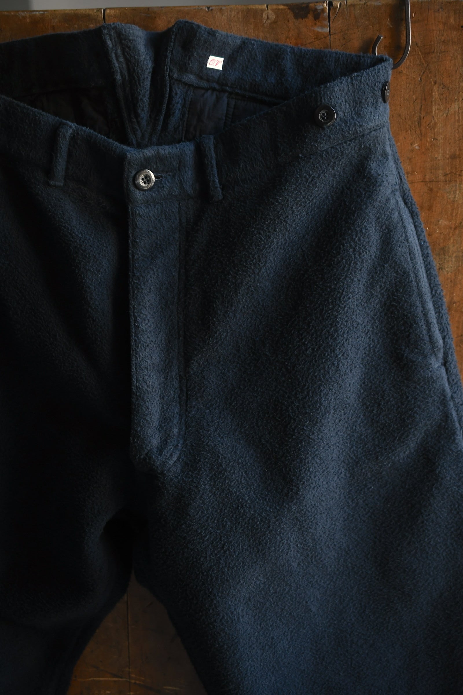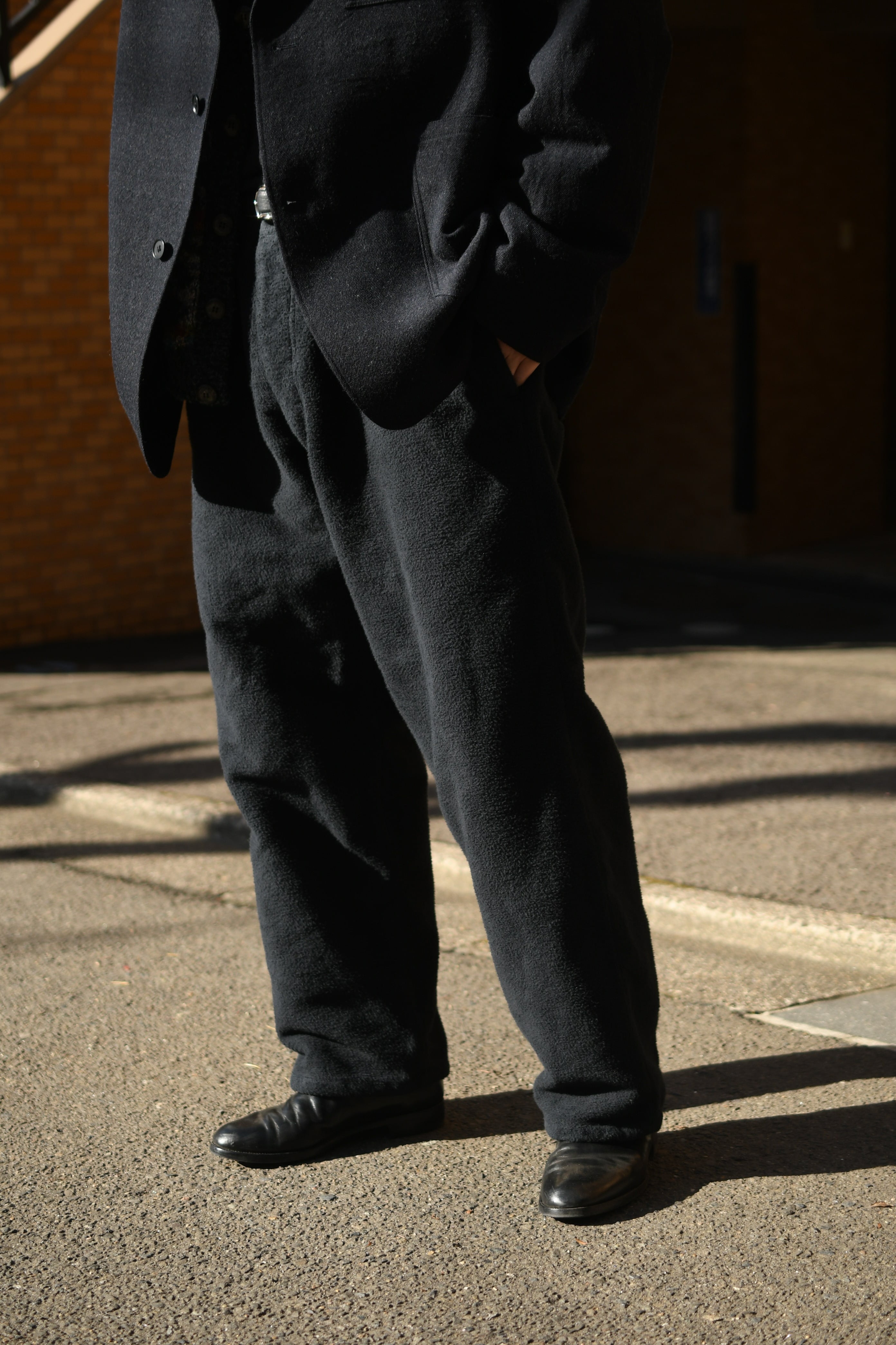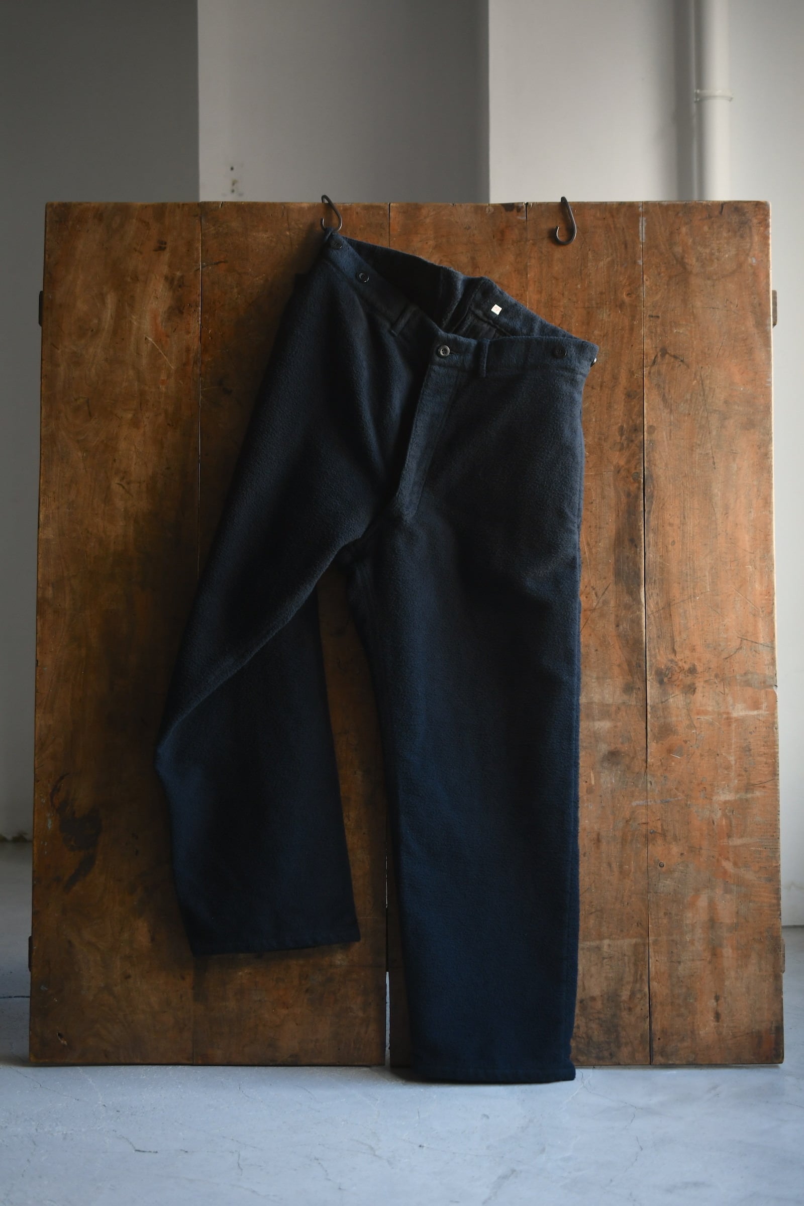 少しずつ先の季節へ目を向けたいのだが、伴わない冷たい気温がそこから目を背けさせる。そうした中でOUTILが新たに製作した生地は、季節感を繋げる素材感といい意味で「重さ」のある印象感が上記の悩みを解決させてくれるように思えた。40年代フランス海軍の作業用トラウザーをベースにデザインした PANTALON BOGYはストンと落ちるワイドストレート型。そこに落とし込んだ素材は、膨らみと暖かさを追求したコットン100による二重織りの両面起毛。風を通さない厚みと包み込む柔らかさ、そして言わずもがな、穿き込む事で徐々に褪せていく風合いの良さが際立つ魅力的な1本である。