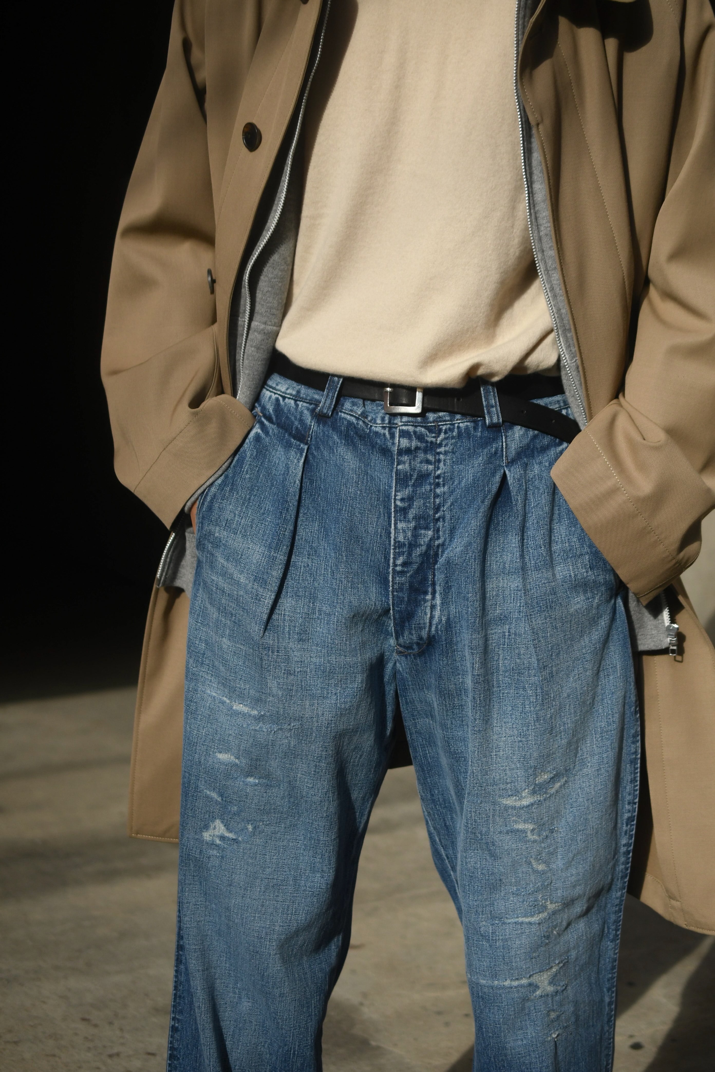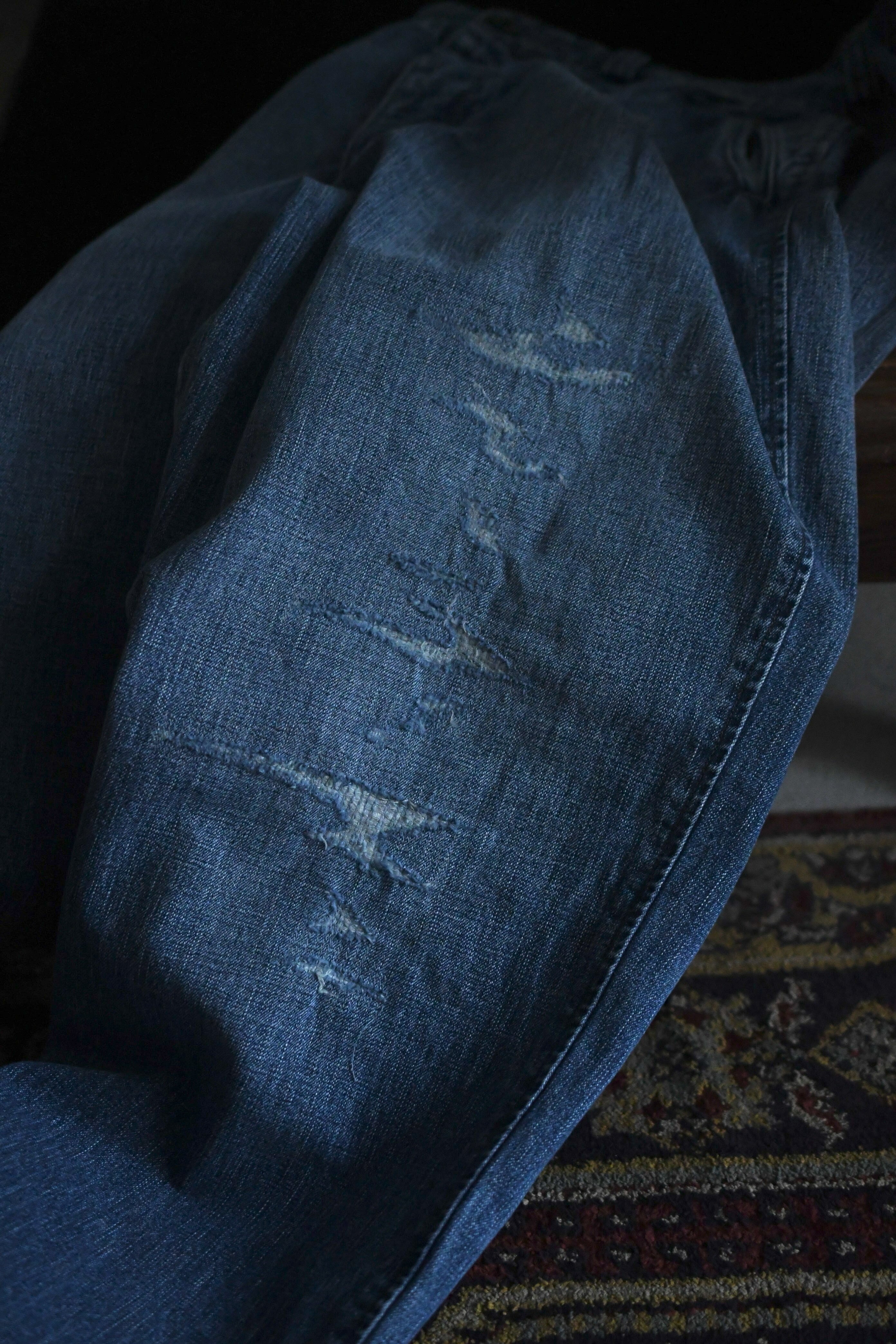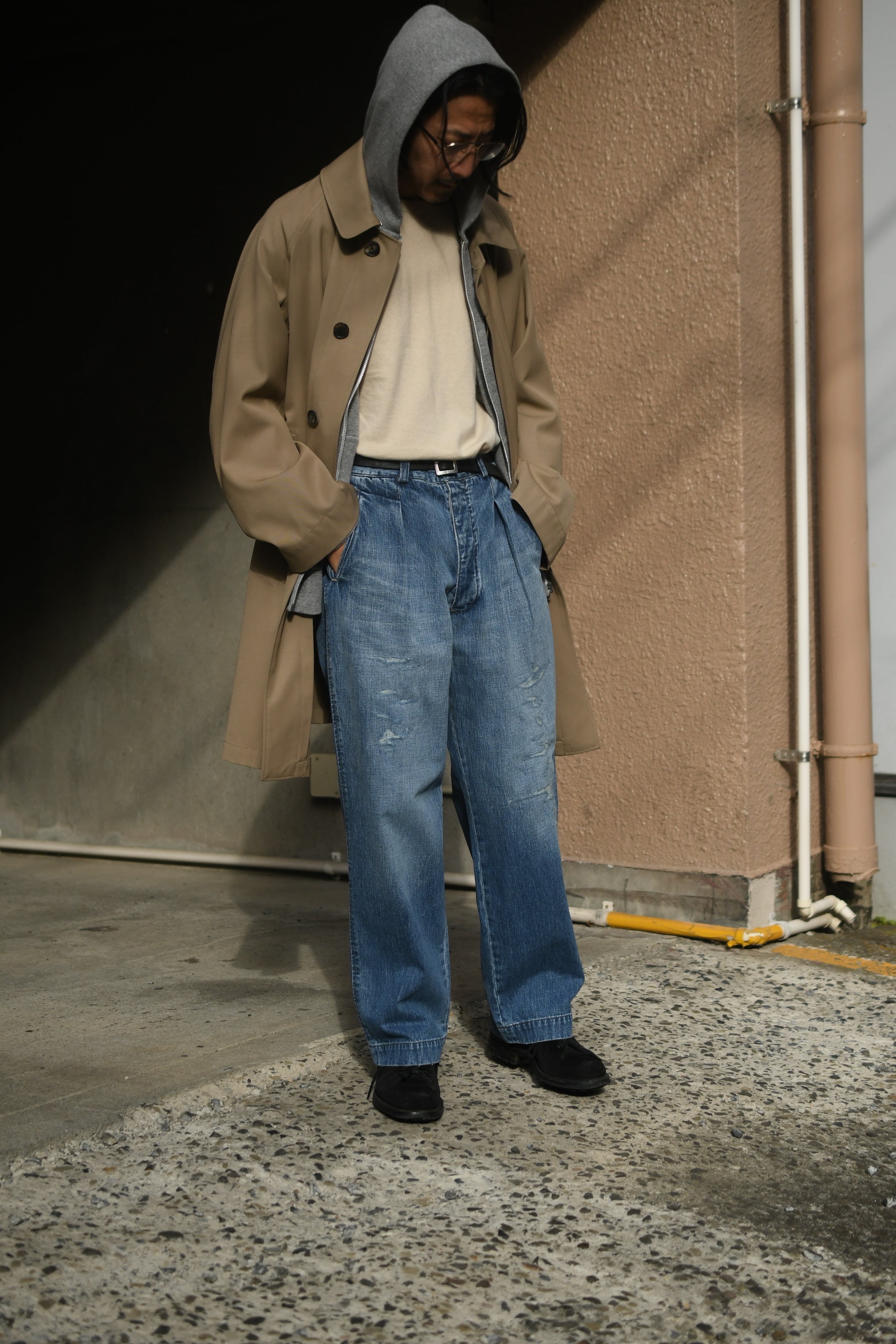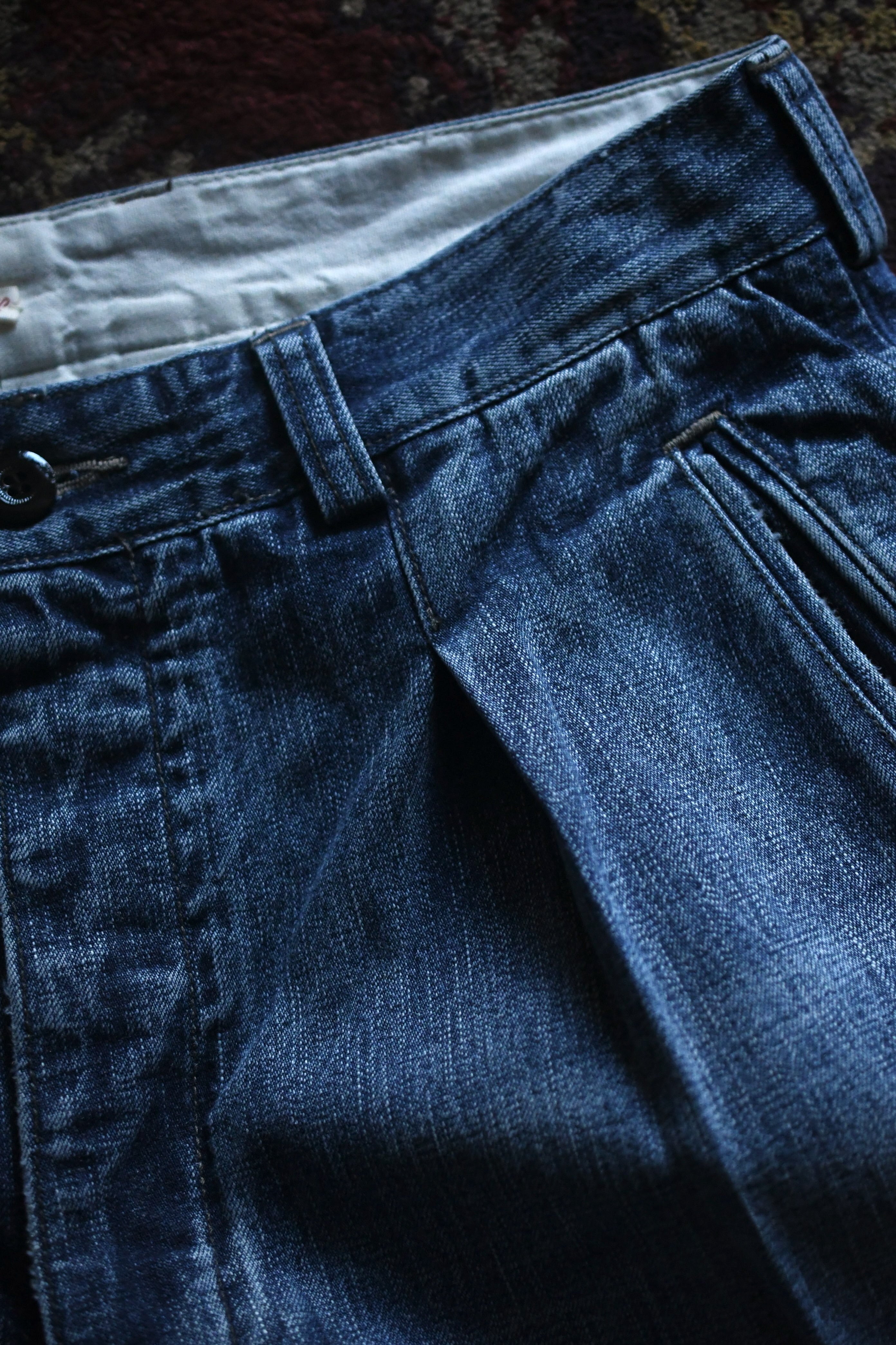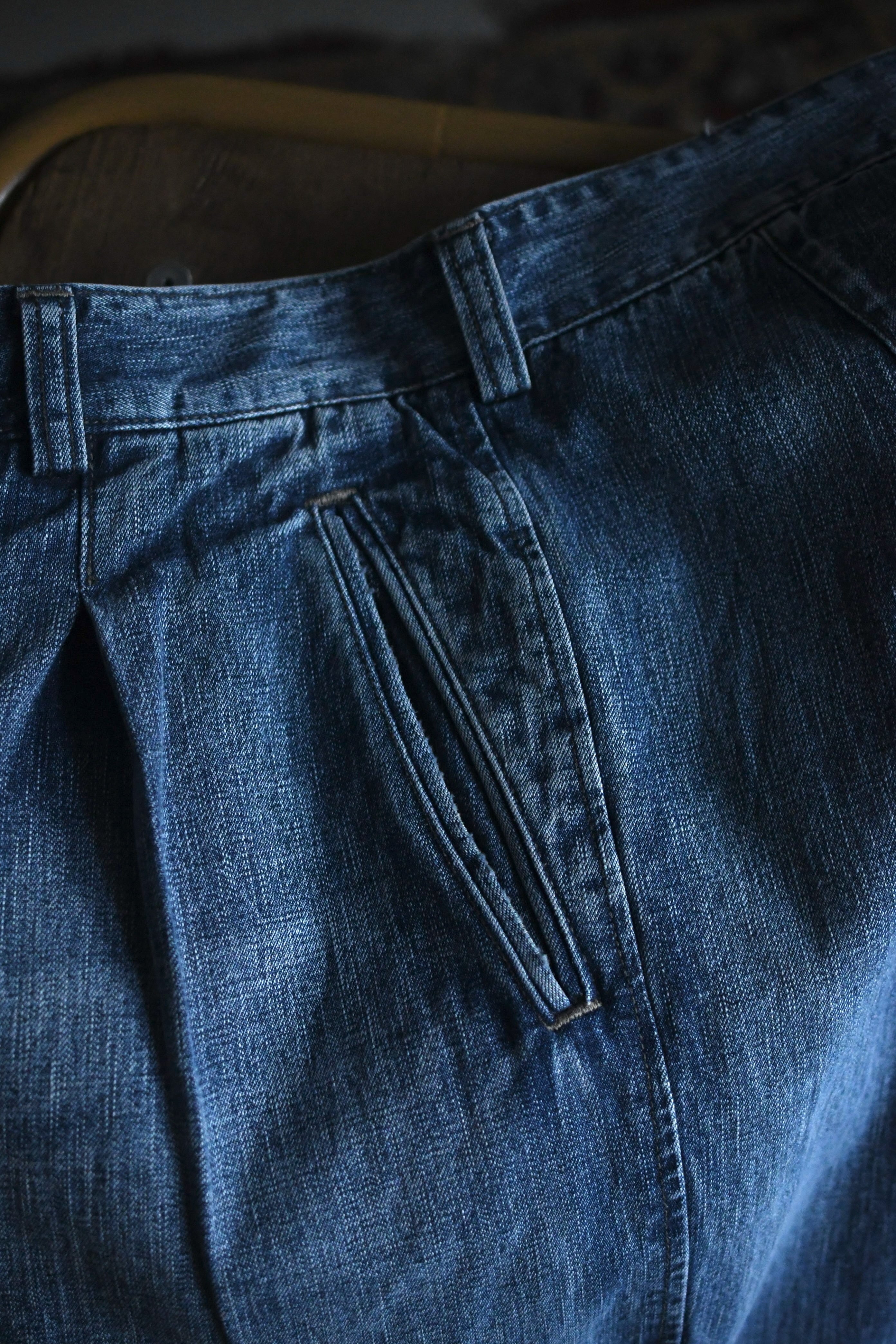 春の清々しさ、そして冬の重厚感や飽きを解消する為にデニムへと手を伸ばしたくなる心理が働く中、OUTILがちょうど良いバランスのデニムを製作していた。本当は昨年に届いていたが、提案としては春を意識する頃合いが理想だと思い、年が明けた今に至る。ベースは30年代のフランス物でオーダーメイド仕様のトラウザース。ポケットやダーツ等の特徴的なディティールは同年代に於ける他のカルチャーも感じさせ、独特な風合いも含めてOUTILらしい佇まいを魅せる。生地は異なる染料を経糸にロープ染色したコットンヘンプの混紡糸を打ち込んだデニム素材。仕上げに粗野で美しいフェード加工とリペアを手作業で施し、米国を代表するヴィンテージらとは異なる枯れた美しさがそこにはある。