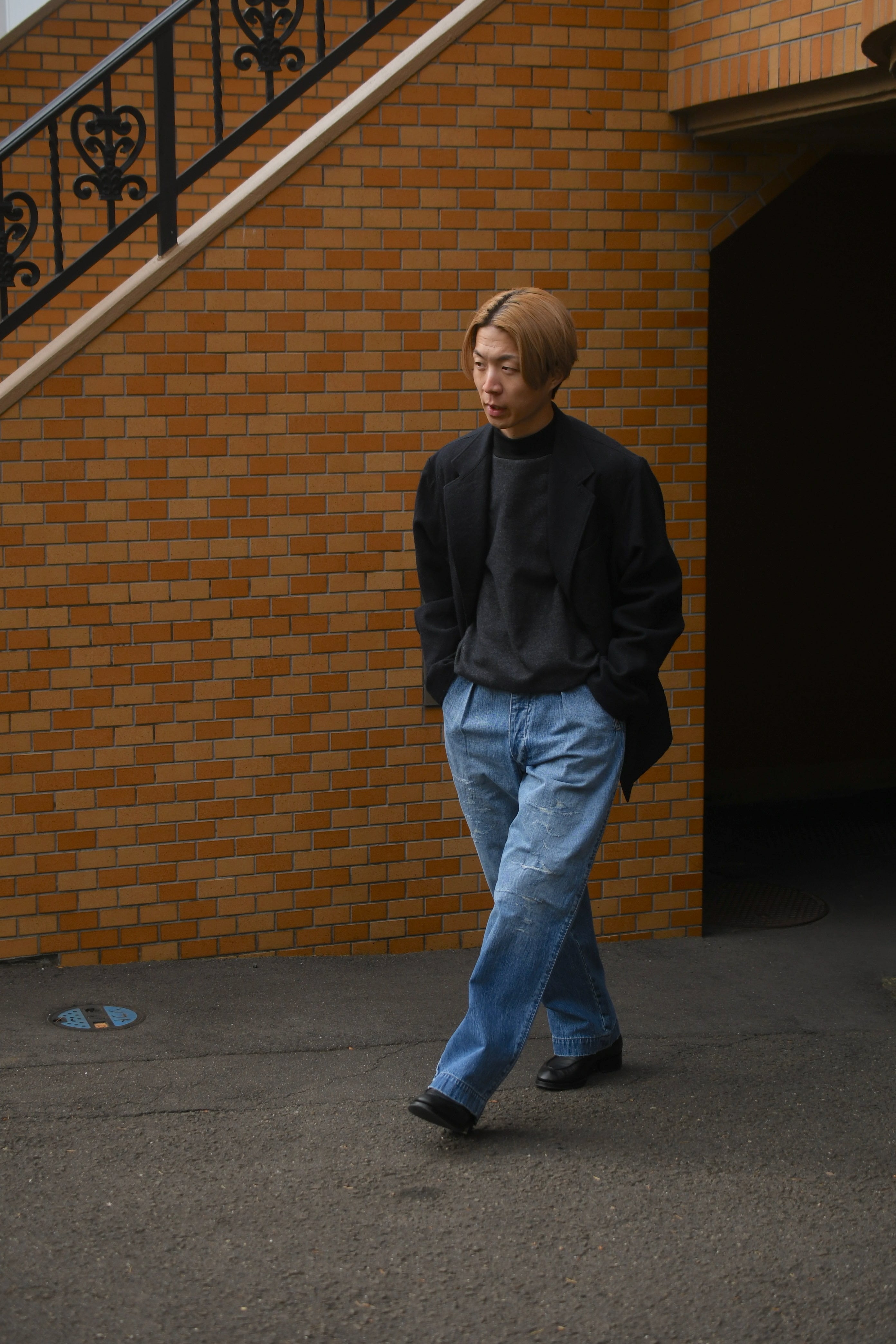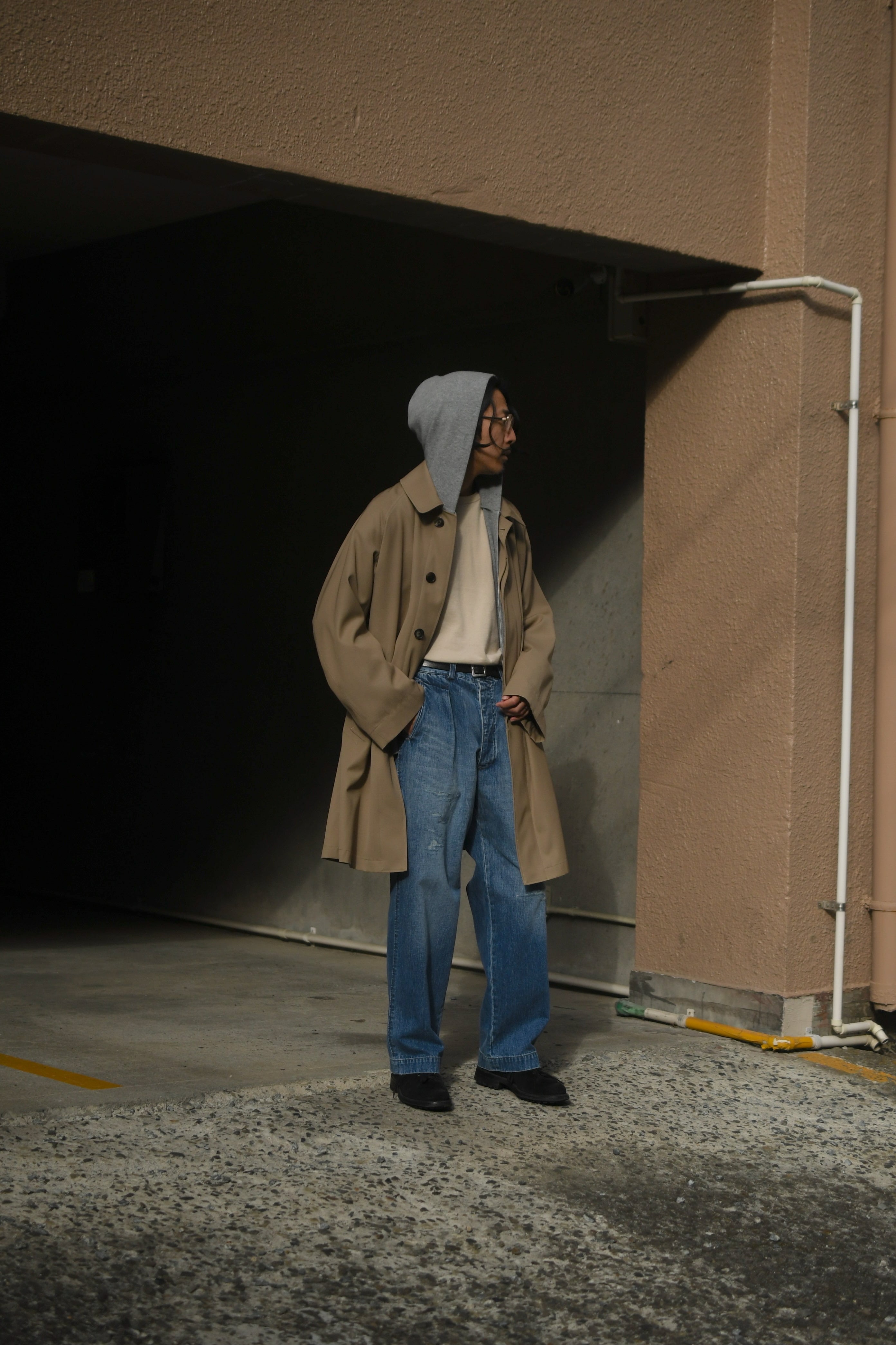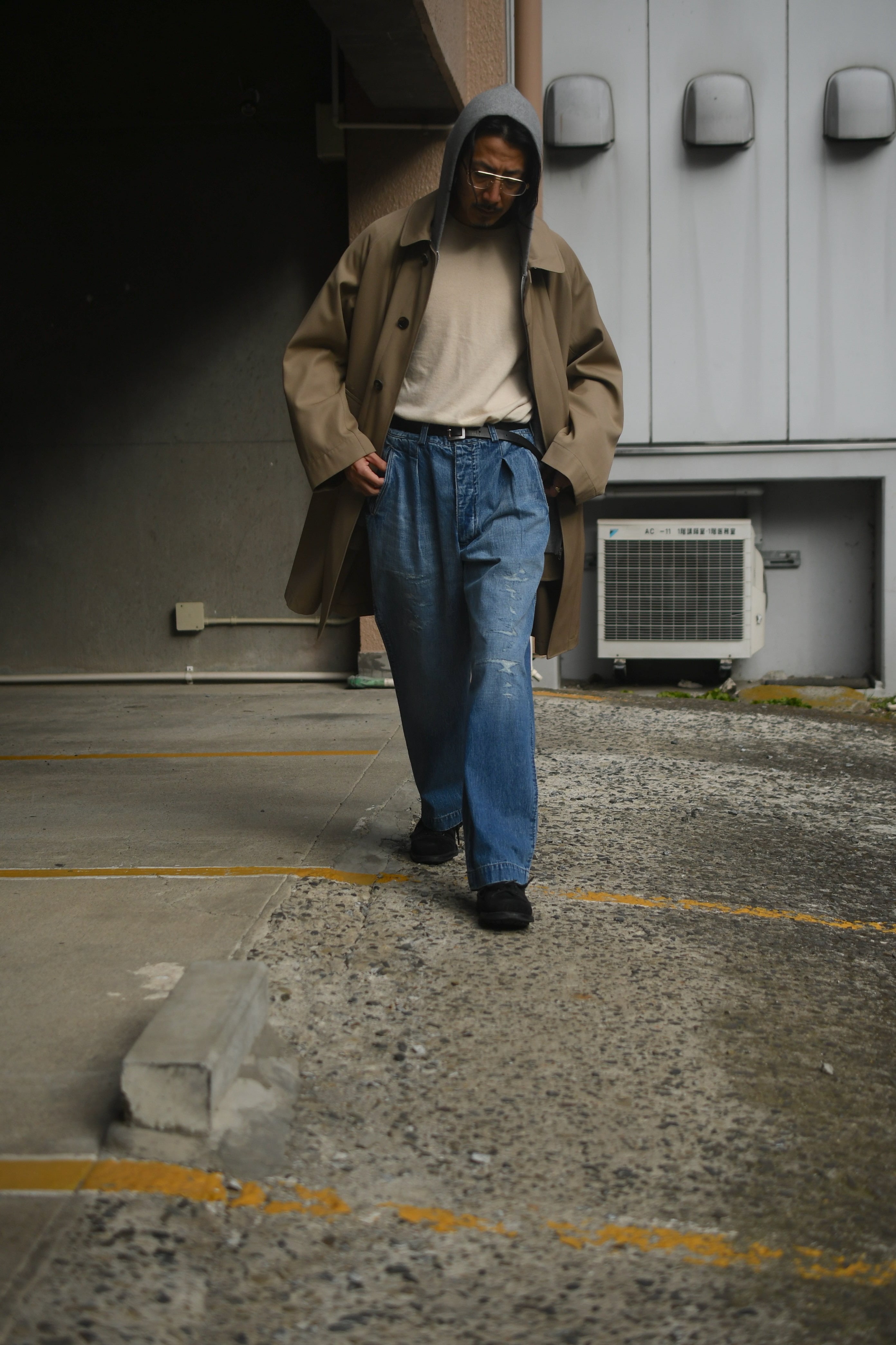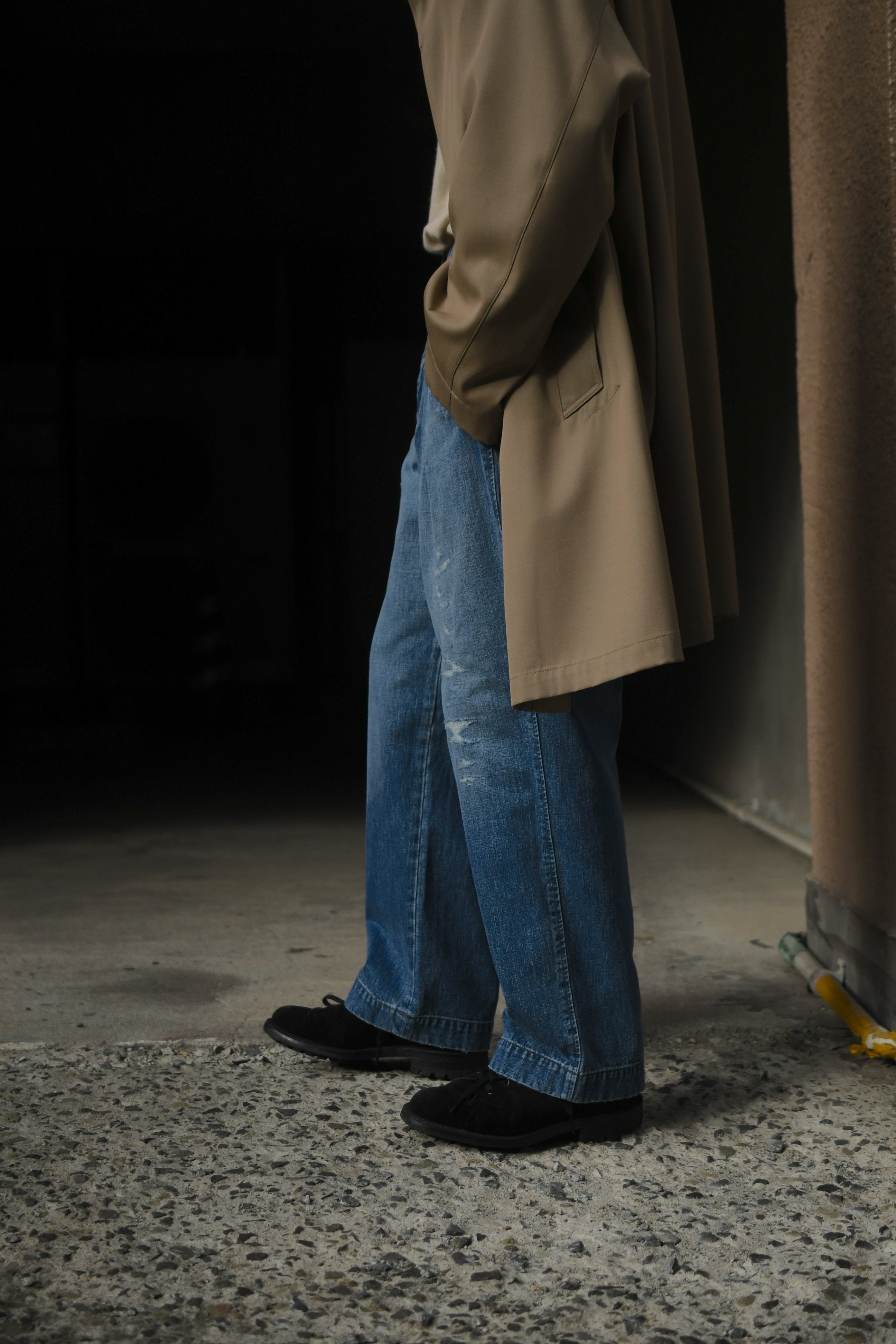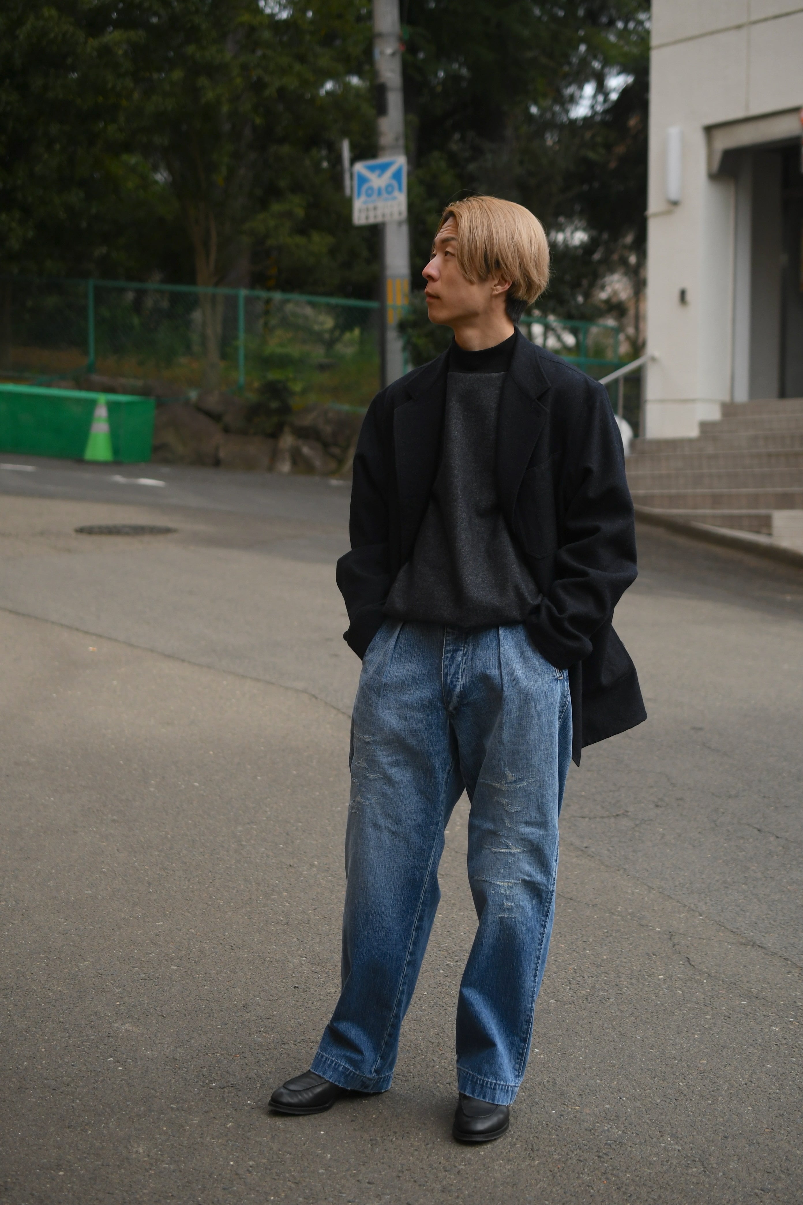 春の清々しさ、そして冬の重厚感や飽きを解消する為にデニムへと手を伸ばしたくなる心理が働く中、OUTILがちょうど良いバランスのデニムを製作していた。本当は昨年に届いていたが、提案としては春を意識する頃合いが理想だと思い、年が明けた今に至る。ベースは30年代のフランス物でオーダーメイド仕様のトラウザース。ポケットやダーツ等の特徴的なディティールは同年代に於ける他のカルチャーも感じさせ、独特な風合いも含めてOUTILらしい佇まいを魅せる。生地は異なる染料を経糸にロープ染色したコットンヘンプの混紡糸を打ち込んだデニム素材。仕上げに粗野で美しいフェード加工とリペアを手作業で施し、米国を代表するヴィンテージらとは異なる枯れた美しさがそこにはある。
