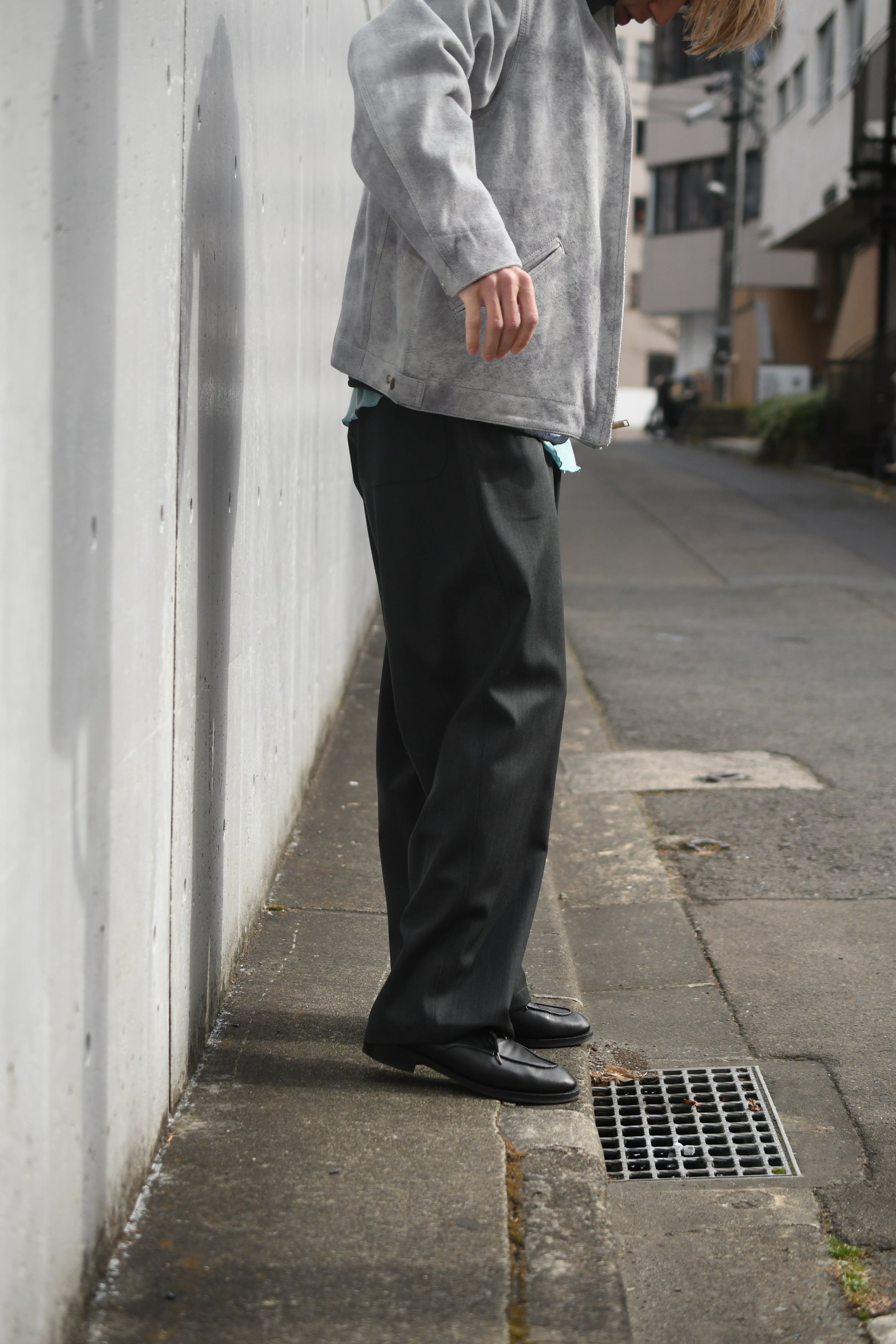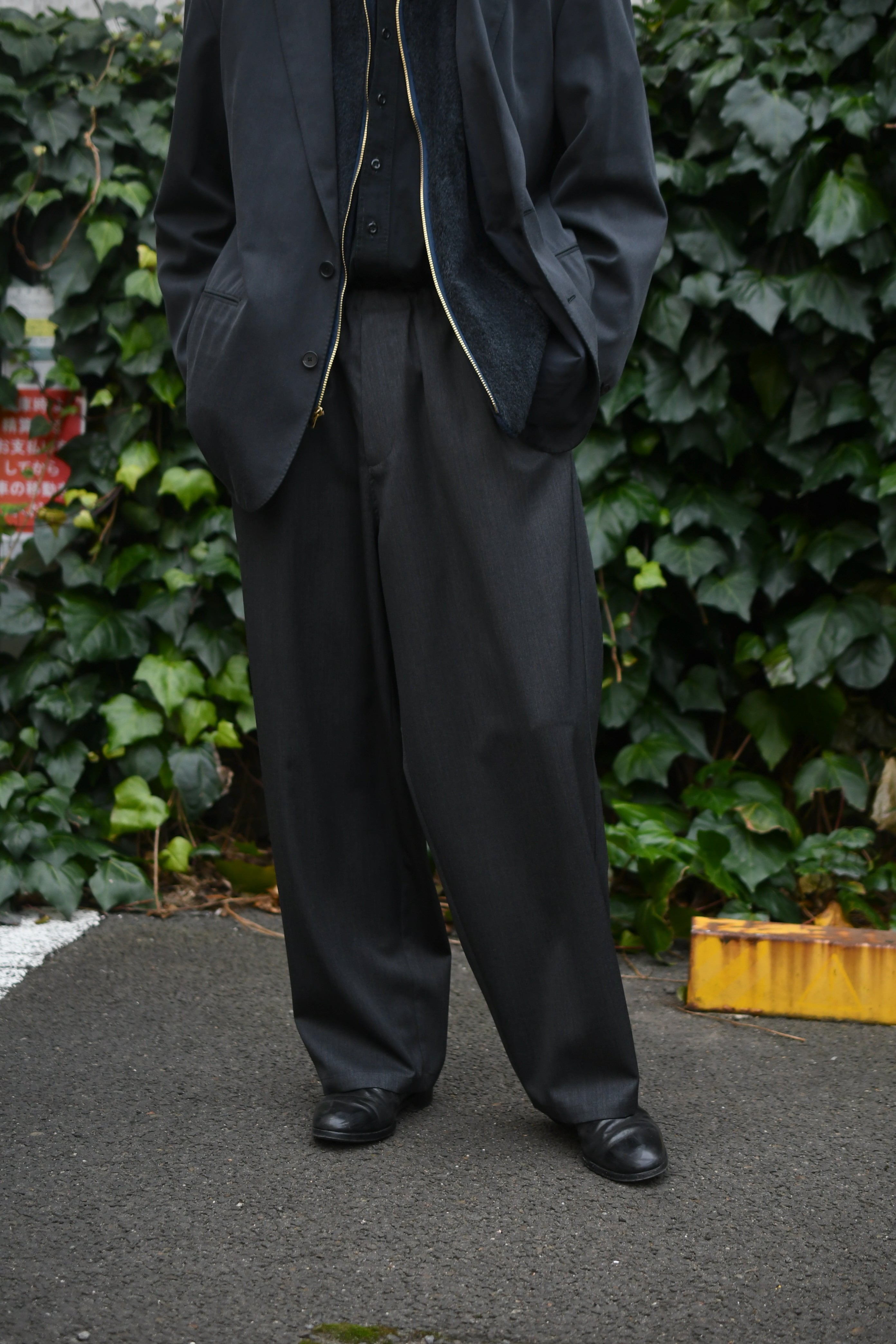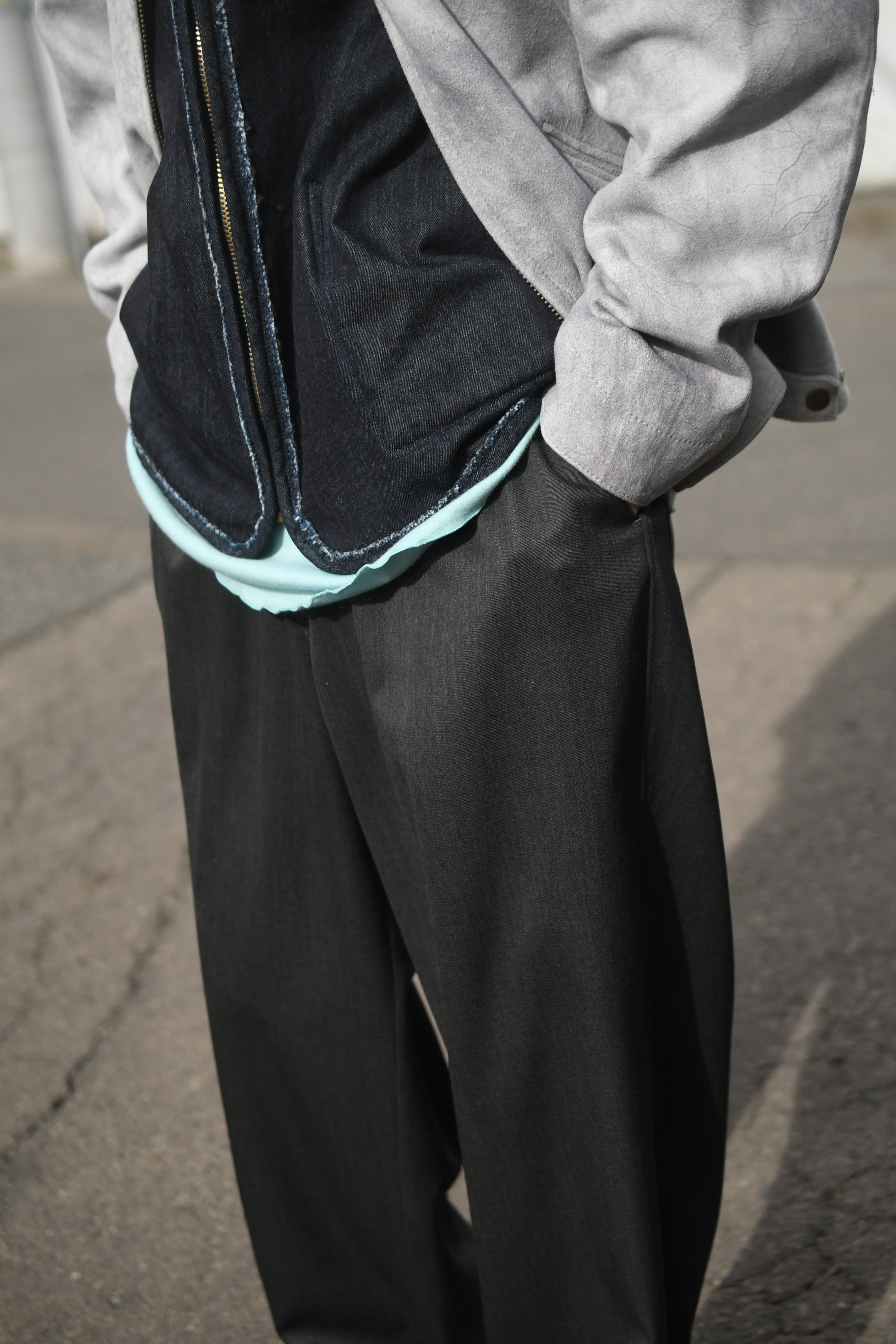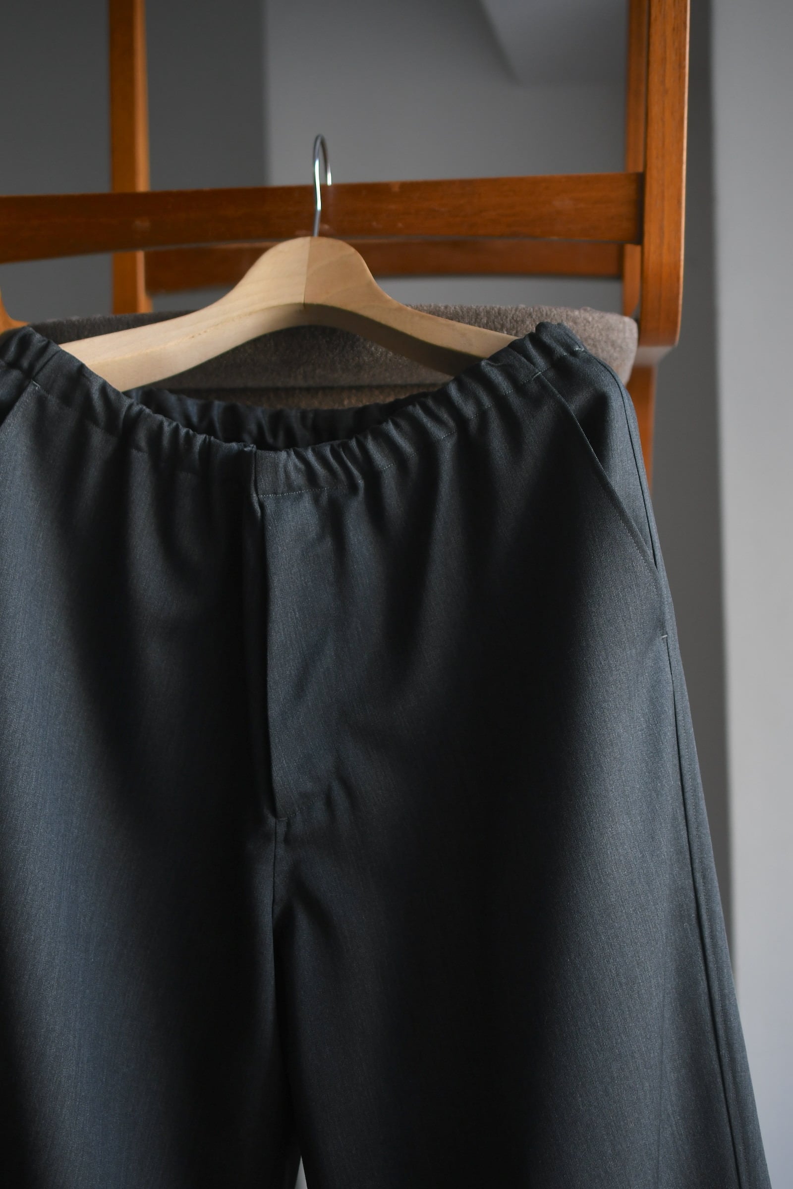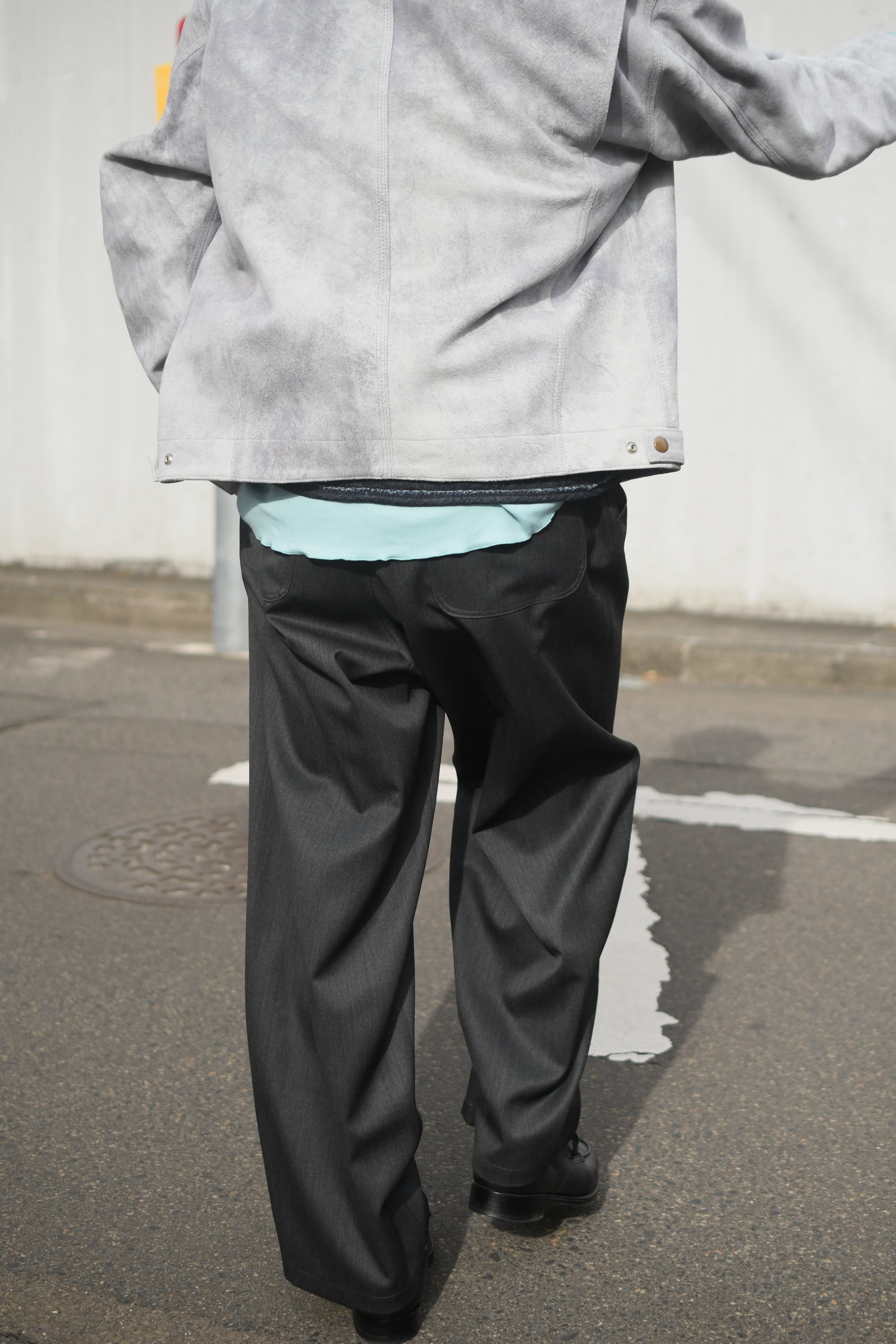 『休日用の頼れるトラウザー』として製作された1本には、様々な出先の場面を考慮したawasaの理想が詰まっている。U.S ARMYのオーバーパンツを背景にルーズさを活かしながらも余分なディティールは削り細やかなパターン調整を組みながら現代的なバランスへ。生地は経緯糸共に2/48のウールギャバジンを採用しているが、経糸に打ち込む本数を多くして織り上げている為に生地にハリがあり、型崩れし難い特性を付与させている。歩く度に優雅なドレープを魅せながらもシルエット感はまとまりがあり、その姿はイージーとは到底思えないスラックスの見え方そのもの。ウエストはイージー仕様だが正面はゴムの溜まりを見せない配慮があり、トップスをインした際の見え方は本当に綺麗である。当然ながらドライタッチで肌離れも非常に良く、夏場でも何の気無しに穿き続けられる抜群の素材感だ。曖昧にでも『休みの日に穿くお供』的な存在を探している人がいるのであれば迷わずにコレを勧めたい。ラフいだけで良いのであれば選択肢は山ほどあるが、”街に出る” “人と会う”事を踏まえた上で選ぶとなれば意外にも納得できる答えは見つかりづらいだろう。派手さは要らない。上も足元も選ばない。季節で買い足す事はしたくない。それならば一度、この1本に身を委ねてみても良いかもしれません。