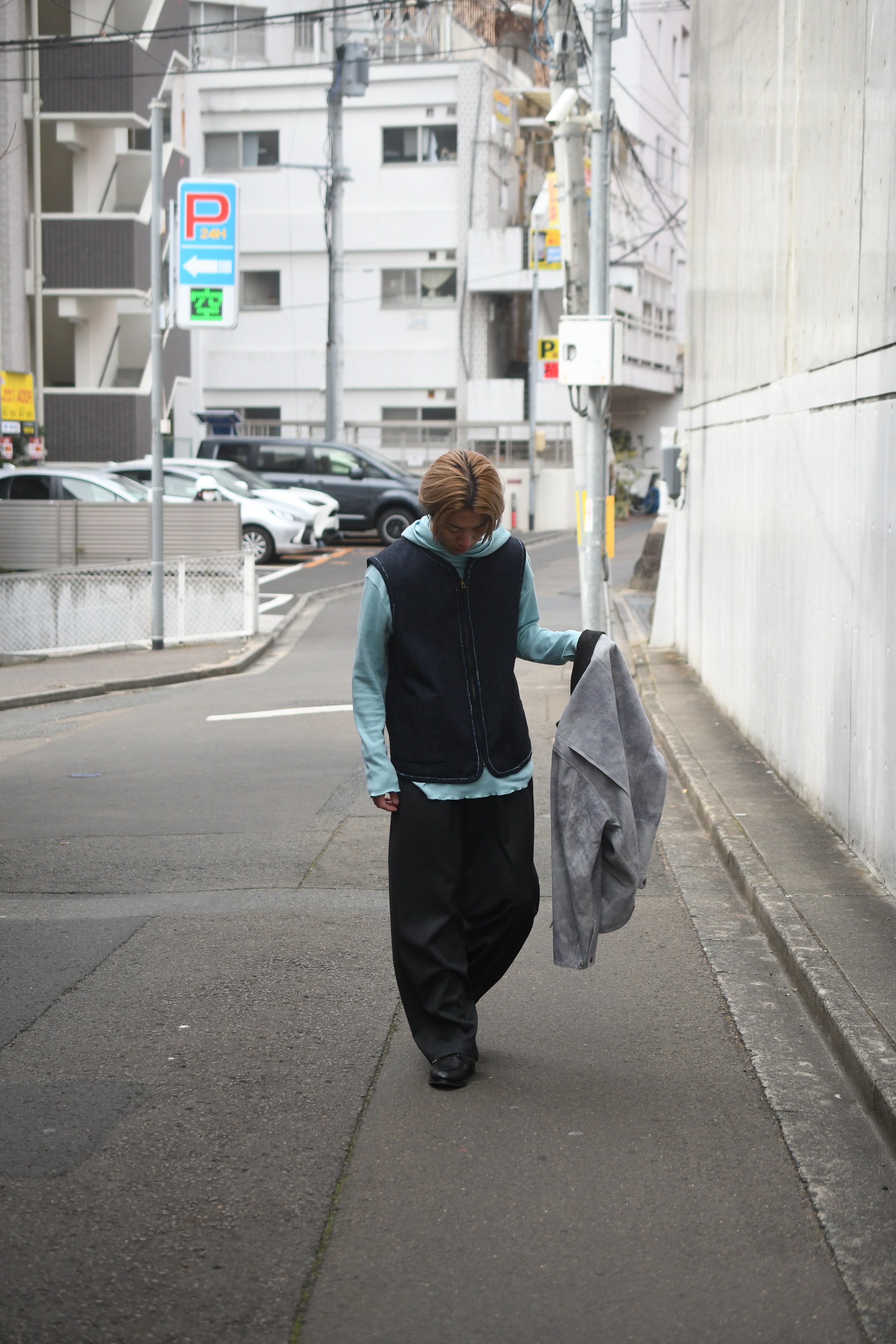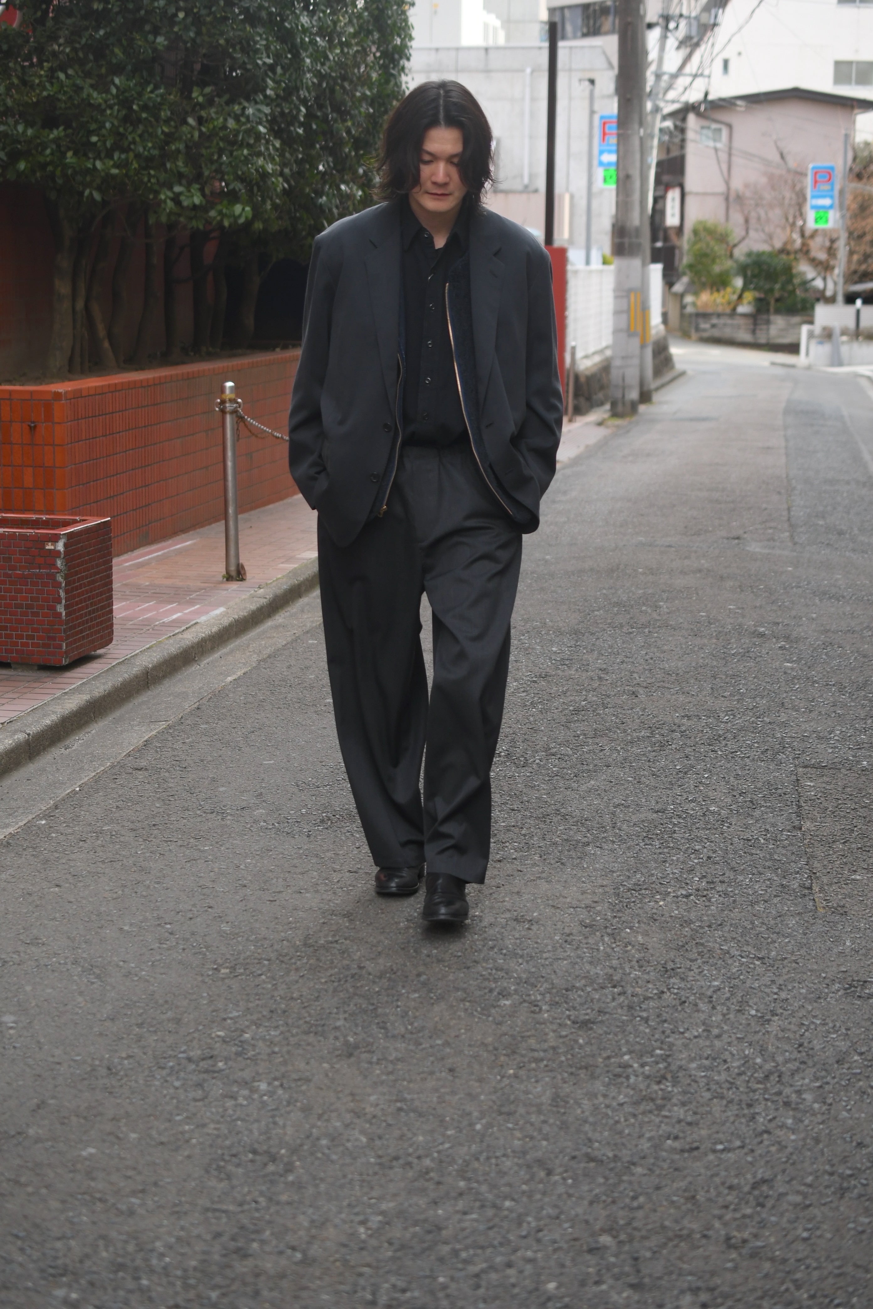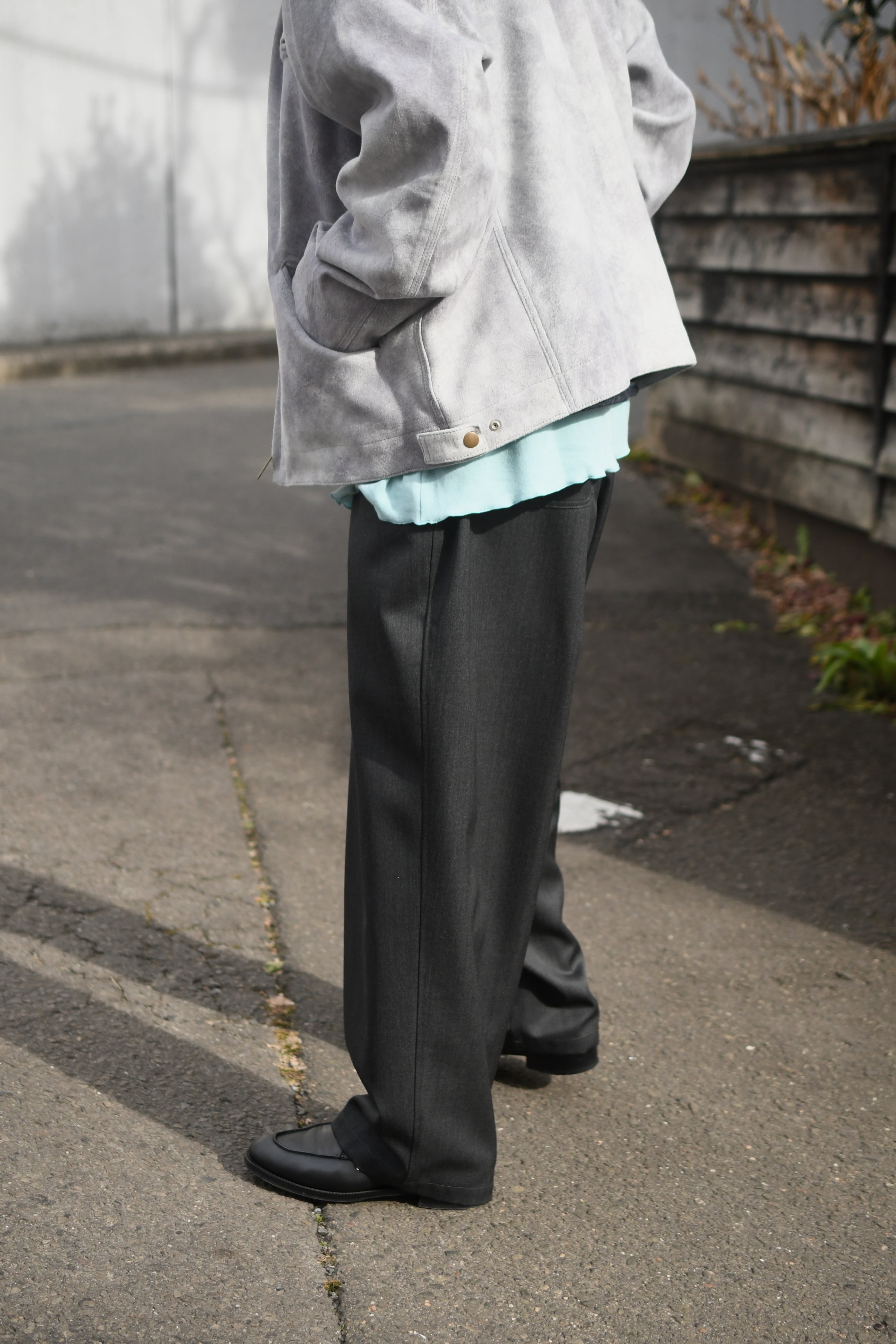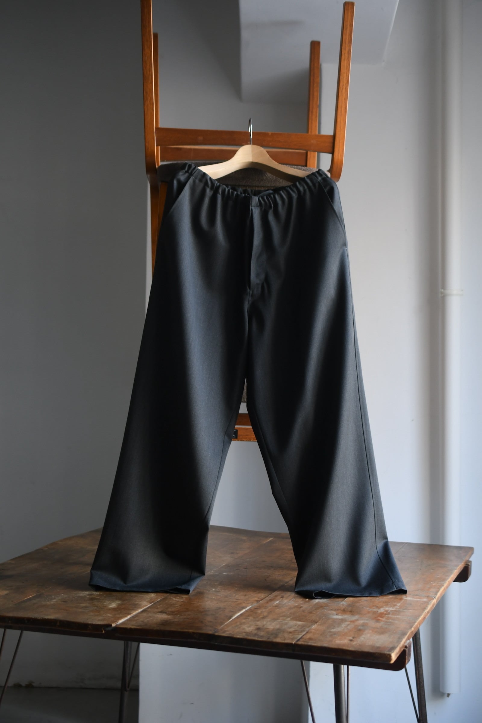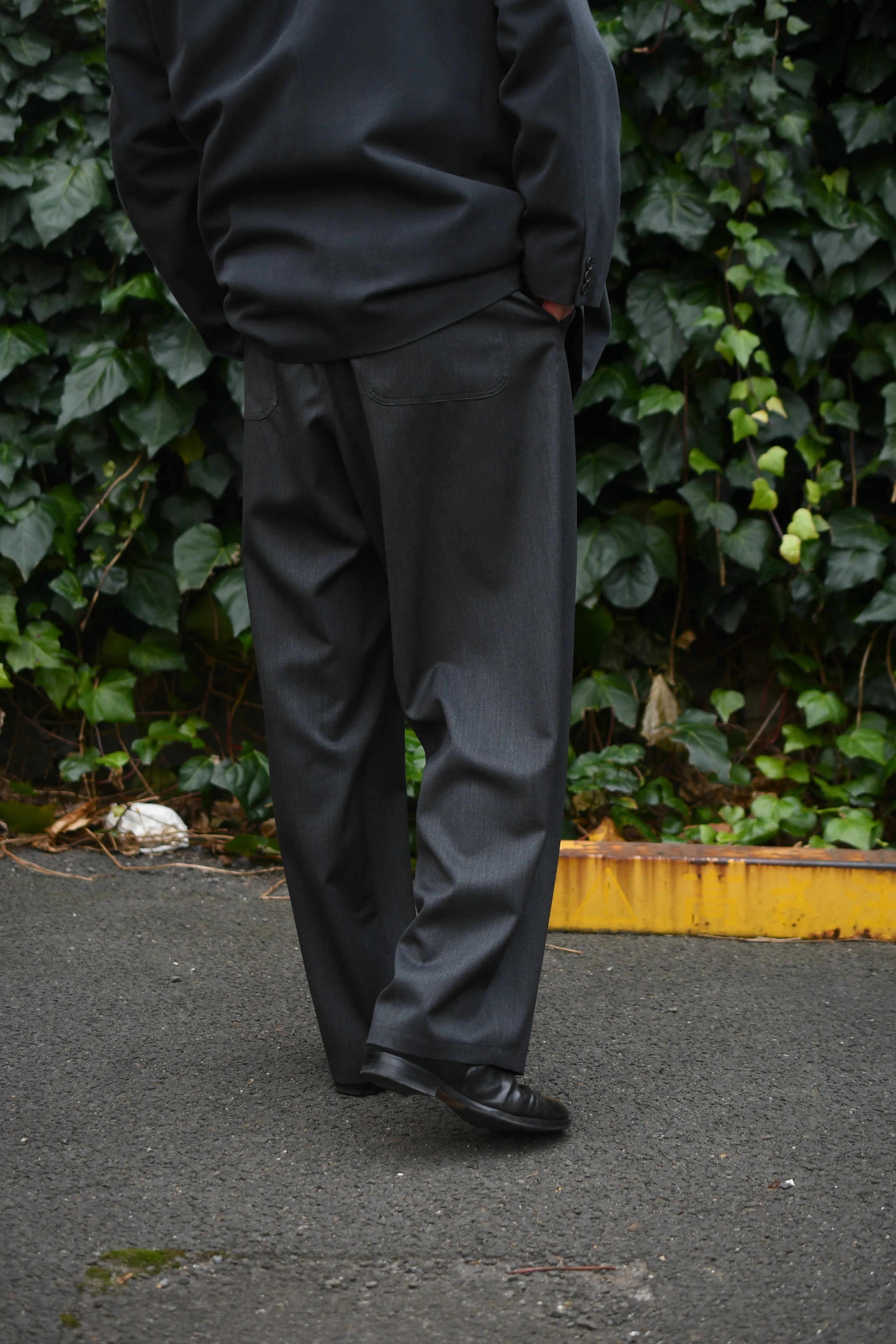 『休日用の頼れるトラウザー』として製作された1本には、様々な出先の場面を考慮したawasaの理想が詰まっている。U.S ARMYのオーバーパンツを背景にルーズさを活かしながらも余分なディティールは削り細やかなパターン調整を組みながら現代的なバランスへ。生地は経緯糸共に2/48のウールギャバジンを採用しているが、経糸に打ち込む本数を多くして織り上げている為に生地にハリがあり、型崩れし難い特性を付与させている。歩く度に優雅なドレープを魅せながらもシルエット感はまとまりがあり、その姿はイージーとは到底思えないスラックスの見え方そのもの。ウエストはイージー仕様だが正面はゴムの溜まりを見せない配慮があり、トップスをインした際の見え方は本当に綺麗である。当然ながらドライタッチで肌離れも非常に良く、夏場でも何の気無しに穿き続けられる抜群の素材感だ。曖昧にでも『休みの日に穿くお供』的な存在を探している人がいるのであれば迷わずにコレを勧めたい。ラフいだけで良いのであれば選択肢は山ほどあるが、”街に出る” “人と会う”事を踏まえた上で選ぶとなれば意外にも納得できる答えは見つかりづらいだろう。派手さは要らない。上も足元も選ばない。季節で買い足す事はしたくない。それならば一度、この1本に身を委ねてみても良いかもしれません。