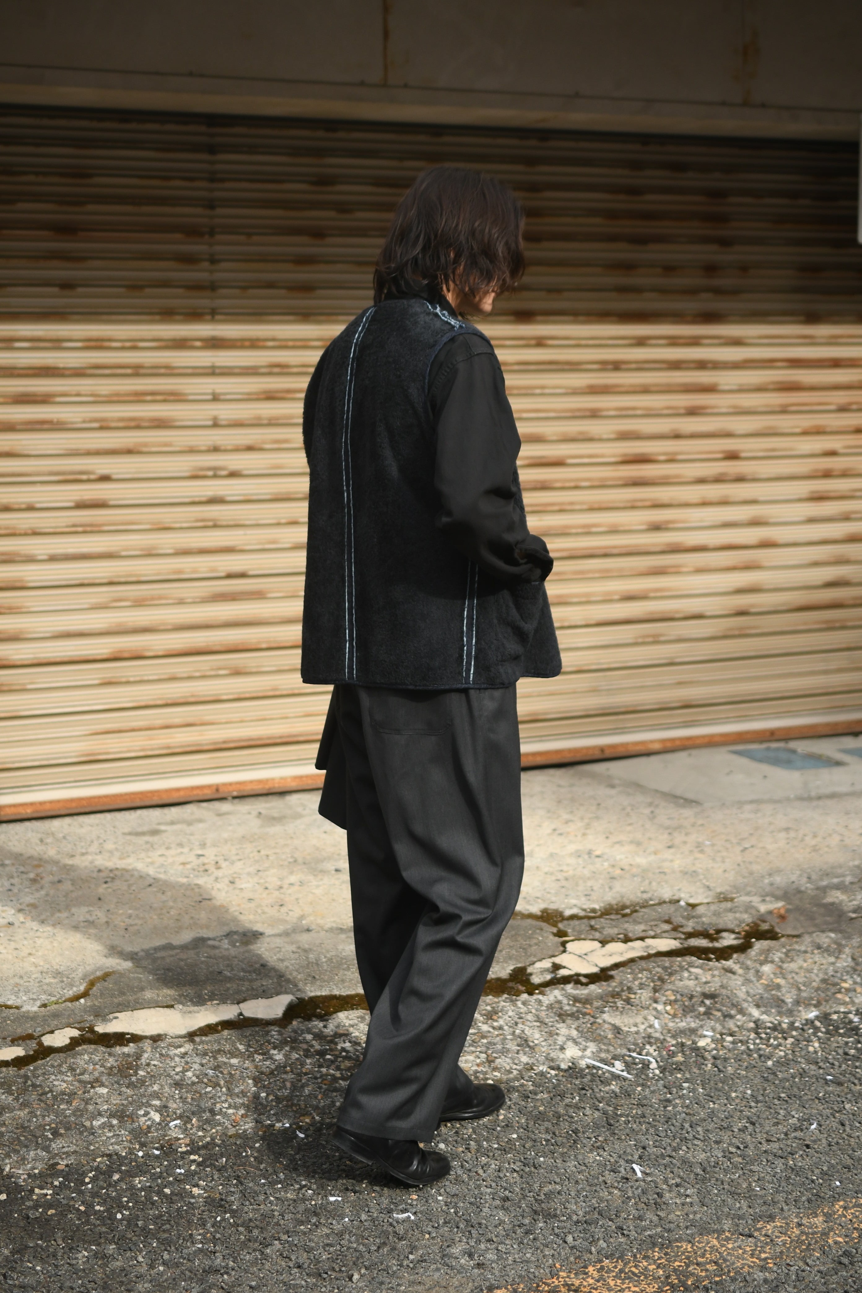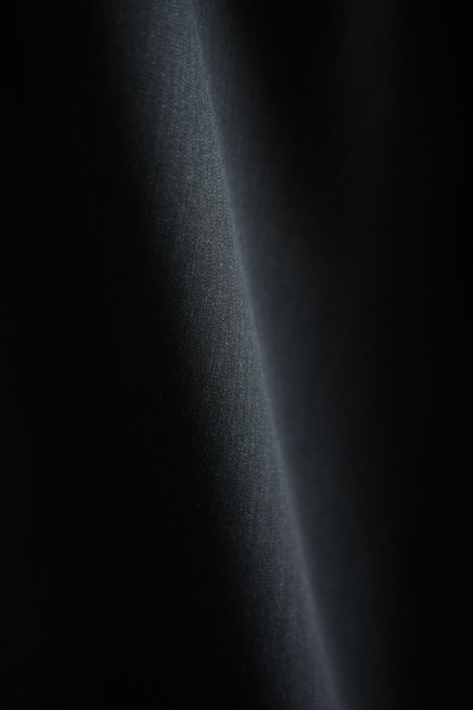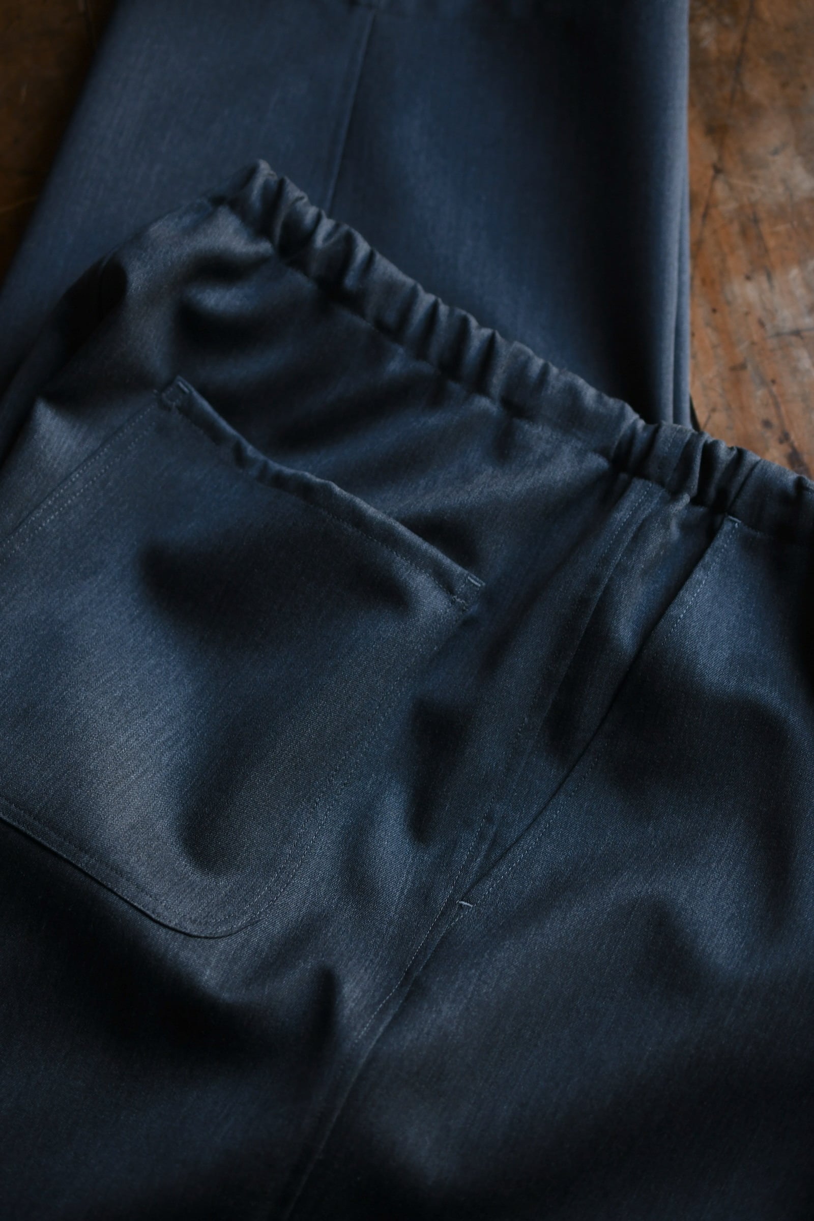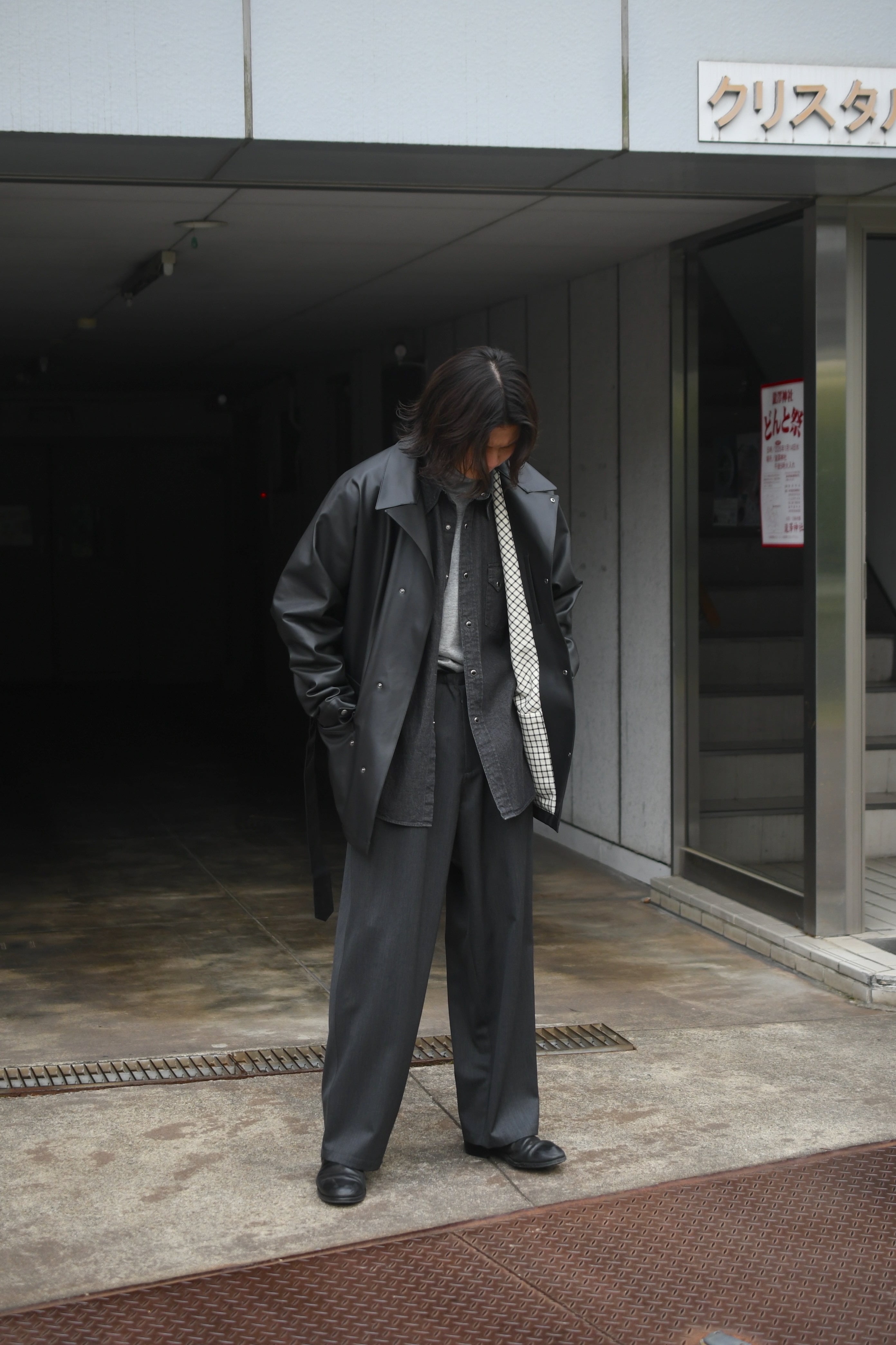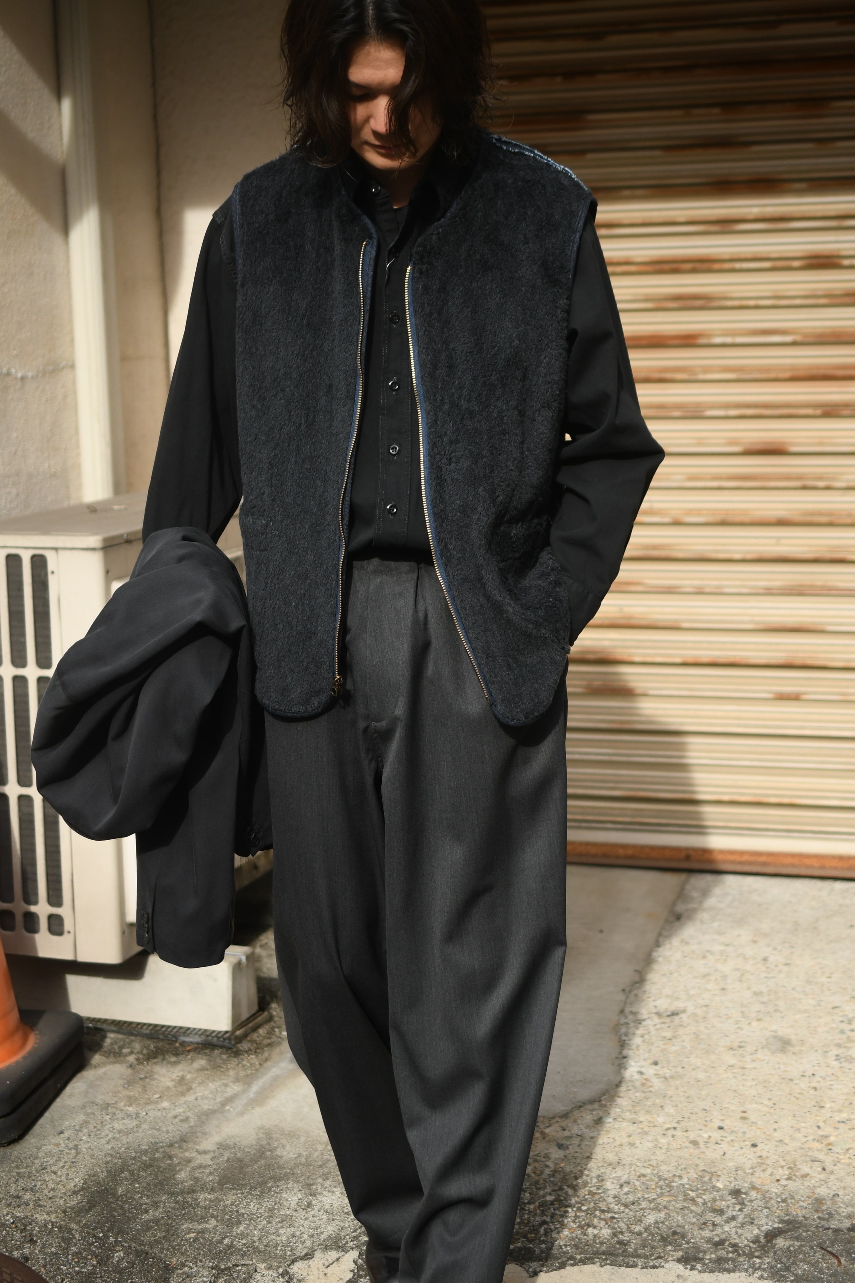 『休日用の頼れるトラウザー』として製作された1本には、様々な出先の場面を考慮したawasaの理想が詰まっている。U.S ARMYのオーバーパンツを背景にルーズさを活かしながらも余分なディティールは削り細やかなパターン調整を組みながら現代的なバランスへ。生地は経緯糸共に2/48のウールギャバジンを採用しているが、経糸に打ち込む本数を多くして織り上げている為に生地にハリがあり、型崩れし難い特性を付与させている。歩く度に優雅なドレープを魅せながらもシルエット感はまとまりがあり、その姿はイージーとは到底思えないスラックスの見え方そのもの。ウエストはイージー仕様だが正面はゴムの溜まりを見せない配慮があり、トップスをインした際の見え方は本当に綺麗である。当然ながらドライタッチで肌離れも非常に良く、夏場でも何の気無しに穿き続けられる抜群の素材感だ。曖昧にでも『休みの日に穿くお供』的な存在を探している人がいるのであれば迷わずにコレを勧めたい。ラフいだけで良いのであれば選択肢は山ほどあるが、”街に出る” “人と会う”事を踏まえた上で選ぶとなれば意外にも納得できる答えは見つかりづらいだろう。派手さは要らない。上も足元も選ばない。季節で買い足す事はしたくない。それならば一度、この1本に身を委ねてみても良いかもしれません。
