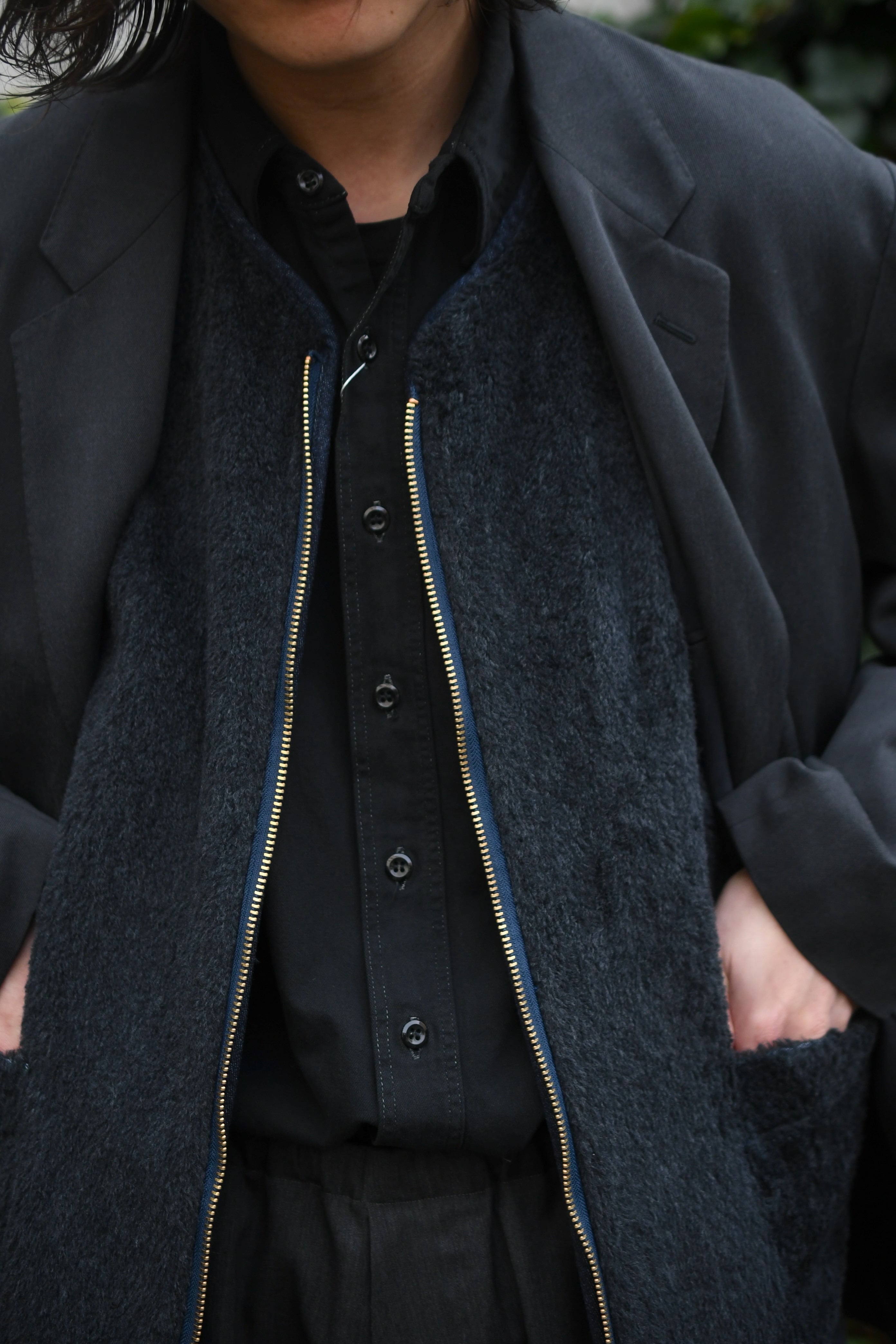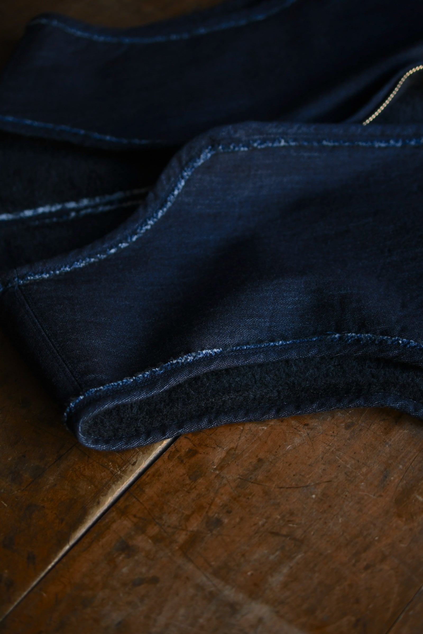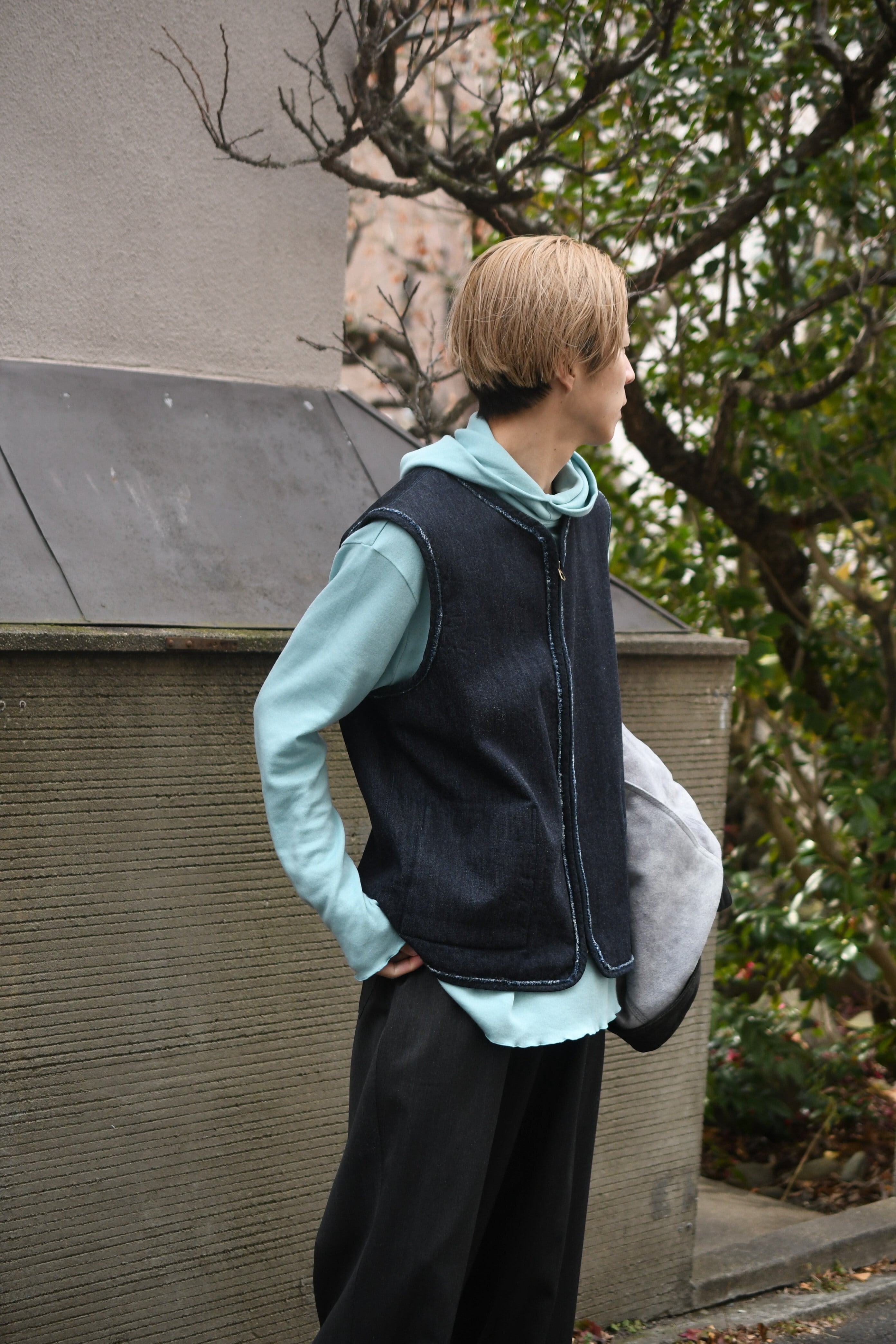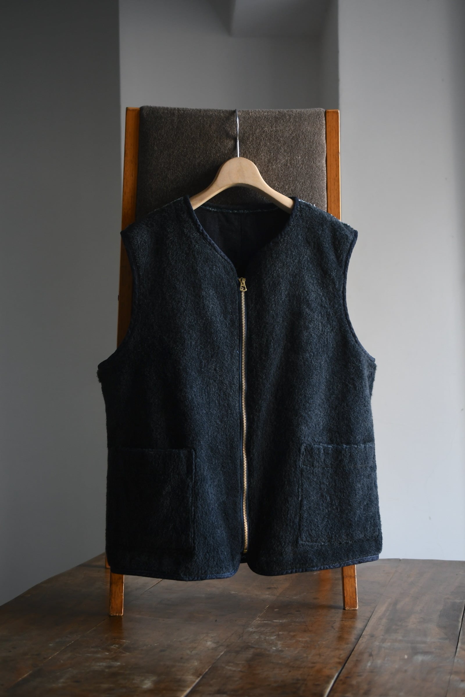 ファッション的な面白さがありながら、日常的な魅力も垣間見える理に適ったデニムボアベスト。インディゴのロープ染色糸によるデニム面とメリノウールによる柔らかいボア面のリバーシブル仕様で、シンプルながらに異なった印象感を楽しめられる。比較的カマ底は深く身幅に余裕を持たせている為、”重ねやすい”という利点によってリバーシブルの旨みが更に際立ち、求めている着方が十分に叶う。その上で今作は2枚仕立てになる一般的なそれらとは違い、デニム地の裏面を直接ボア地とした一重の仕様。これによりボリューム感が収まり、保温性と通気性を兼ね備える優秀なベストとなった。着用の意図を「秋冬」から「秋冬春」へと広げたawasaのデニムボアベスト。インアウト共に2面を使い分けながら、そのポテンシャルの高さを是非とも堪能して頂きたい。