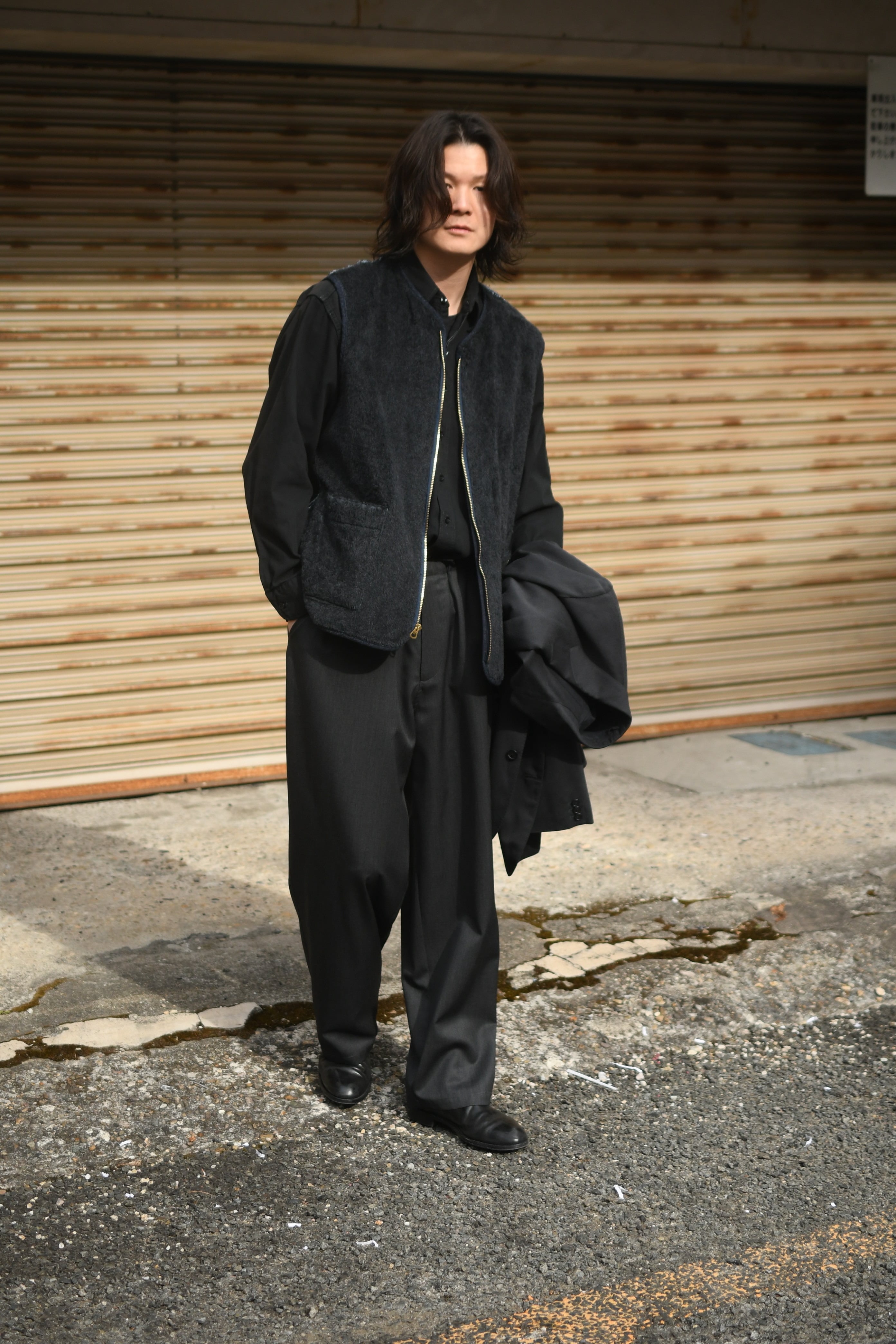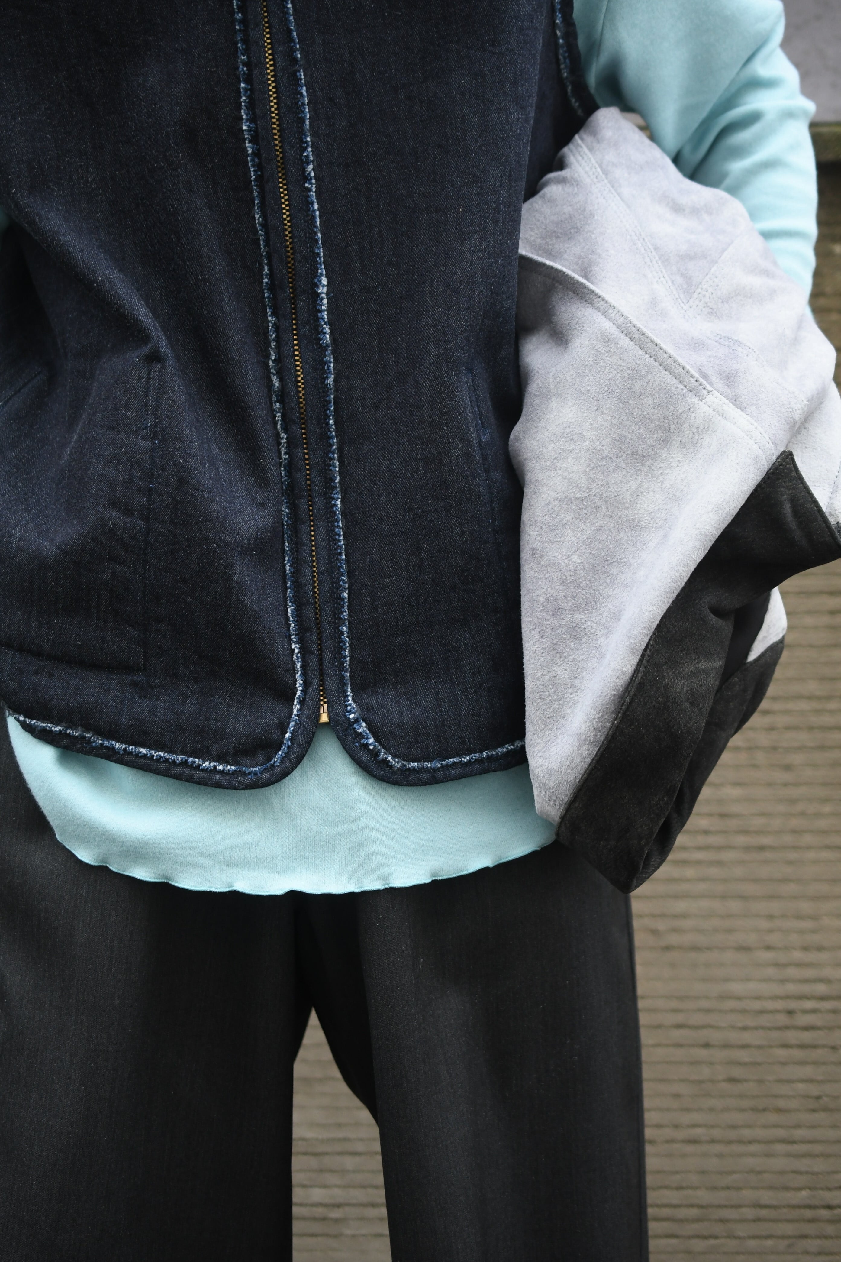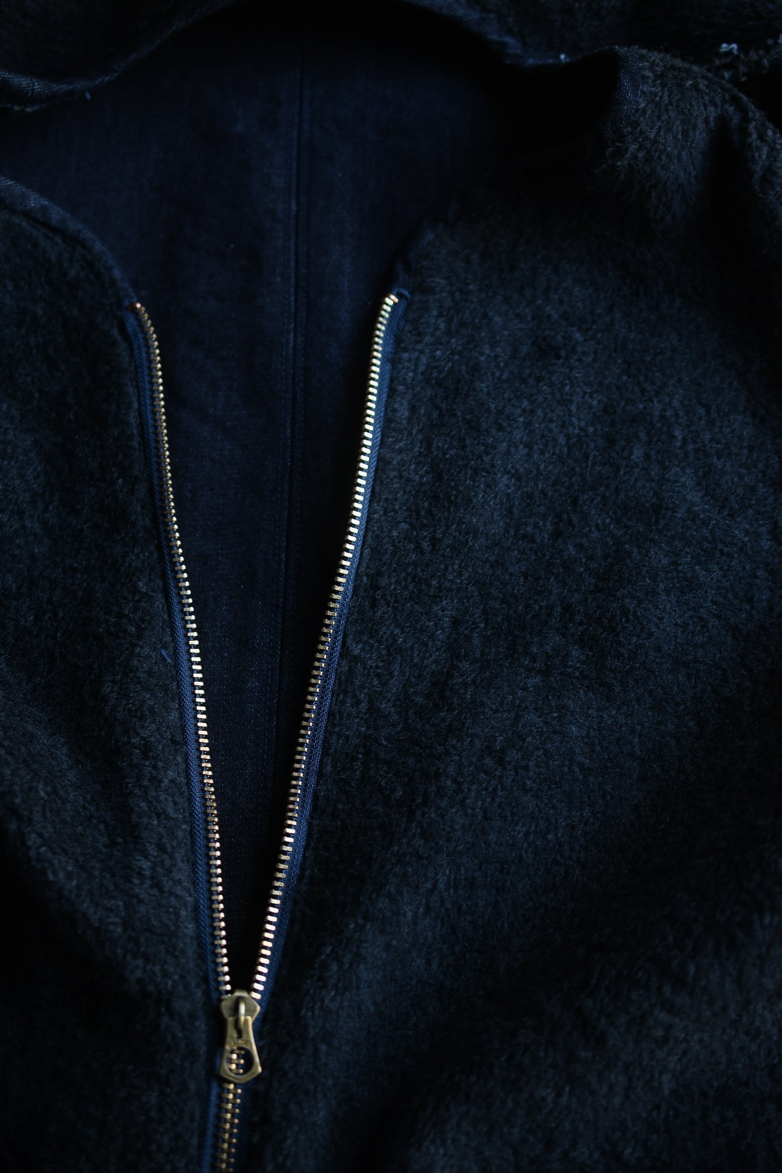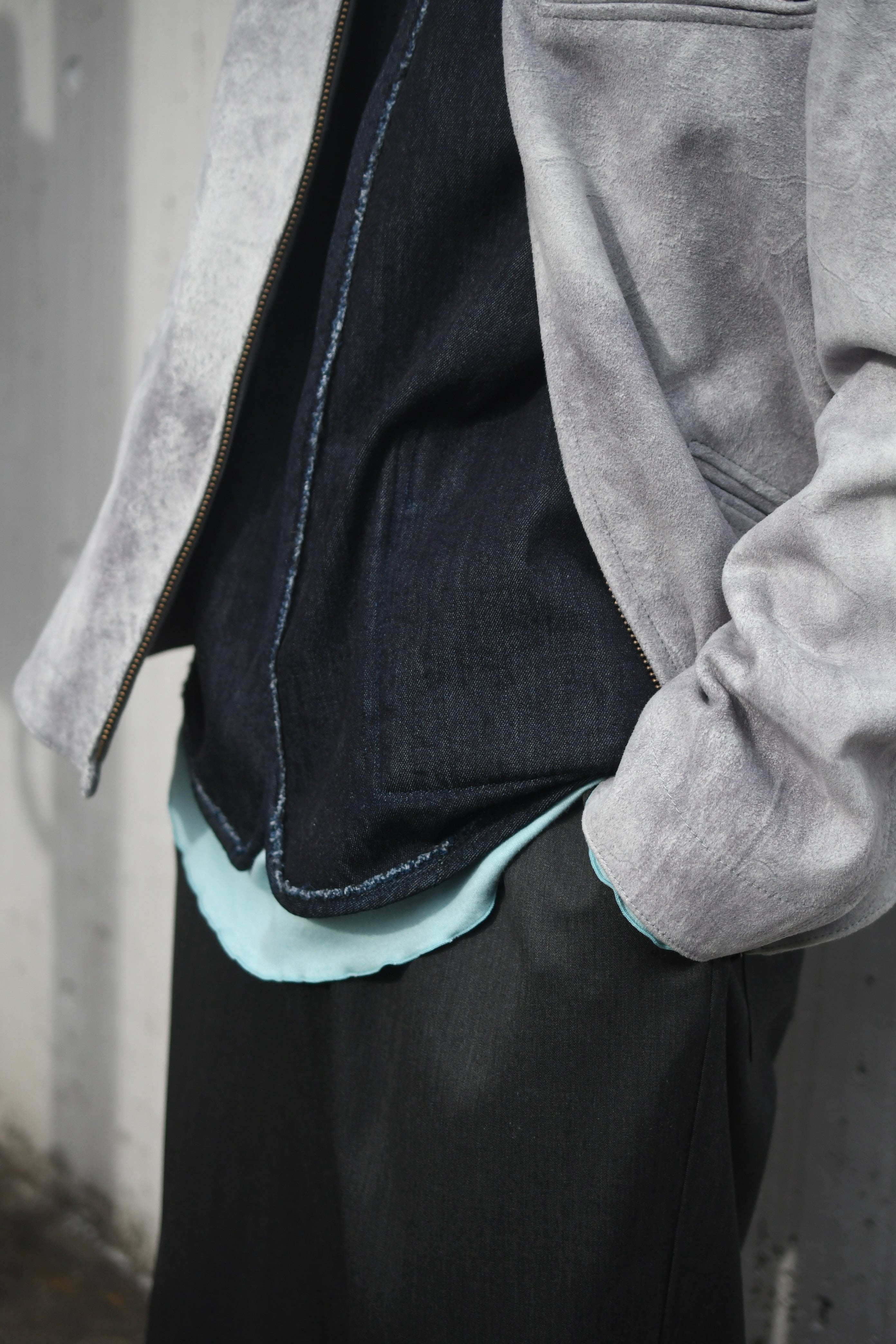 ファッション的な面白さがありながら、日常的な魅力も垣間見える理に適ったデニムボアベスト。インディゴのロープ染色糸によるデニム面とメリノウールによる柔らかいボア面のリバーシブル仕様で、シンプルながらに異なった印象感を楽しめられる。比較的カマ底は深く身幅に余裕を持たせている為、”重ねやすい”という利点によってリバーシブルの旨みが更に際立ち、求めている着方が十分に叶う。その上で今作は2枚仕立てになる一般的なそれらとは違い、デニム地の裏面を直接ボア地とした一重の仕様。これによりボリューム感が収まり、保温性と通気性を兼ね備える優秀なベストとなった。着用の意図を「秋冬」から「秋冬春」へと広げたawasaのデニムボアベスト。インアウト共に2面を使い分けながら、そのポテンシャルの高さを是非とも堪能して頂きたい。