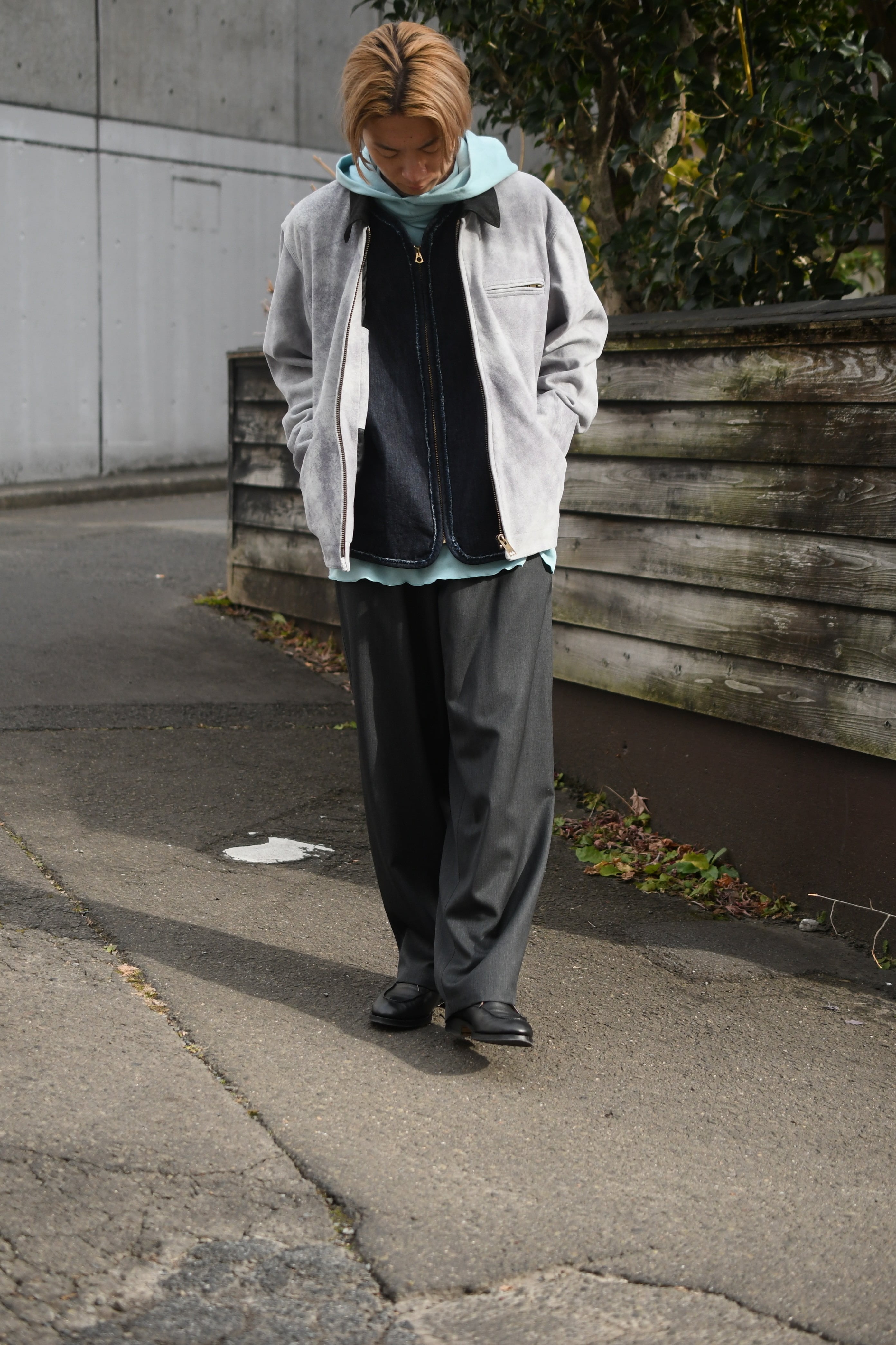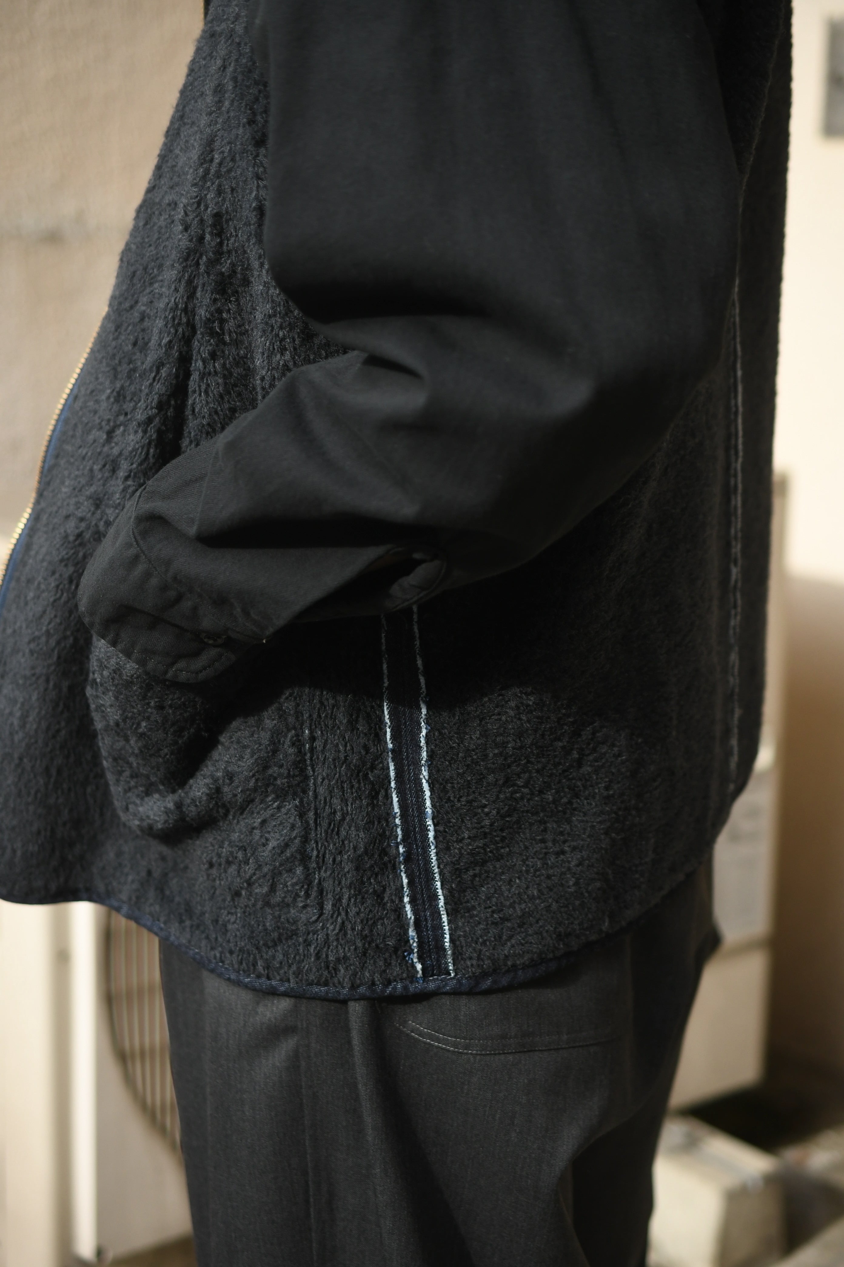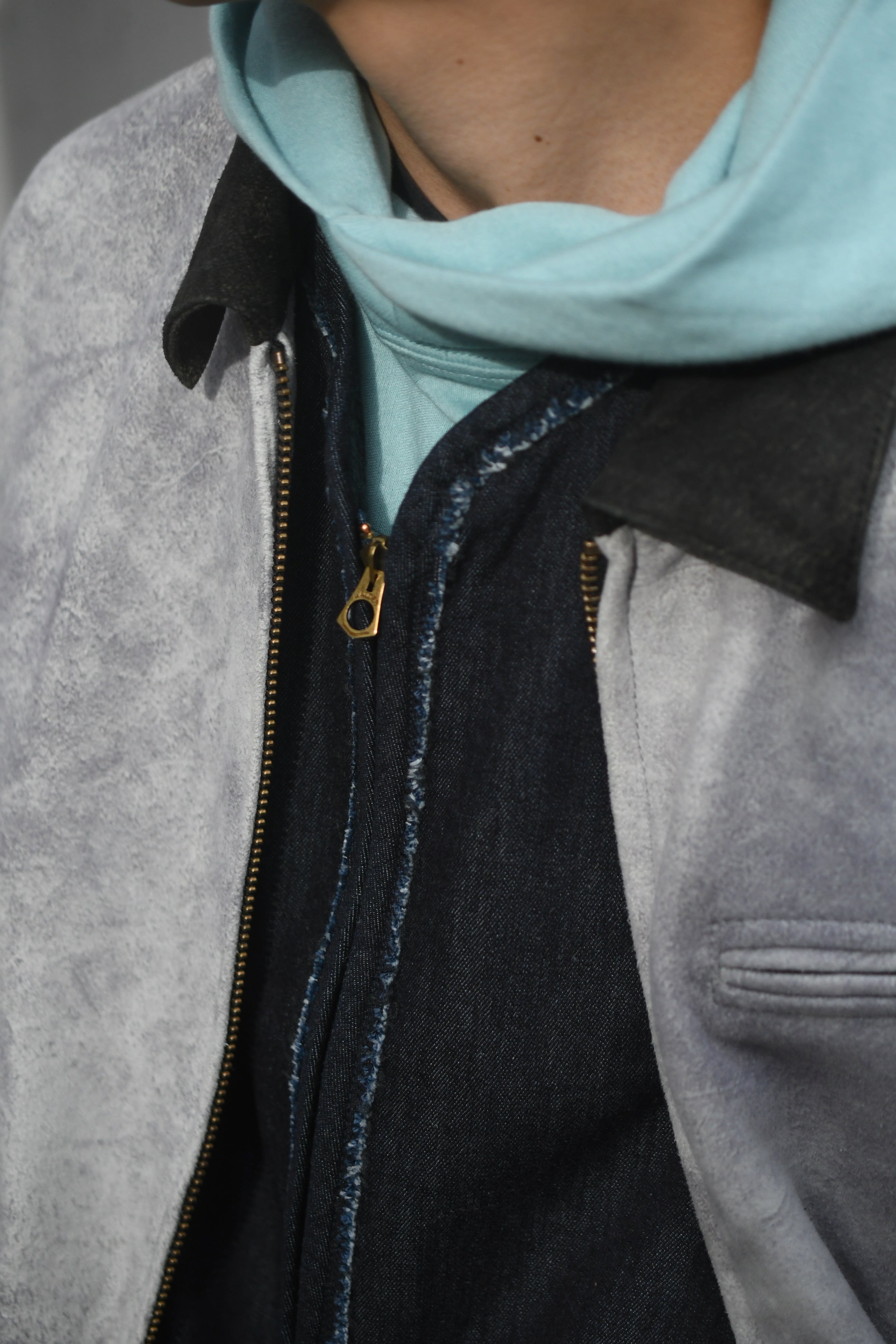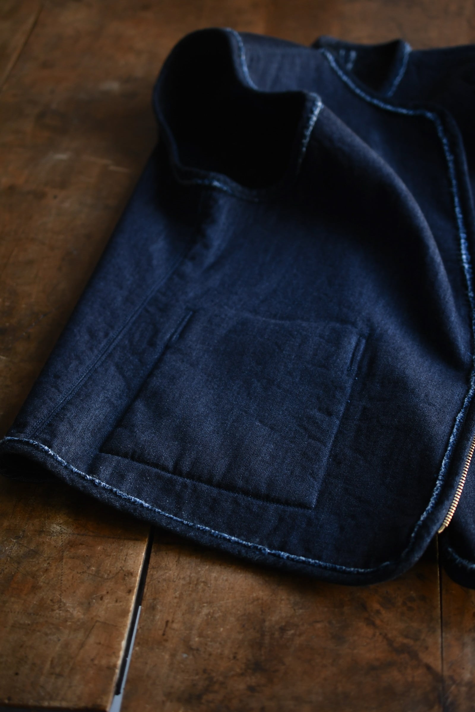ファッション的な面白さがありながら、日常的な魅力も垣間見える理に適ったデニムボアベスト。インディゴのロープ染色糸によるデニム面とメリノウールによる柔らかいボア面のリバーシブル仕様で、シンプルながらに異なった印象感を楽しめられる。比較的カマ底は深く身幅に余裕を持たせている為、”重ねやすい”という利点によってリバーシブルの旨みが更に際立ち、求めている着方が十分に叶う。その上で今作は2枚仕立てになる一般的なそれらとは違い、デニム地の裏面を直接ボア地とした一重の仕様。これによりボリューム感が収まり、保温性と通気性を兼ね備える優秀なベストとなった。着用の意図を「秋冬」から「秋冬春」へと広げたawasaのデニムボアベスト。インアウト共に2面を使い分けながら、そのポテンシャルの高さを是非とも堪能して頂きたい。