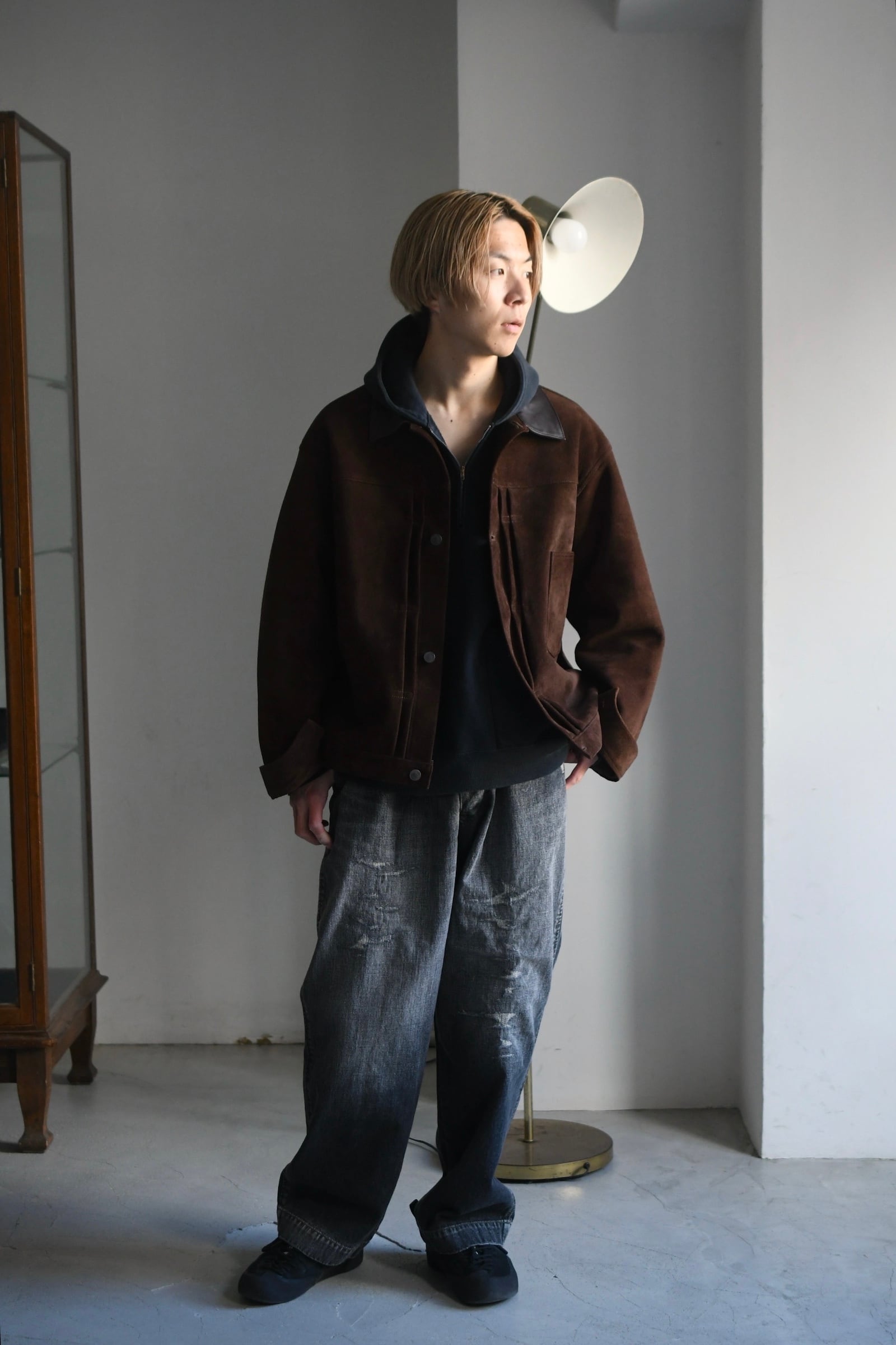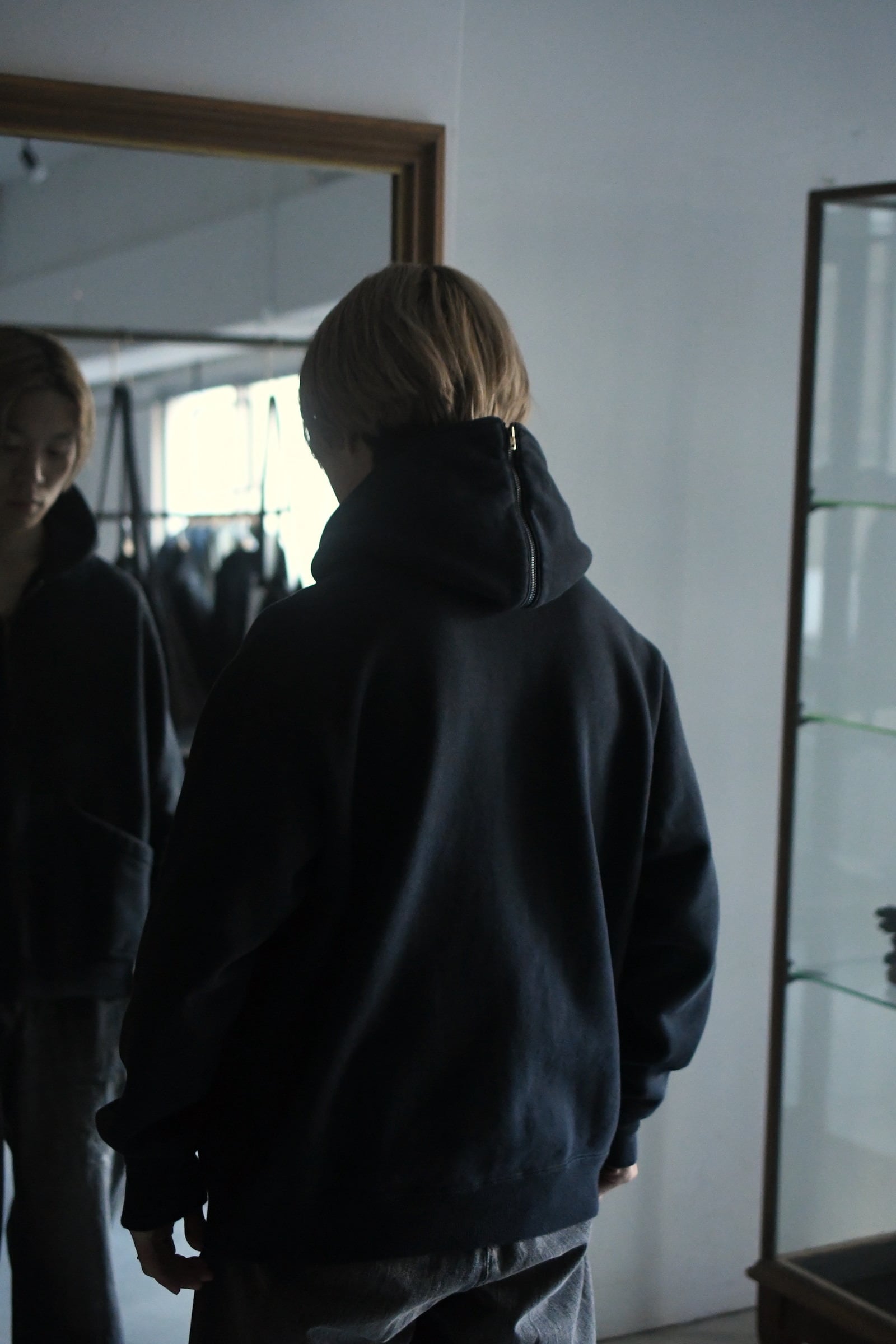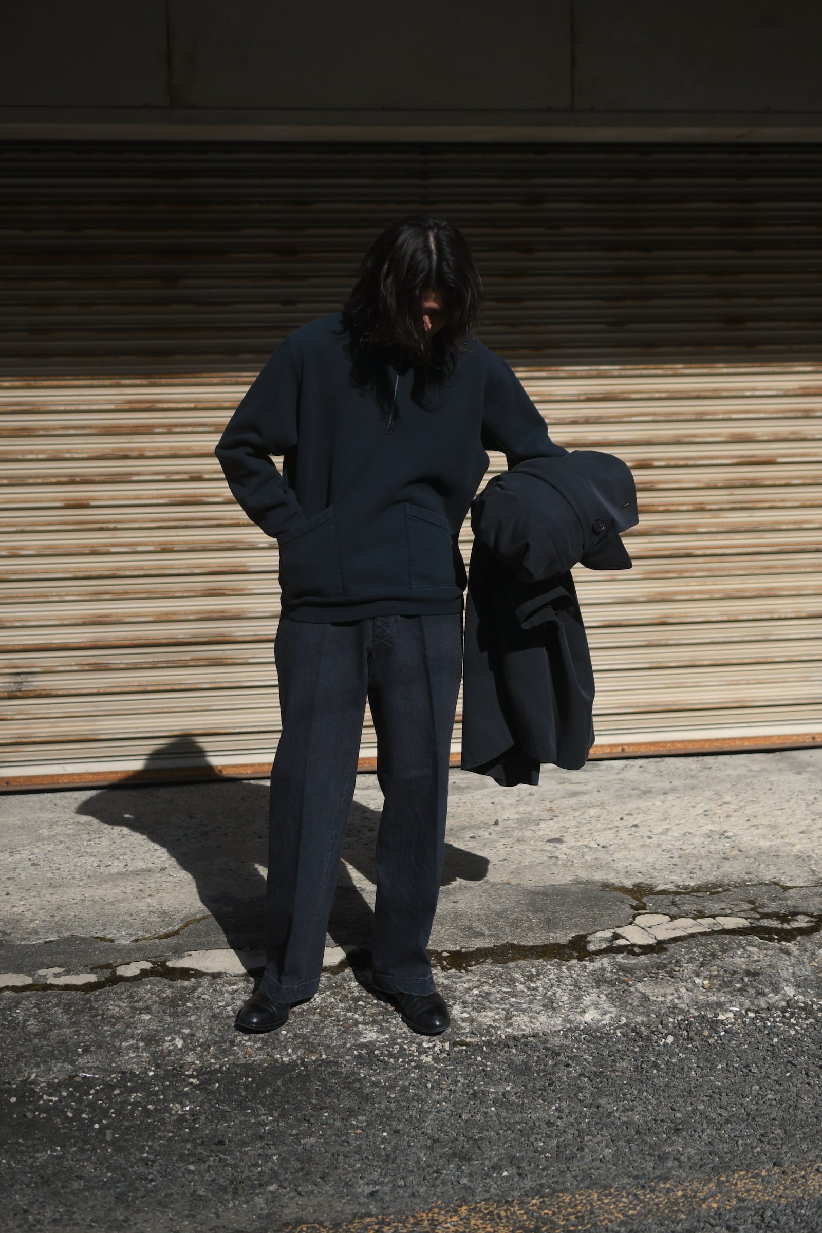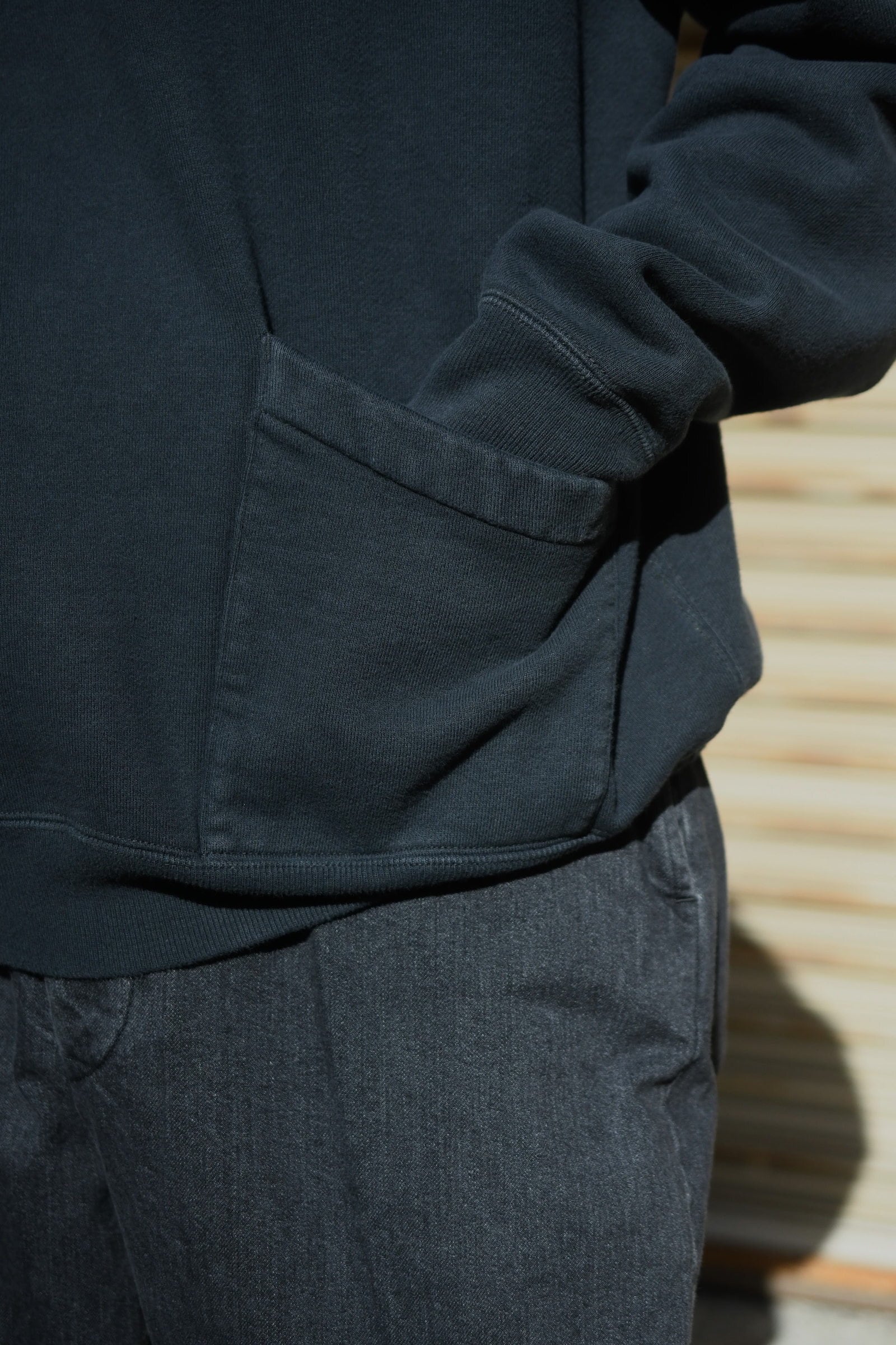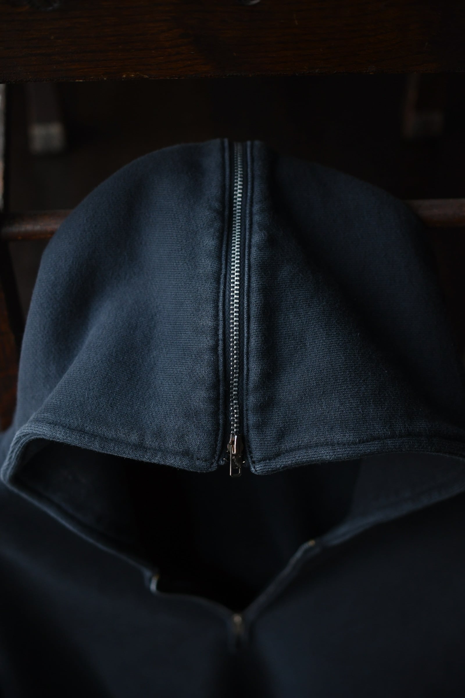 A.PRESSEのフィルターとブラッシュアップを経て新たに誕生したセーラーフーディー型のスウェット。古き時代の産物に敬意を贈るかのようにしっかりと”それらしさ”を体現しつつ、このモデルも今に着ることを大きな前提としてさり気ない配慮が随所に感じ取れる。着丈はヴィンテージ感を漂わせる短丈としながらも袖は大ぶりに振らずバランスの良い設計に。肩ハギがないヴィンテージ特有のディティールも思実に落とし込み、ややコンパクト気味な丸みあるシルエットはインナーにも落とし込みやすい適度なリラックスフィットへと繋げてくれている。裏起毛の生地も抜かりが無く、ベースとなる個体の糸を解析して糸番手を変えながら製作。他スウェット同様、この1着に於ける加工も全てが職人のオールハンドによる物であり、特有のフェード具合や生地の擦り減った風合いなど、その表情は全てが異なる。他パーカーと同じく普遍的な立ち位置でありながら、その僅かな特異的ディティールはスタイリングに良い違和感を滲ませてくれる筈であり、冬は名脇役に、春は主役として大いに期待が持てそうである。