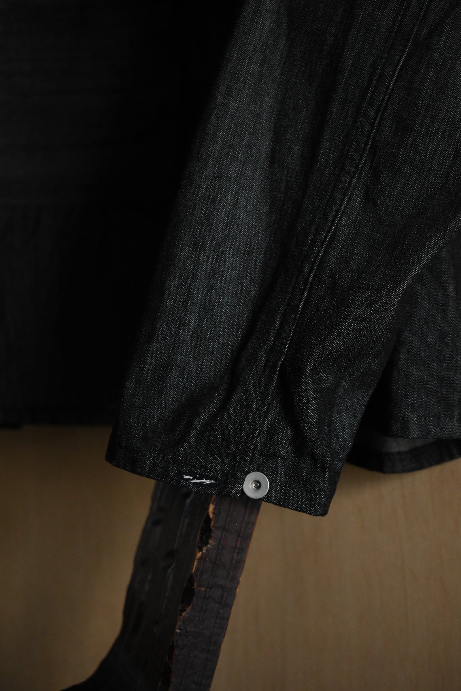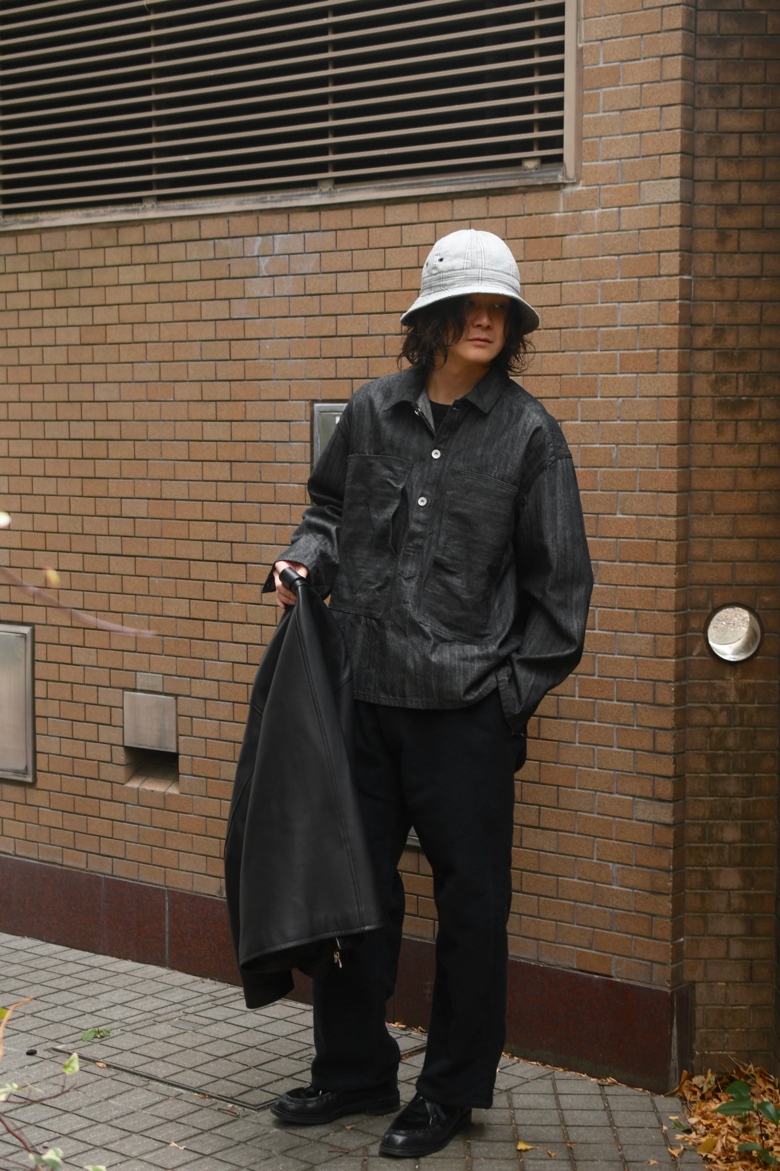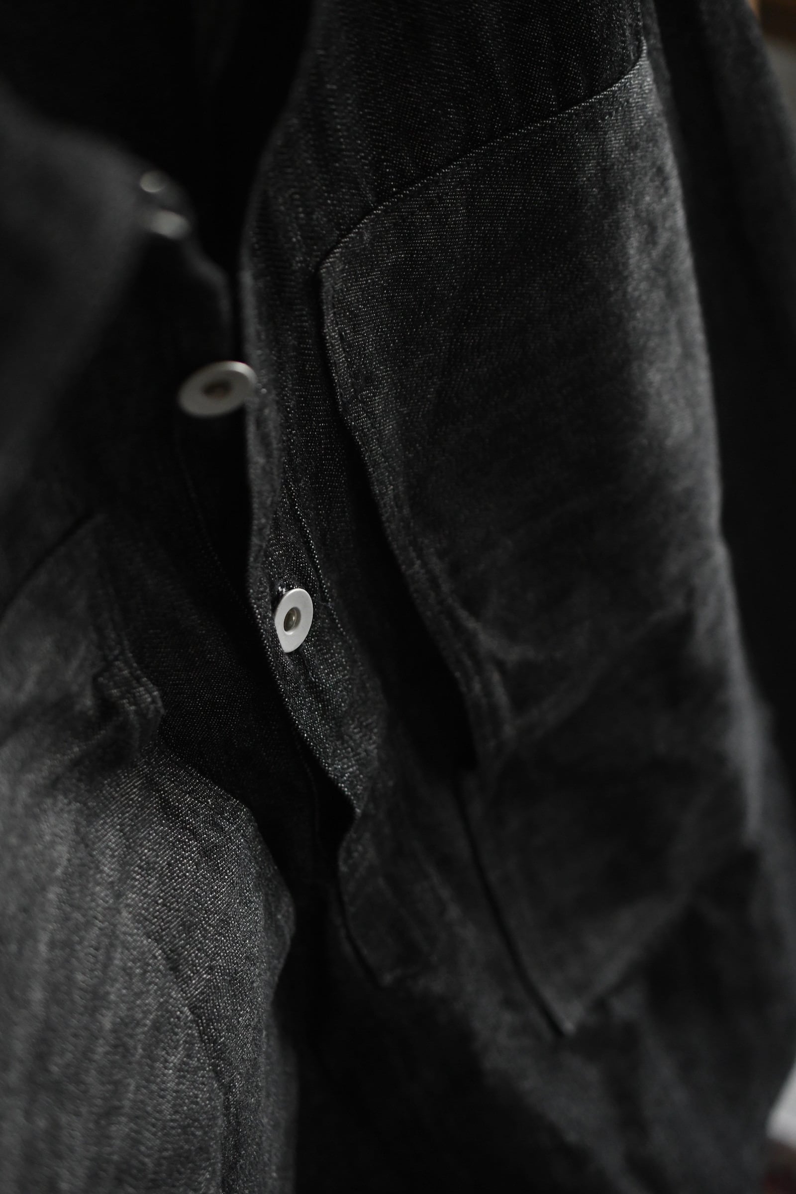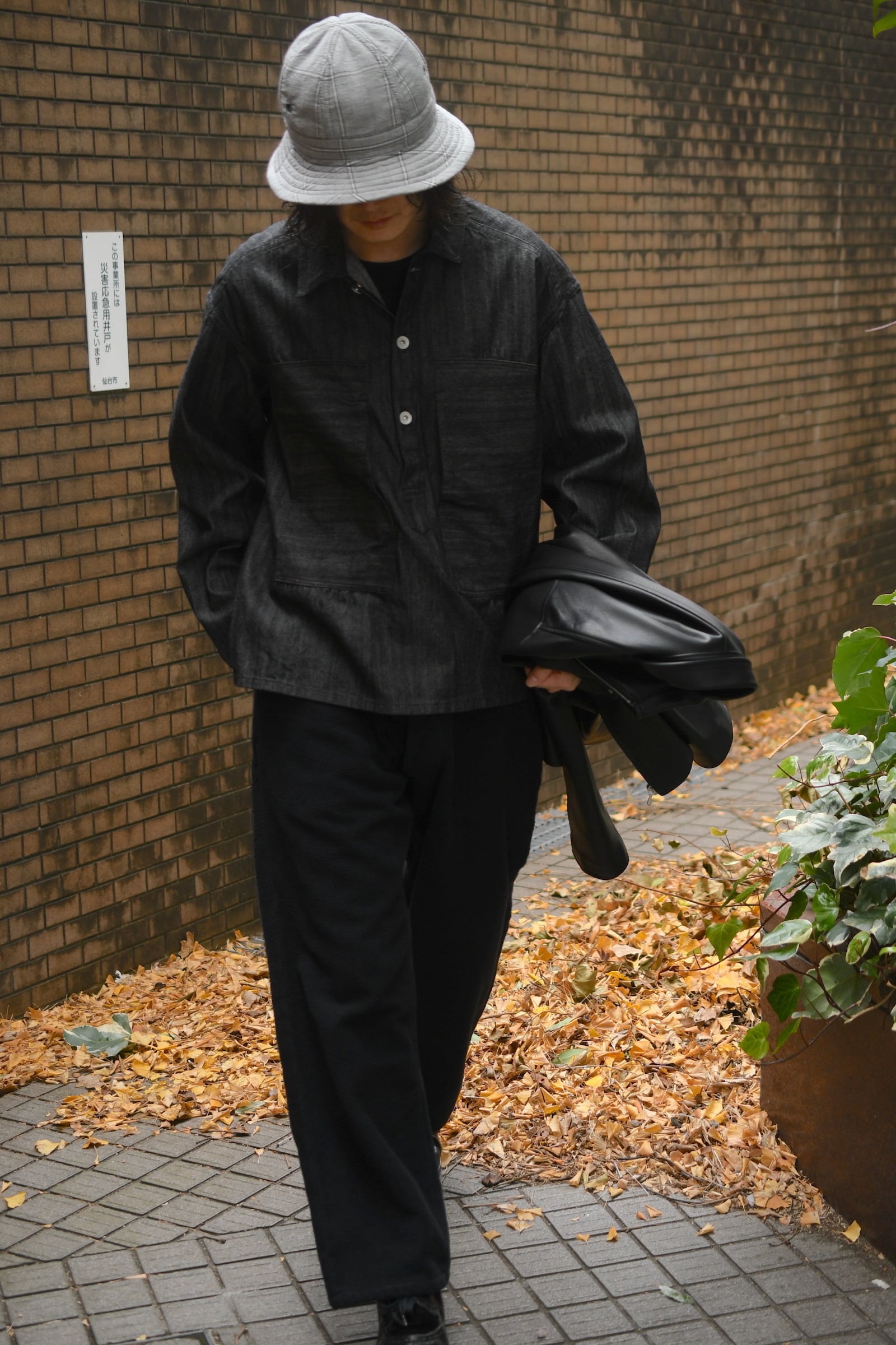ヴィンテージのU.S.ARMYのとあるシャツを土台とし、サンプルとなった古着が魅せていた経年変化という名のストーリーをFOPUNDOUR流の解釈で現代的な1着へと繋げたデニム素材のプルオーバーシャツ。シンプルな構造と両胸の大きなポケット等の特徴的デザインはそのままに、当時の生産環境だからこそ生まれた不均一な表情、整理加工されていないが故の生地の歪みを、生地や縫製、パターンを駆使して再現。着ては洗いを繰り返していく事で、デニムの色落ちだけに留まらない独特な風合いの変化に大きな期待が持てる。先日リリースした別注インディビと同様、着方を考えれば今が既にリアルなシーズンであり、見応えある変化と共に様々な着こなしをインアウトで楽しんで頂けたら。