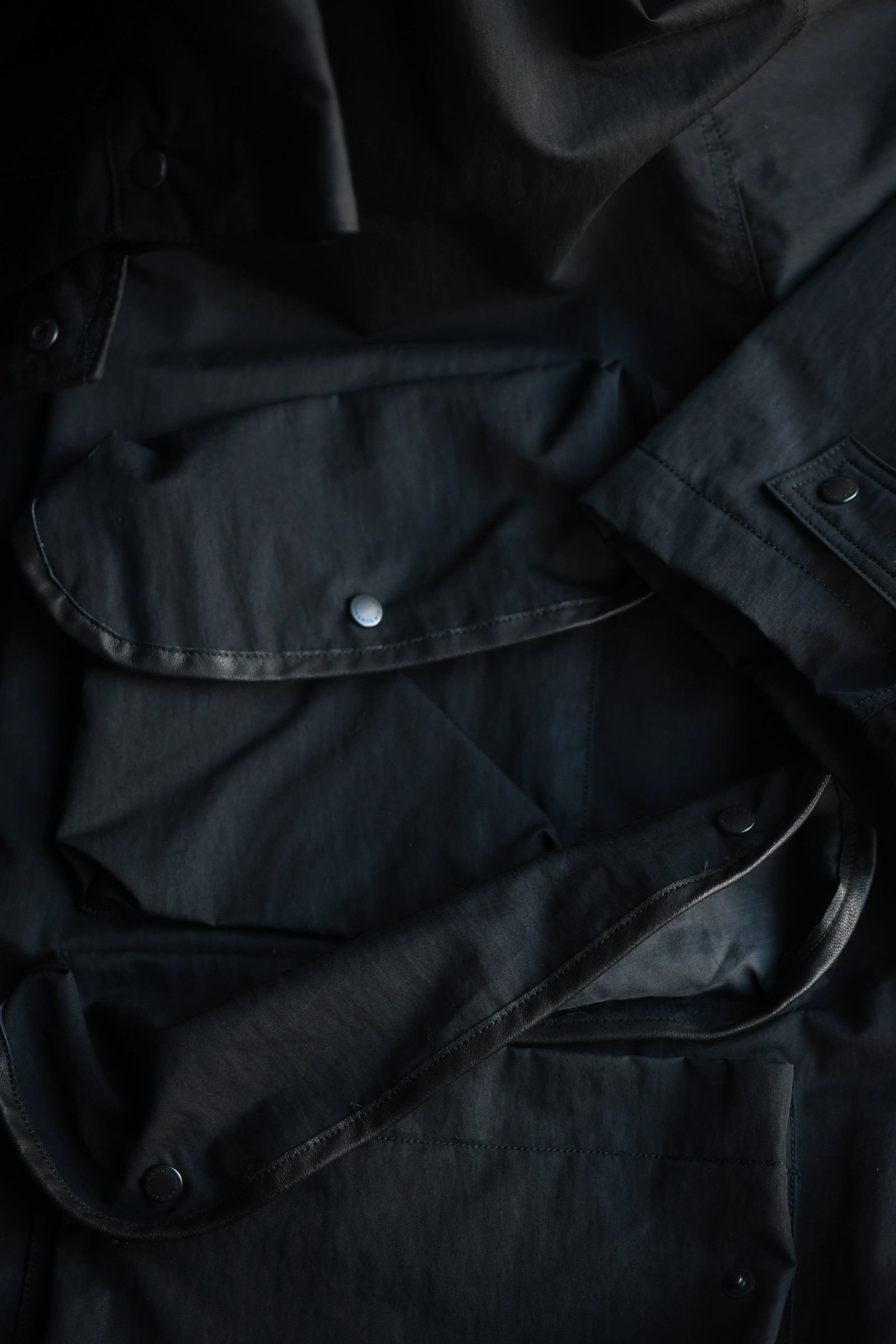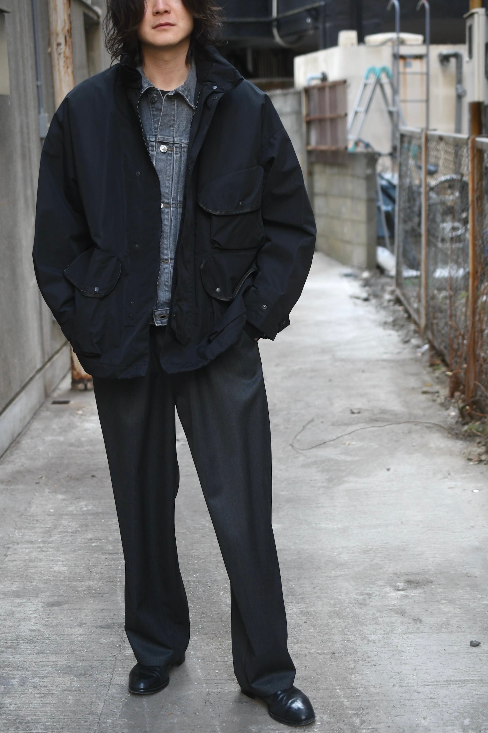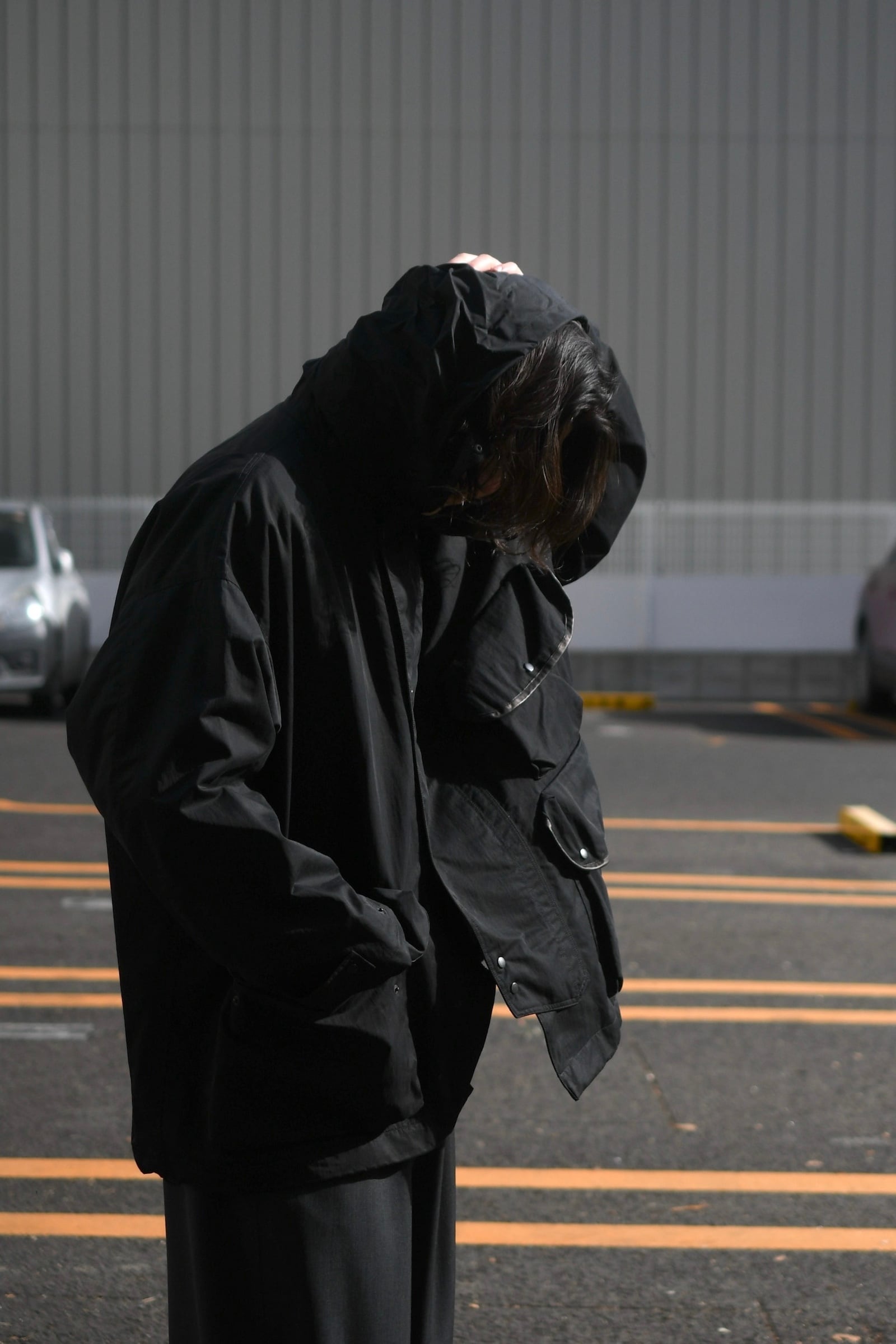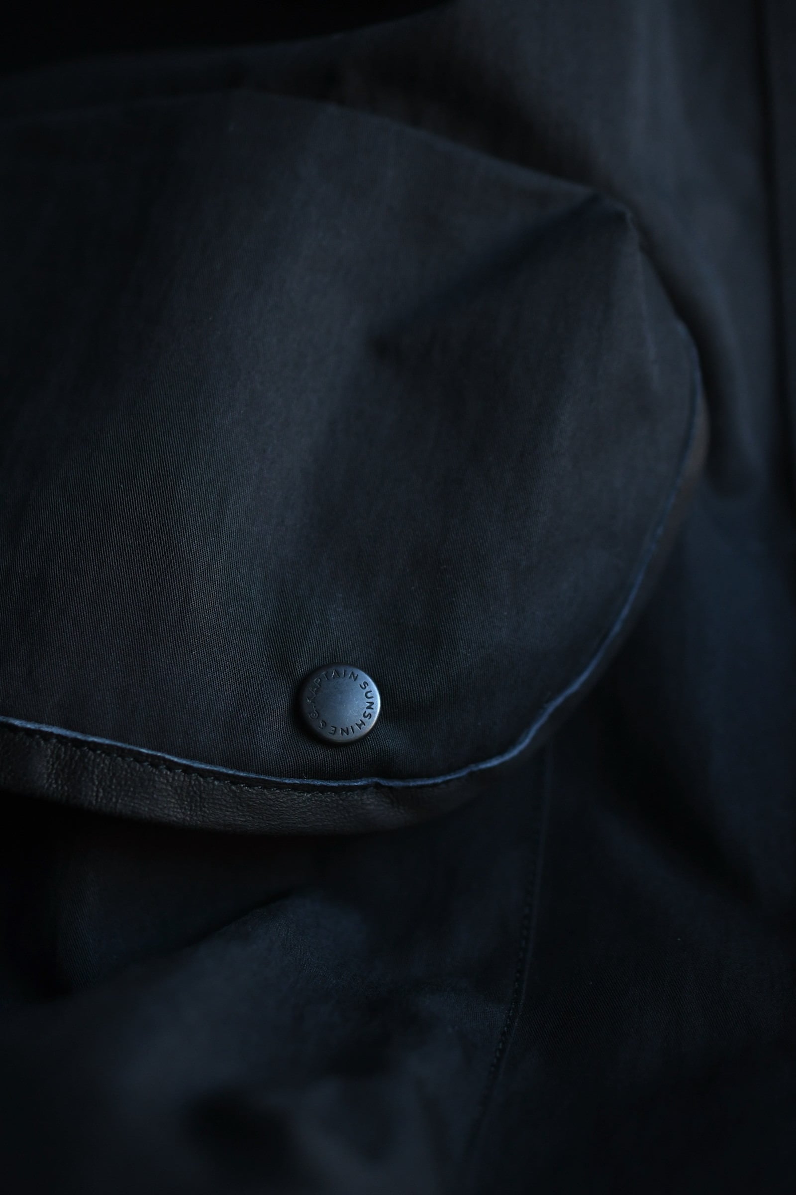 所謂ギア的な立ち位置でありながらも、街というフィールドにも溶け込むような普遍性が大前提として欲しい。天候に左右されず、気を使う必要すら与えない。そういったデイリーウェアとしての要素を抑えつつも、様々なファッションのテイストに違和感を起こす事なく馴染む”何か”は無いだろうか。この我儘に聞こえそうな欲を見事に満たしてくれているジャケットが、今季のKAPTAIN SUNSHINEにはあった。タテ糸にコットン、ヨコ糸にナイロンを使用して織り上げた超高密度クロスの生地。撥水加工も施されており申し分のないスペックである。綿主体である分、生地の表情も豊かであり、ポケットのトリムと背面のプリーツに注がれたシープレザーとの差で起こる絶妙な黒のコントラストも印象的で、男らしくも品がある。デザインはハンティングが根底にあり、過度に配していない数の大きなフラップポケットや、用途に応じて簡易的に出し入れ可能なフード。緩く丸みあるシルエットを自由に調軽出来る裾両サイドのコードなど、全てに意味が込められた「確かな機能美」と「モダンな風貌」で構成されたこのジャケットは、様々なシーンで身を委ねたくなる逸品だ。”旅に連れ出したくなる洋服”という、KAPTAIN SUNSHINEが大切にしているこの言葉の意味を強く感じます。是非、ご体感頂ければ。
