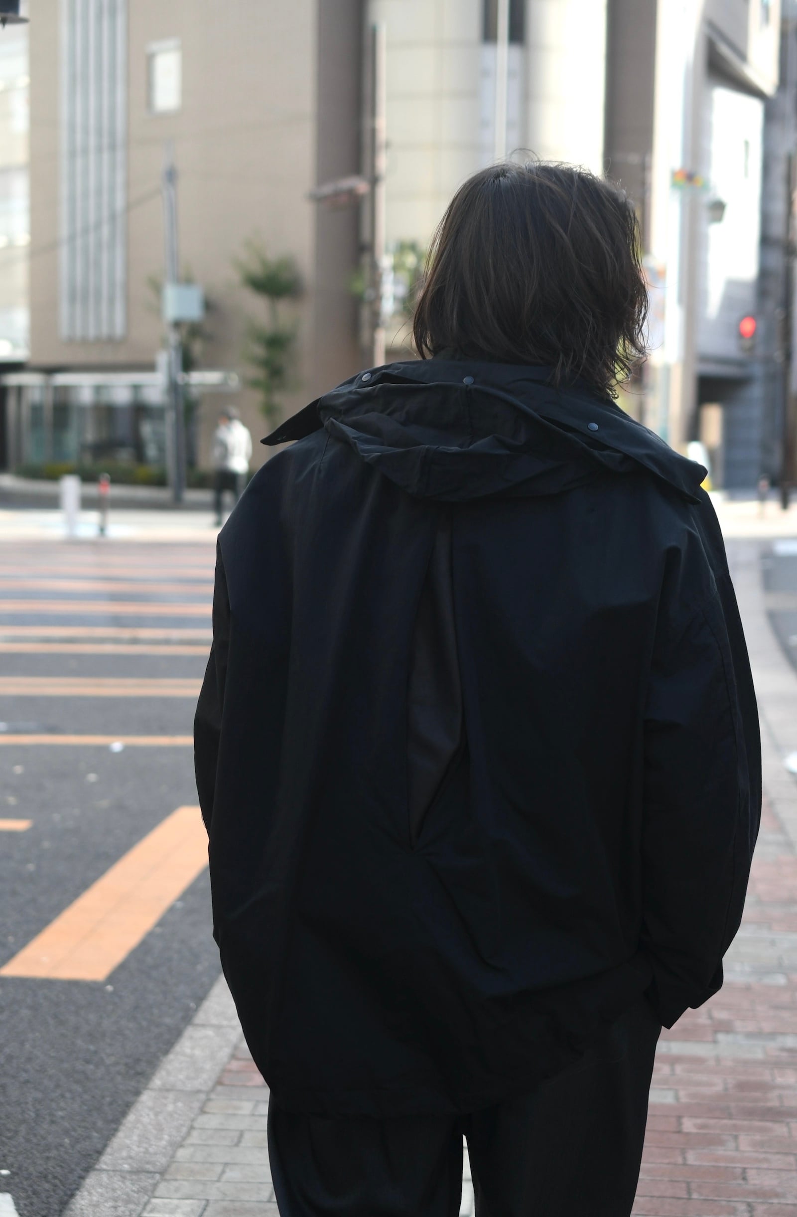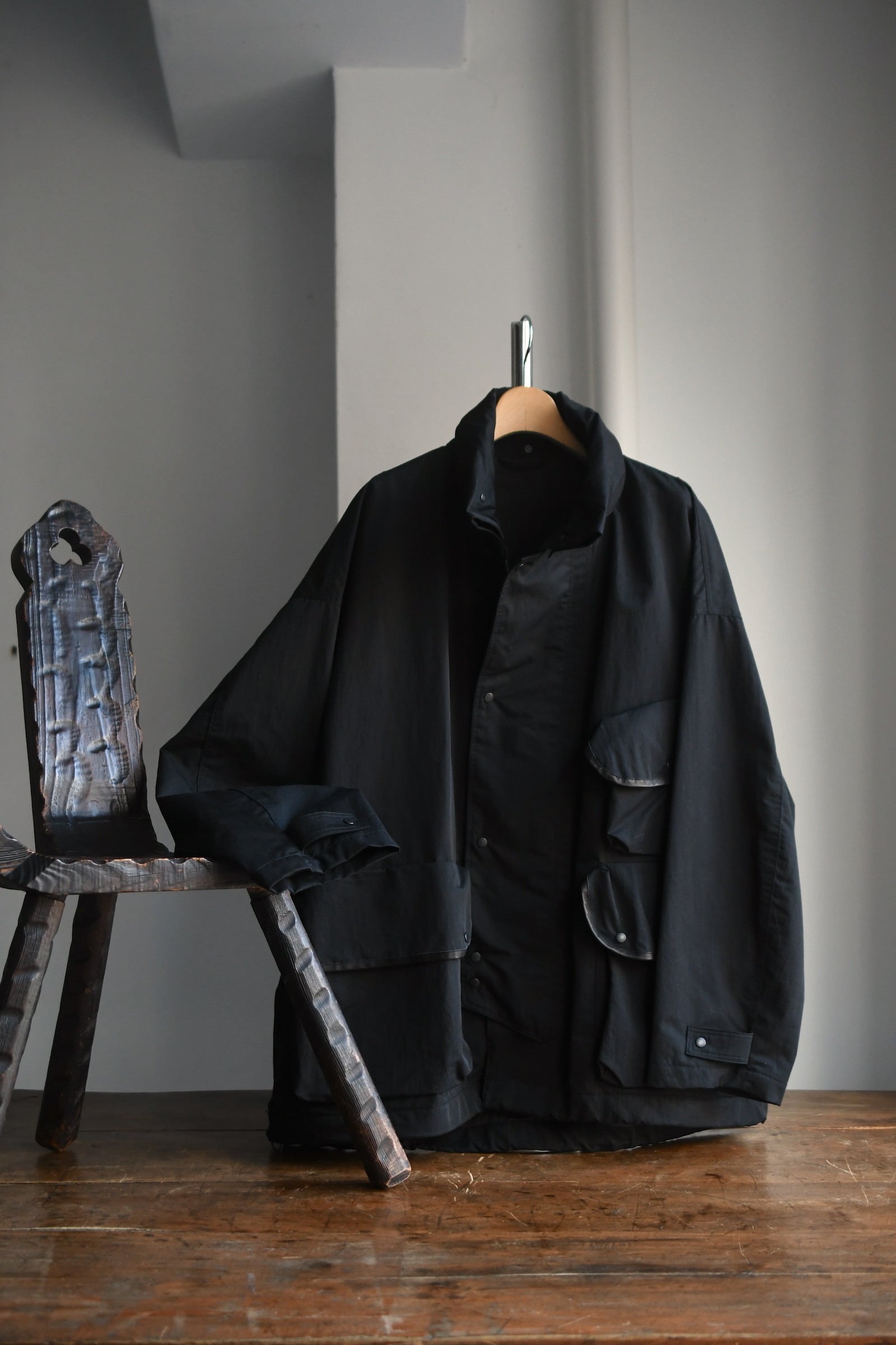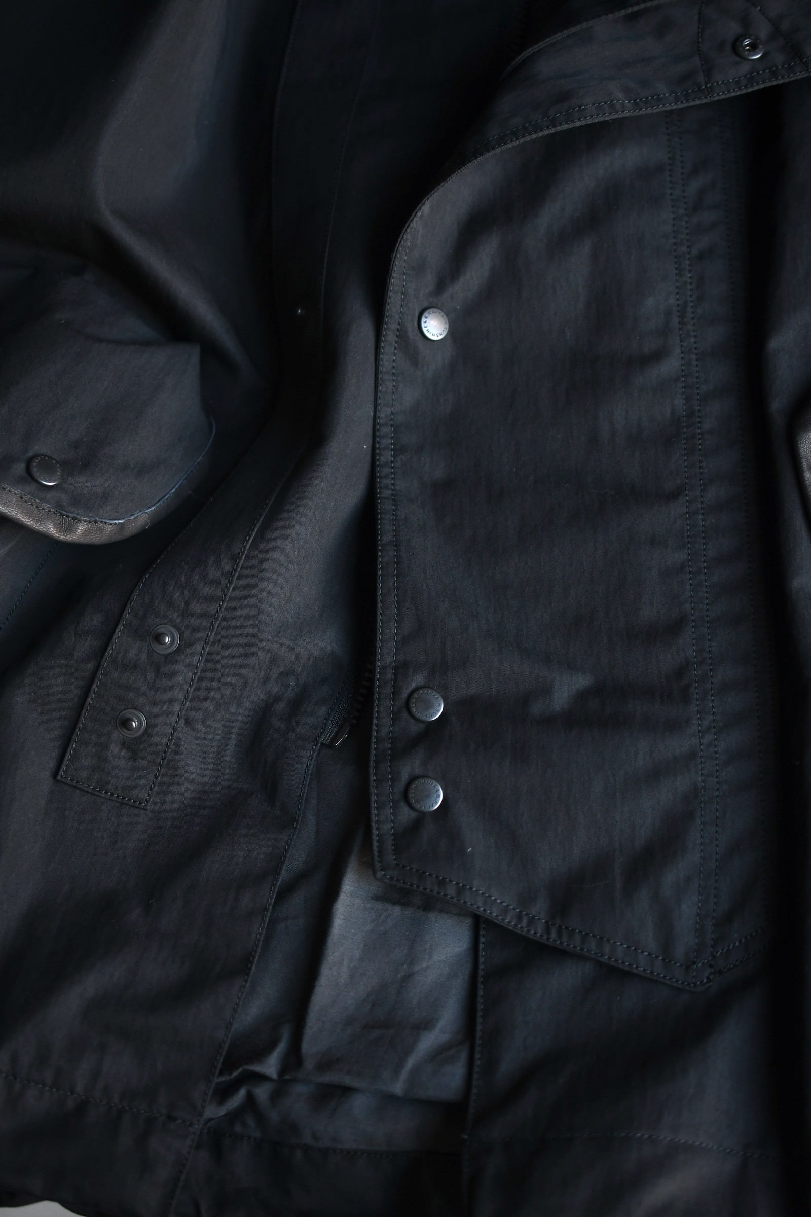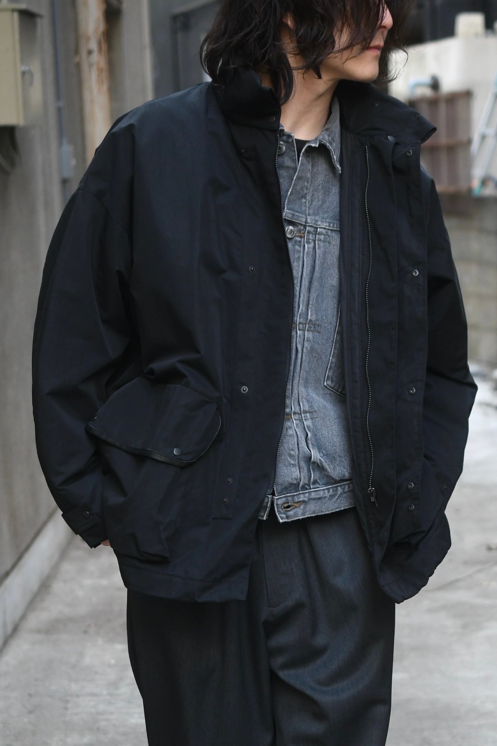 所謂ギア的な立ち位置でありながらも、街というフィールドにも溶け込むような普遍性が大前提として欲しい。天候に左右されず、気を使う必要すら与えない。そういったデイリーウェアとしての要素を抑えつつも、様々なファッションのテイストに違和感を起こす事なく馴染む”何か”は無いだろうか。この我儘に聞こえそうな欲を見事に満たしてくれているジャケットが、今季のKAPTAIN SUNSHINEにはあった。タテ糸にコットン、ヨコ糸にナイロンを使用して織り上げた超高密度クロスの生地。撥水加工も施されており申し分のないスペックである。綿主体である分、生地の表情も豊かであり、ポケットのトリムと背面のプリーツに注がれたシープレザーとの差で起こる絶妙な黒のコントラストも印象的で、男らしくも品がある。デザインはハンティングが根底にあり、過度に配していない数の大きなフラップポケットや、用途に応じて簡易的に出し入れ可能なフード。緩く丸みあるシルエットを自由に調軽出来る裾両サイドのコードなど、全てに意味が込められた「確かな機能美」と「モダンな風貌」で構成されたこのジャケットは、様々なシーンで身を委ねたくなる逸品だ。”旅に連れ出したくなる洋服”という、KAPTAIN SUNSHINEが大切にしているこの言葉の意味を強く感じます。是非、ご体感頂ければ。