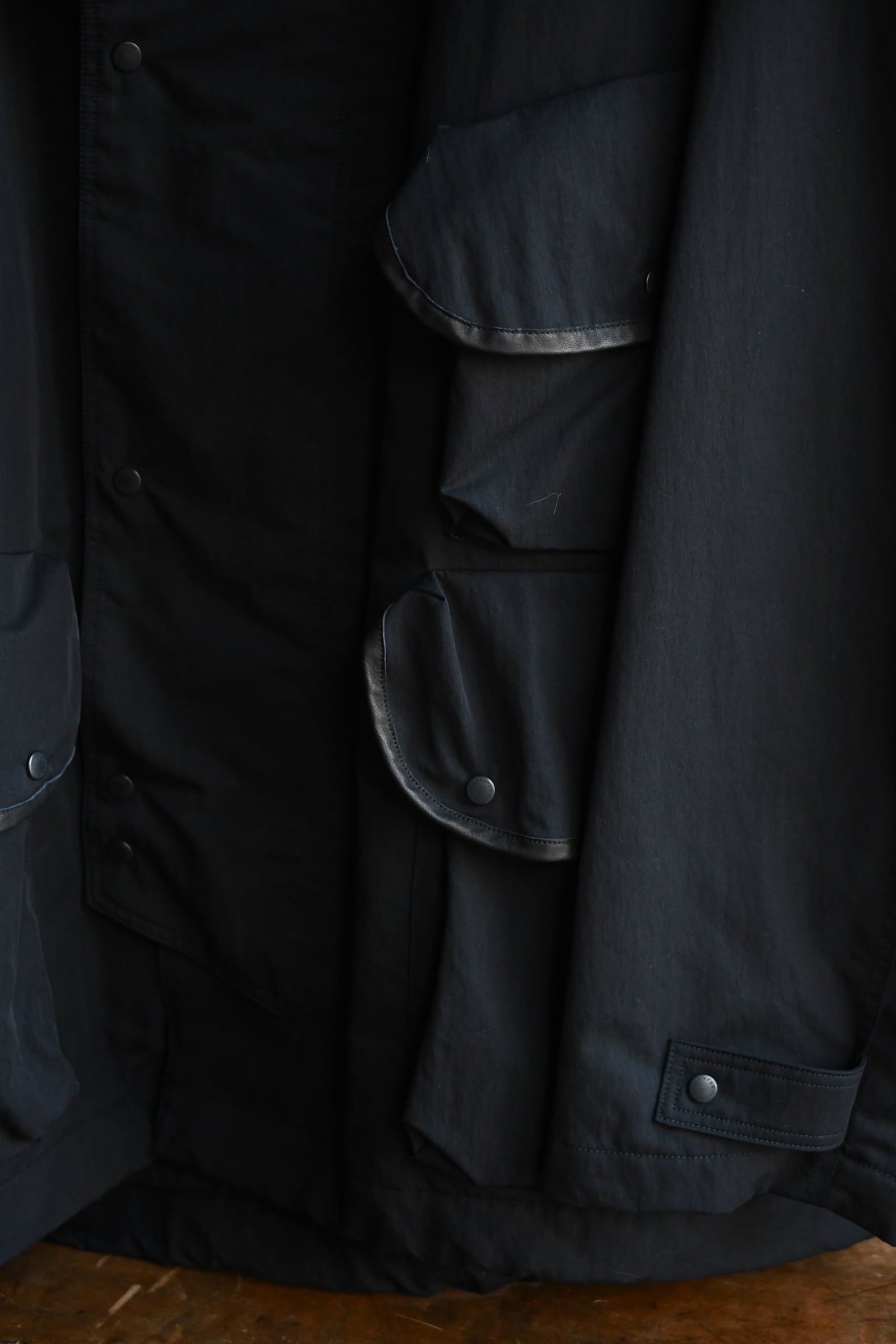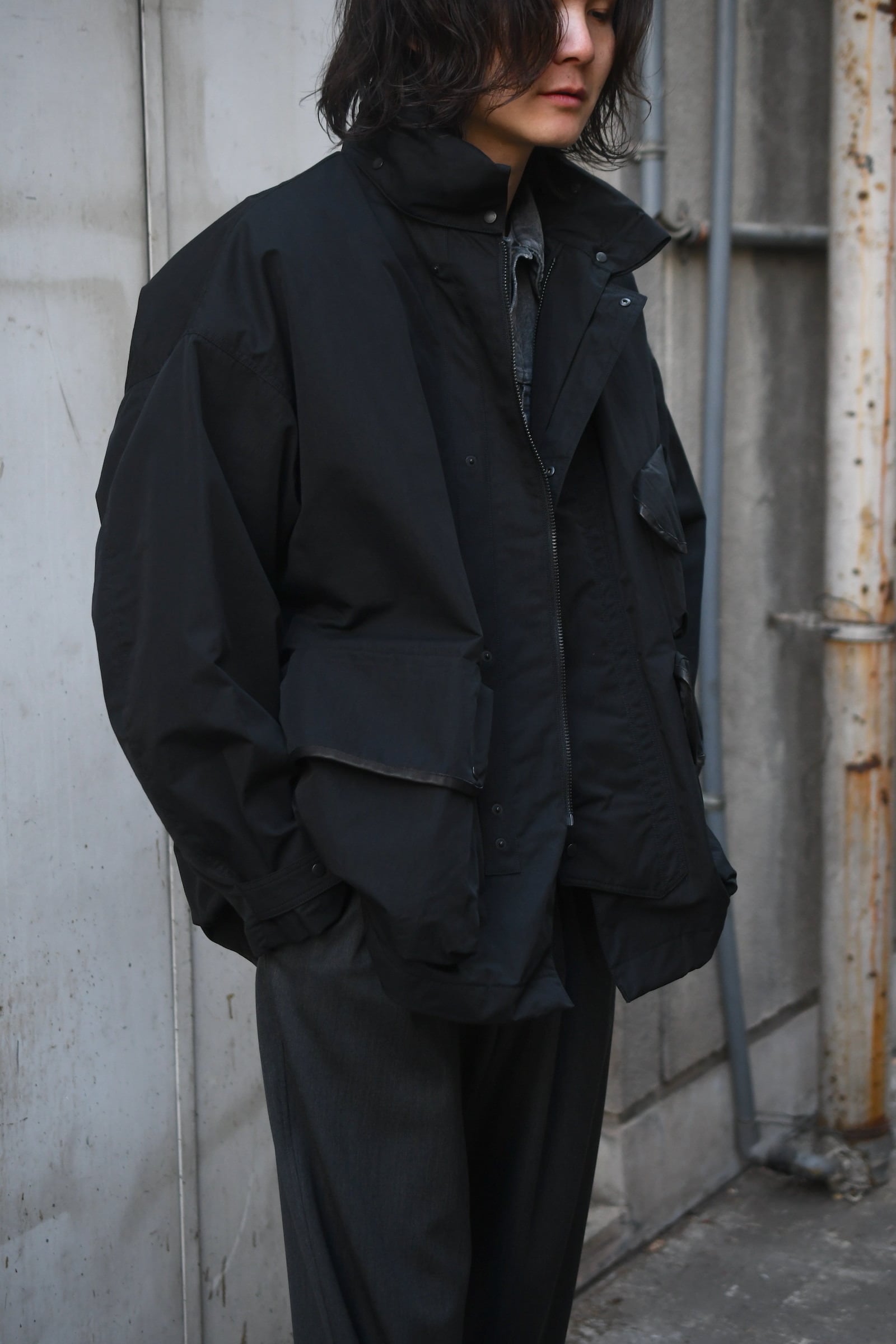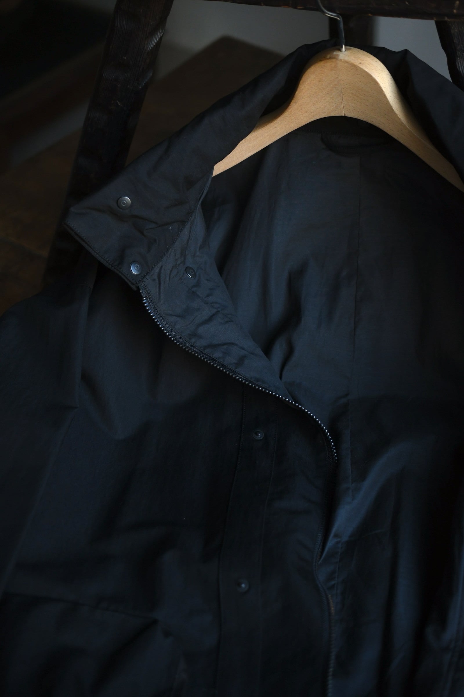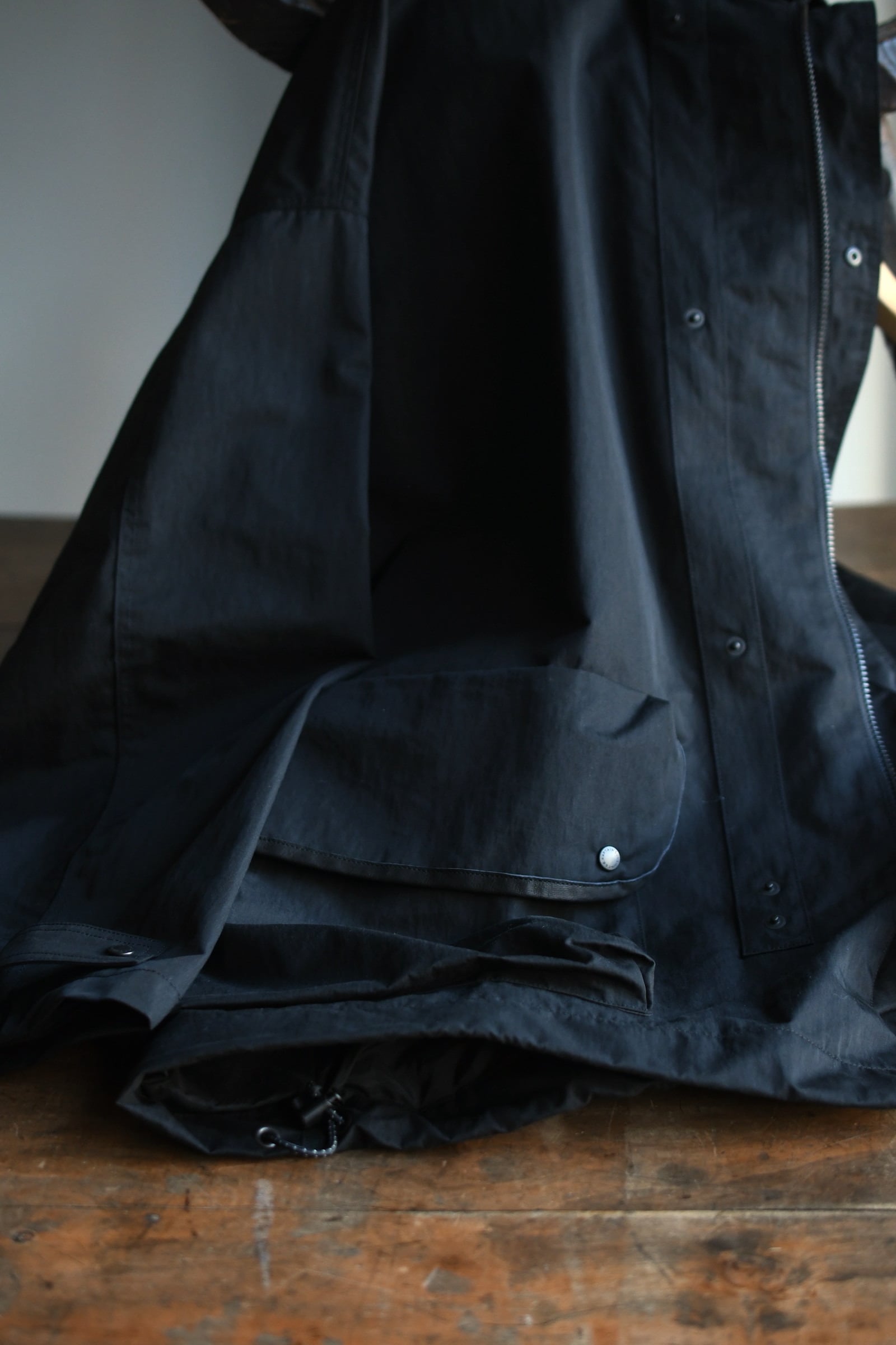 所謂ギア的な立ち位置でありながらも、街というフィールドにも溶け込むような普遍性が大前提として欲しい。天候に左右されず、気を使う必要すら与えない。そういったデイリーウェアとしての要素を抑えつつも、様々なファッションのテイストに違和感を起こす事なく馴染む”何か”は無いだろうか。この我儘に聞こえそうな欲を見事に満たしてくれているジャケットが、今季のKAPTAIN SUNSHINEにはあった。タテ糸にコットン、ヨコ糸にナイロンを使用して織り上げた超高密度クロスの生地。撥水加工も施されており申し分のないスペックである。綿主体である分、生地の表情も豊かであり、ポケットのトリムと背面のプリーツに注がれたシープレザーとの差で起こる絶妙な黒のコントラストも印象的で、男らしくも品がある。デザインはハンティングが根底にあり、過度に配していない数の大きなフラップポケットや、用途に応じて簡易的に出し入れ可能なフード。緩く丸みあるシルエットを自由に調軽出来る裾両サイドのコードなど、全てに意味が込められた「確かな機能美」と「モダンな風貌」で構成されたこのジャケットは、様々なシーンで身を委ねたくなる逸品だ。”旅に連れ出したくなる洋服”という、KAPTAIN SUNSHINEが大切にしているこの言葉の意味を強く感じます。是非、ご体感頂ければ。