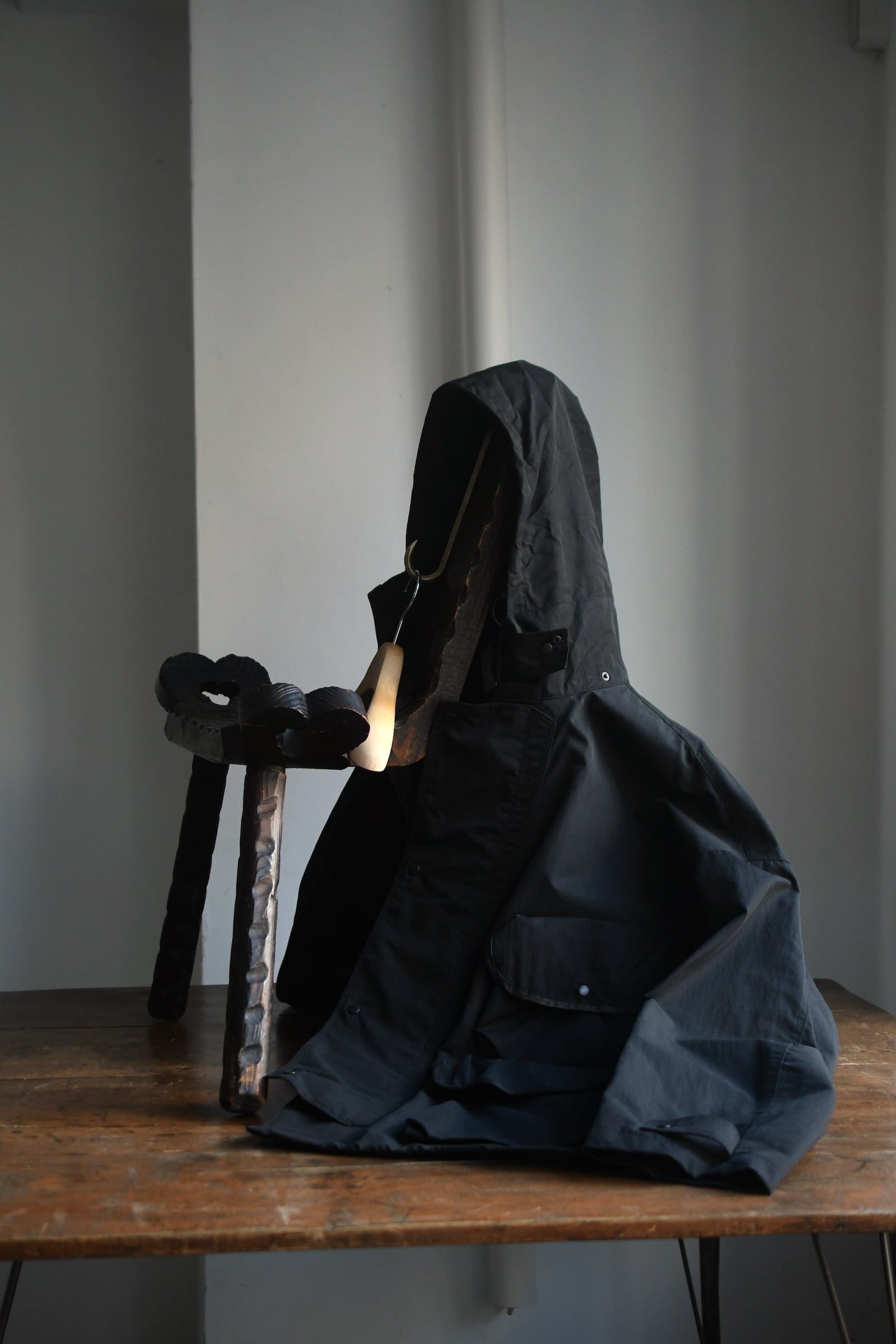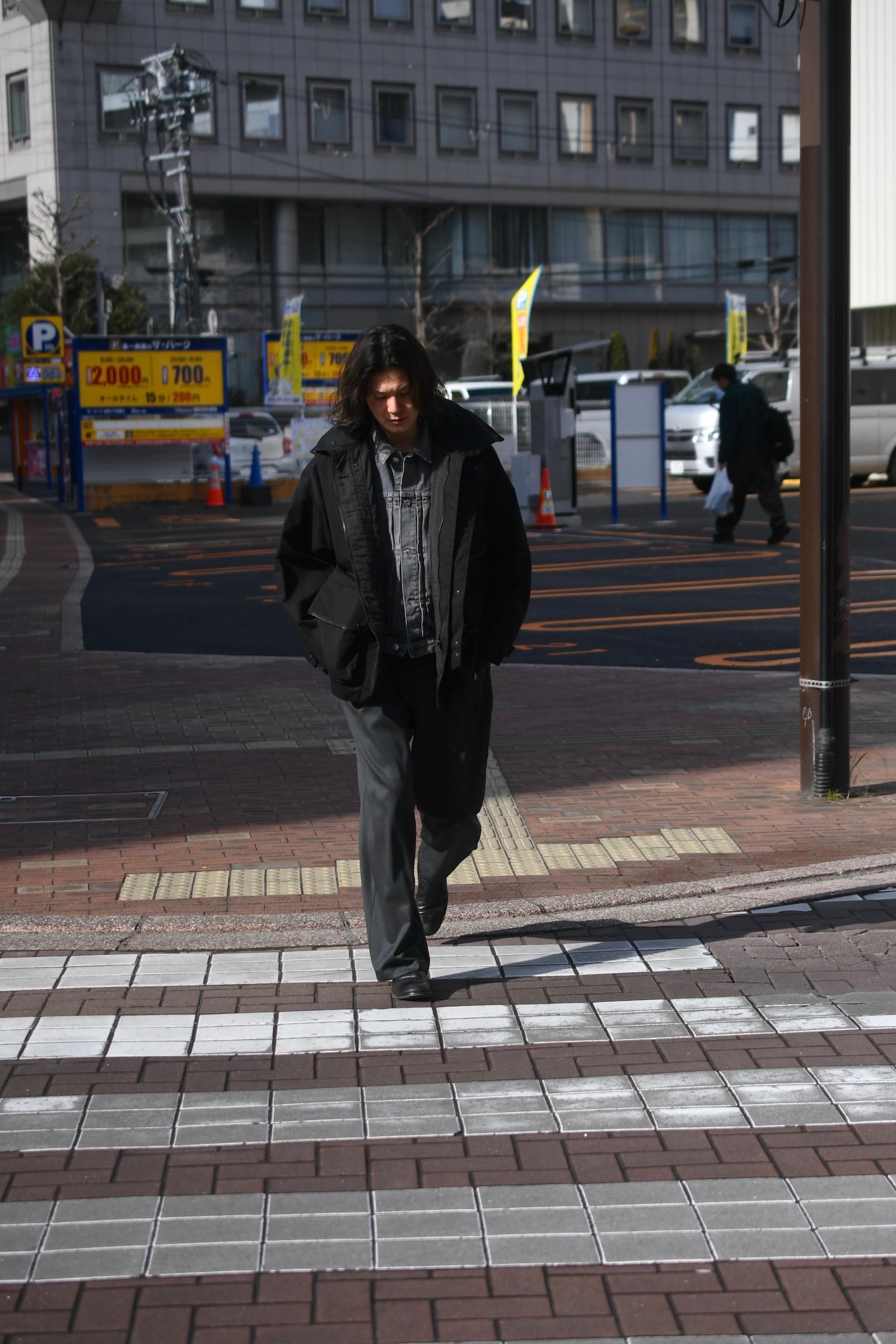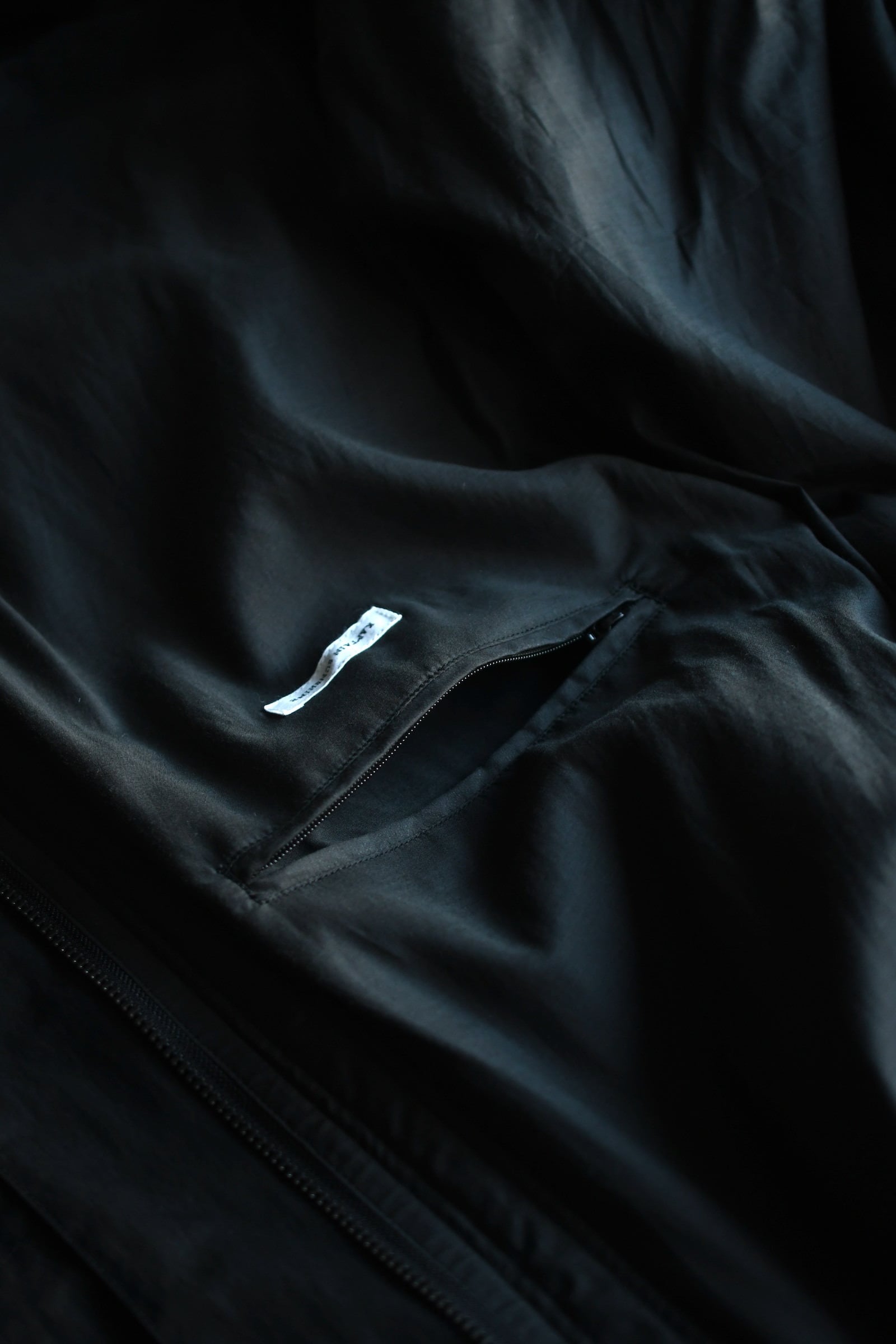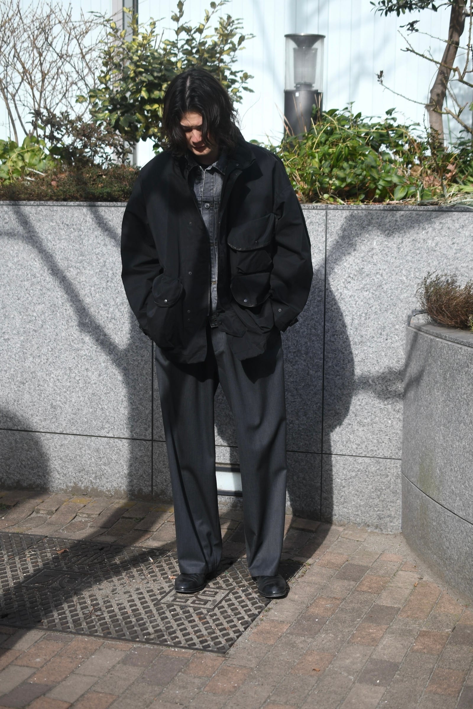 所謂ギア的な立ち位置でありながらも、街というフィールドにも溶け込むような普遍性が大前提として欲しい。天候に左右されず、気を使う必要すら与えない。そういったデイリーウェアとしての要素を抑えつつも、様々なファッションのテイストに違和感を起こす事なく馴染む”何か”は無いだろうか。この我儘に聞こえそうな欲を見事に満たしてくれているジャケットが、今季のKAPTAIN SUNSHINEにはあった。タテ糸にコットン、ヨコ糸にナイロンを使用して織り上げた超高密度クロスの生地。撥水加工も施されており申し分のないスペックである。綿主体である分、生地の表情も豊かであり、ポケットのトリムと背面のプリーツに注がれたシープレザーとの差で起こる絶妙な黒のコントラストも印象的で、男らしくも品がある。デザインはハンティングが根底にあり、過度に配していない数の大きなフラップポケットや、用途に応じて簡易的に出し入れ可能なフード。緩く丸みあるシルエットを自由に調軽出来る裾両サイドのコードなど、全てに意味が込められた「確かな機能美」と「モダンな風貌」で構成されたこのジャケットは、様々なシーンで身を委ねたくなる逸品だ。”旅に連れ出したくなる洋服”という、KAPTAIN SUNSHINEが大切にしているこの言葉の意味を強く感じます。是非、ご体感頂ければ。