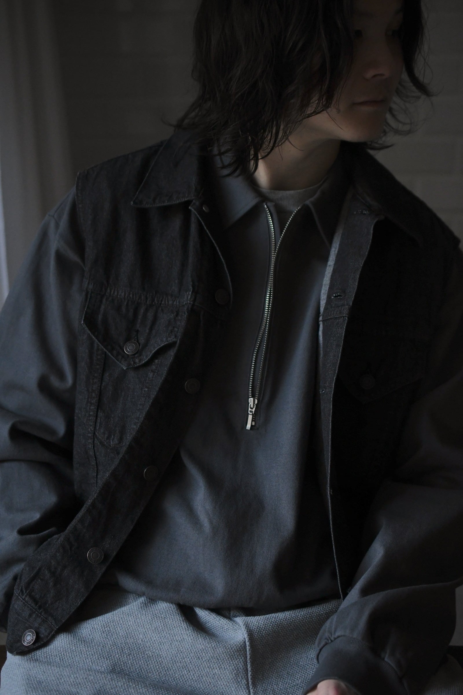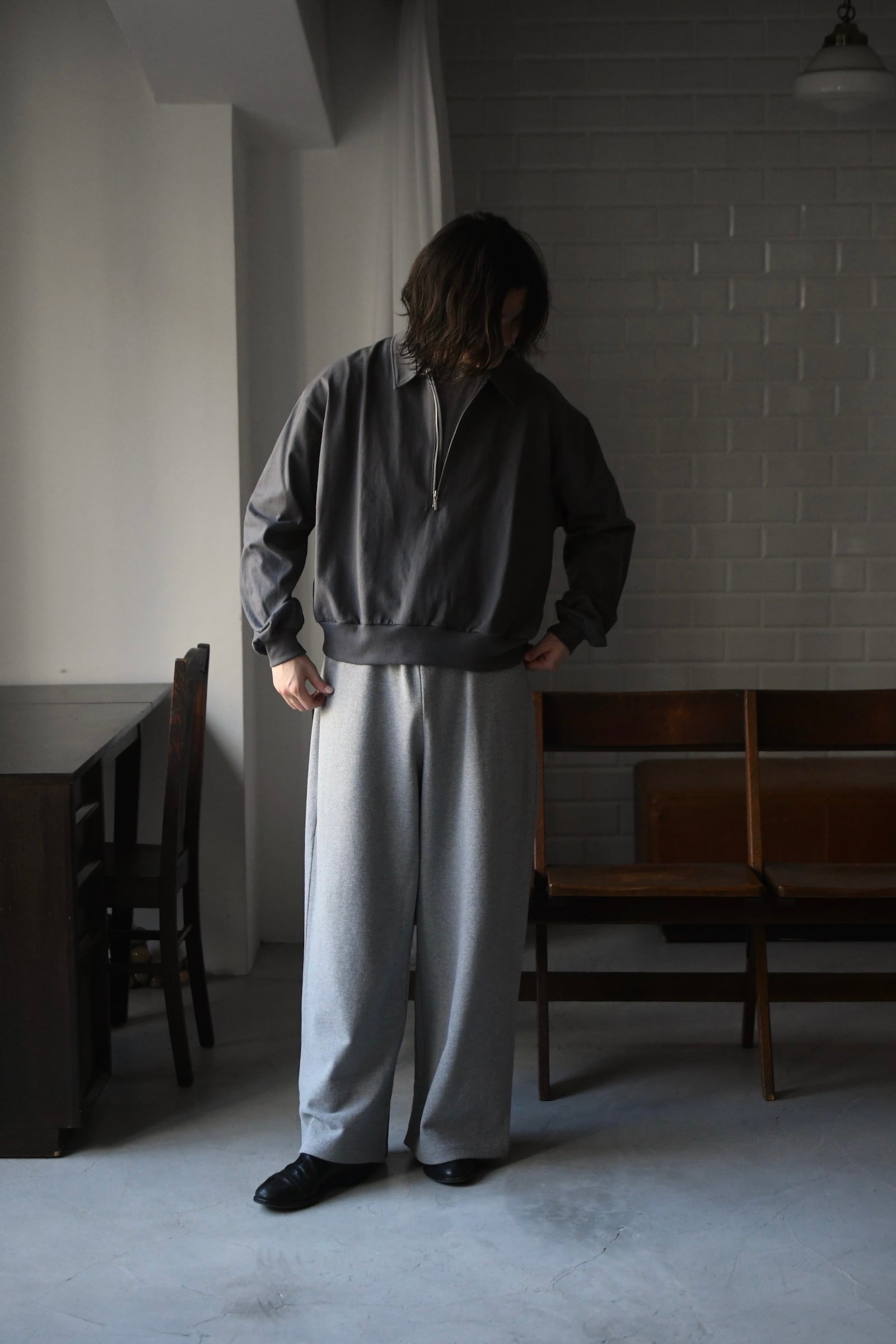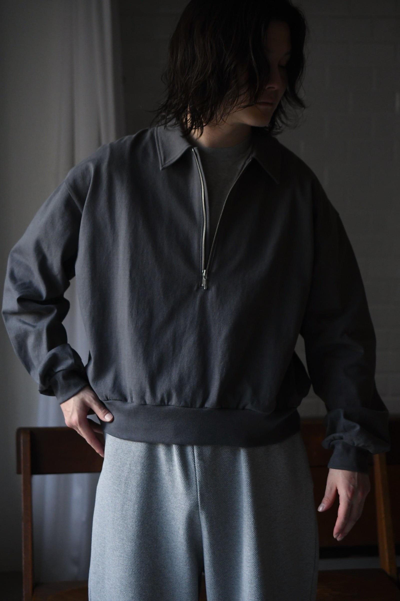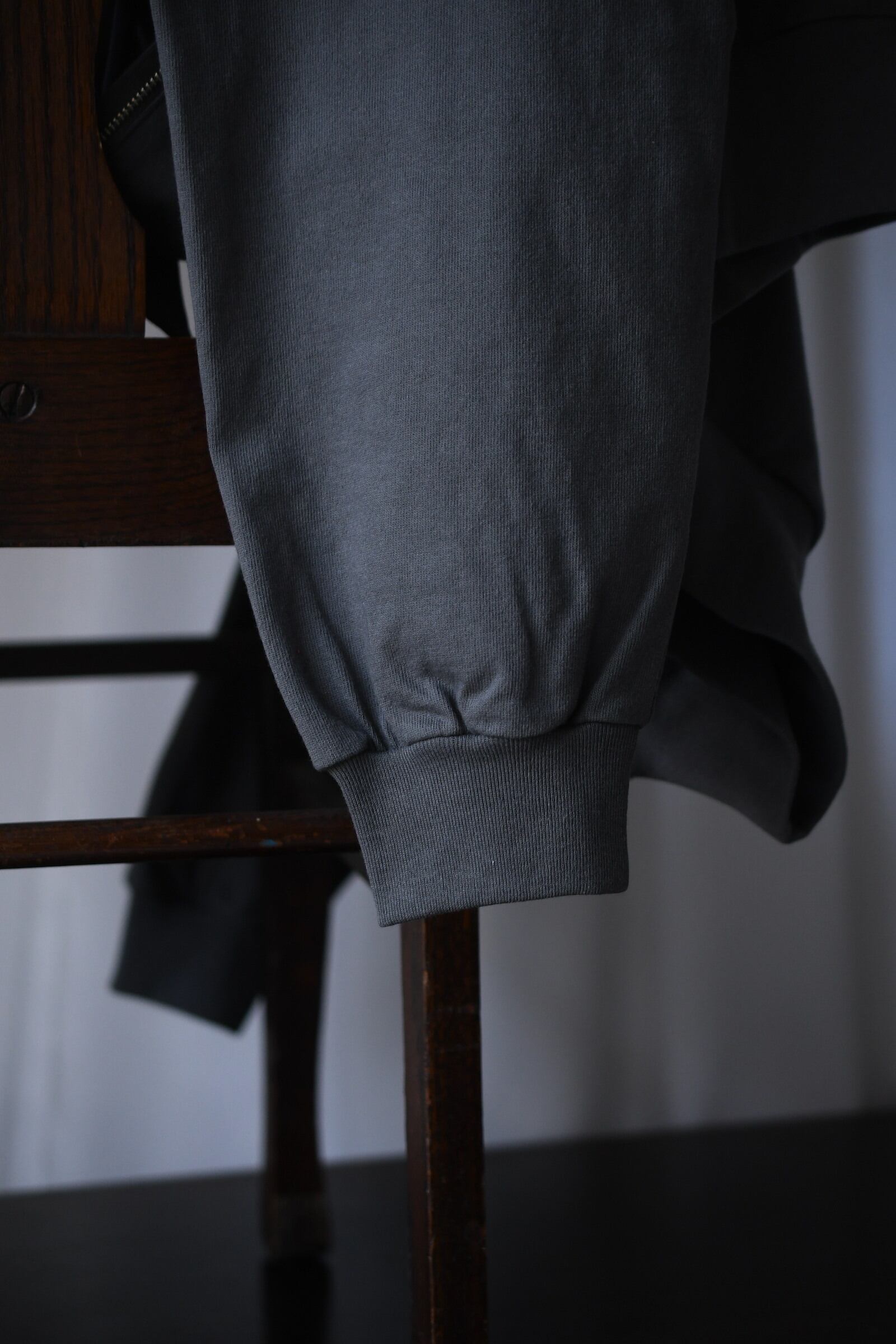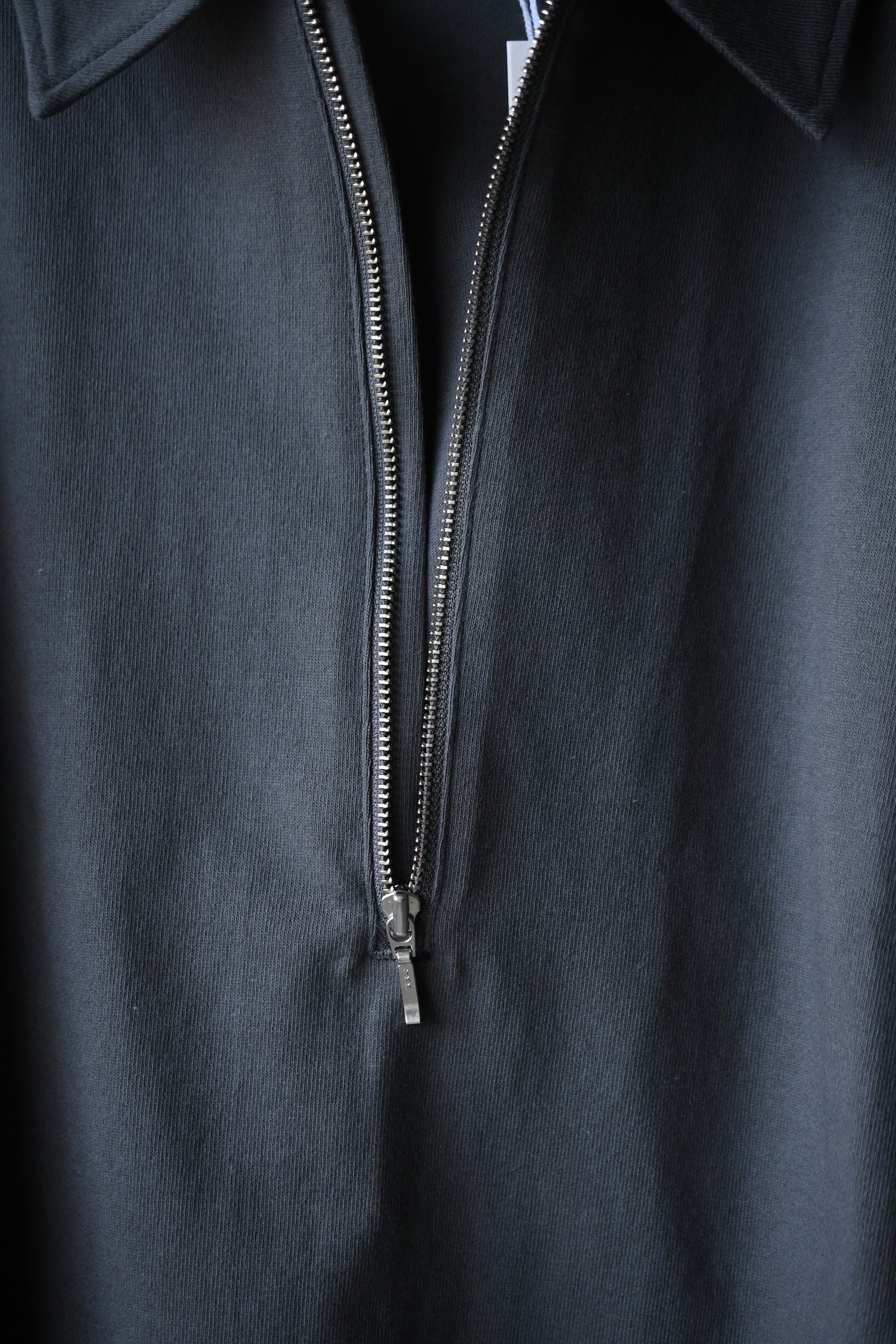 身頃の半分まで深く設けられたZIP。綺麗な襟付け。収まりの良いリラックスフィット。そして新鮮さがありながらも全く嫌味には感じない絶妙な丈感。ブランドのシグネチャーモデルであるZIP LONG SLEEVEPOLOが、カットソー以上スウェット未満のちょうど良い肉感の鹿子素材を纏いながら新たなシルエットで誕生した。D.GRAYは少し褪せたような風合いを持たせ、青と黄色は前衛過ぎない柔らかい印象感を伴わせている為に、単体で着る楽しさとインナーで映える外しの面白さを上手く両立させている。そして襟は接ぎの無い美しい仕上がりで、深いZIPを留めているステッチ位置は縫製可能な限界ギリギリのラインをかなり細い運針で走らせており、フロントの開閉に左右されず常に綺麗な存在感を放つ。是非ともこの1着だからこそ活きるスタイリングを、自分なりの世界観で楽しんで頂きたい。