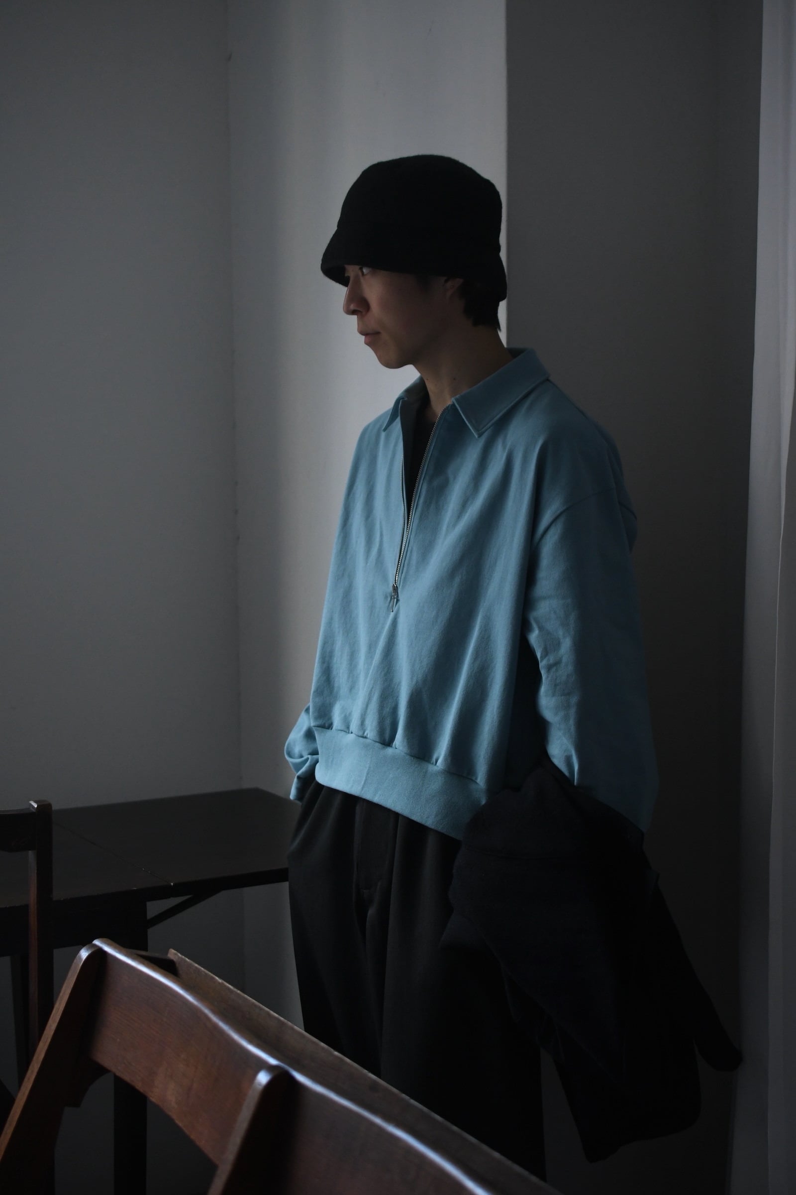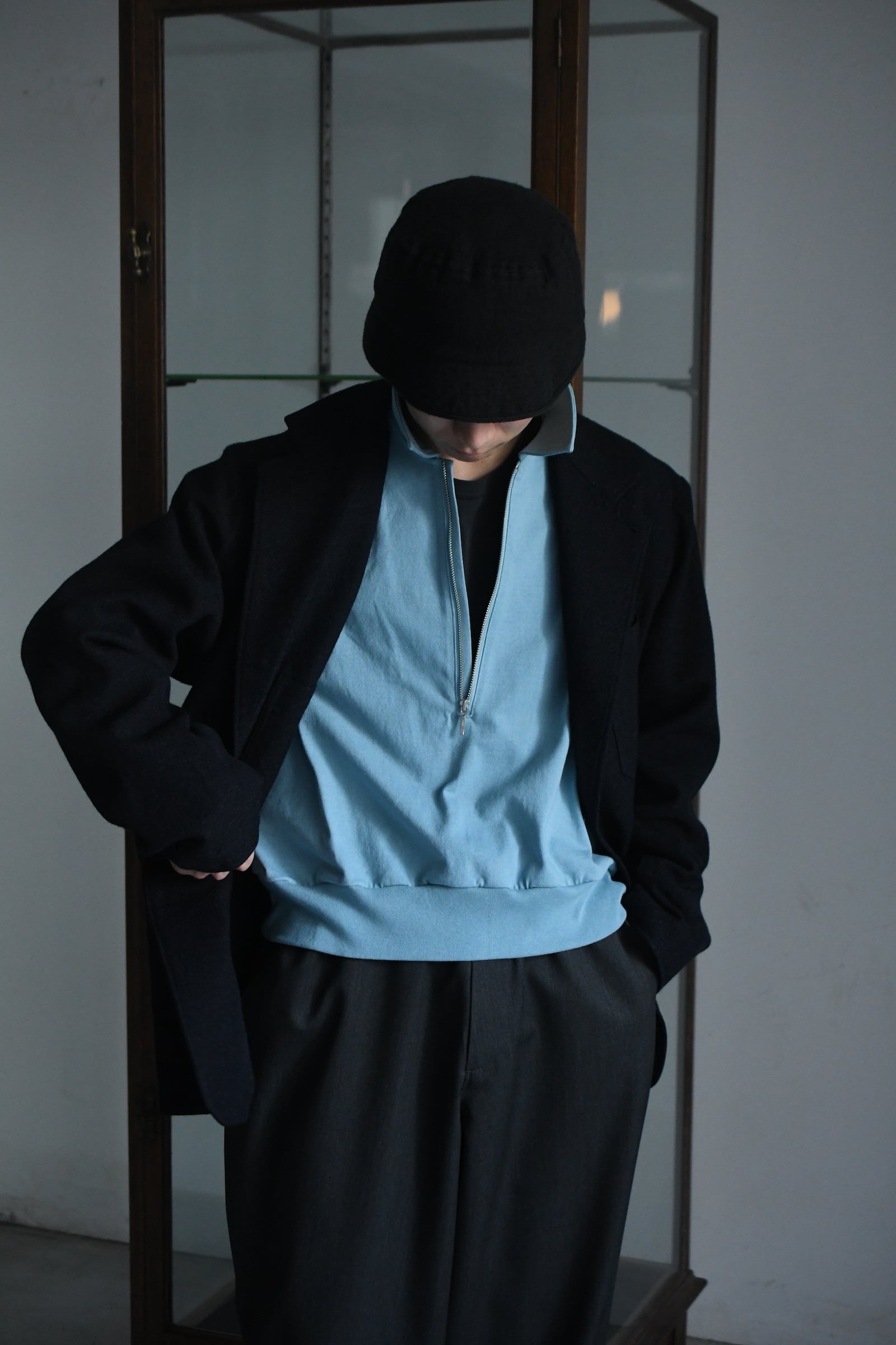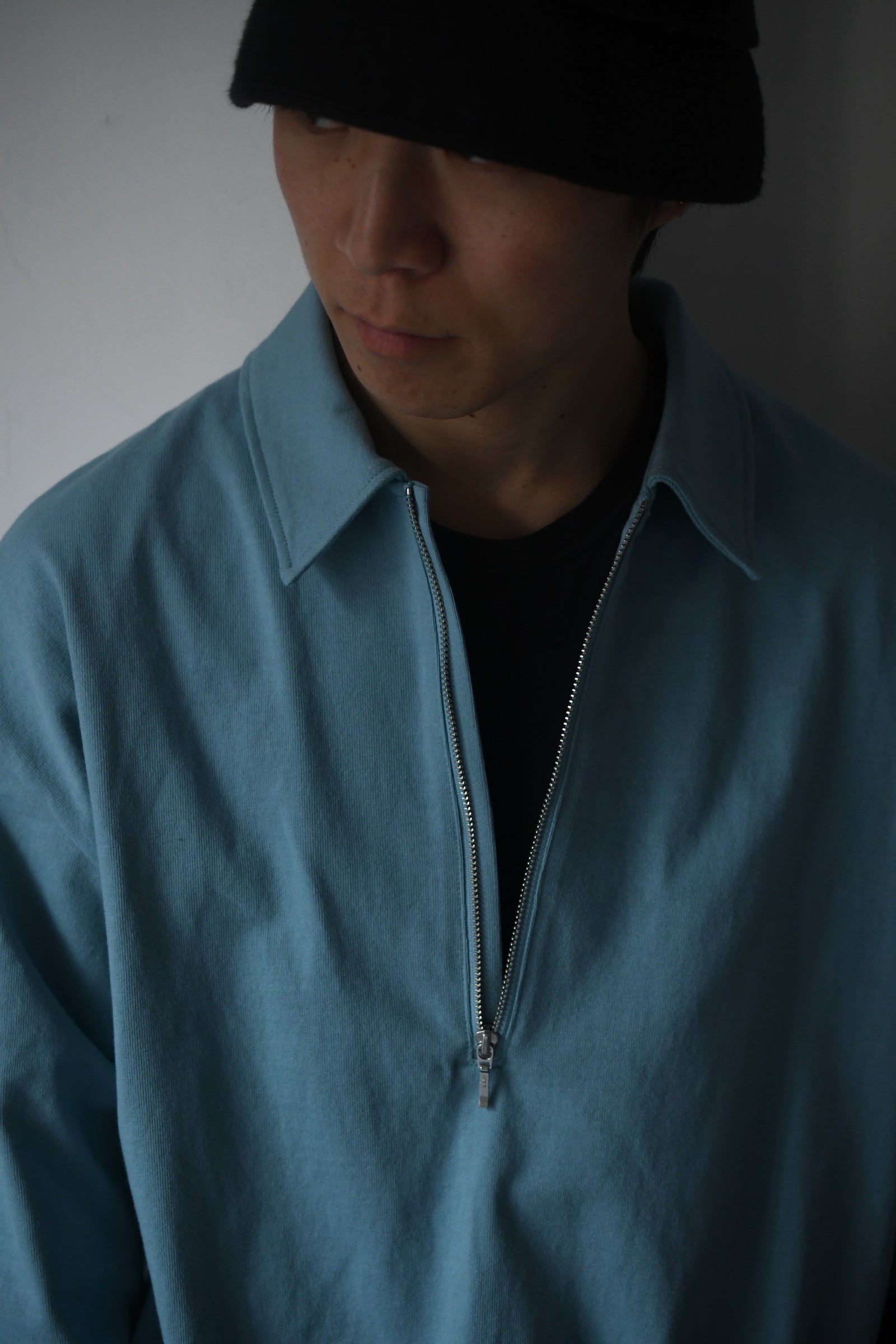身頃の半分まで深く設けられたZIP。綺麗な襟付け。収まりの良いリラックスフィット。そして新鮮さがありながらも全く嫌味には感じない絶妙な丈感。ブランドのシグネチャーモデルであるZIP LONG SLEEVEPOLOが、カットソー以上スウェット未満のちょうど良い肉感の鹿子素材を纏いながら新たなシルエットで誕生した。D.GRAYは少し褪せたような風合いを持たせ、青と黄色は前衛過ぎない柔らかい印象感を伴わせている為に、単体で着る楽しさとインナーで映える外しの面白さを上手く両立させている。そして襟は接ぎの無い美しい仕上がりで、深いZIPを留めているステッチ位置は縫製可能な限界ギリギリのラインをかなり細い運針で走らせており、フロントの開閉に左右されず常に綺麗な存在感を放つ。是非ともこの1着だからこそ活きるスタイリングを、自分なりの世界観で楽しんで頂きたい。
